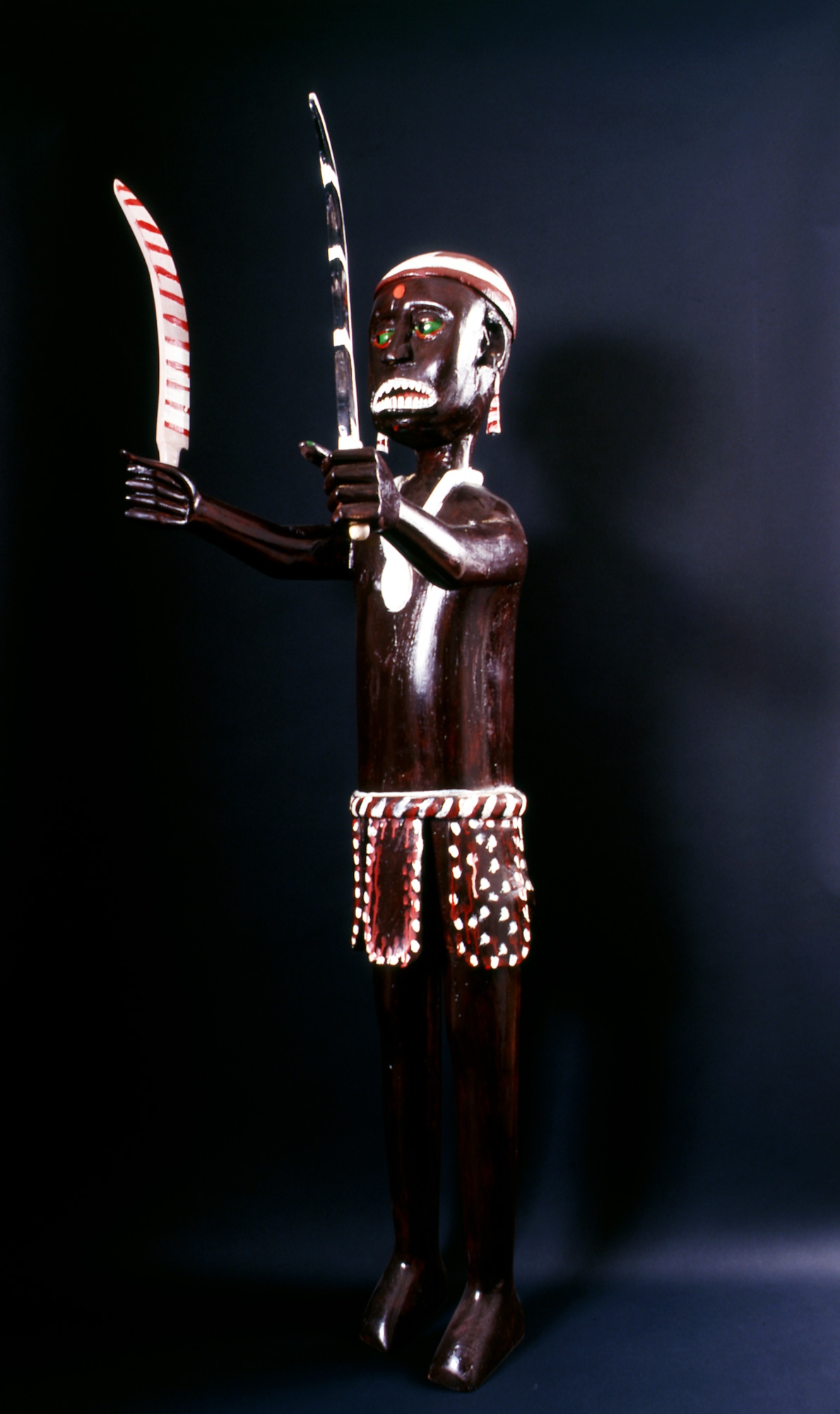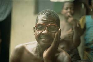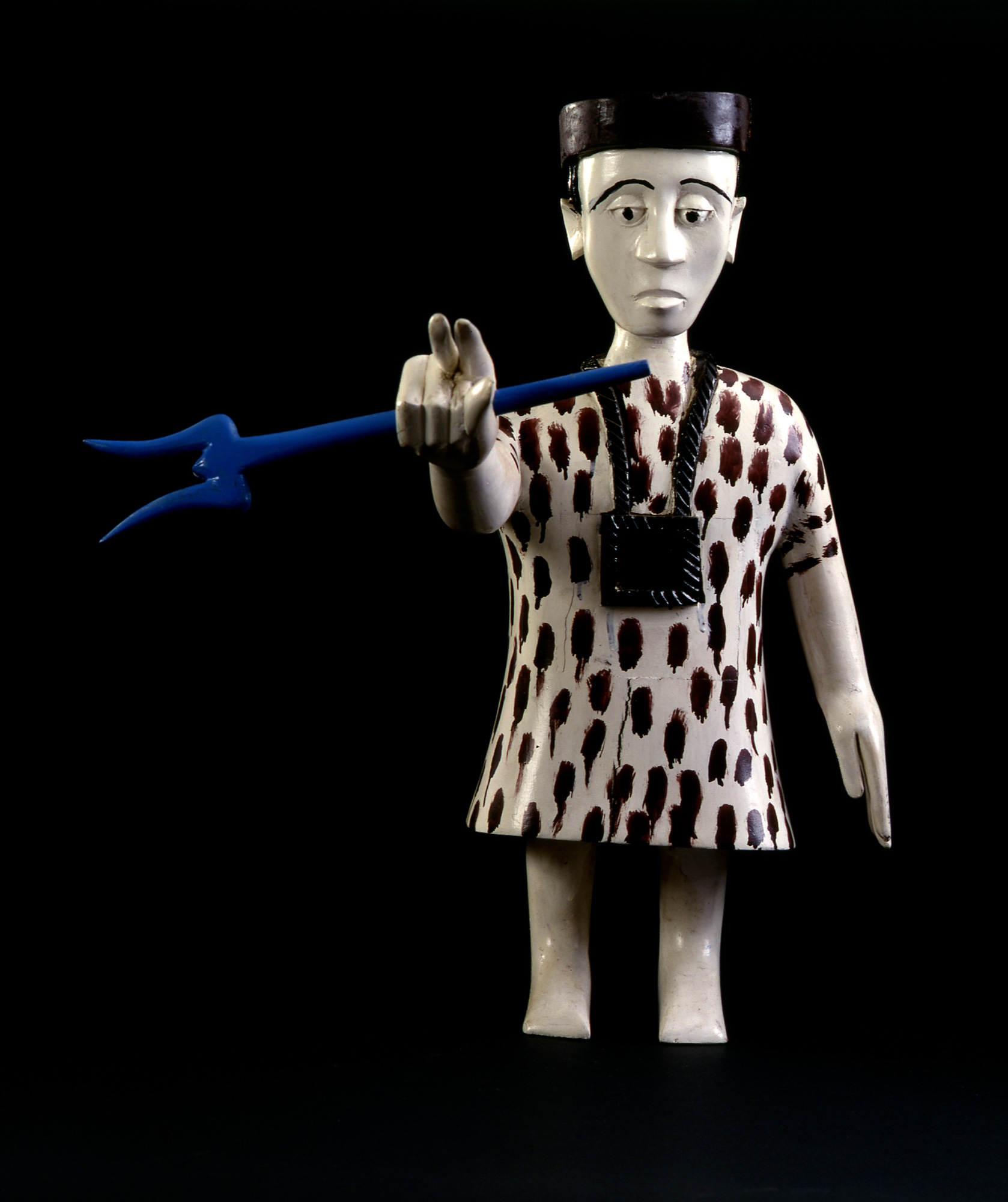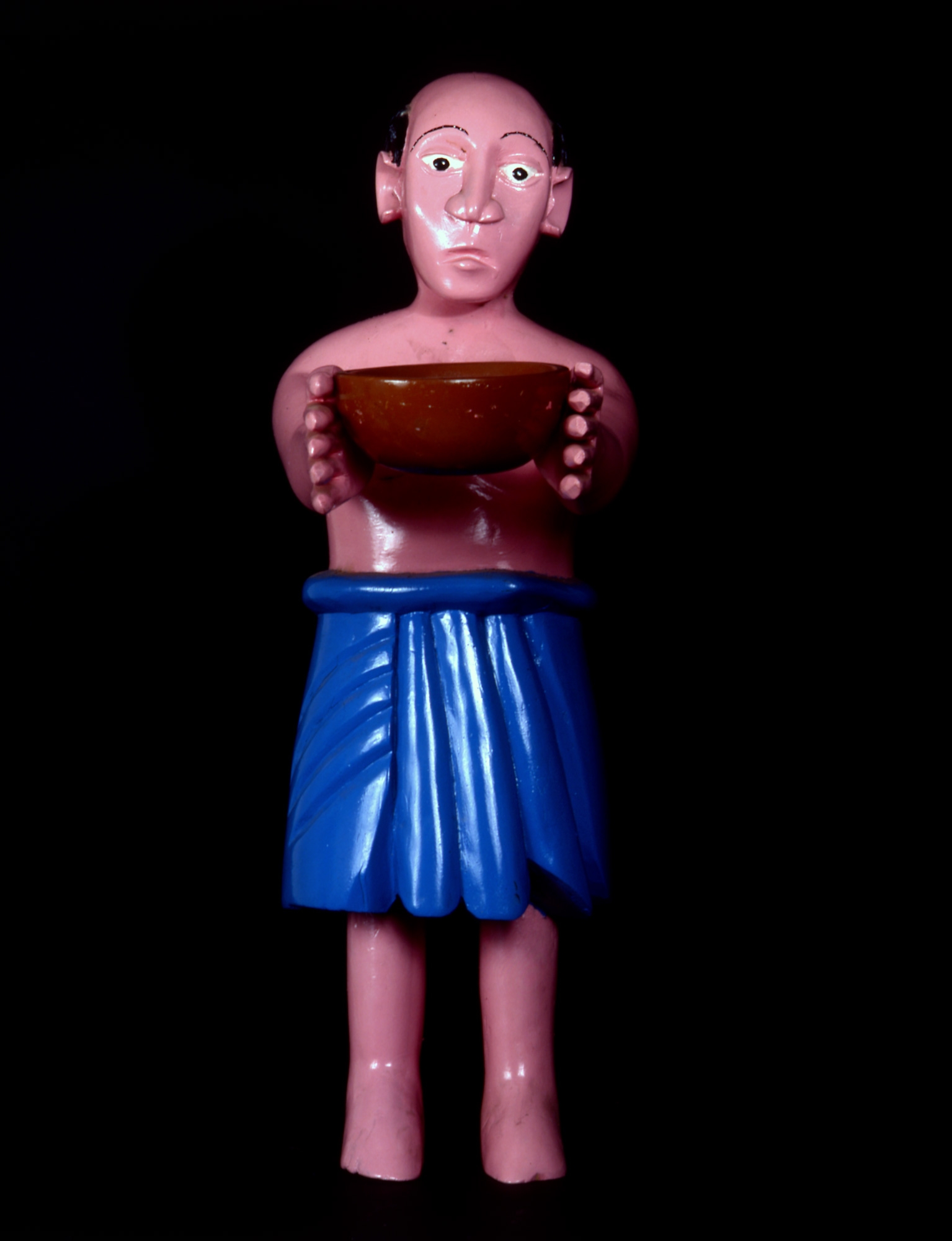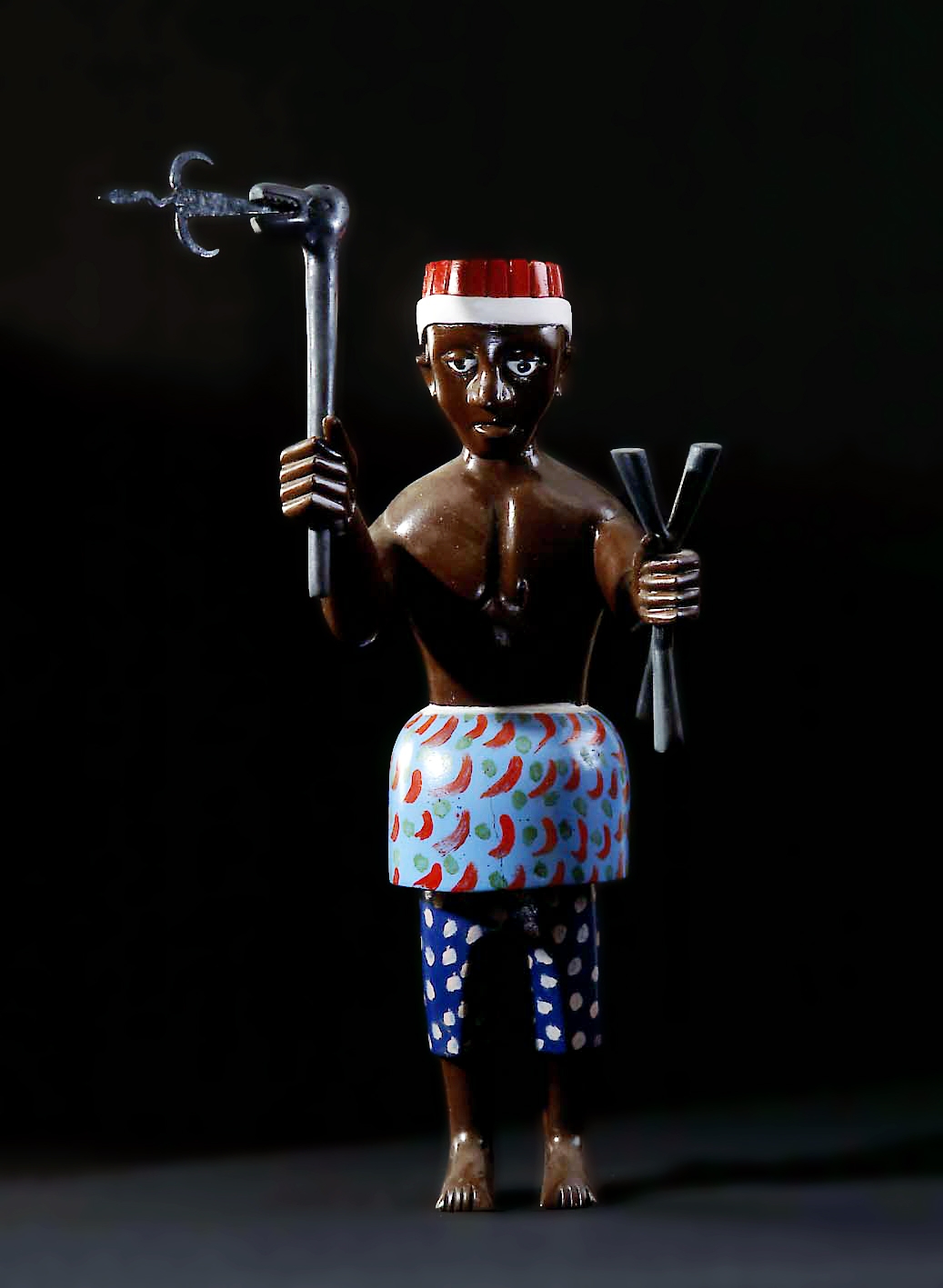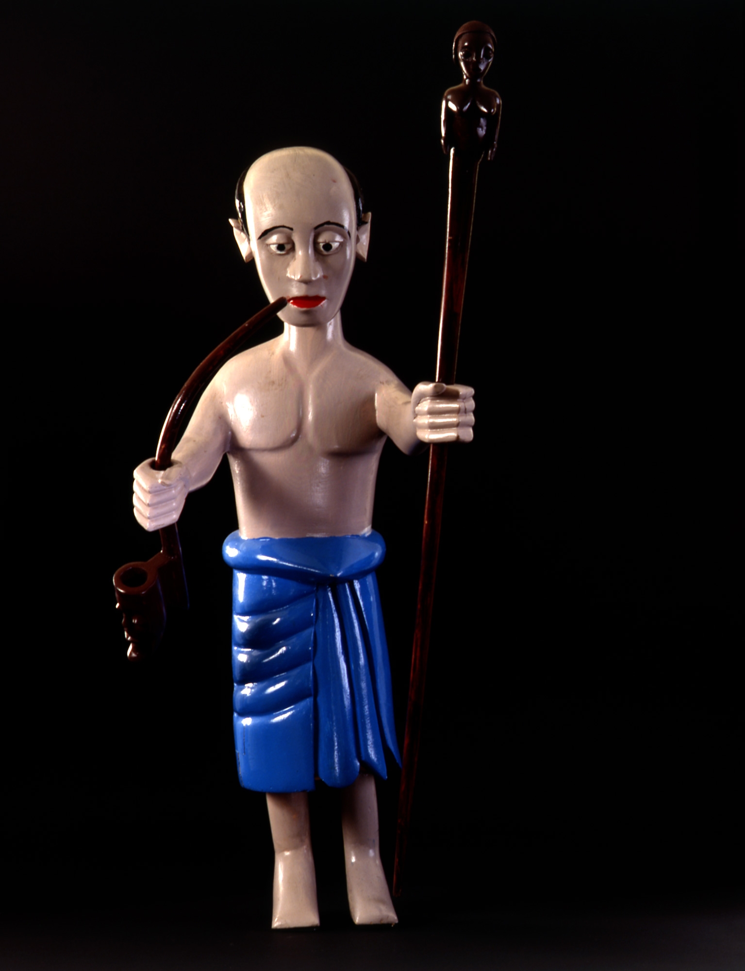 He spent his whole life in a house in the old village-district of Amoutivé right up until his death. He worked in an outdoor studio under an awning, almost out in the street, creating the domestic altars corresponding to the various family and individual fetishes that protect his family and his work. Agbagli is a sacred craftsman, a sculptor who drew his inspiration from the statuettes and idols of the traditional voodoo religion. He himself is lowly priest of this cult that has complex ramifications and is widespread on the shores of the Gulf of Benin. At times he is a healer, well versed in the use of plants, herbs and libations. Agbagli explains to people he trusts, that he owes his calling to a strange little long-haired character made of wood, and embellished with shells, that he discovered in the bush and has had for 30 years. It is to him that Agbagli owes his success, or at least his reputation. At first he worked for the community of Bé, his cultural and religious environment, that is gradually being swallowed up by the century-old city of Lomé. Agbagli's work, spread out over a more than 20-year period, is impressive. Some of his pieces are truly beautiful. For his colors he uses thick and shiny automobile paints. He created a strange, cheerful, realistic world. His statues concern three distinct tribes: some are pink, some a pale white, others are brown, more realistic and more anchored in African rural life. Agbagli's wistful, dreamy statues can be seen in many courtyards and hotels. Agbagli Kossi Fofo, Agbagli Kossi Beaugars, two of his sons, who watched him work over the years, now imitate his work. More anchored in contemporary reality, they have developed new figures far from the Voodoo gods.