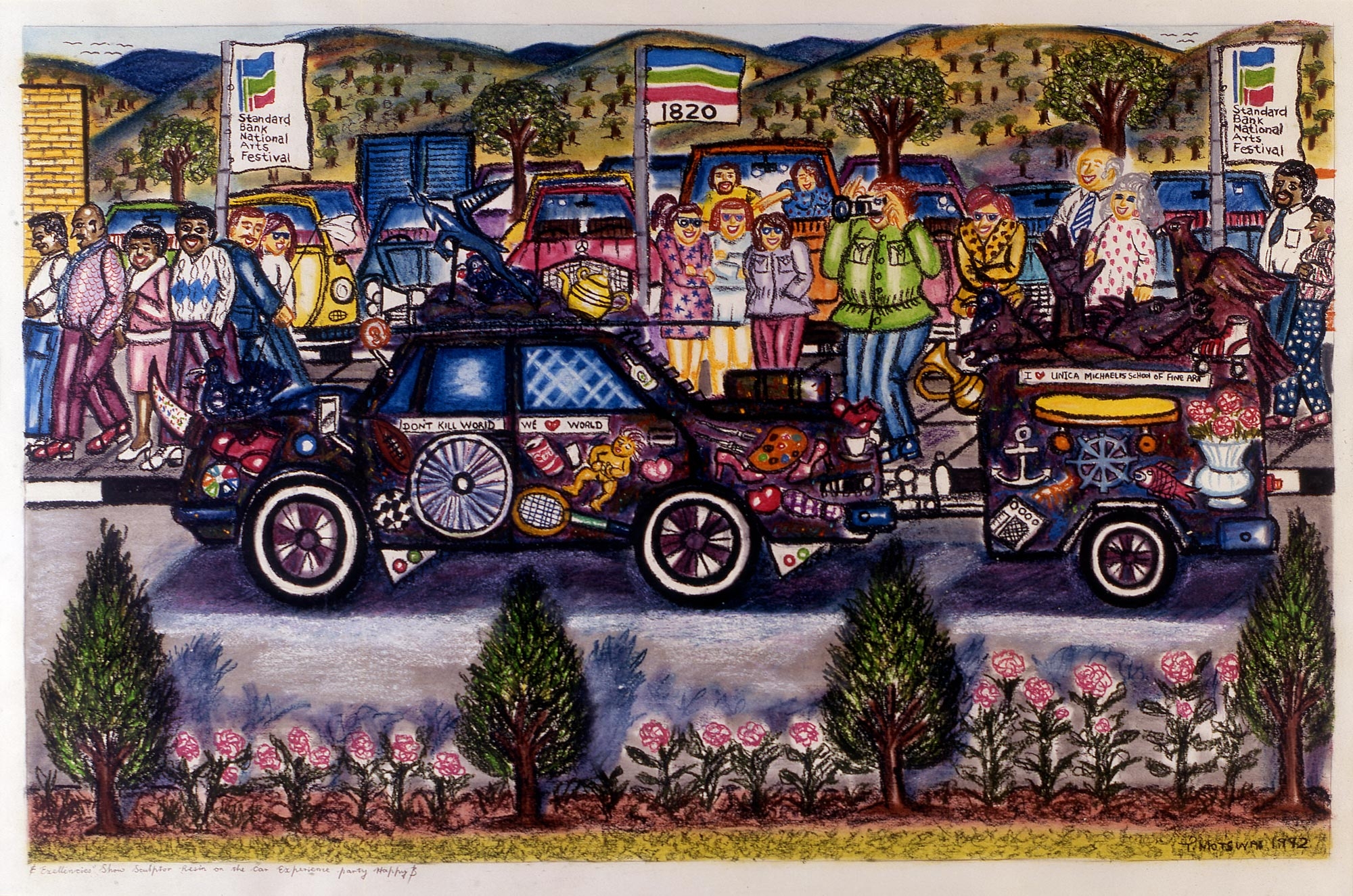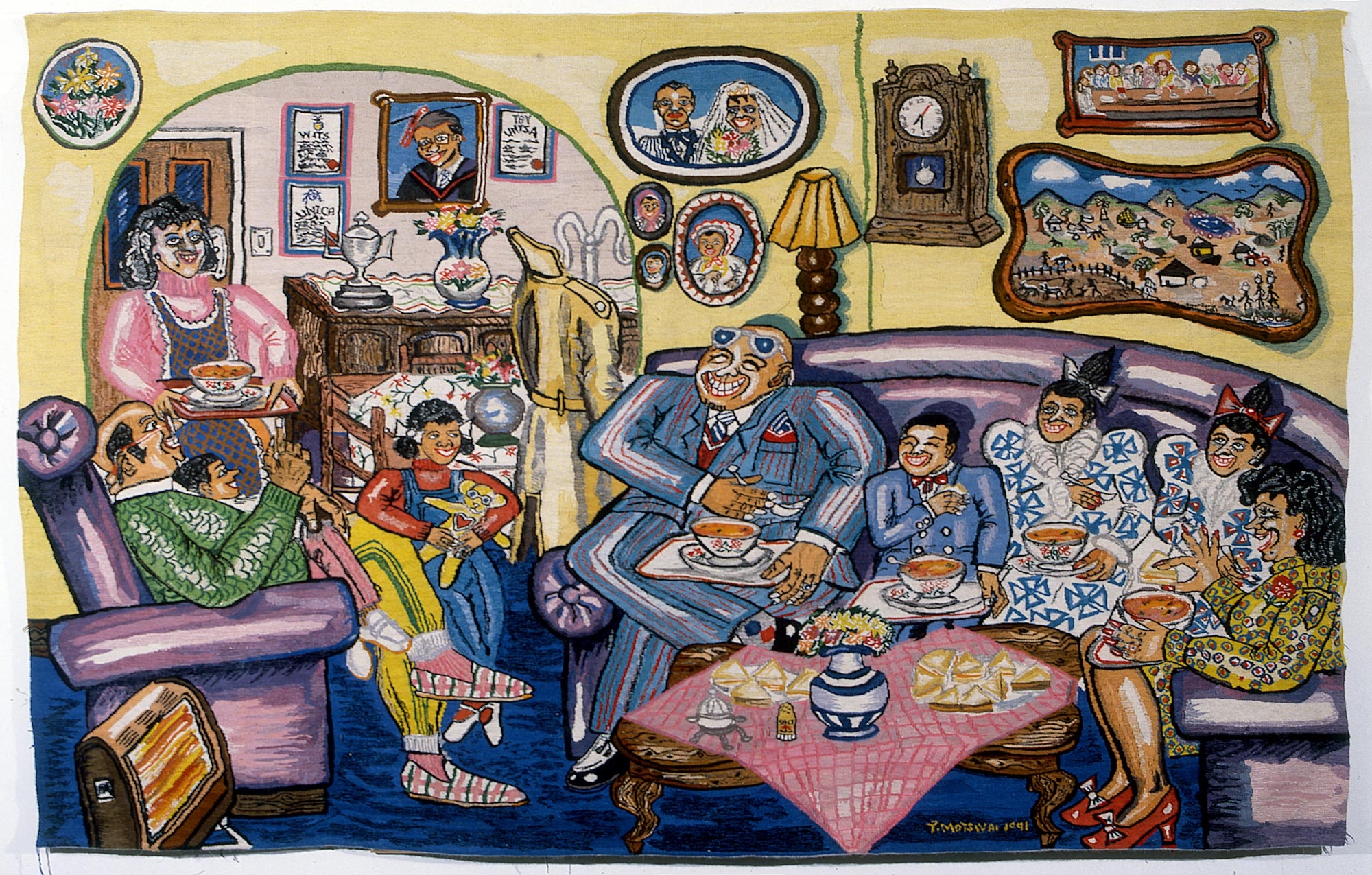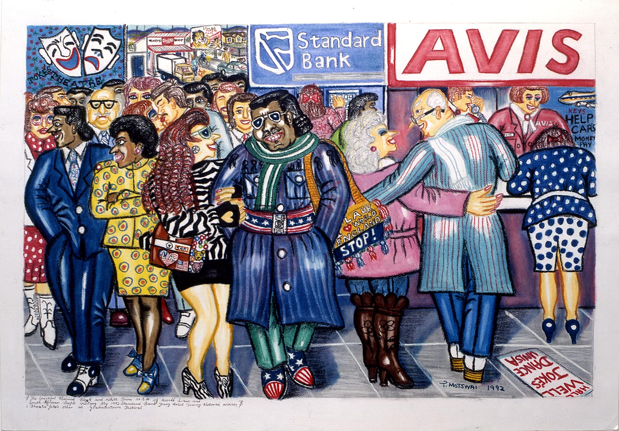 Motswai's work presents a highly personal recording of situations in the changing political and social environment in South Africa. The attention to detail in his cartoon-like paintings most certainly comes from the fact that he lives in a visual world.