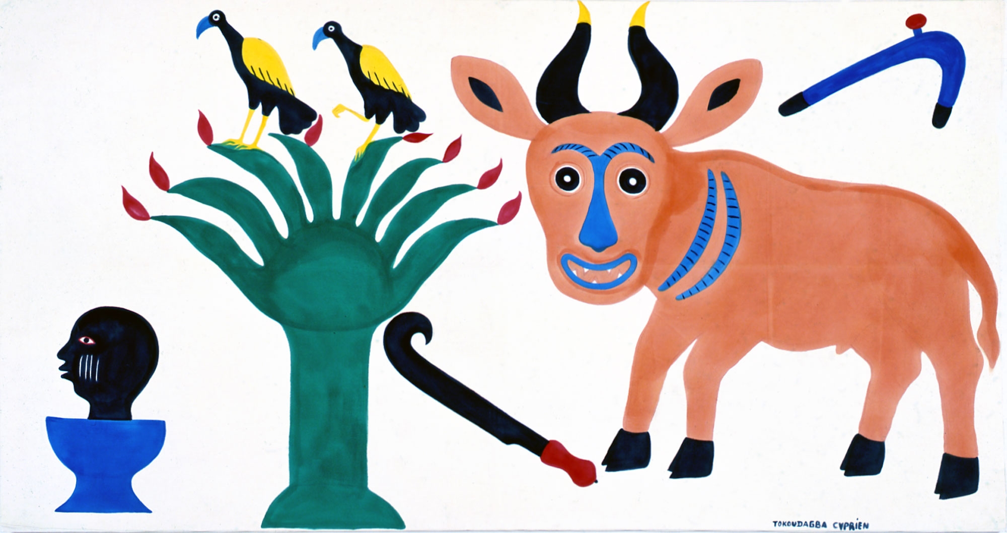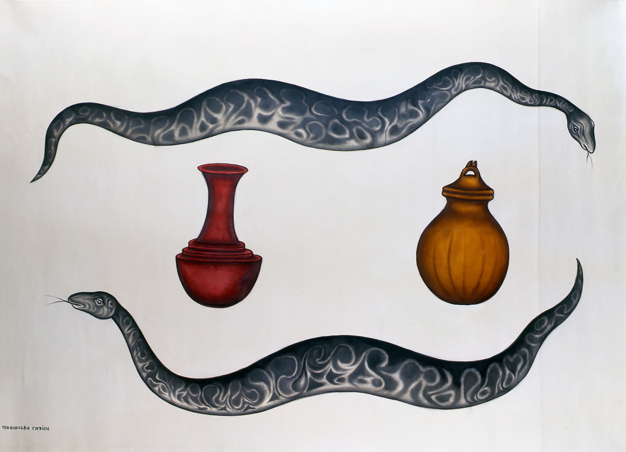 In contact with the very rich traditions of Benin painting, a country that was one of the most prominent cultural cradles of the African continent, and was chopped up by colonial boundaries, Cipryen Tokoudagba made his name as the master painter of vodoo temples in Benin, Ghana, Togo and Nigeria.
