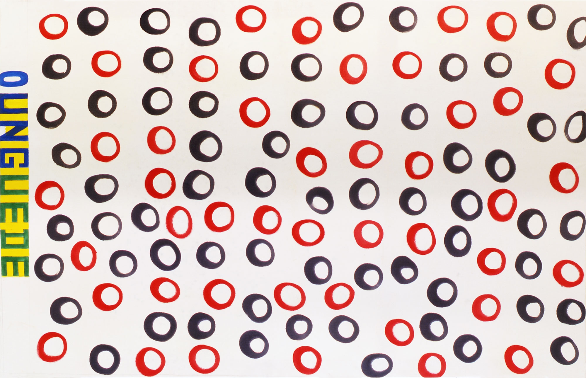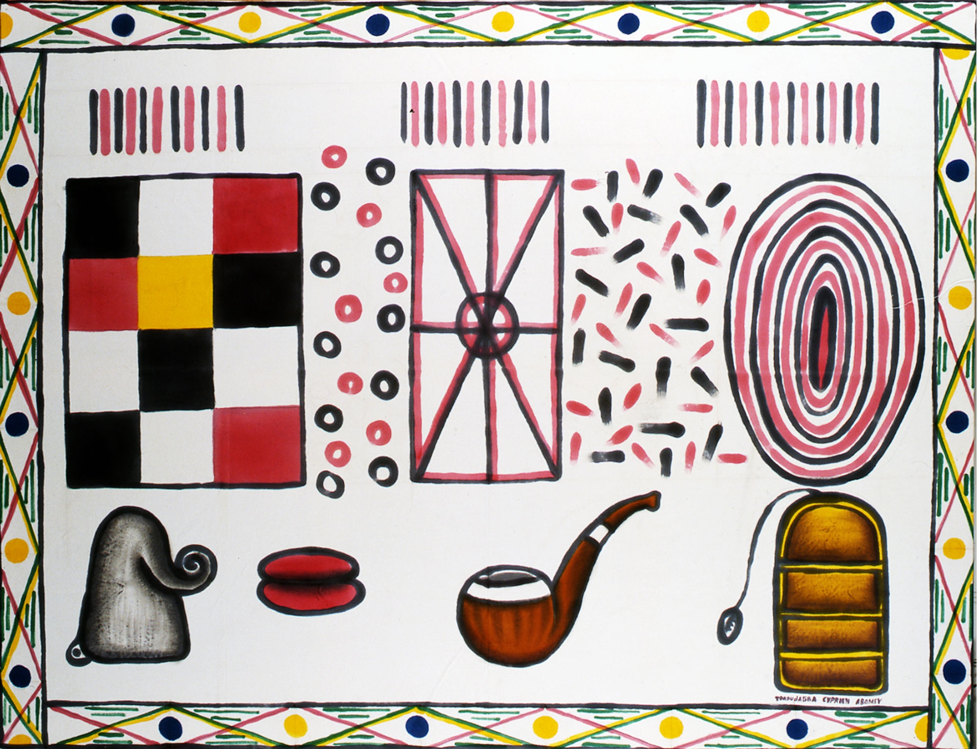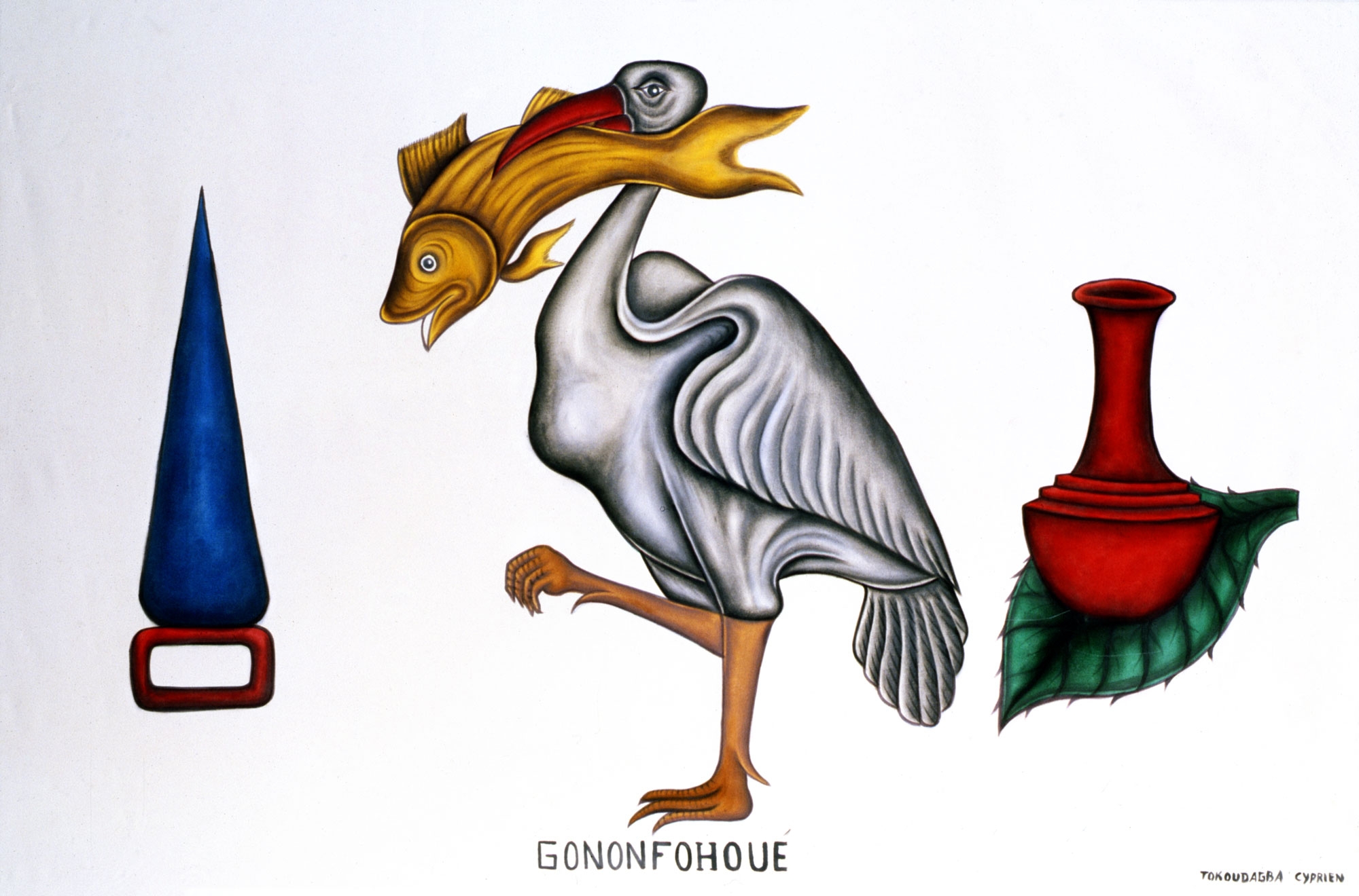 Without abandoning the wall paintings that he is commissioned, Cyprien Tokoudagba undertook 1989 some large canvasses in which he combined, taking great liberties, the emblems of the kings of Abomey, symbols of the divinities (Earth, Fire, Water, Air) and various objects related to his culture. The combination of all these faces, objects and signs make his paintings look like a strange rebus.