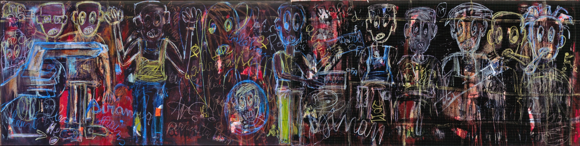 The riots that followed the disputed Ivorian presidential election in late 2010 greatly influenced Aboudia's painting. As the violence escalated, leading Ivory Coast * into civil war, daily life, in particularly the capital Abidjan, was thrown into turmoil. During this period, the artist took refuge in a basement studio and began a body of work responding to the horrors of the country's devastating political situation.