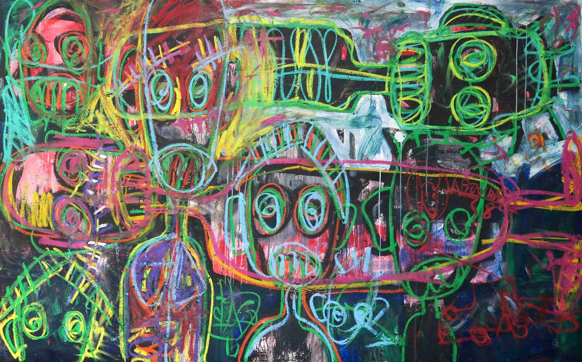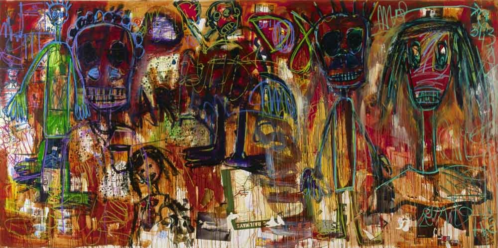 Aboudia is noted for his large-scale, heavily layered, brutally energetic paintings that combine an innocence and spontaneity with the portrayal of a dark interior world. His urban landscapes are haunted by armed soldiers, ominous skulls and a populace hemmed in by violence and danger. Often claustrophobic and oppressive, his painting achieves a careful balance between pathos and agression, and the vitality of his style often recalls Basquiat.