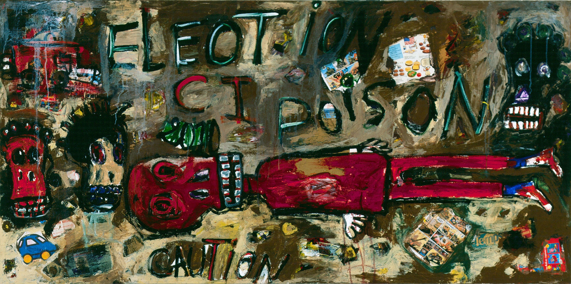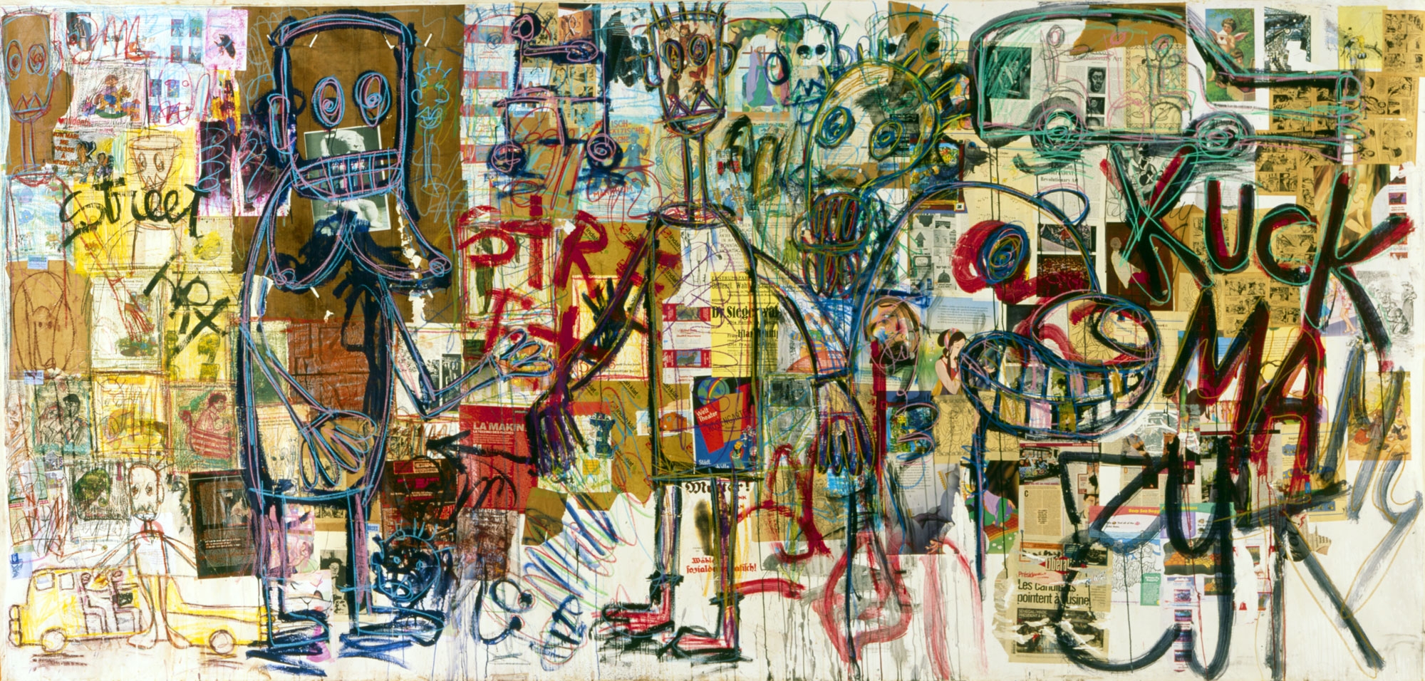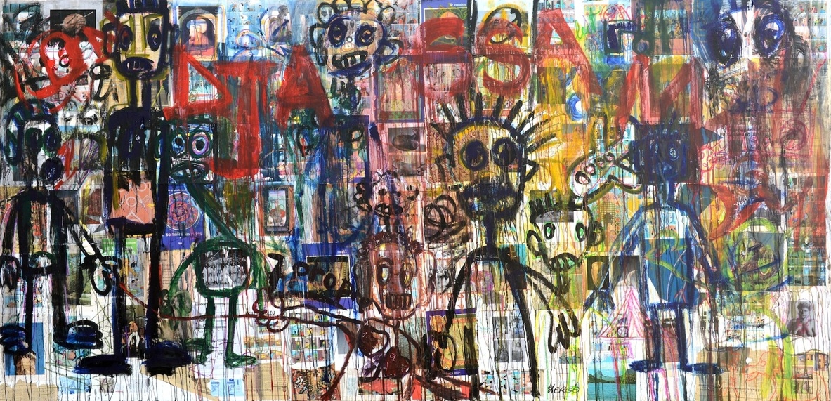 Collage, acrylic, mixed media and crayon on canvas