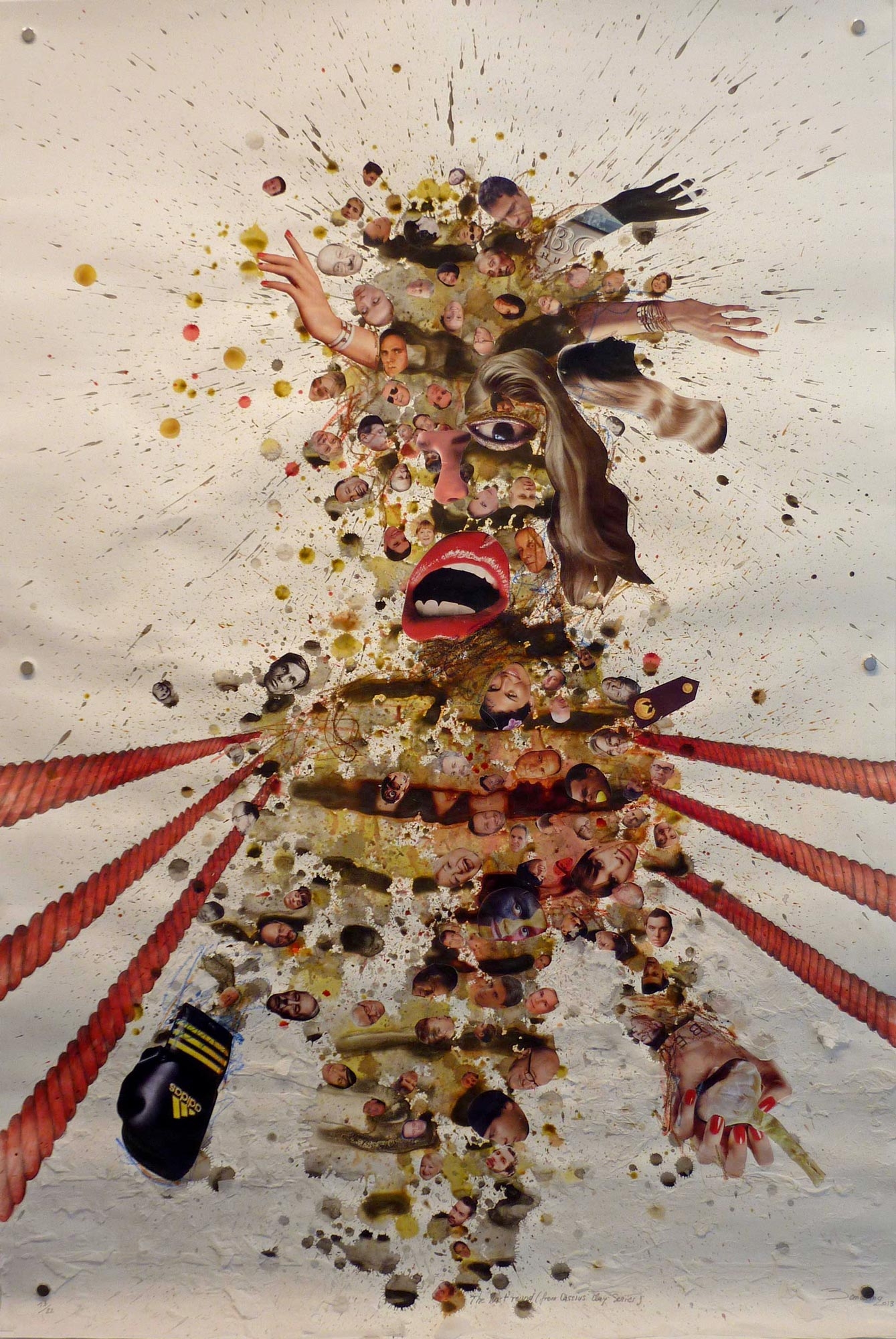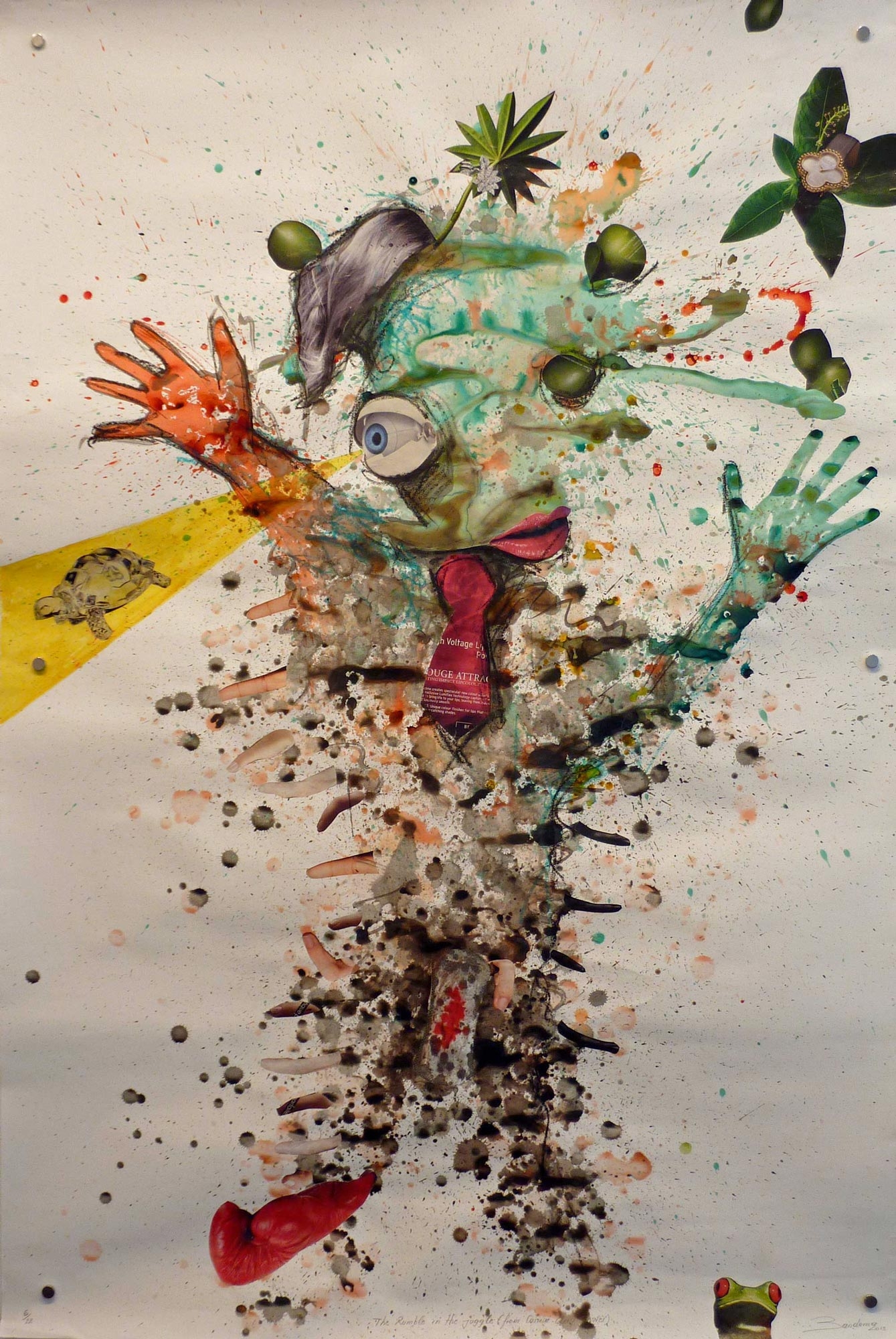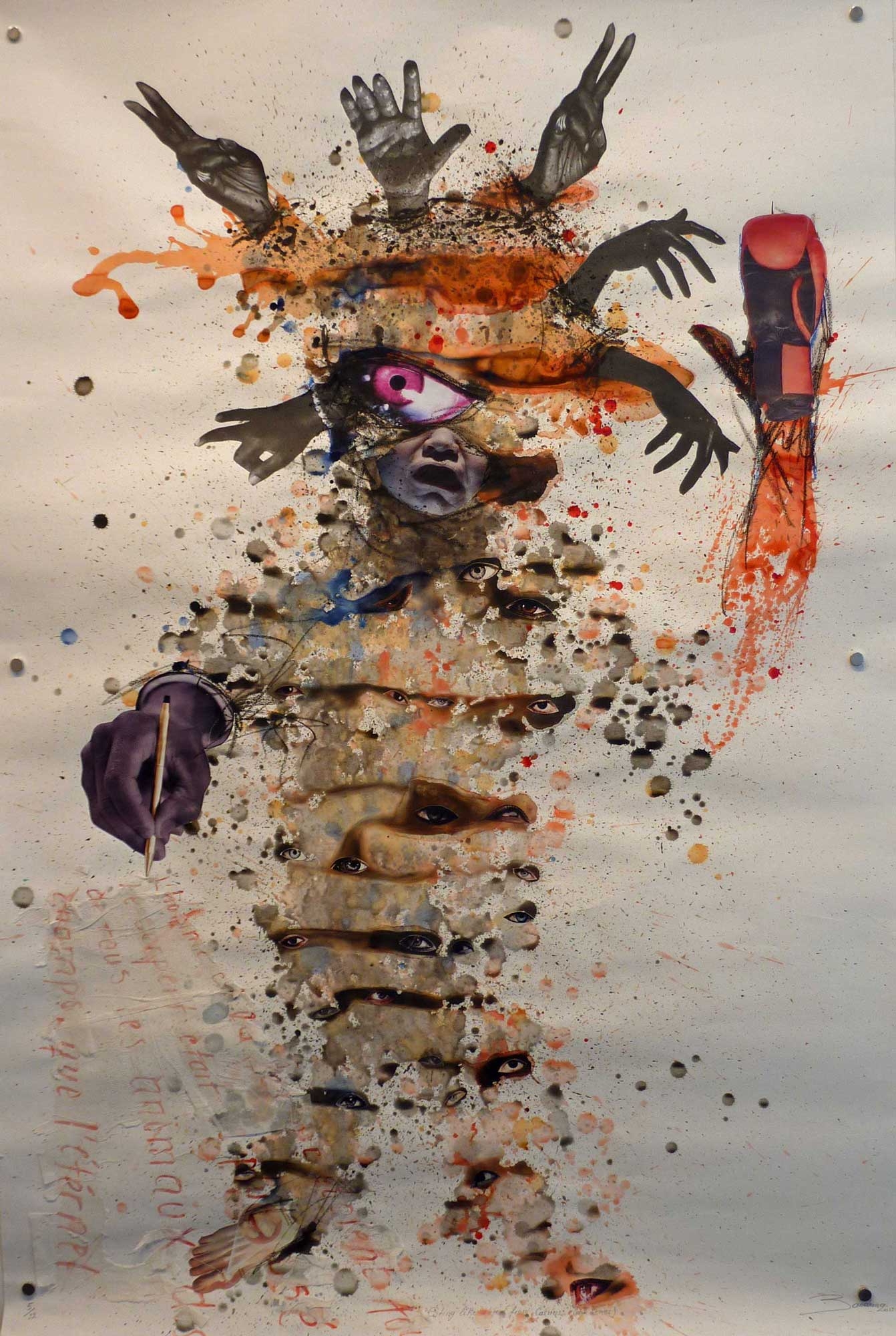 Bandoma combines acrylic, watercolour, felt-tip pen, ink, and collage, often on handmade paper to give these works a tangible energy. Splashes of paint and bursts of colour add violence and urgency to his portraits. Inspired by the chaos of daily life and the fast moving media that make up Kinshasa's street culture, the artist's aesthetic approach and choice of materials reflect a dynamism in new artistic trends stemming from Africa.