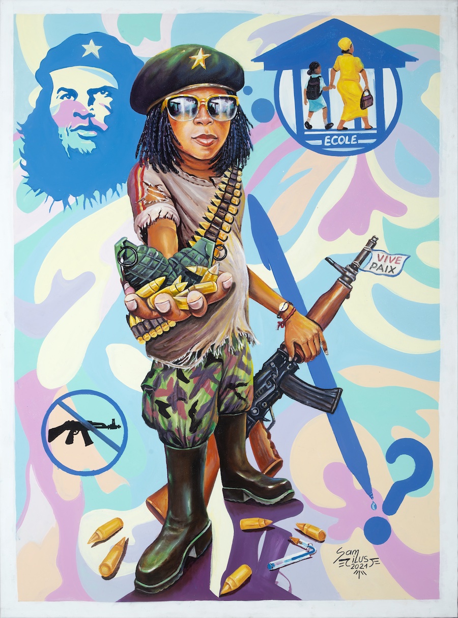 Having become close to some artists from the informal group of “Congolese popular painters,” whose best known members include Chéri Samba, Chéri Chérin, Moke and Pierre Bodo, he embarked on a career as a painter and took part in a number of group exhibitions, including Jeunes talents at the Memling Hotel in Kinshasa and Congo Paintings, un autre vision du monde, organised in 2018 by François Poncelet at the African Museum of Namur (MAN) in Belgium. Like those of his friends in Kinshasa, Sam’Ilus’ paint- ings are characterised by their colourful nature, their vibrant figuration, but also by their social and sometimes political commentary.