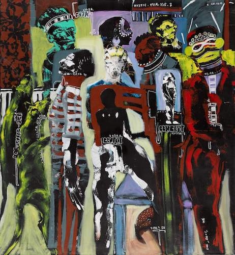 As a child, Soly Cissé used to draw on x-rays brought home by his father, who was a radiolo- gist. The work on transparency, the play of light and darkness continue to permeate his work, with light sometimes seeming to release characters trapped in a dark background. His paintings, with deep, dense colours, contain references to African shamanic mythology, and are loaded with hieratic figures evoking timeless and mysterious presences, close to a hybrid natural world in which the animal component seems essential. His paintings, made with brushes, hands and palette knives, are sometimes marked with stencil inscriptions. They convey stories where entangled bodies and hybrid creatures provoke questioning, astonishment and fascination.