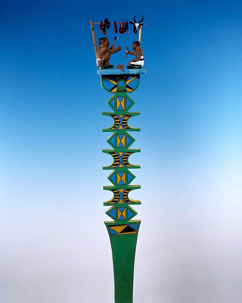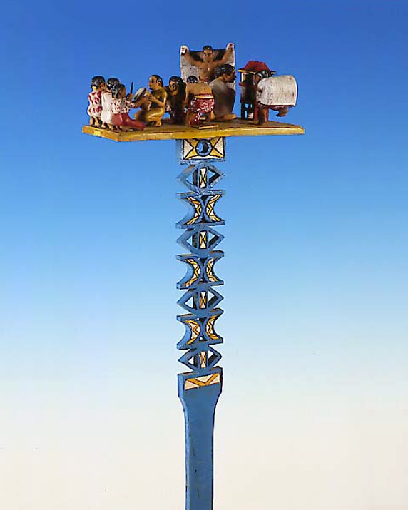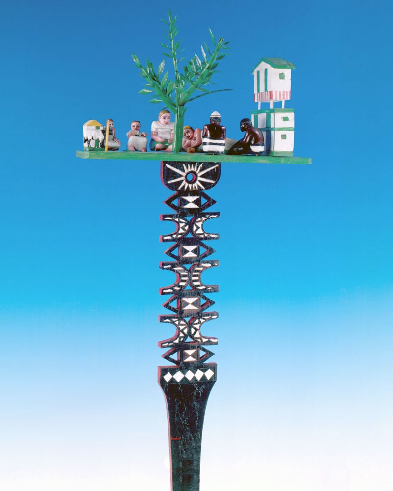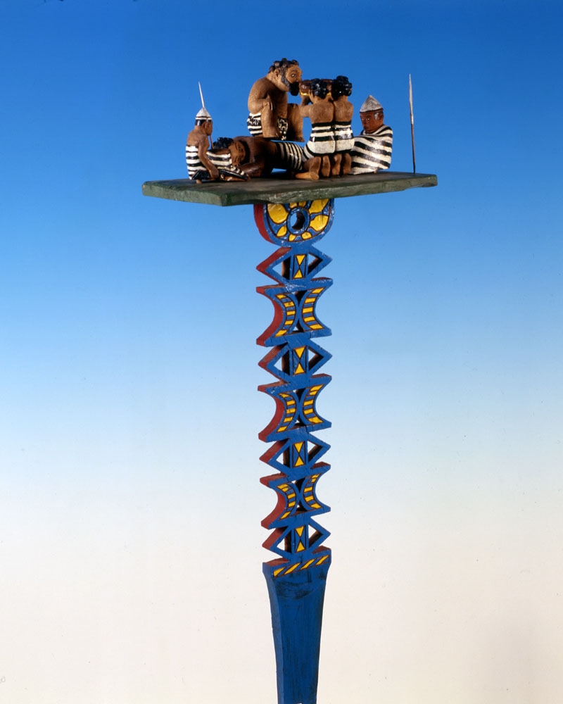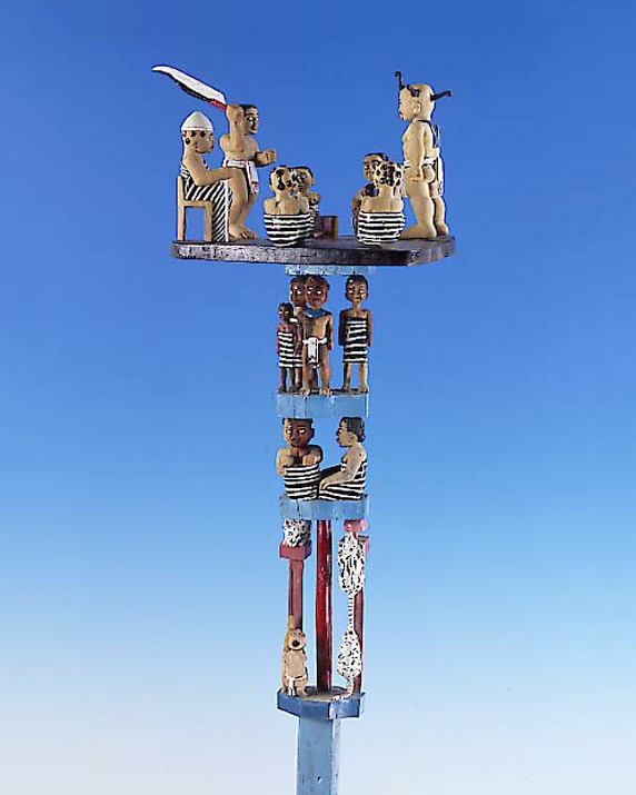 Efiaimbelo both honors and extends the ritual of the aloalos. One of the first sculptors to have painted aloalos for decorative purposes only, Efiaimbelo has also introduced acrylic colours and new imagery into the genre. Typical of the traditional aloalos, Efiaimbelo creates carved posts of hardwood (Mendorave), roughly seven feet in height. Depending on the different interpretations of the Mahafalaly myths and legends, varying meanings are given to the conventional motifs which decorate the support as well as to the figures on the tableaux on top. The lower part can be described as a succession of stacked figure eights (the number for abundance and a symbol for the full moon), which are alternately abstract and geometrical. On top of the post is a more representational scene, usually a zebu and his herdsman. (The zebu, humped cattle, are a symbol of wealth; a child is similarly a sign of prosperity). As a result of his deep ties to a Westerner who is inducted as Avisoa (The Welcome One) by Soroboka (Efiaimbelo’s forbear) into his Temaromainte clan, Efiaimbelo has modified the traditional tableaux: cattle thieves, bush-taxis, wrestlers, airplanes, motorcycles, tales of healing, fantastic legends, and personal anecdotes animate his repertory. Aloalos honour the dead, but also assert life. Through his sophistication and resourcefulness, Efiaimbelo has continued and developed this vital art.