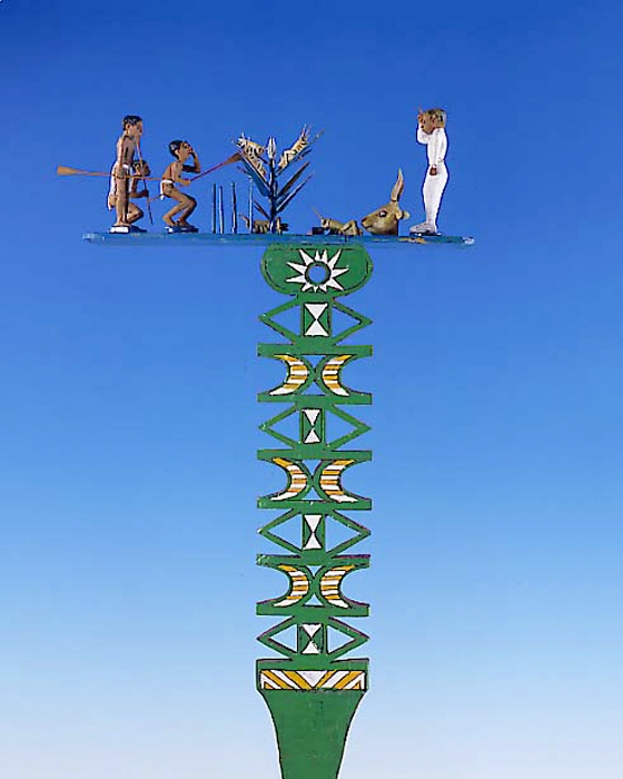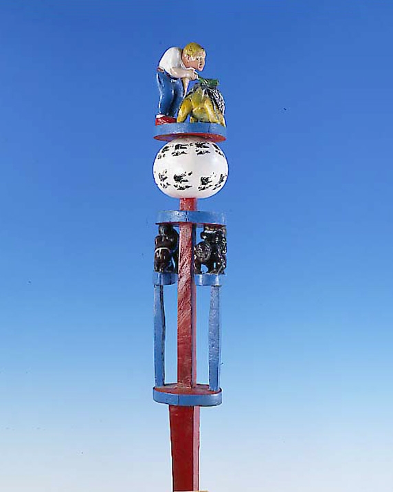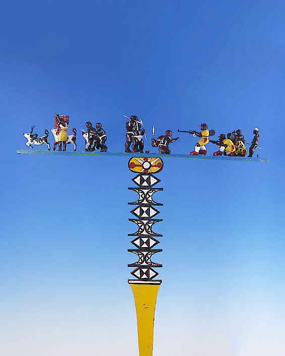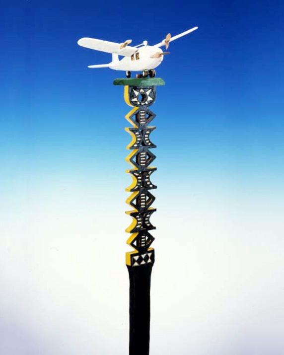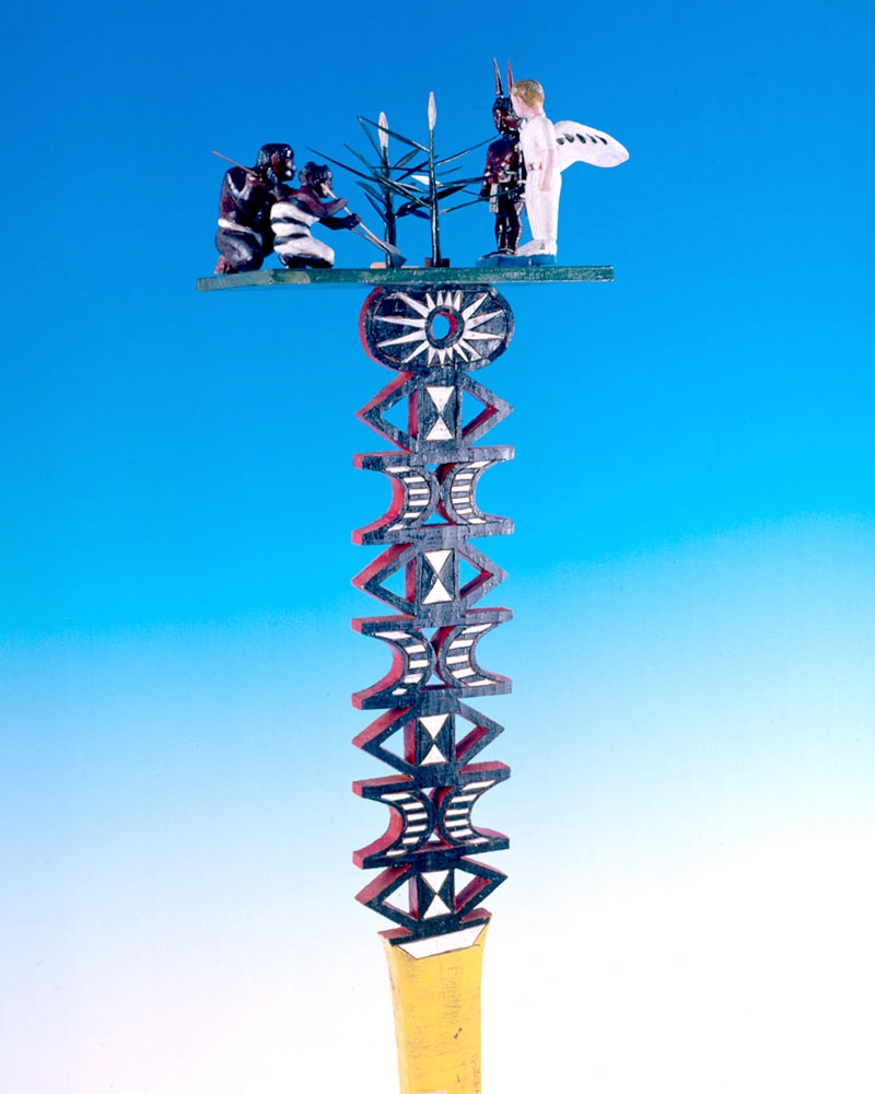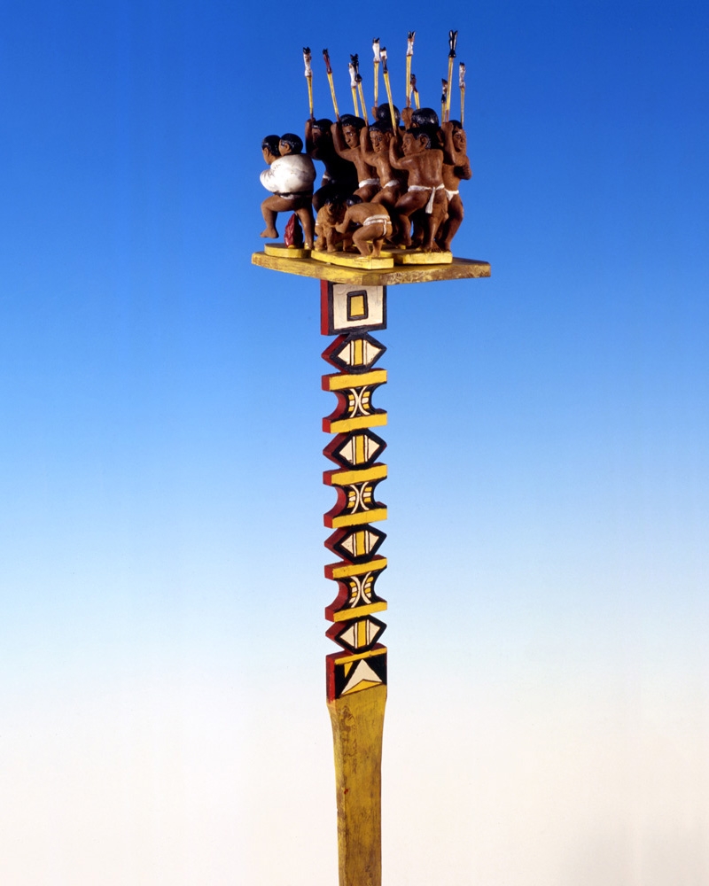 Efiaimbelo both honors and extends the ritual of the aloalos. One of the first sculptors to have painted aloalos for decorative purposes only, Efiaimbelo has also introduced acrylic colours and new imagery into the genre. Typical of the traditional aloalos, Efiaimbelo creates carved posts of hardwood (Mendorave), roughly seven feet in height. Depending on the different interpretations of the Mahafalaly myths and legends, varying meanings are given to the conventional motifs which decorate the support as well as to the figures on the tableaux on top. The lower part can be described as a succession of stacked figure eights (the number for abundance and a symbol for the full moon), which are alternately abstract and geometrical. On top of the post is a more representational scene, usually a zebu and his herdsman. (The zebu, humped cattle, are a symbol of wealth; a child is similarly a sign of prosperity). As a result of his deep ties to a Westerner who is inducted as Avisoa (The Welcome One) by Soroboka (Efiaimbelo’s forbear) into his Temaromainte clan, Efiaimbelo has modified the traditional tableaux: cattle thieves, bush-taxis, wrestlers, airplanes, motorcycles, tales of healing, fantastic legends, and personal anecdotes animate his repertory. Aloalos honour the dead, but also assert life. Through his sophistication and resourcefulness, Efiaimbelo has continued and developed this vital art.