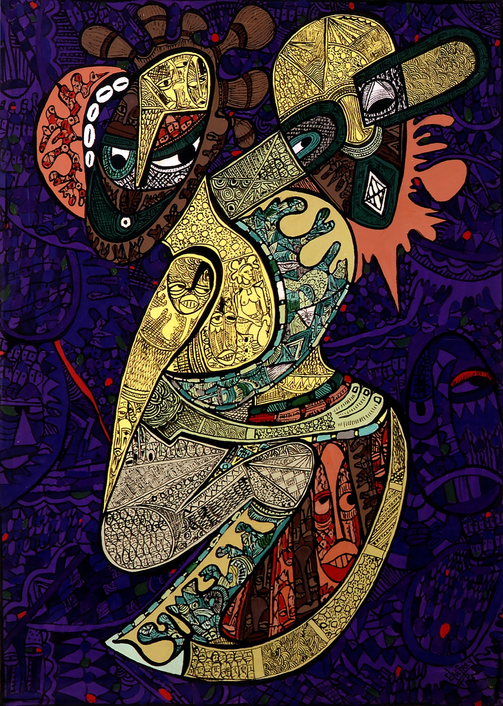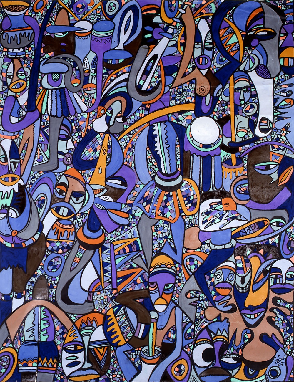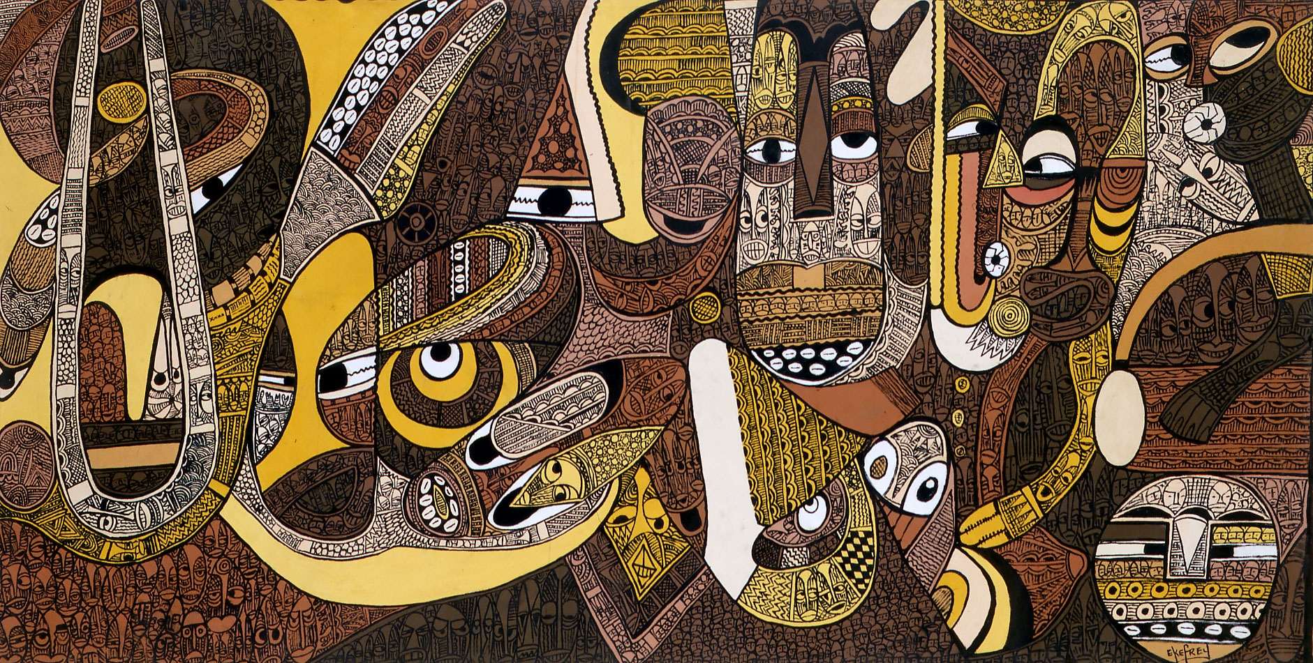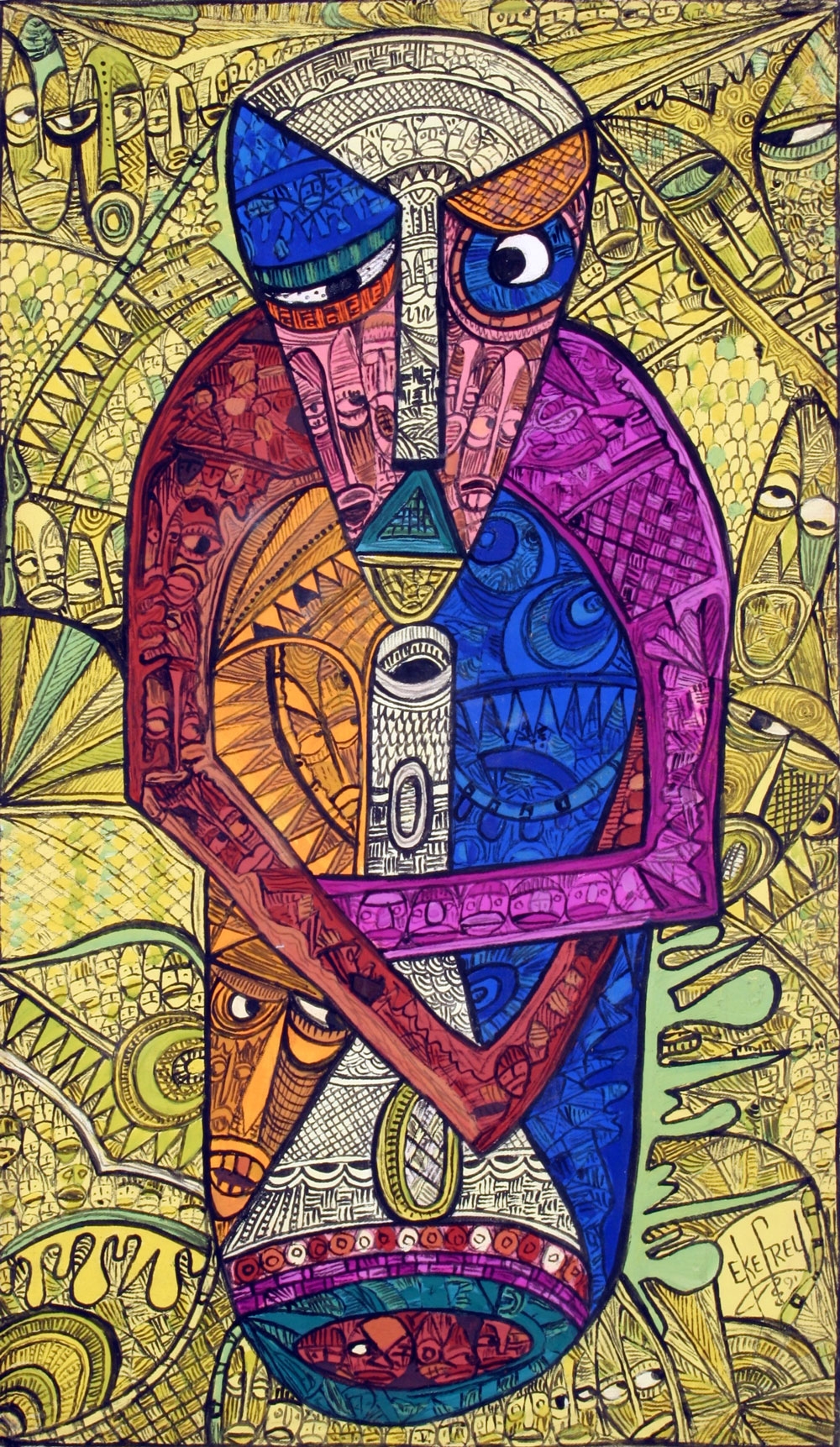 Ekong Emmanuel Ekefrey belongs to the Ibibio ethnic group, akin to the Igbo group which occupies the southeast part of Nigeria. He is very attached to the Ibibio culture which has a rich tradition of music, danse, painting and sculpture. Although some large paintings represent the Ibibio myths and legends, the artist is formal: he isn’t focused on the past. Ekefrey invented his own style. He remembers well the lessons taught by his Ibibio ancestors and believes that each person has a specific gift that he should be free to develop.