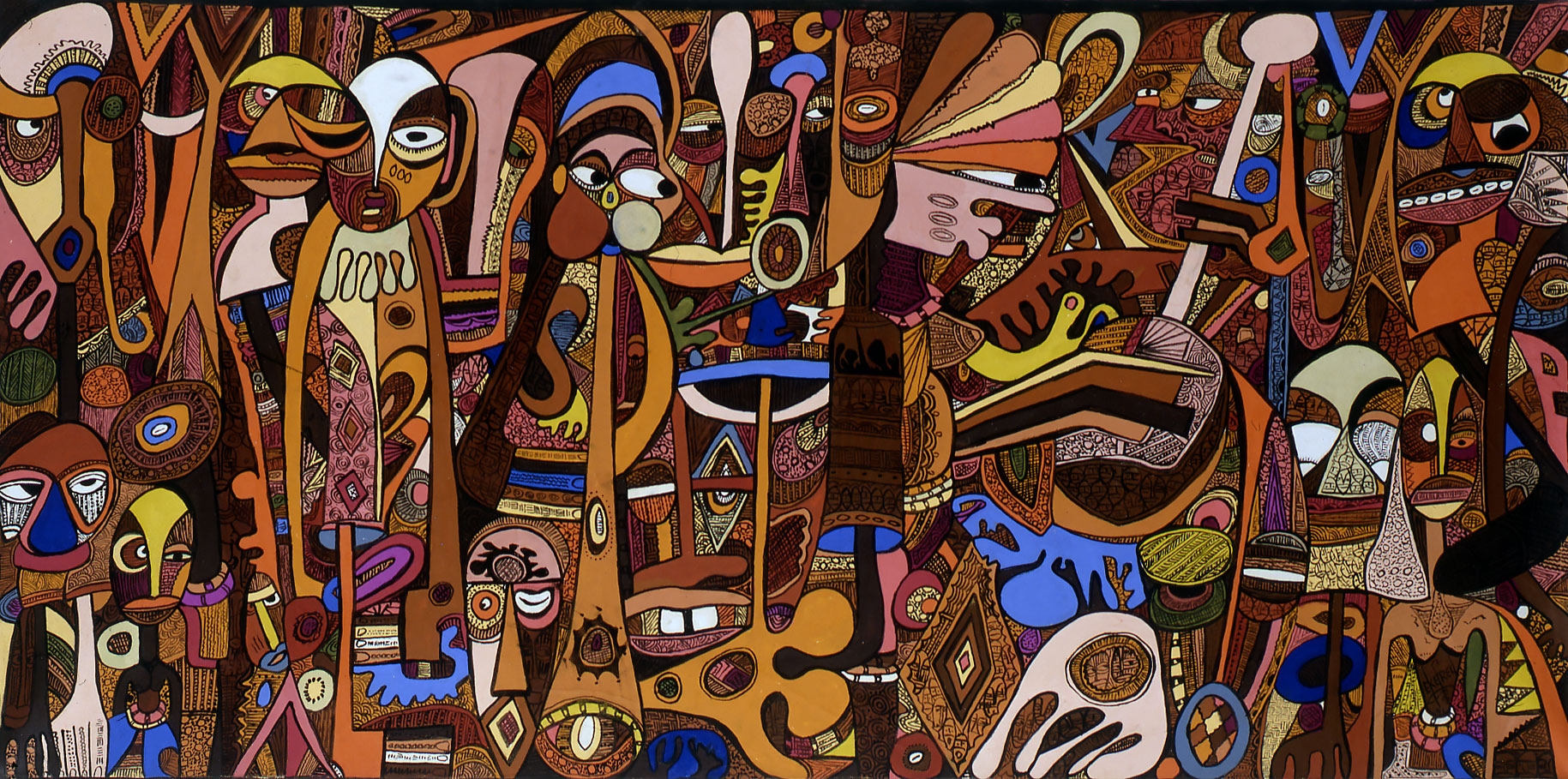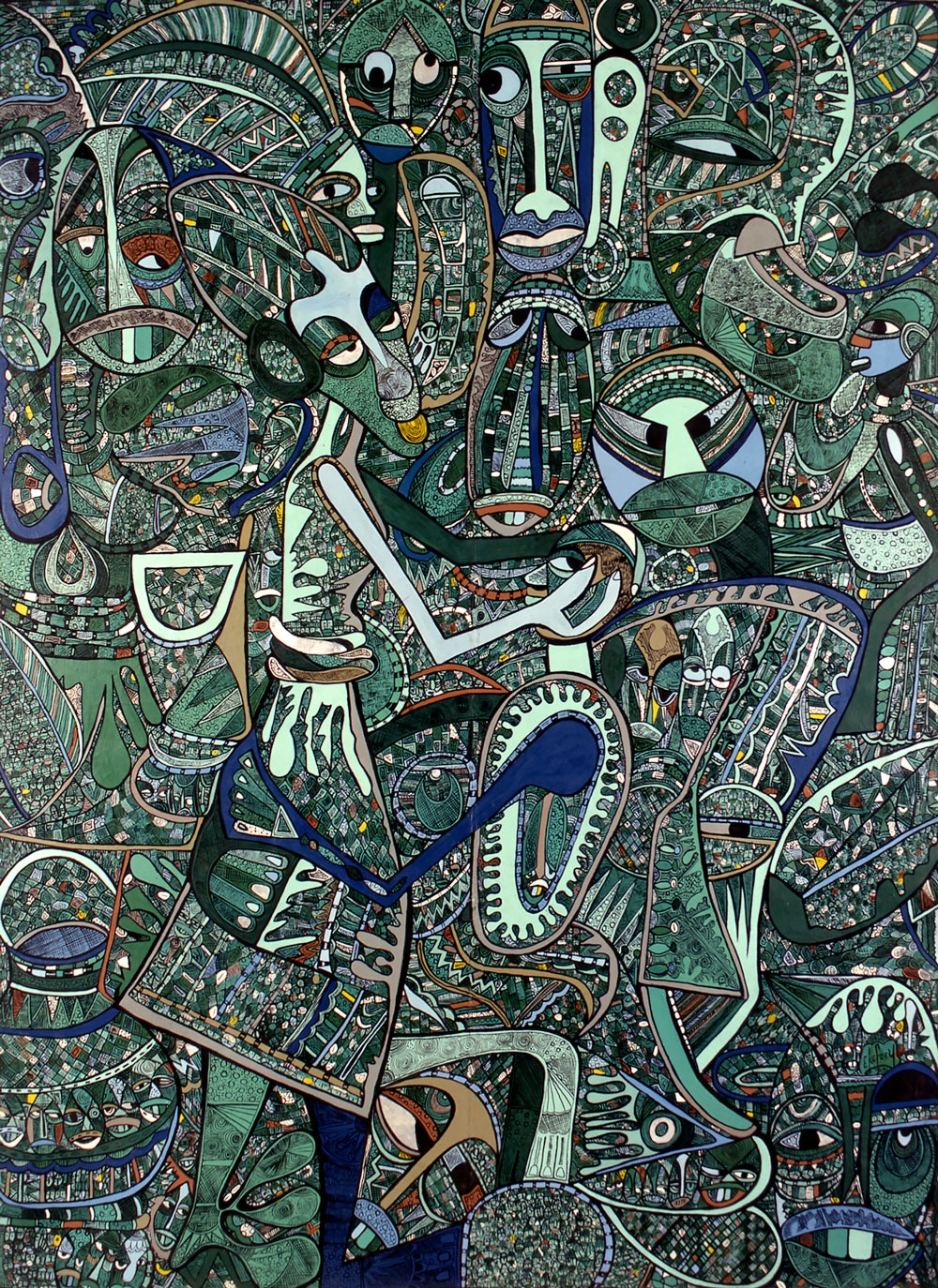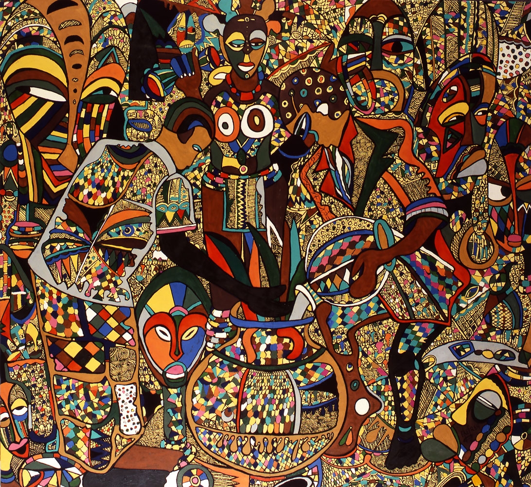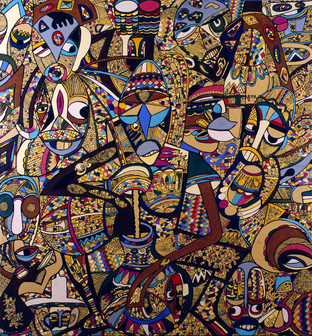 Ekong Emmanuel Ekefrey belongs to the Ibibio ethnic group, akin to the Igbo group which occupies the southeast part of Nigeria. He is very attached to the Ibibio culture which has a rich tradition of music, danse, painting and sculpture. Although some large paintings represent the Ibibio myths and legends, the artist is formal: he isn’t focused on the past. Ekefrey invented his own style. He remembers well the lessons taught by his Ibibio ancestors and believes that each person has a specific gift that he should be free to develop.