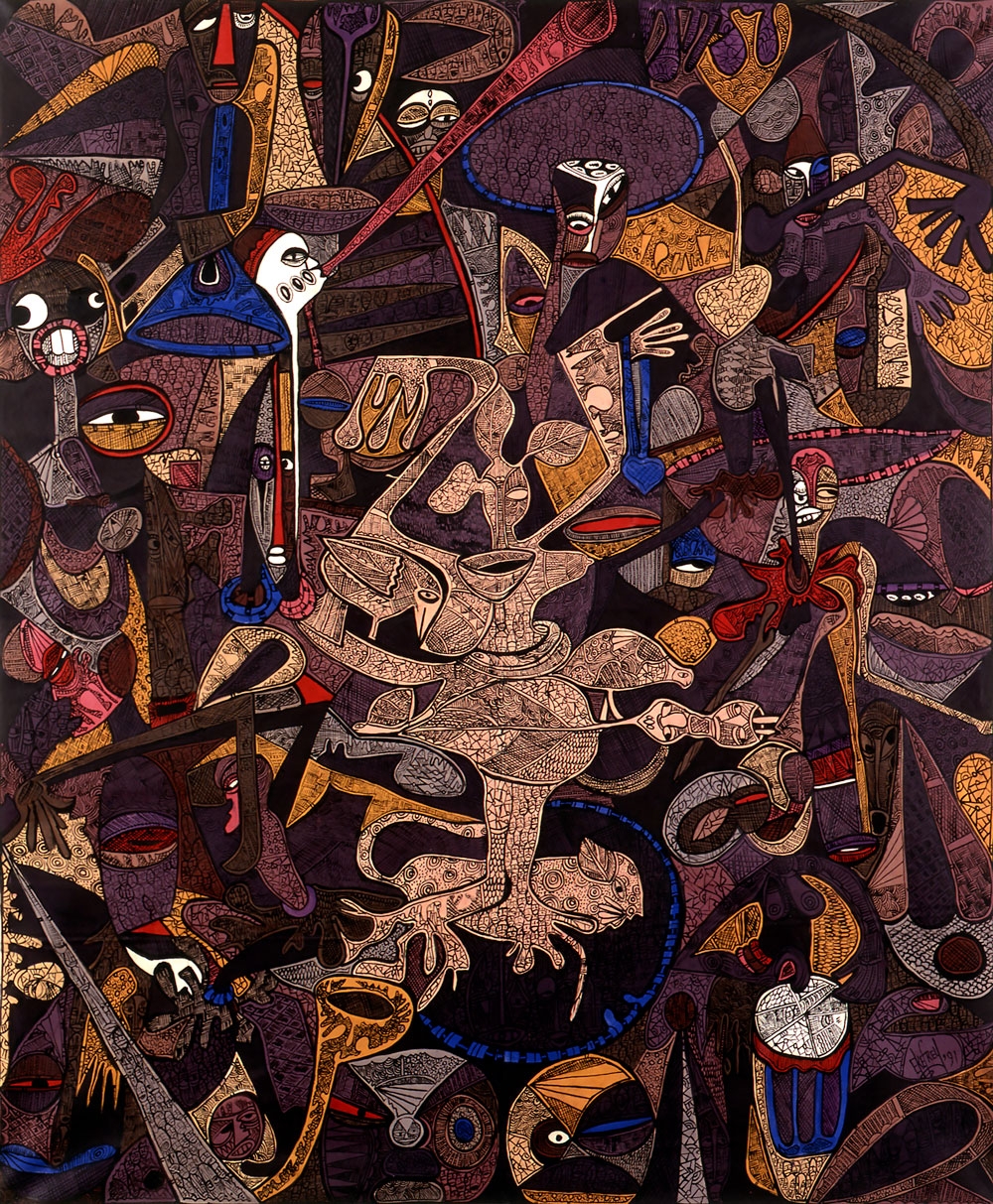The most striking characteristic of Ekefrey’s paintings is the « all-over » technique; paint is applied on the canvas stretched on the floor and it produces an effect of cutting up and interpenetration of each figure, creating movement. There is a profusion of shapes, lines, colors that convey a great dynamic. The viewer’s eyes are driven from a point to the other and this eye movement gives the impression of penetrating the painting.