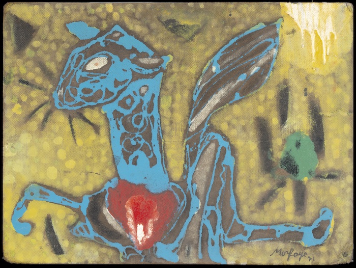Mor Faye, a prolific and talented artist whose legacy includes nearly 800 paintings, graduated from the Dakar Fine Arts School in 1964. He was one of the figures of the Dakar school that emerged in the early 1960s. At barely nineteen years old, he was selected along with a dozen other artists to represent Senegal at the First World Festival of Negro Arts. Nine years after his death in 1993, he represented his native country again posthumously at the Venice Biennale. Like most other members of the Dakar school, Mor Faye absorbed the concept of negritude developed by the poet, theorist and President Léopold Sédar Senghor. His art reveals reality on several levels, transforming it, always seeking to give priority to the representation of an ideal. As Souleymane Bachir Diagne, a close acquaint- ance, has pointed out, negritude is not “an essence,” but “an existence.” It is a phenomenon that is always “unpredictable, a force that contin- ually emerges, the insurrection of a vital impulse.” Mor Faye liberated and enriched contempo- rary thinking in Africa, working as an educator during the day and devoting his nights to intense personal work. Suffering from cerebral malaria, he died at the age of thirty-seven after spending his last years in a psychiatric hospital. In refer- ence to this painful period, his friend Issa Samba has written, “[...] we see him descending into a well of colour as if he wanted to blend into it.”