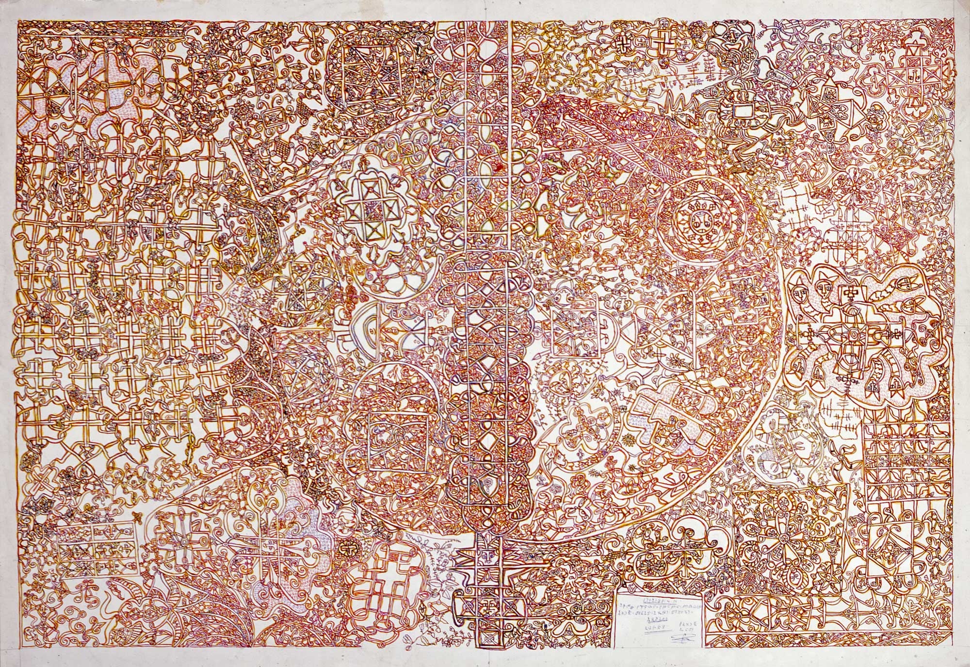 Far from being an artist seeking his roots, Gedewon was one of the finest practitioners of poetry and rhetoric in the Ethiopian Orthodox Church. Along with his religious studies, he was secretly initiated into talismanic art, a discipline used for prayer and healing. Reaching back as far as the origins of Christianity in Ethiopia (i.e., to the fourth century), talismanic art draws on the same Hellenic sources as Arab alchemy and the Hebrew Kabala. But while the art remained embryonic in the Mediterranean world, it flourished in Ethiopia as a means to cure patients whose ills were understood in terms of spiritual possession. For Gedewon, talismans were a writing from before writing; they were at once equally figure and text.