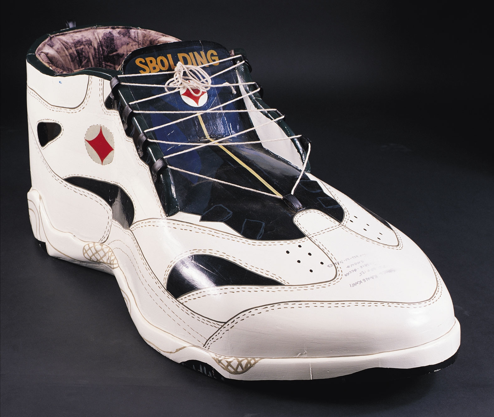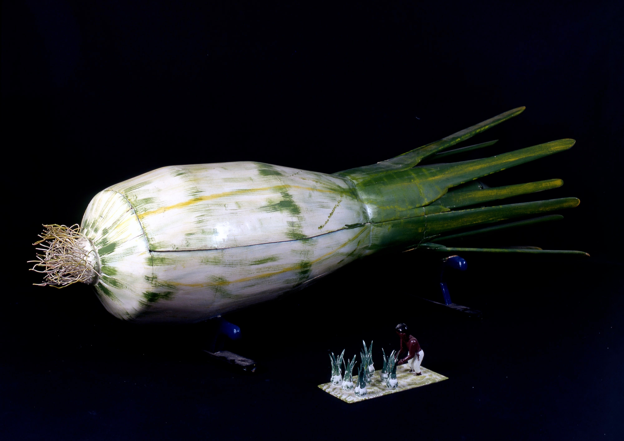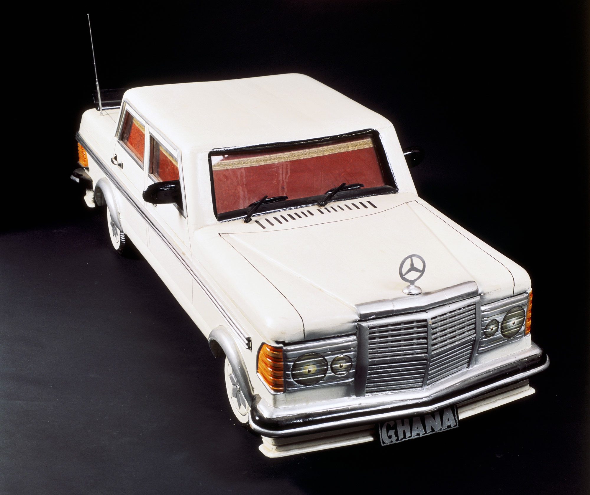 Samuel was trained in his father’s workshop, along with other apprentices, and he has made coffins that closely follow his father’s prototypes. For example, Kane Kwei had first carved an onion-shaped coffin for one of the village elders who had made a fortune in growing onions, a staple of the local diet, and Samuel has continued to produce coffins in this form. Another popular form that has been carried down from father to son is that of a white Mercedes Benz, originally conceived as a coffin for an owner of a fleet of taxis, but also used for other wealthy customers. However, Samuel Kane Kwei has also explored other possibilities, creating sculptures that reflect upon more up-to-date aspects of popular culture and daily life. He has also worked freely for more Western clients, creating sculptures that are not intended for funerary use.