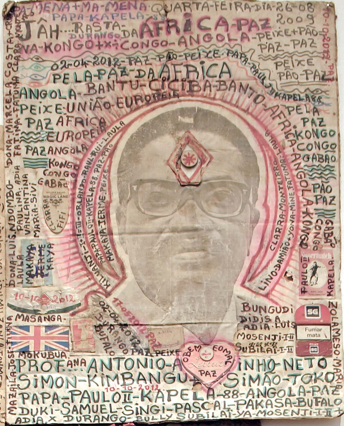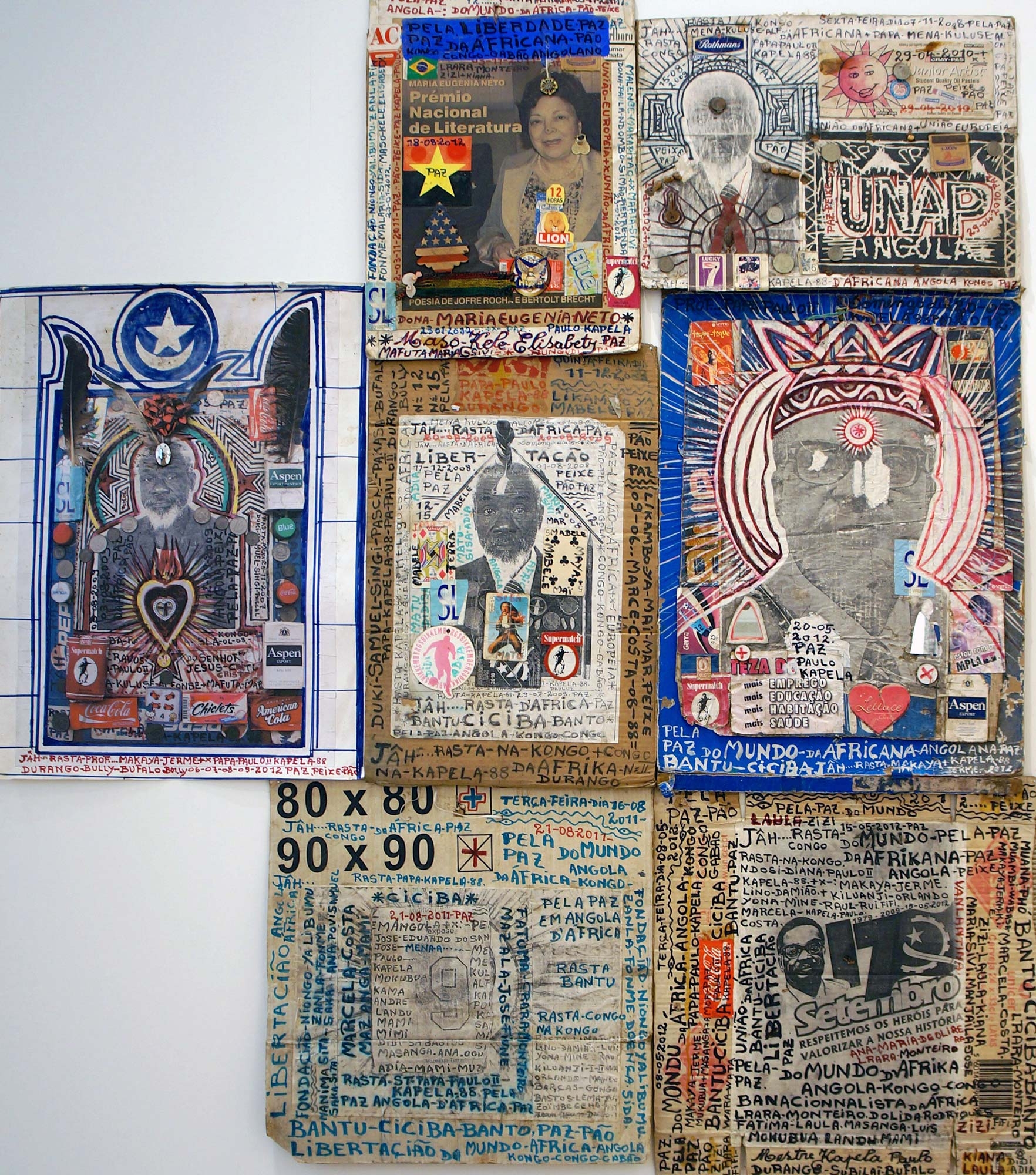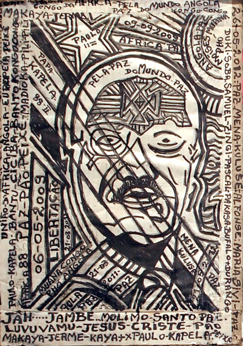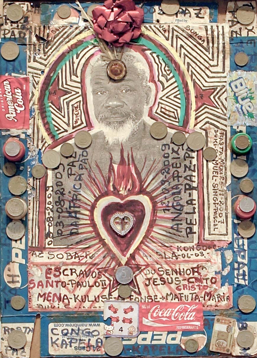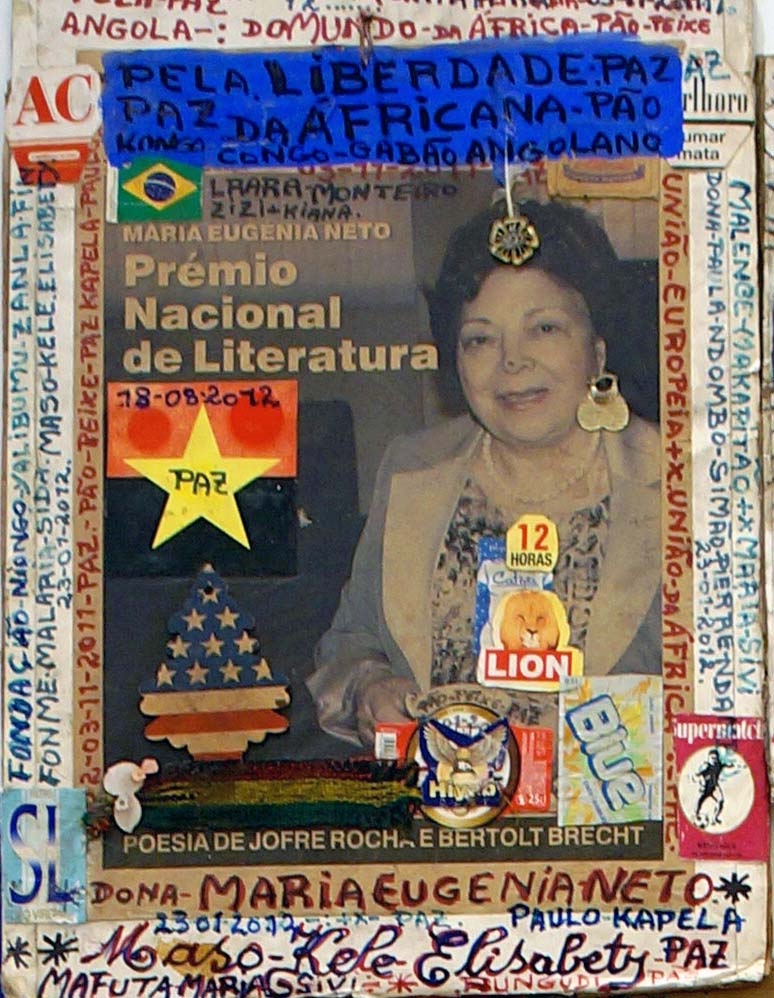 Mestre Paulo Kapela was born in the Province of Uige, Angola. First and foremost a self-directed artist, Kapela began painting in the early 1960s upon enrolling at the Poto-Poto School of Painting in Brazzaville, Republic of Congo. He finally settled in Luanda and opened his atelier where he met a number of artists, who later became active and important members of UNAP (the National Union of Visual Artists). Kapela is known for iconic works such as the installations of altars, and for the use of collage, text and narrative to produce complex pieces that intertwine his own personal story of migration between Luanda and the Congo, between being simultaneously a local and a foreigner within the historical framework of Angolas politics.
