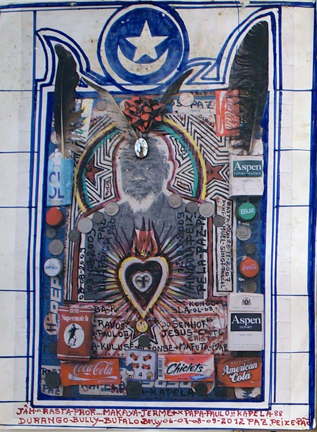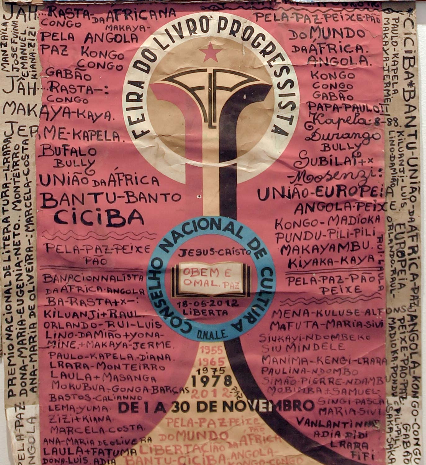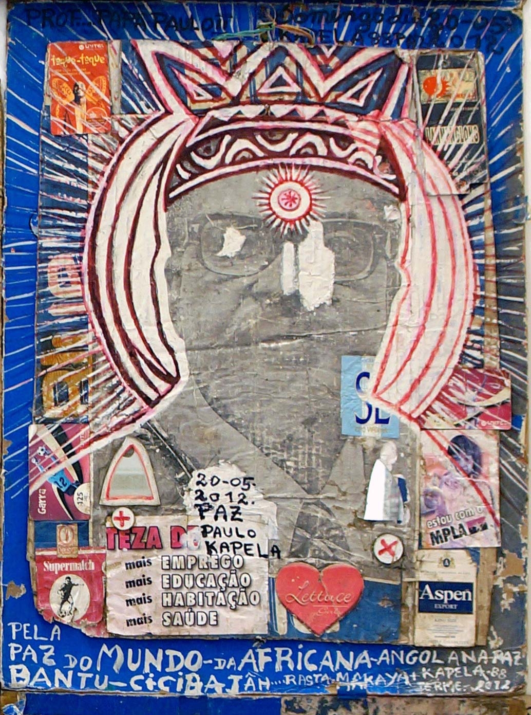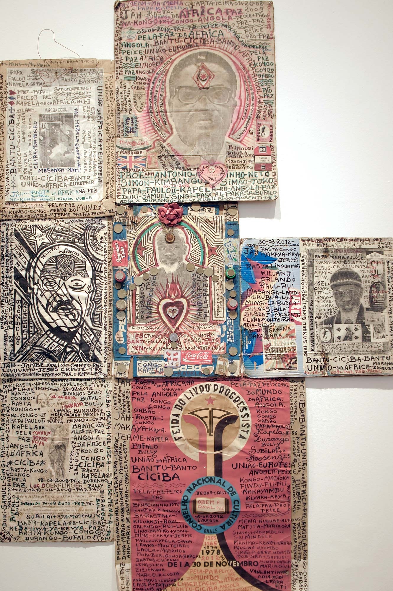 Mestre Paulo Kapela was born in the Province of Uige, Angola. First and foremost a self-directed artist, Kapela began painting in the early 1960s upon enrolling at the Poto-Poto School of Painting in Brazzaville, Republic of Congo. He finally settled in Luanda and opened his atelier where he met a number of artists, who later became active and important members of UNAP (the National Union of Visual Artists). Kapela is known for iconic works such as the installations of altars, and for the use of collage, text and narrative to produce complex pieces that intertwine his own personal story of migration between Luanda and the Congo, between being simultaneously a local and a foreigner within the historical framework of Angolas politics.