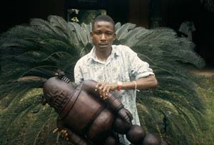 Koffi Kouakou, a fervent believer, declares himself a Bossoniste, following the path set by his ancestors. Born in the small village of Ahitou-Kongonou in central Côte d’Ivoire, he first apprenticed with his father, a renowned gold-worker; in 1980 he moved to Grand-Bassam and with his brother embarked on a career as a sculptor, following the example of his grandparents. After five years of training, Kouakou bade a formal farewell to his instructor and began to work independently. Realizing that the products of the artists-artisans gathered along Grand-Bassam highway were identical and without personality (simple toys, masks, and copies of statues made for the tourist market), Kouakou started to produce replicas of electronic tools and devices: Walkmans, cell phones, record players, sewing machines, chain saws, etc. Such items were an immediate success among tourists and expatriates, and by the end of the 1980s he had had established an international clientele.