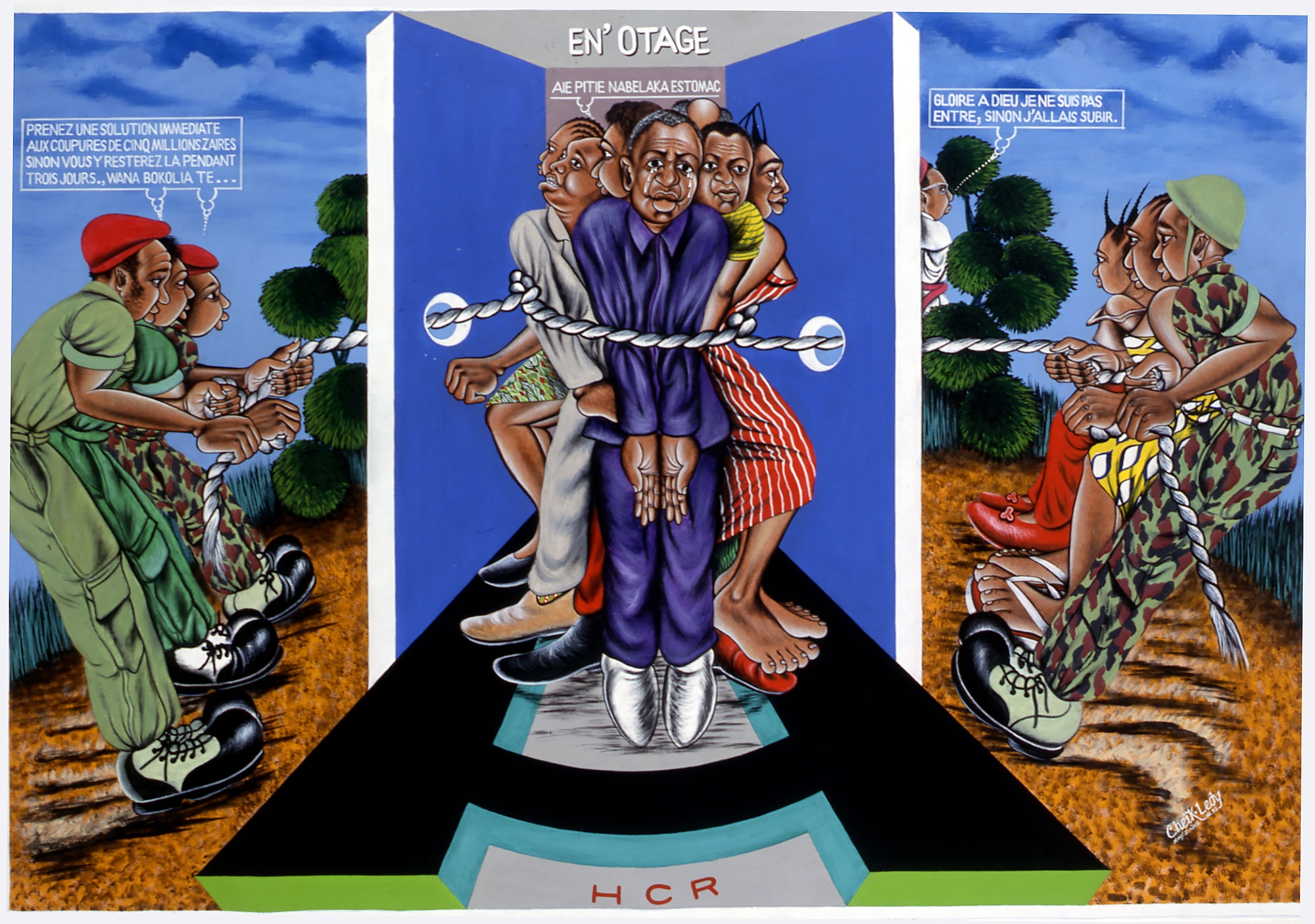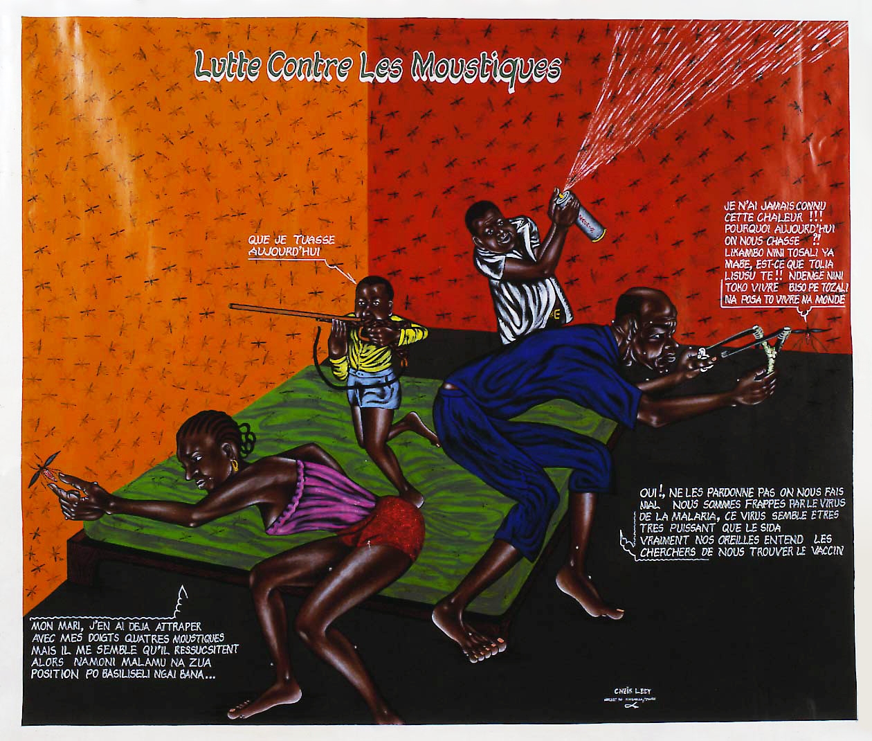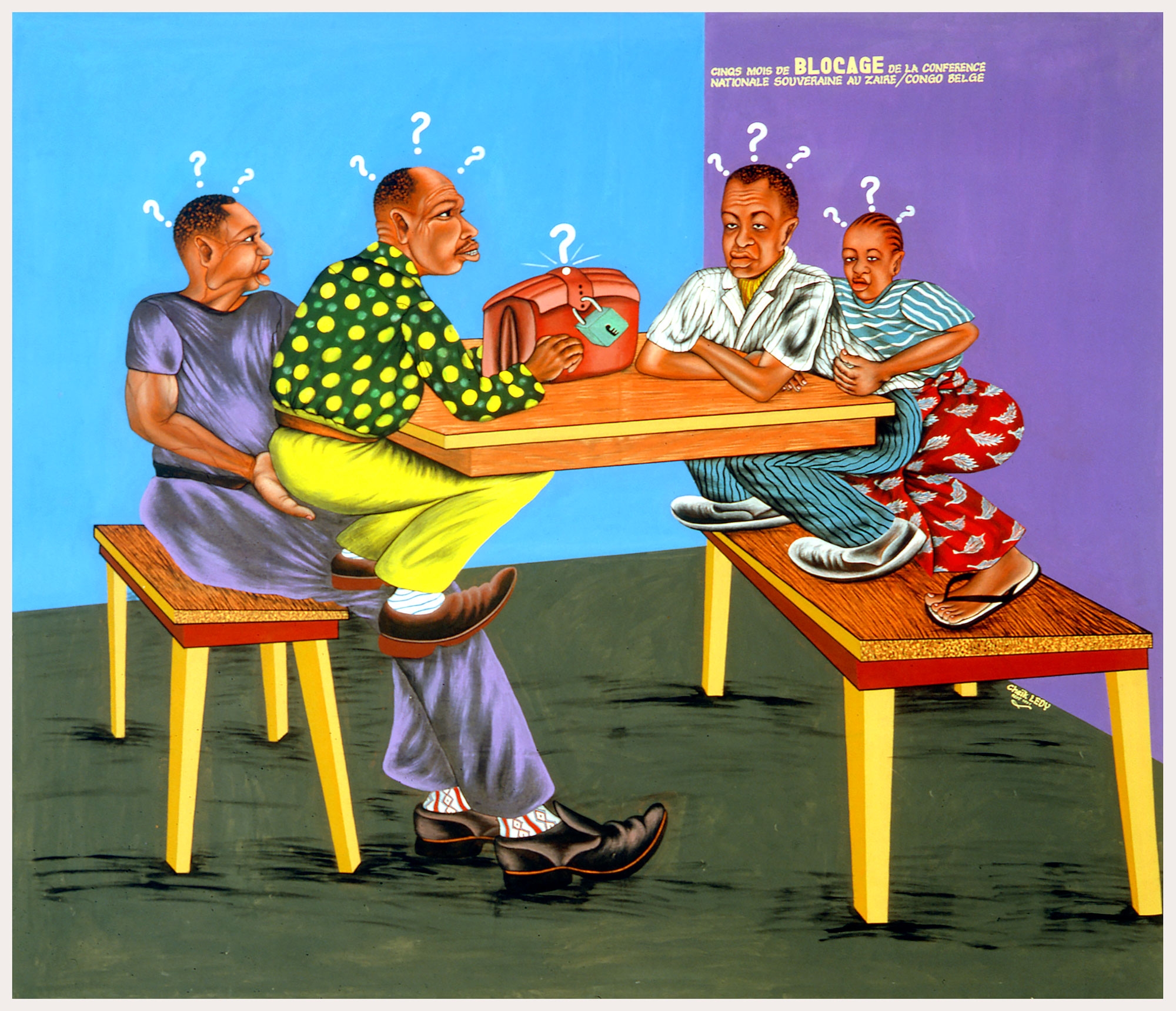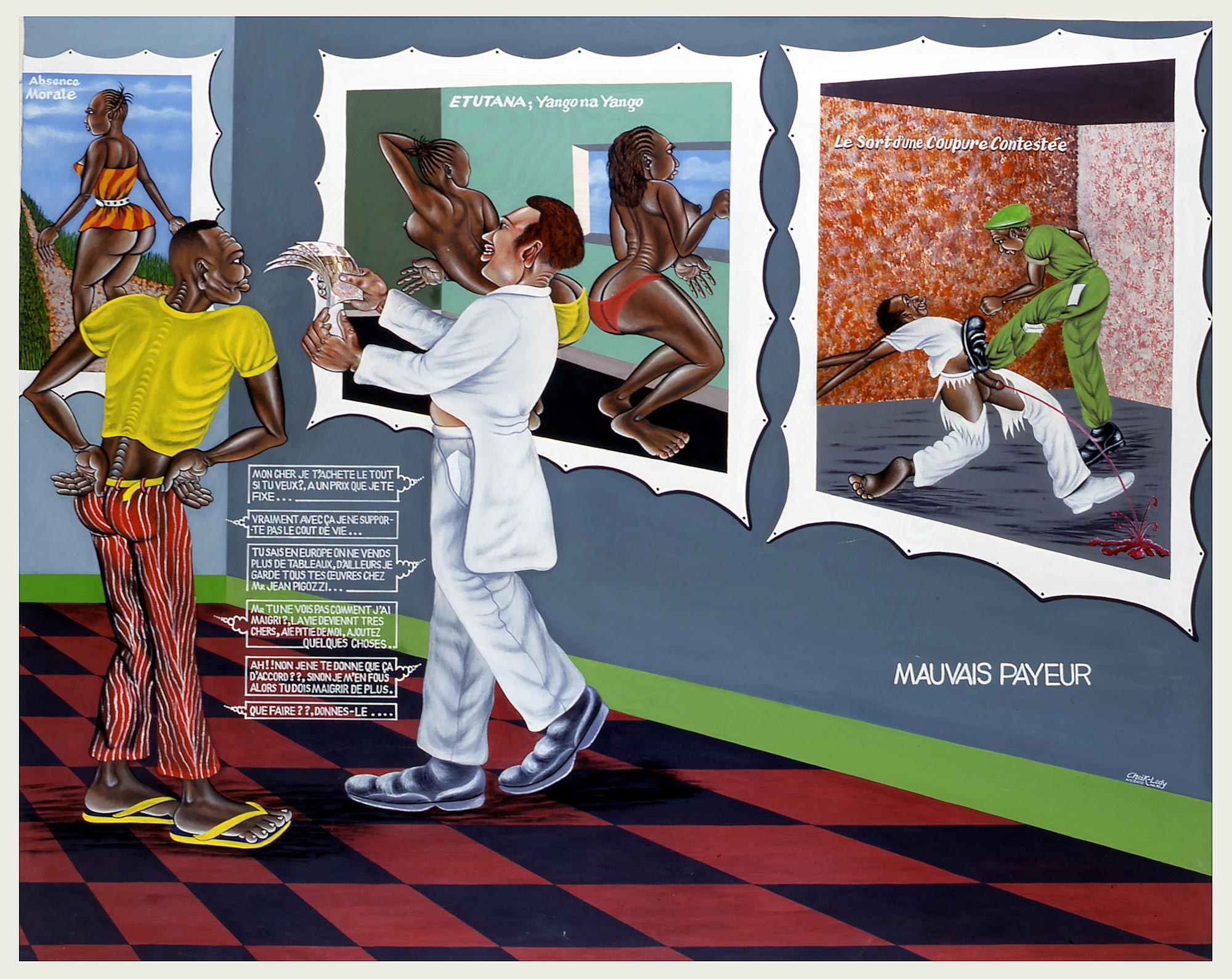 Cheik Ledy was trained in art by his elder brother Chéri Samba. Unlike the young popular artists of his generation, who were self-made and for many years lived a precarious existence, Cheik Ledy benefited greatly from the beginning of his career from his brothers experience and his access to fine art materials. Like Samba, Ledy builds his compositions with care, interspersing bilingual text (French and Lingala) and image with sophisticated ease.