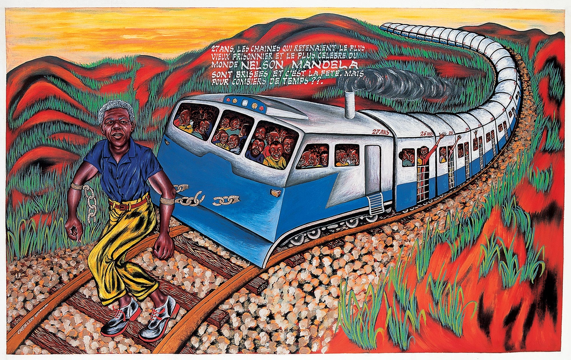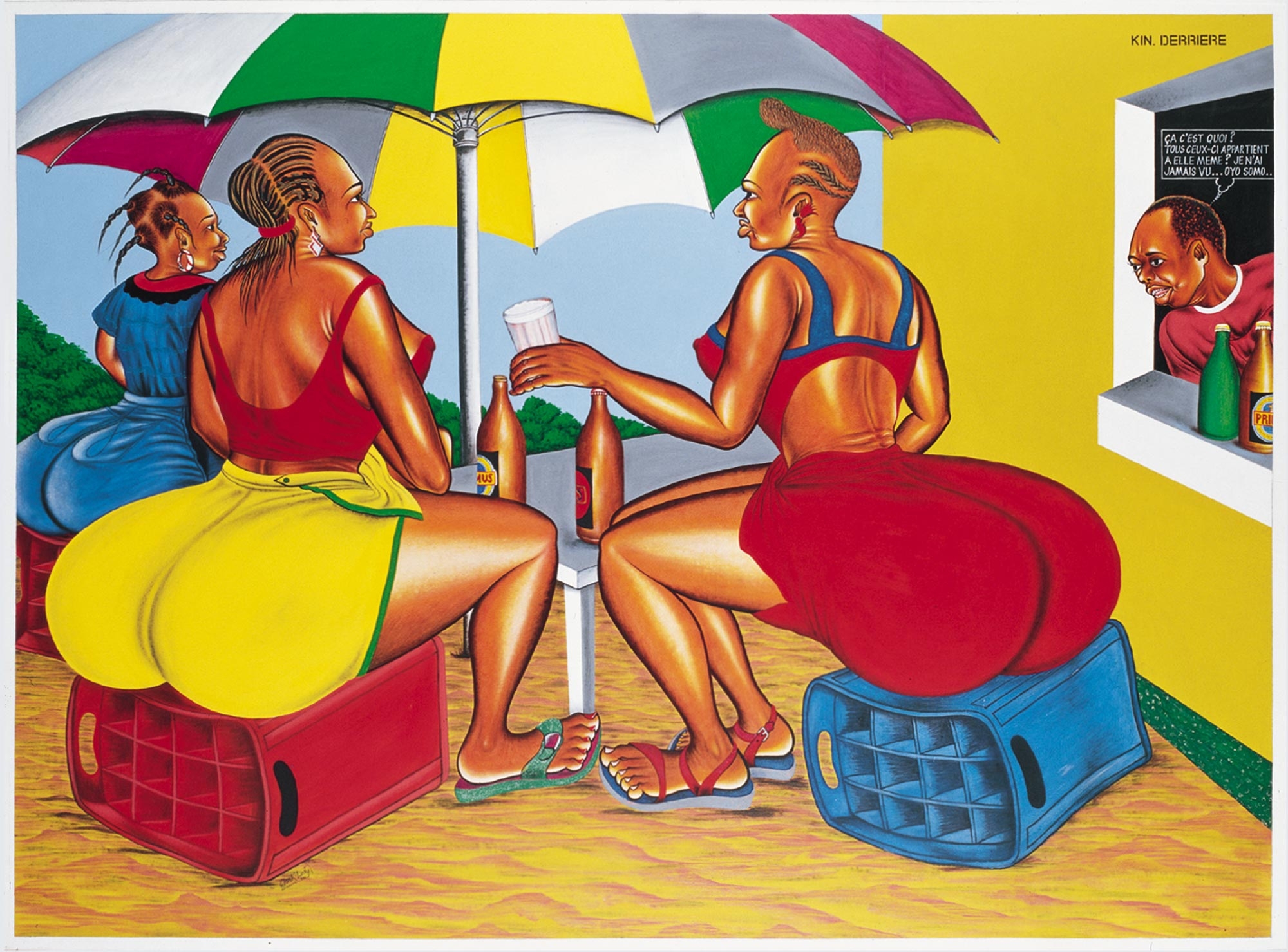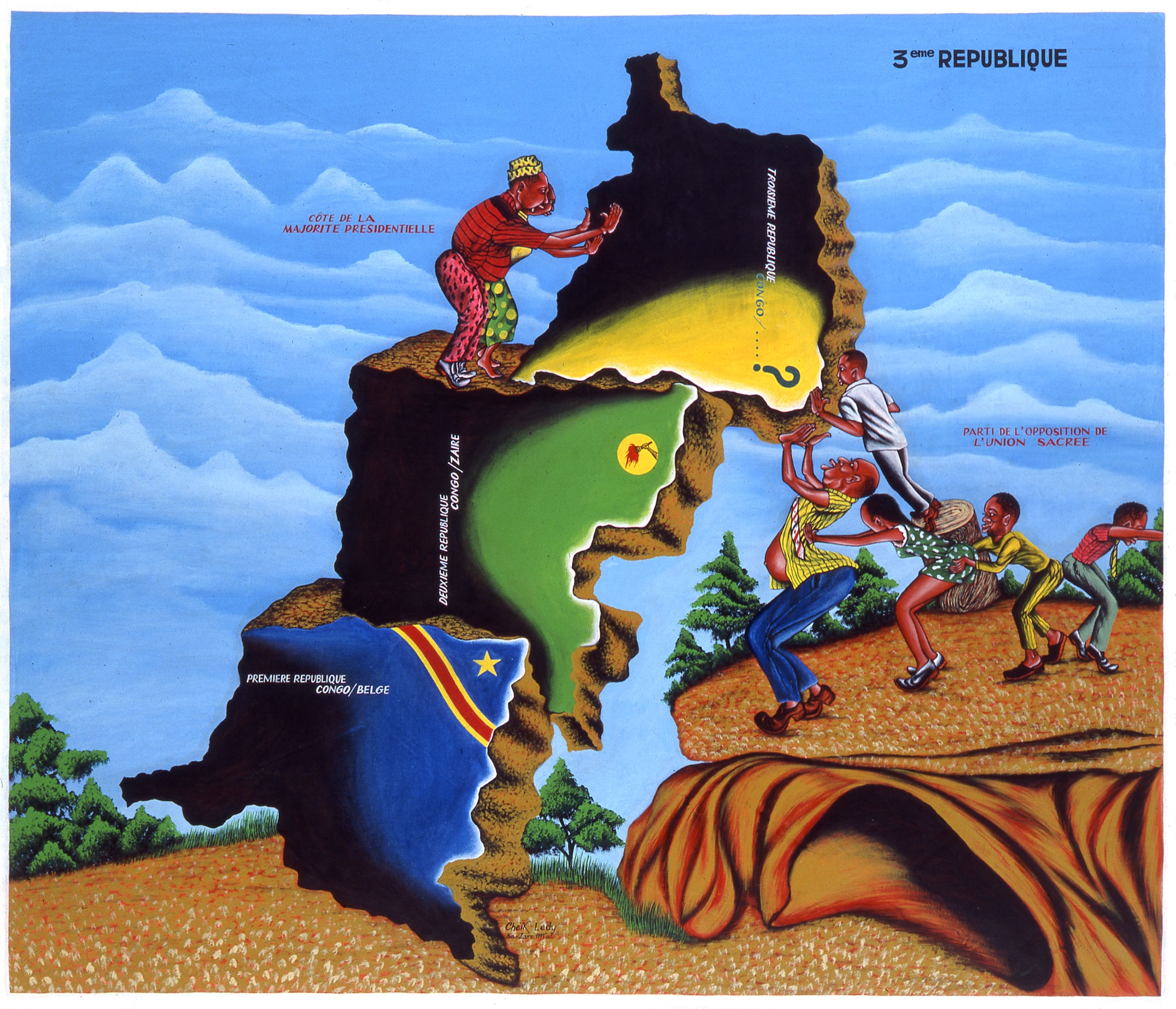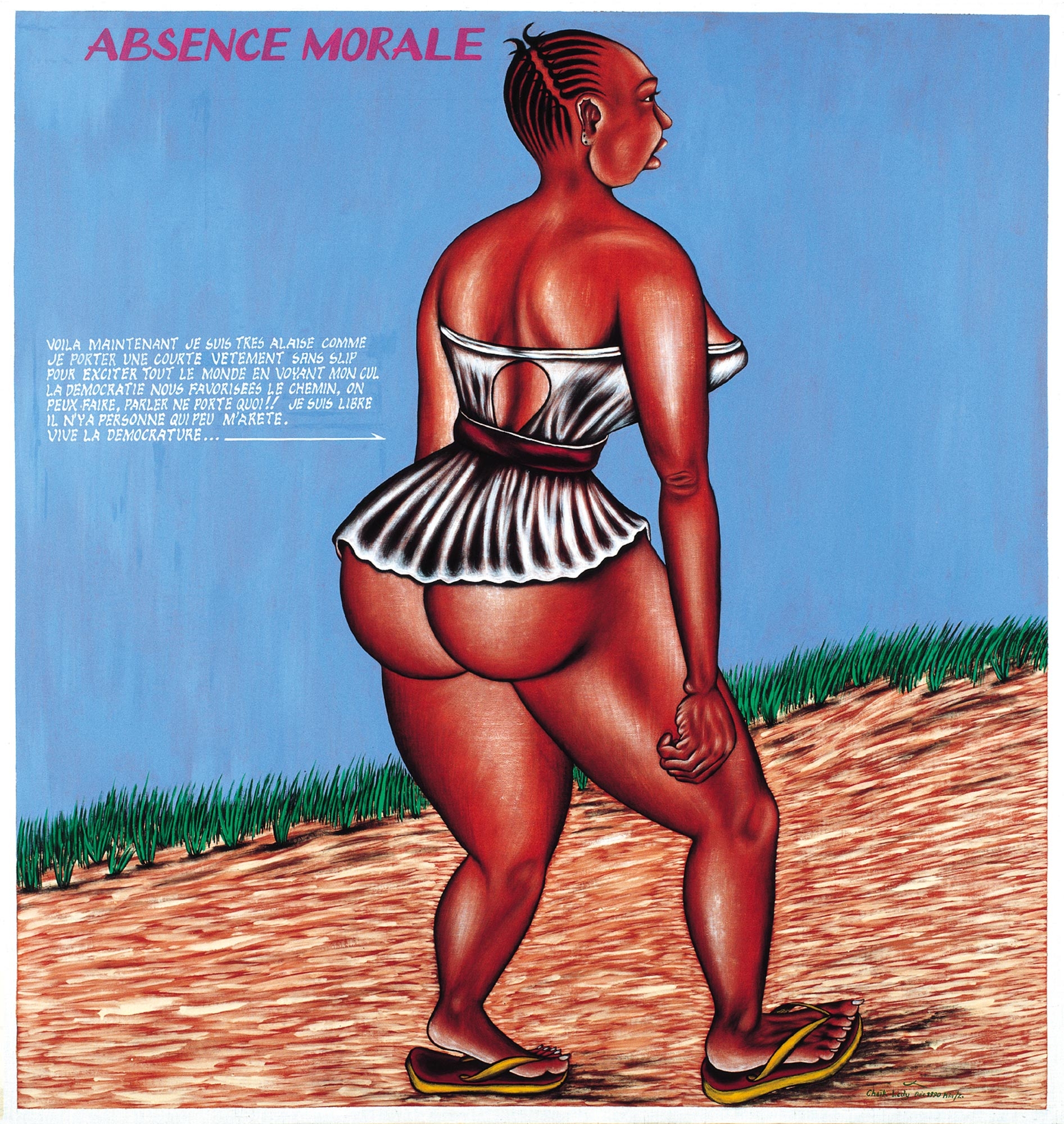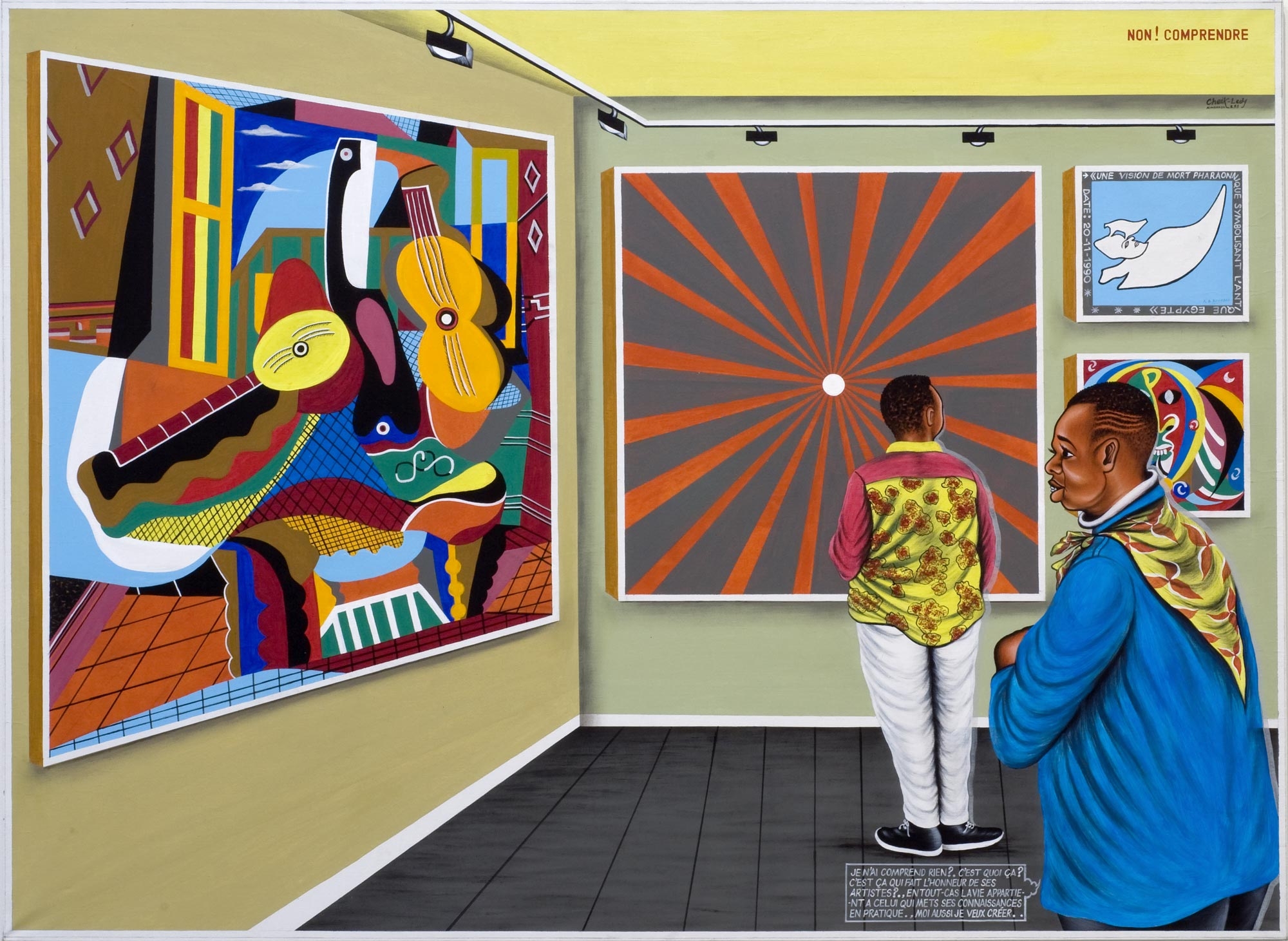 Cheik Ledy was trained in art by his elder brother Chéri Samba. Unlike the young popular artists of his generation, who were self-made and for many years lived a precarious existence, Cheik Ledy benefited greatly from the beginning of his career from his brothers experience and his access to fine art materials. Like Samba, Ledy builds his compositions with care, interspersing bilingual text (French and Lingala) and image with sophisticated ease.