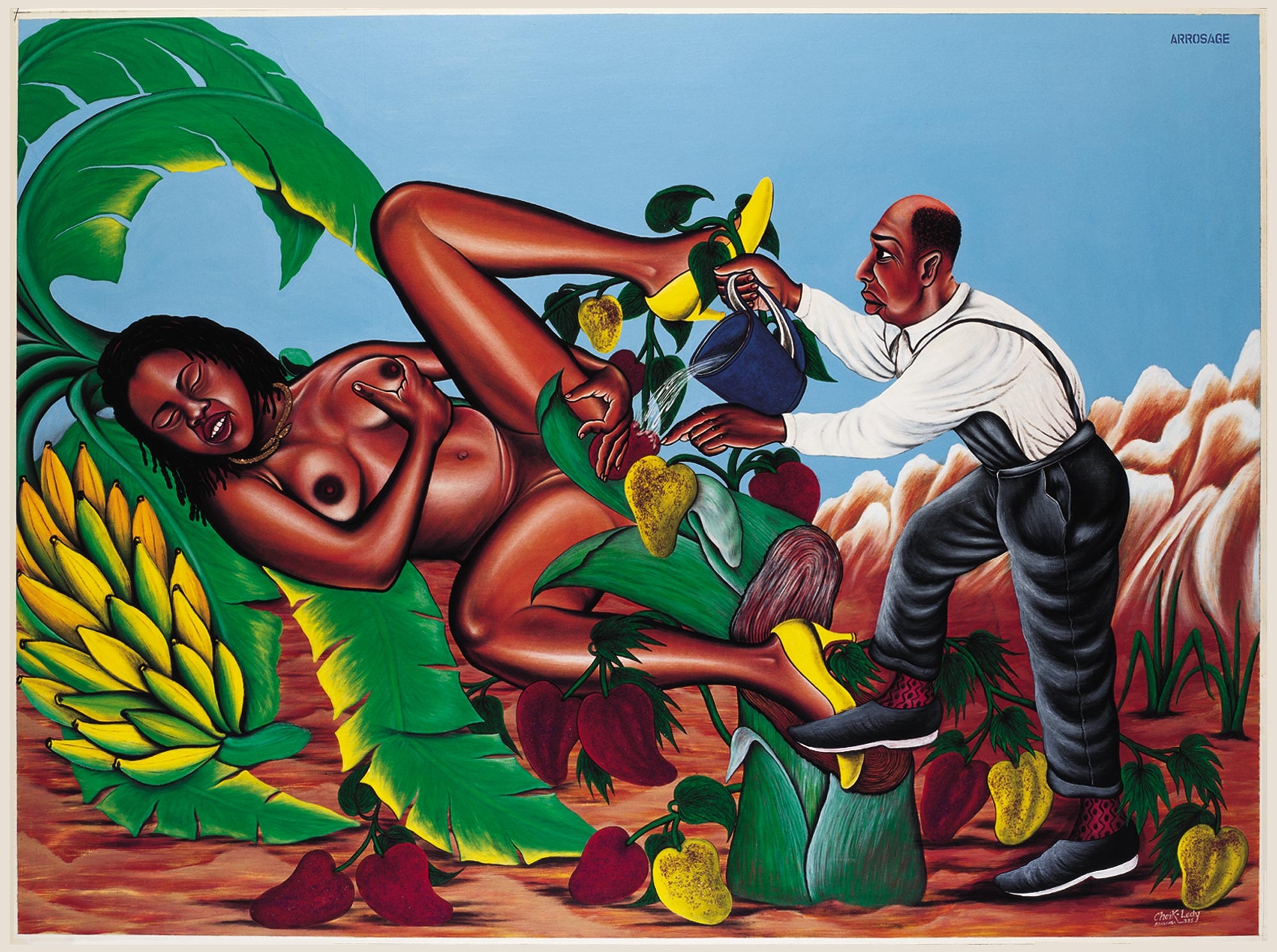 Ledys narratives are imbued with spontaneity, matched by the frankness with which he tackles his frequently controversial themes. He depicted everyday incidents, street-topics (sidewalk radio as the grapevine is called), urban myths, harsh realities. Committed to the art of communication, Ledy expressed the political history and social life of his community; he also documented with rare wit his own status as a painter. But his work is not merely an illustrated chronicle or a diary of his emotional life. He casts a critical eye on his surroundings, with a caustic humor that makes his characters almost seem like caricatures. He treated without complacency not only the biting questions of his day, but also those of world history, challenging his viewers to do the same.