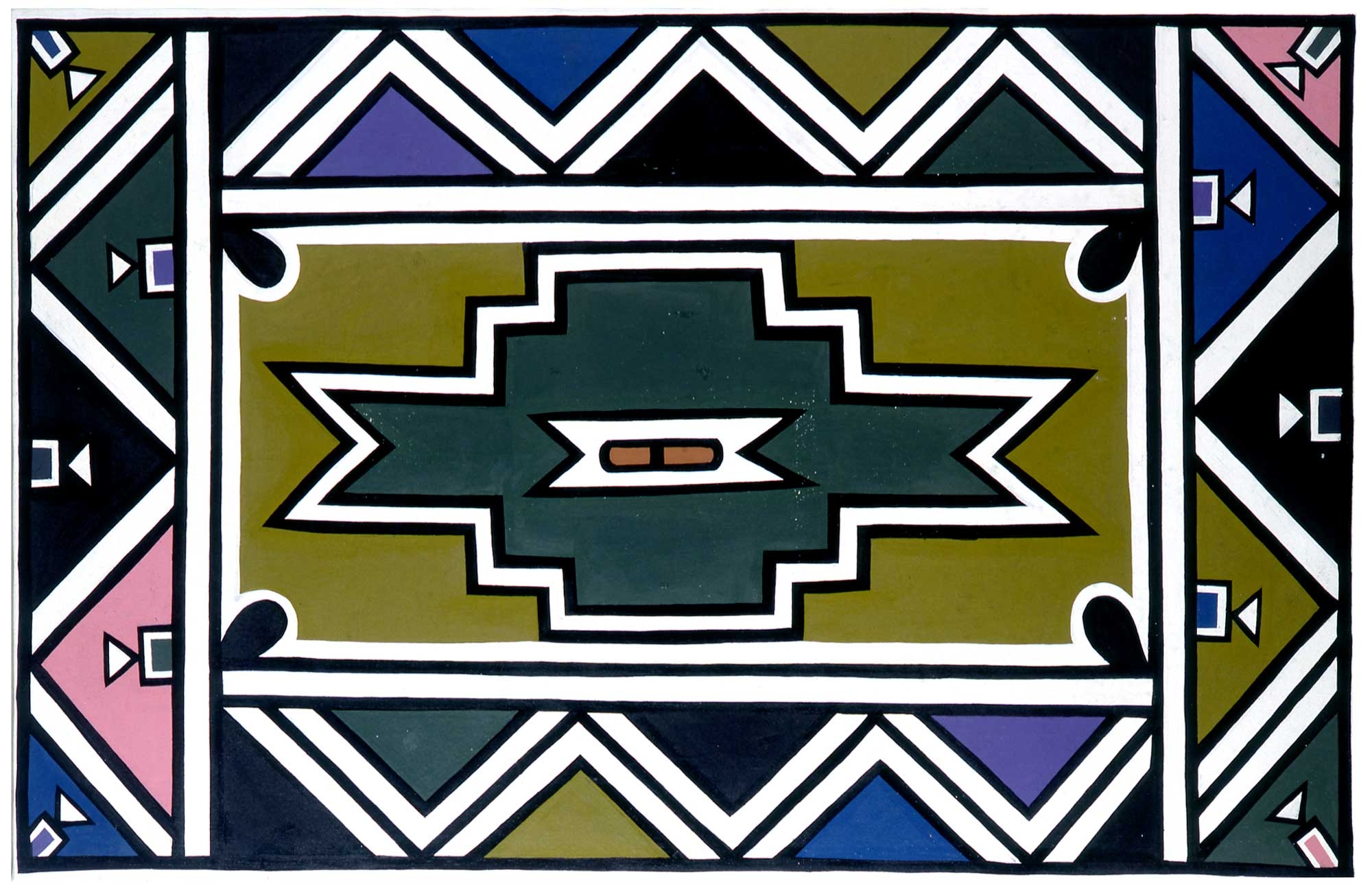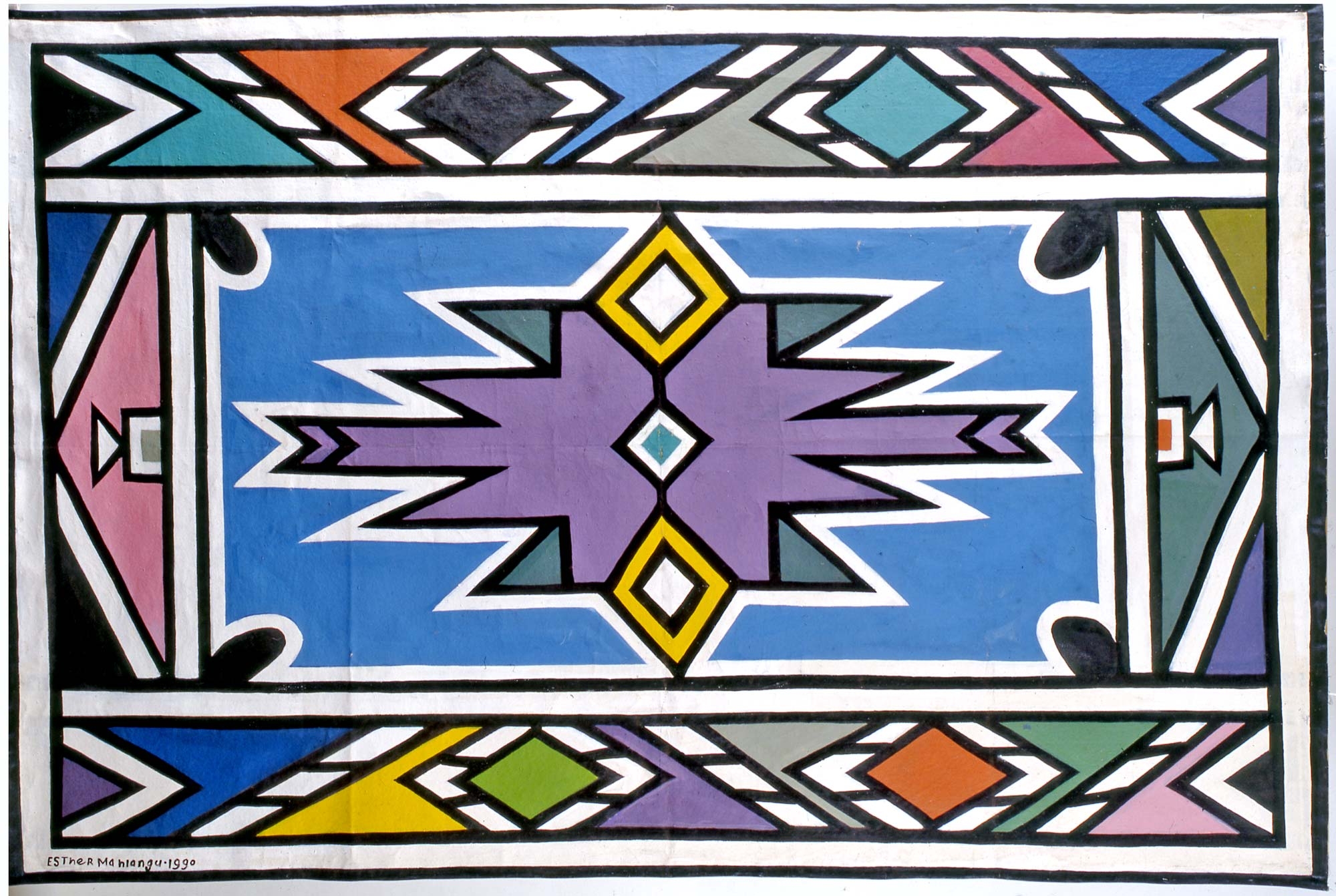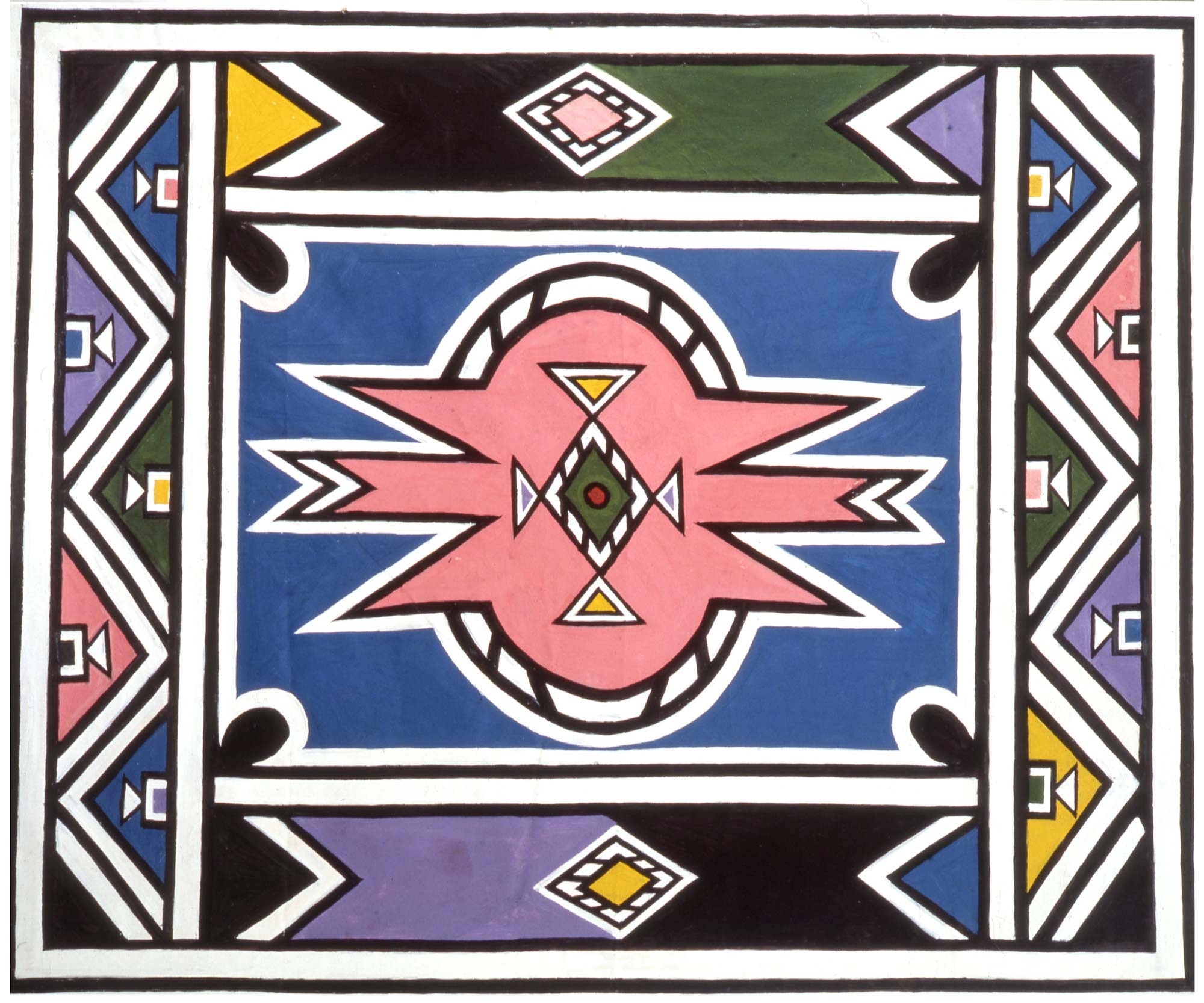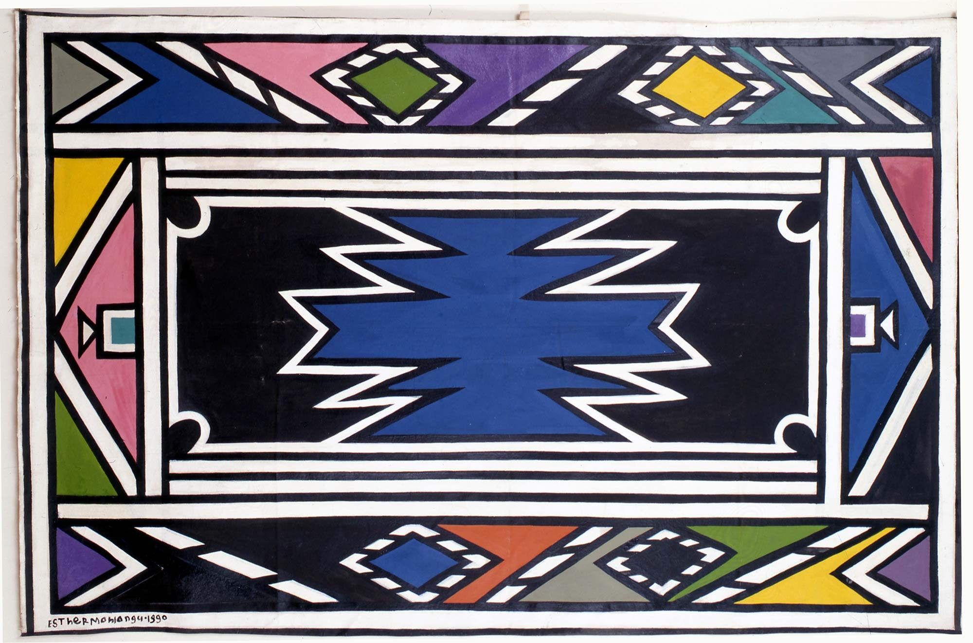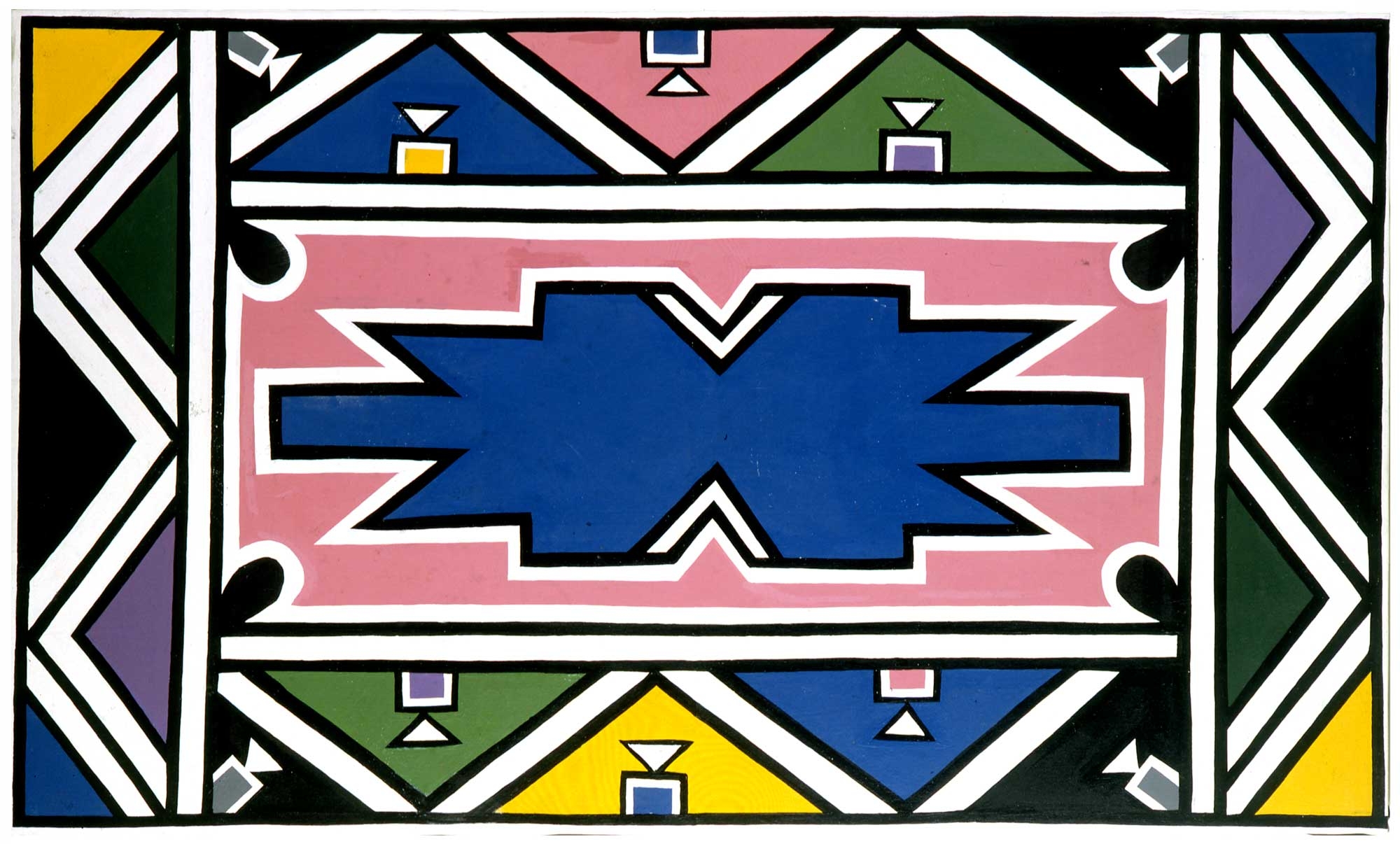 Esther Mahlangu is part of the Ndebele community in the Gauteng, located north of Pretoria. The Ndebele, unlike many other tribes in South Africa, have managed to preserve their centuries’ old ancestral traditions. Despite being a patriarchal society, artistic heritage is handed down from mother to daughter; as a young woman reaches puberty she withdraws from male society for three months and is taught the ceremonial patterns of Ndebele beadwork—in the nineteenth century this tradition was extended to decorative wall paintings, also executed exclusively by the Ndebele women.