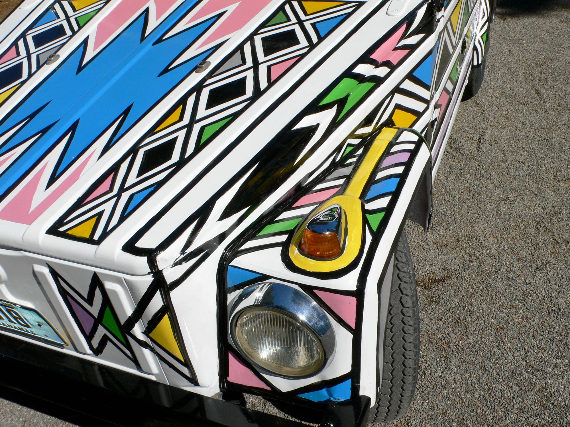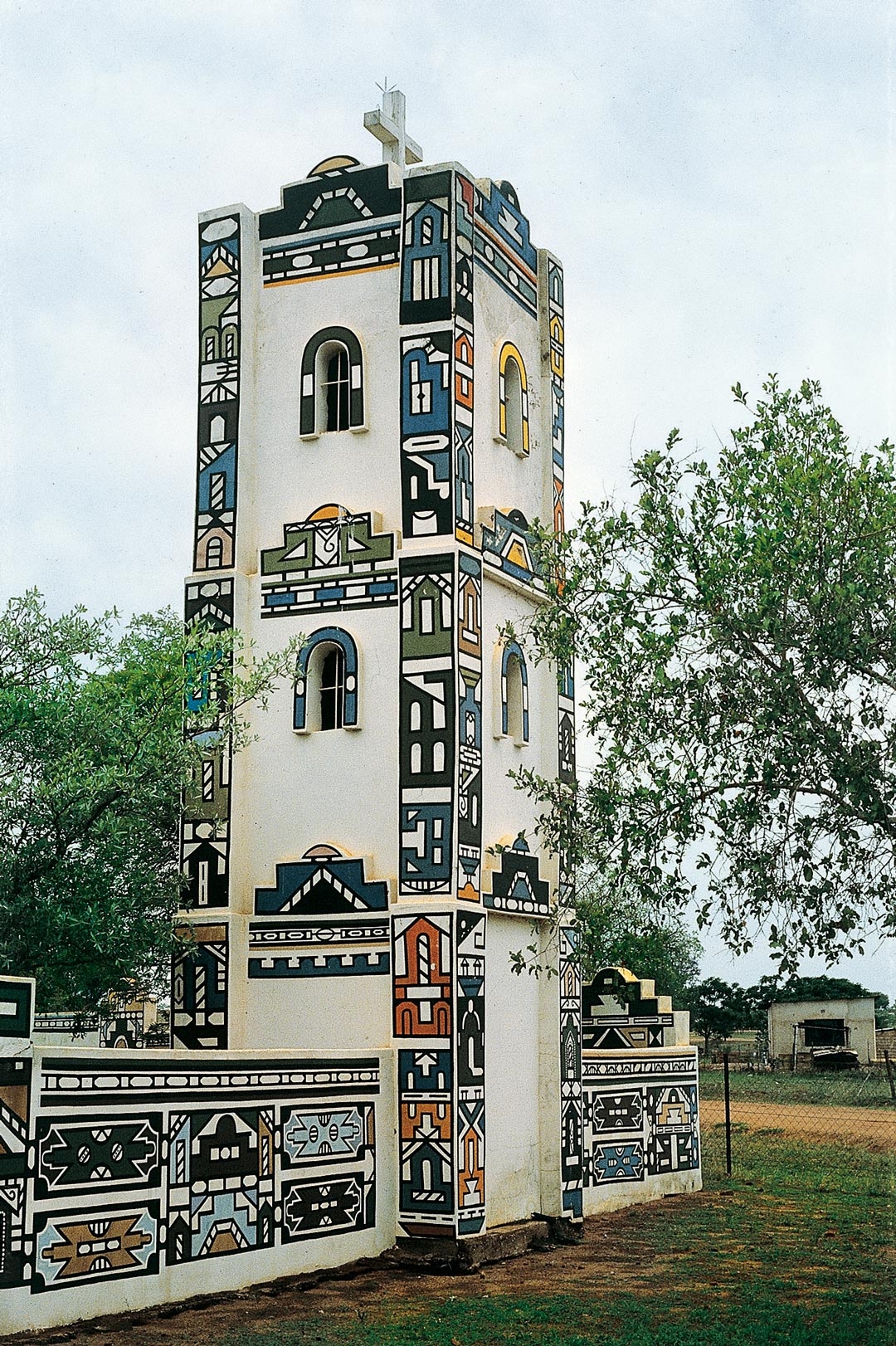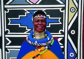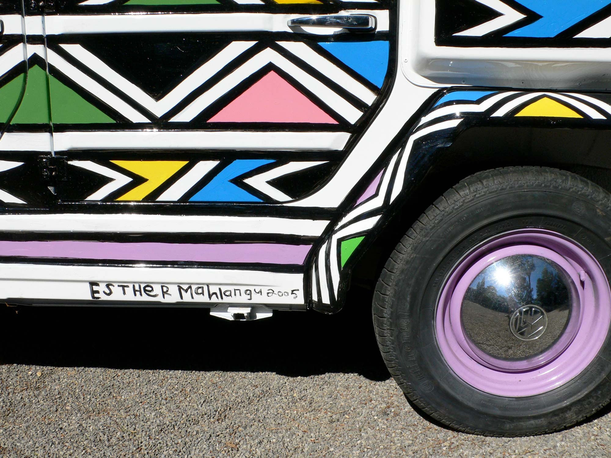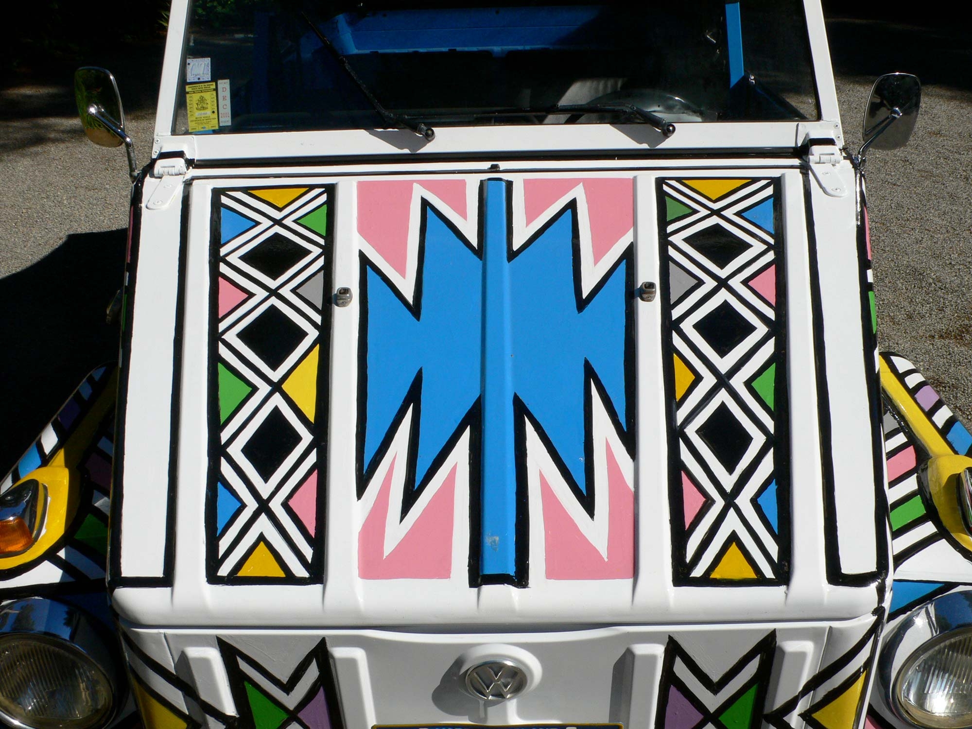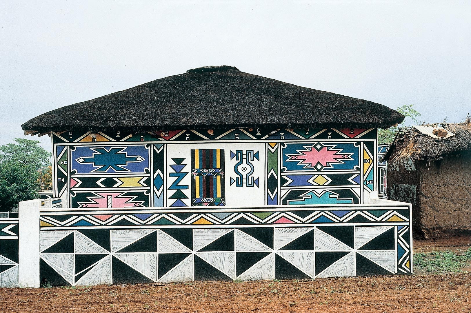 Esther Mahlangu is part of the Ndebele community in the Gauteng, located north of Pretoria. The Ndebele, unlike many other tribes in South Africa, have managed to preserve their centuries’ old ancestral traditions. Despite being a patriarchal society, artistic heritage is handed down from mother to daughter; as a young woman reaches puberty she withdraws from male society for three months and is taught the ceremonial patterns of Ndebele beadwork—in the nineteenth century this tradition was extended to decorative wall paintings, also executed exclusively by the Ndebele women.