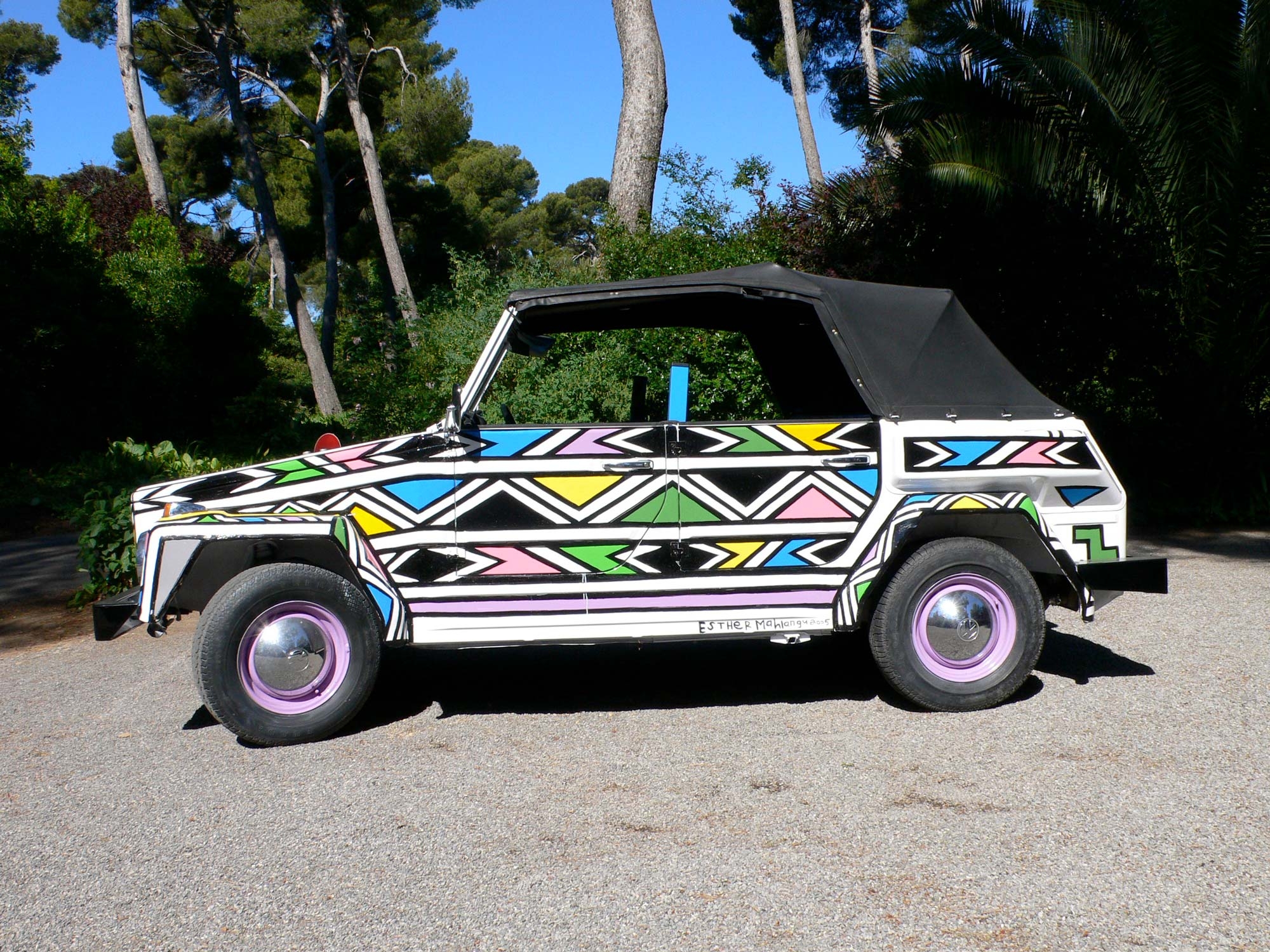 Esther Mahlangu is an important proponent of this tradition. She draws freehand, without first measuring or sketching, using luminous and high-contrast vinyl paints that lend extraordinary vigor to her murals. While at a glance purely abstract, her compositions are built upon a highly inventive system of signs and symbols. Mahlangu is the first Ndebele artist to transpose wall paintings onto canvases and to take the conventions of her artwork into the larger arena. In 1989 she came to Paris to create murals Magiciens de la Terre exhibition, and by agreeing to undertake further commissioned works for public buildings like the Civic Theater of Johannesburg, for museums, for BMW, for Comme des Garçons, Mahlangu has made Ndebele art celebrated world over. She has stated: “My mother and grandmother taught me to paint when I was ten years old. I have been busy with it ever since and have always liked it. When I am painting my heart is very wide, it reaches out. It makes me feel very, very happy.”