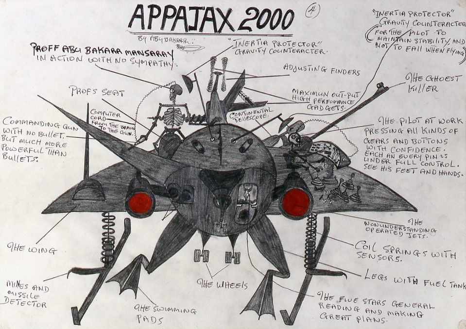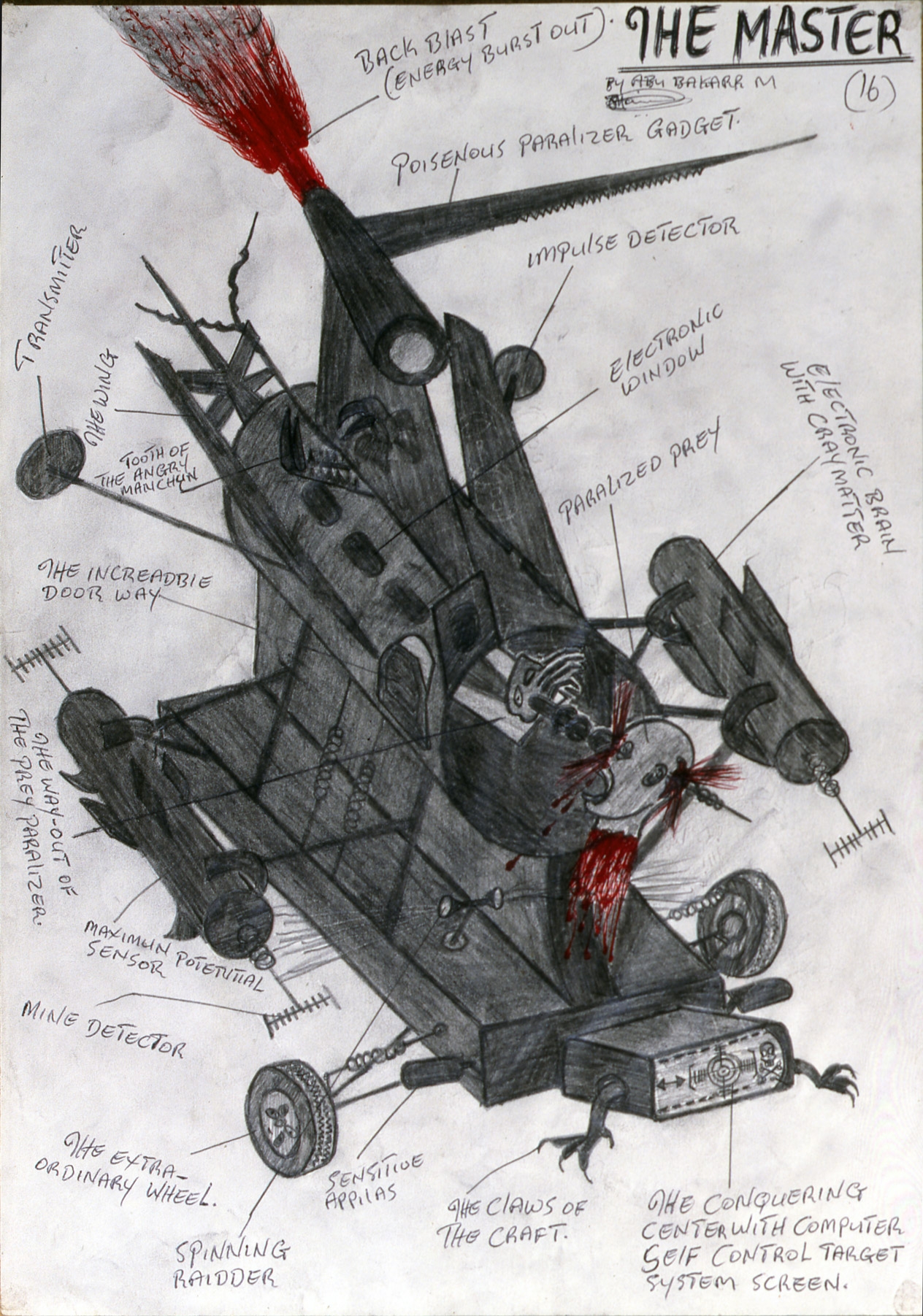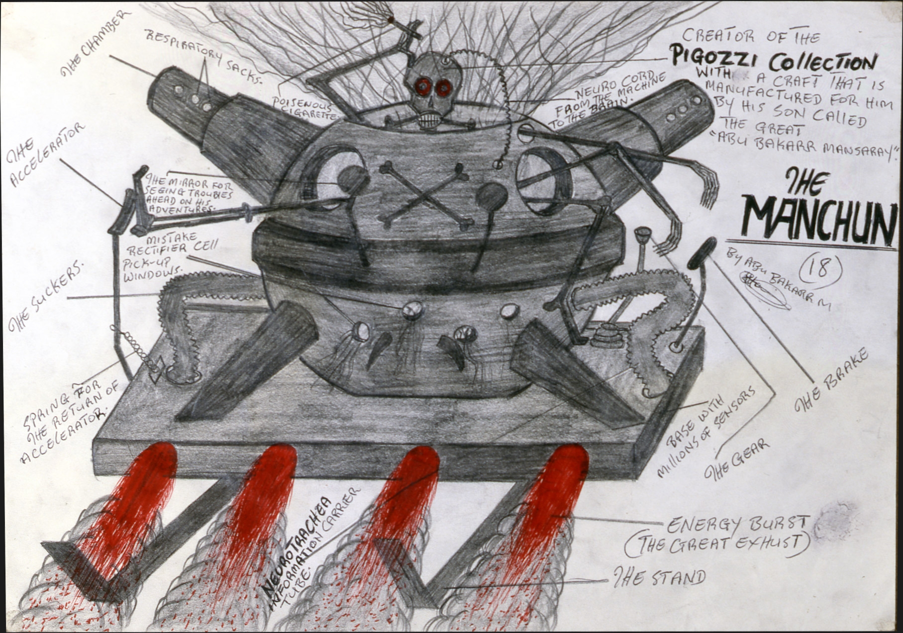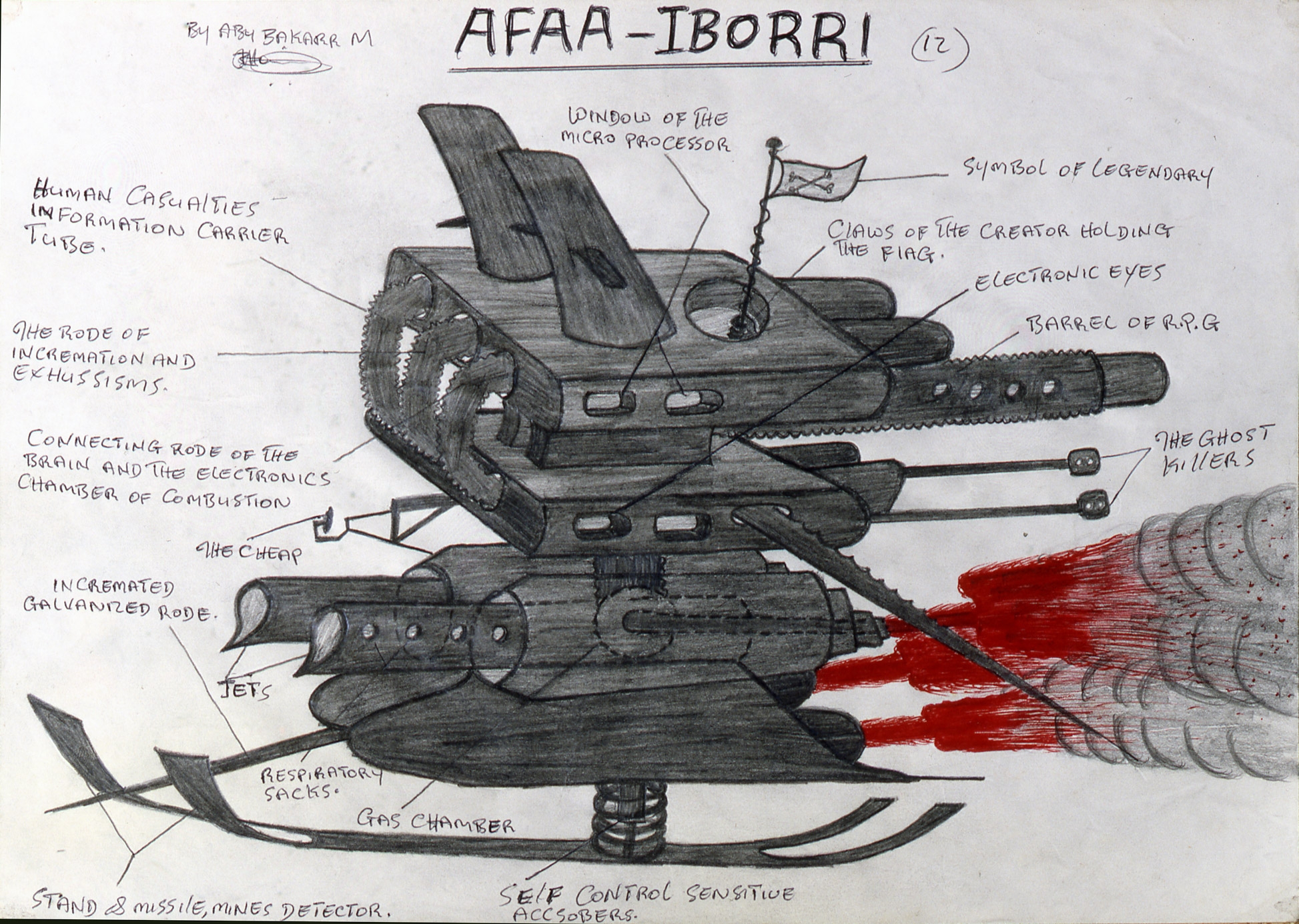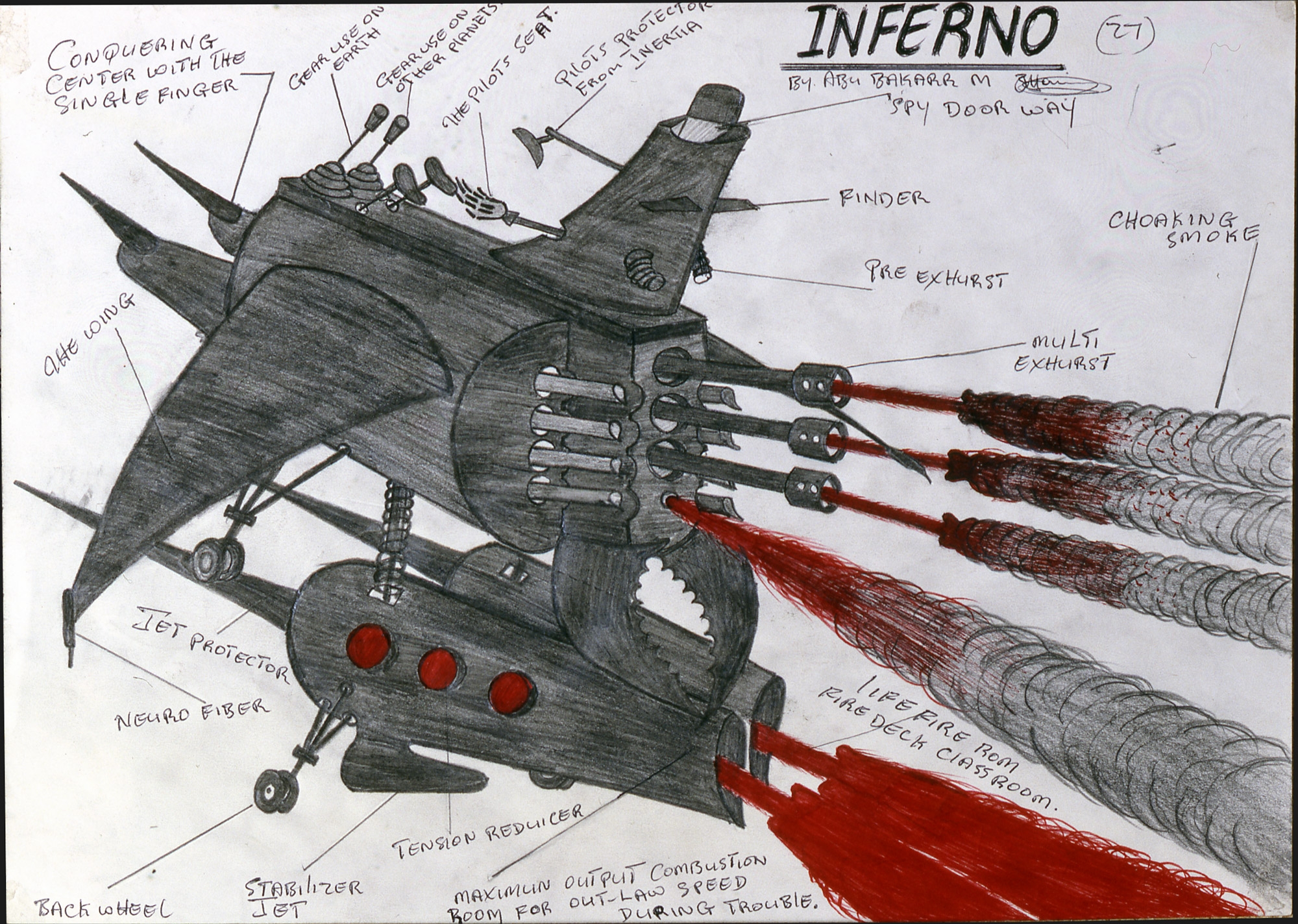 Mansaray’s preparatory drawings also stand as independent artworks. These studies consist of detailed calculations, sketches, diagrams, and commentaries executed in pencil, ballpoint pen, and crayons. “I like doing strange, complicated drawings and designing intricate machines inspired by scientific ideas that are at times beyond the human imagination (for example, the machines I designed called Hell Extinguisher and Nuclear Telephone Discovered in Hell). . . . I want people to feel the power of creation.” No doubt the economic, political and social situation in Sierra Leone, a country where war has left behind nothing but ruins and charred bodies, has shaped Mansaray’s imagination and the inspiration. In 1998 he managed to escape his country under extremely difficult circumstances, and spent several years in the Netherlands; however, his work continues to bear witness to the horrors of war.