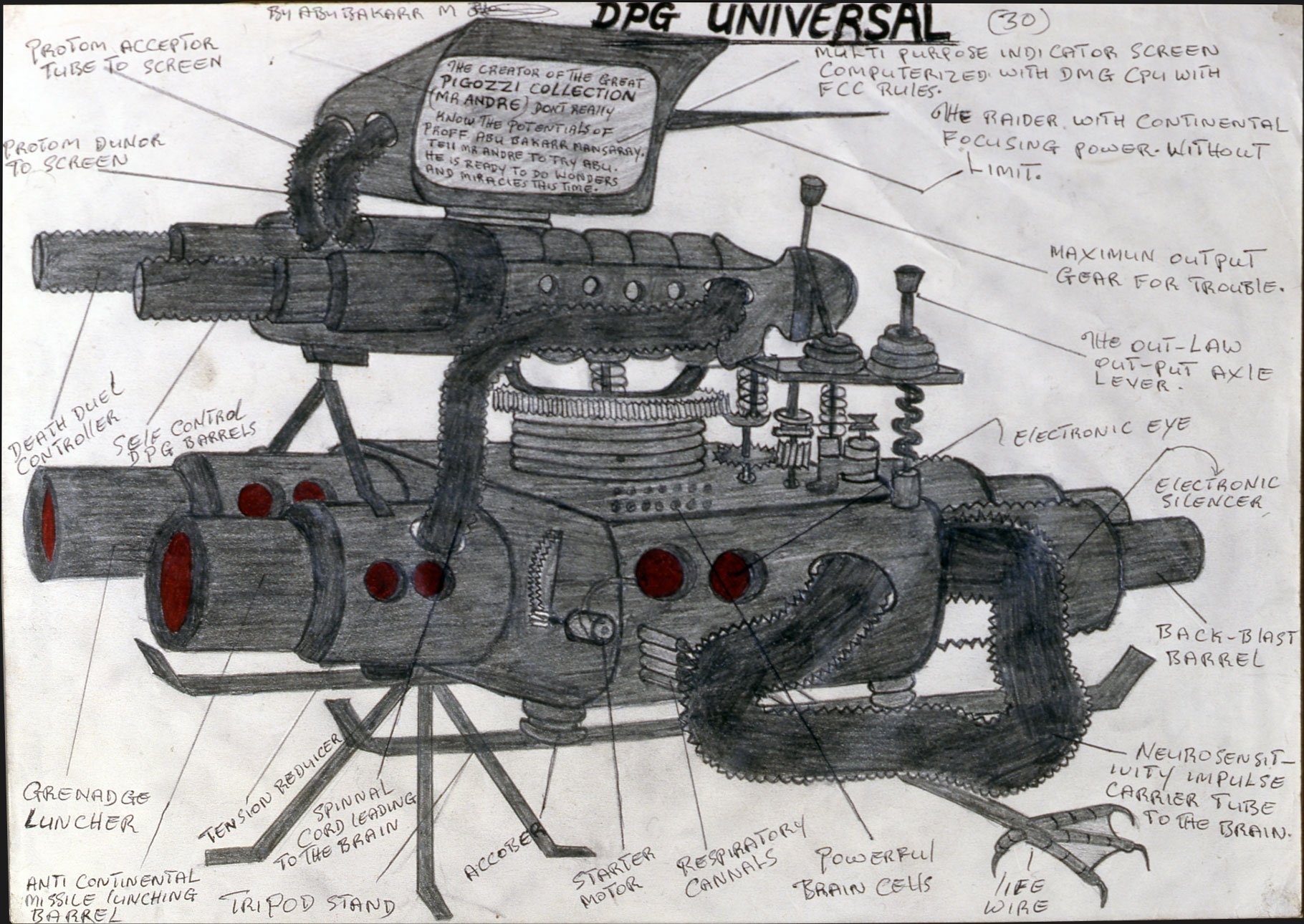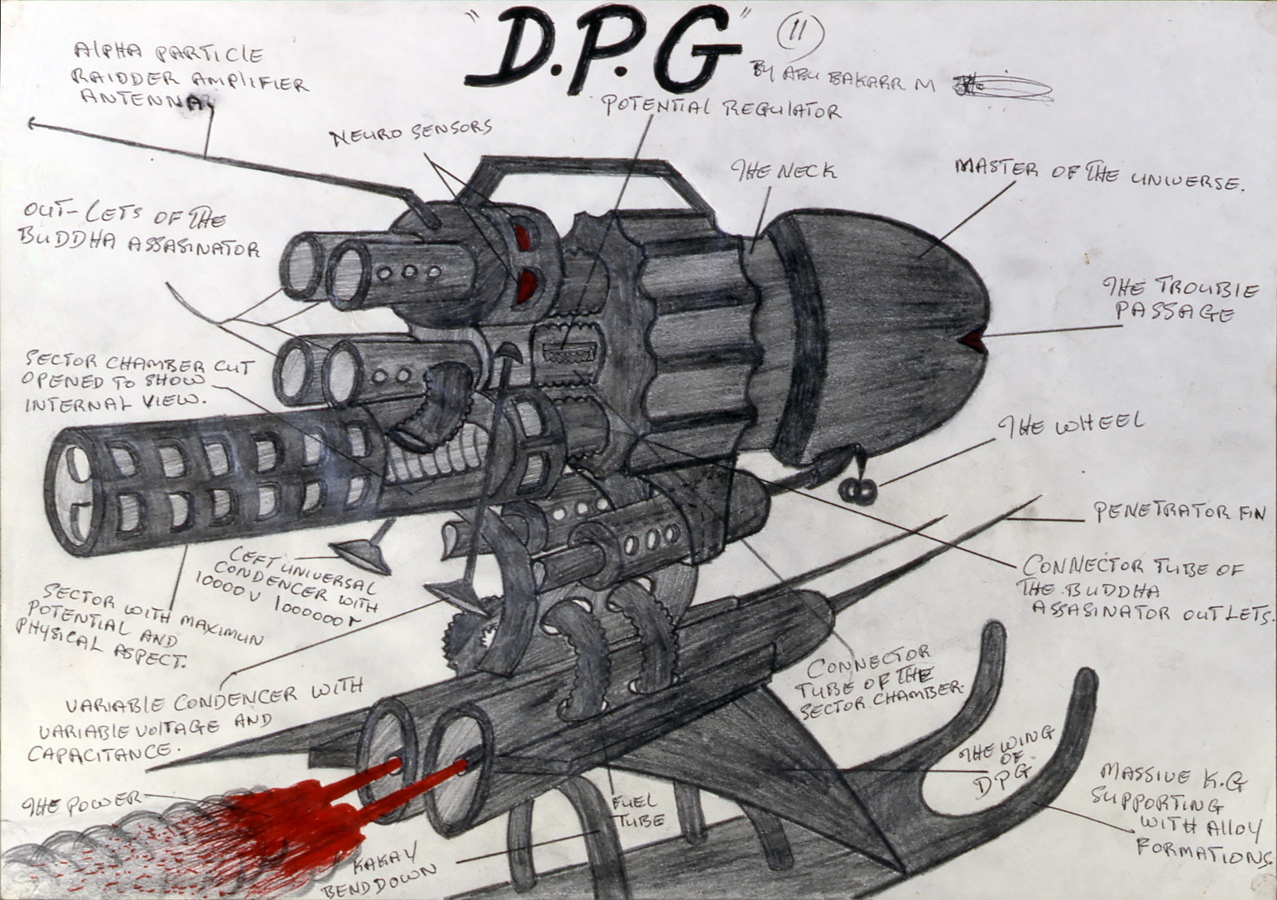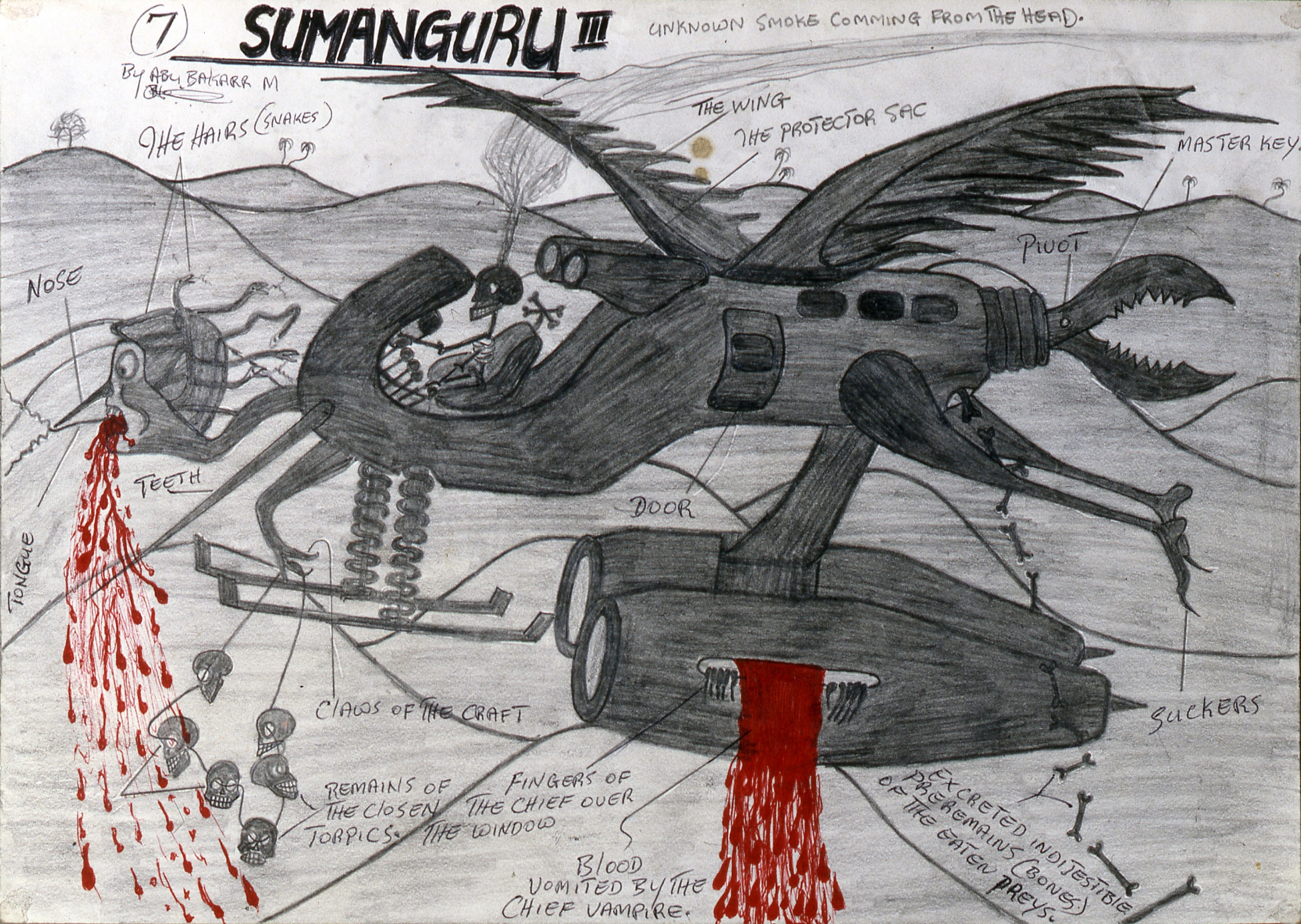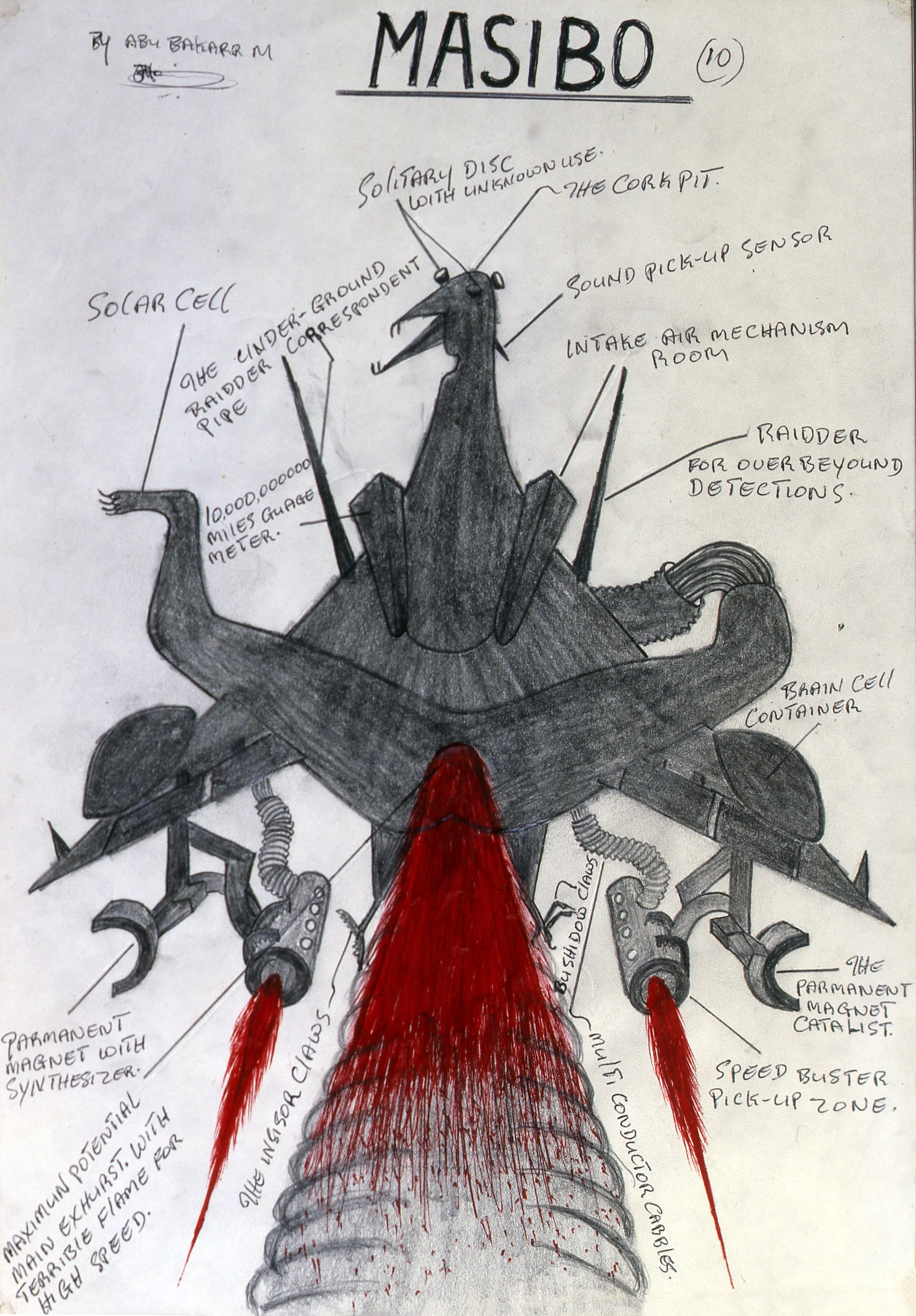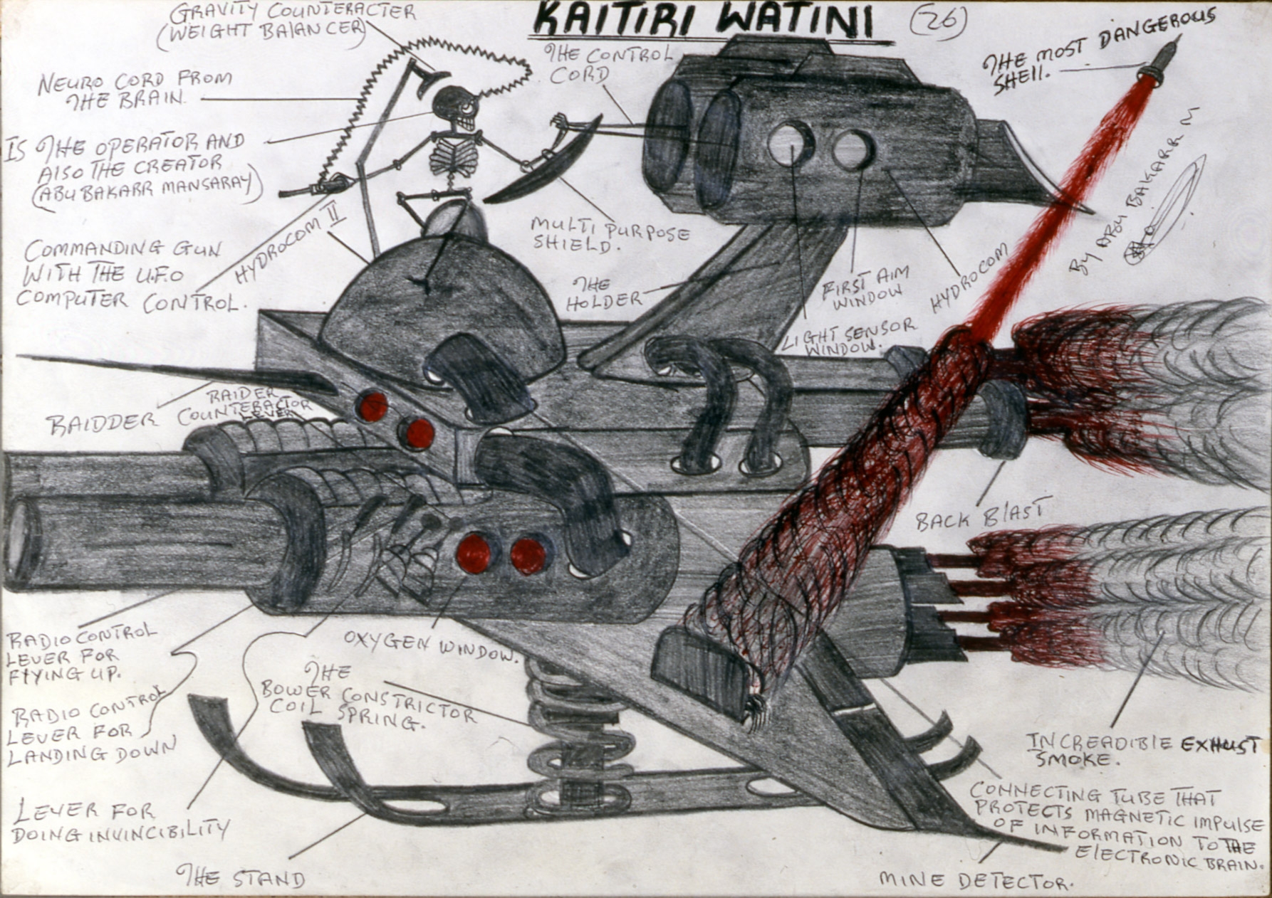 Mansaray’s preparatory drawings also stand as independent artworks. These studies consist of detailed calculations, sketches, diagrams, and commentaries executed in pencil, ballpoint pen, and crayons. “I like doing strange, complicated drawings and designing intricate machines inspired by scientific ideas that are at times beyond the human imagination (for example, the machines I designed called Hell Extinguisher and Nuclear Telephone Discovered in Hell). . . . I want people to feel the power of creation.” No doubt the economic, political and social situation in Sierra Leone, a country where war has left behind nothing but ruins and charred bodies, has shaped Mansaray’s imagination and the inspiration. In 1998 he managed to escape his country under extremely difficult circumstances, and spent several years in the Netherlands; however, his work continues to bear witness to the horrors of war.