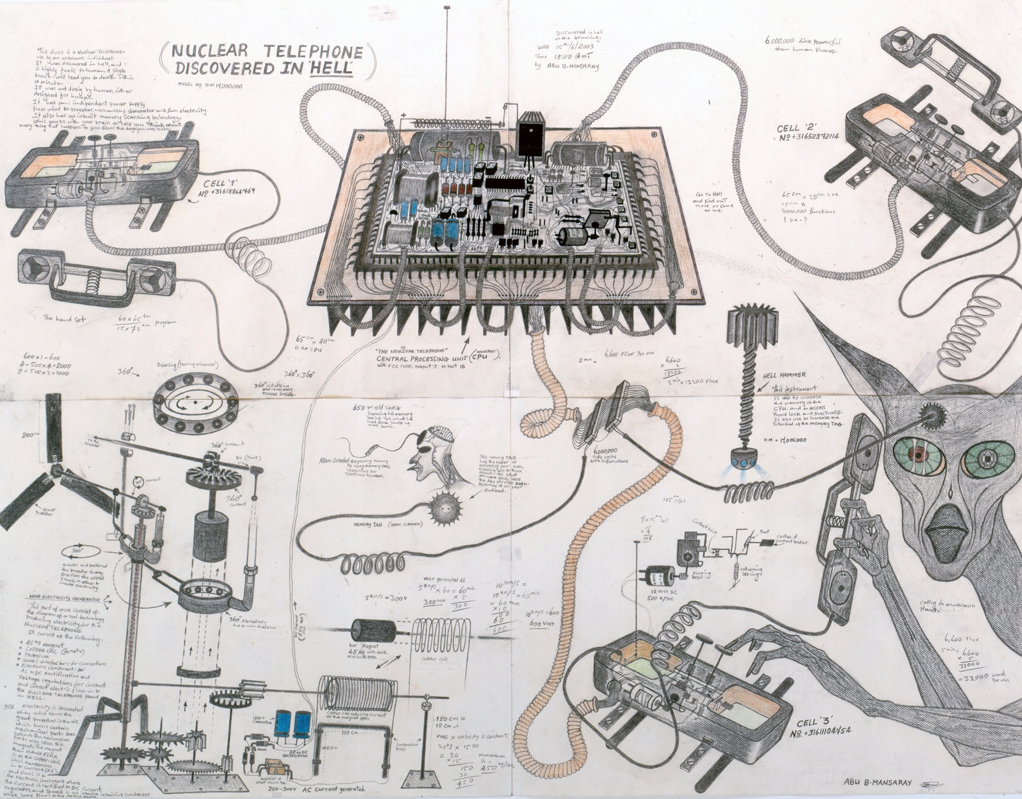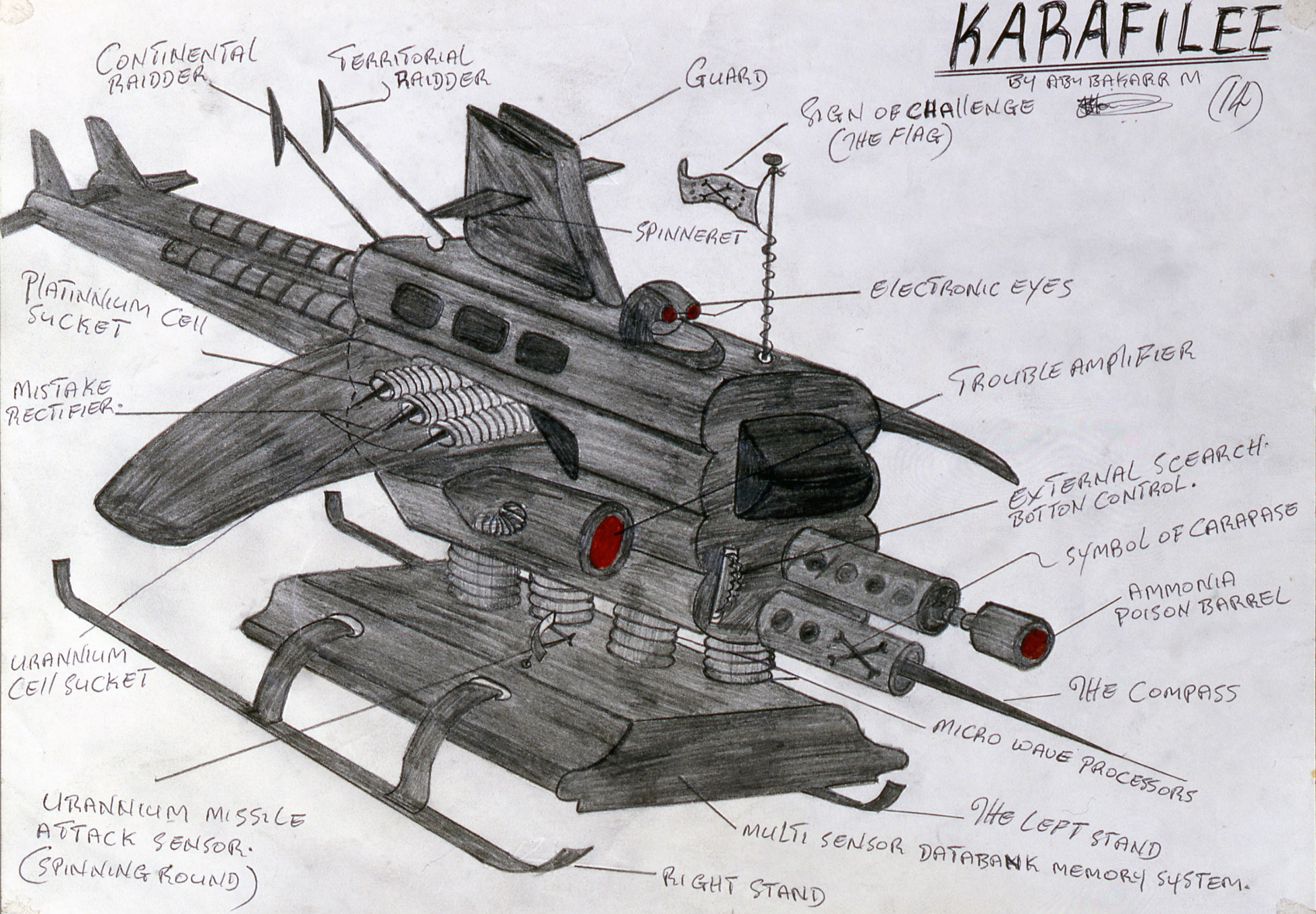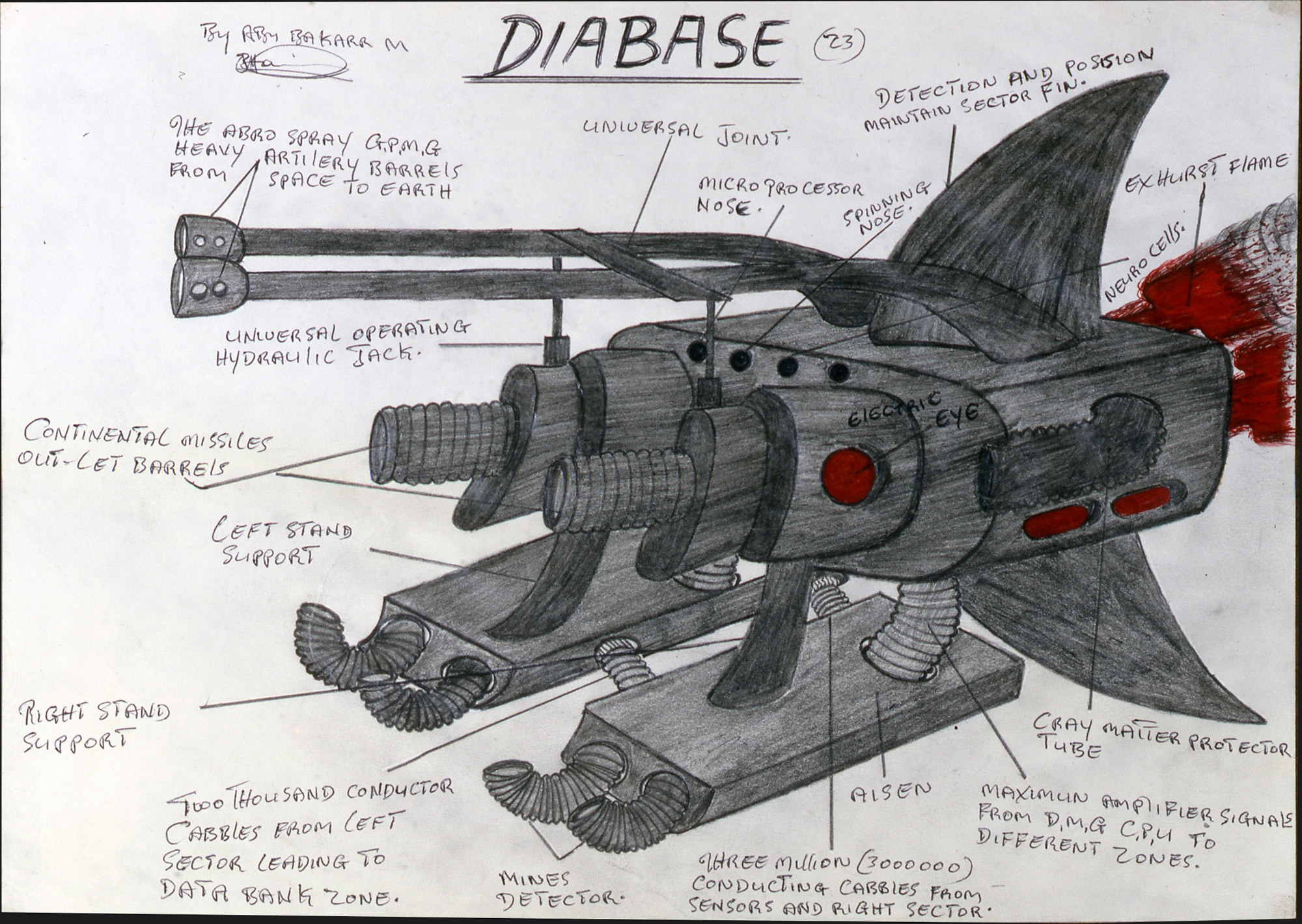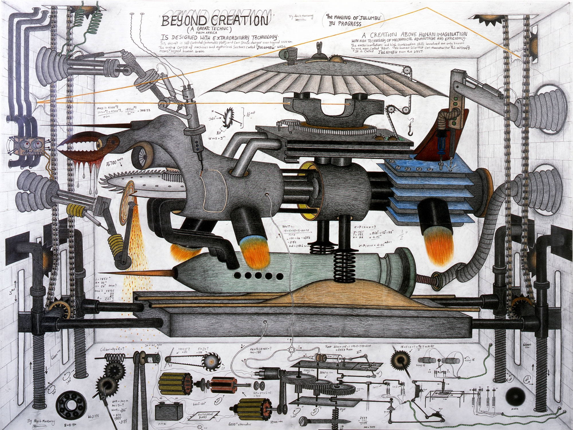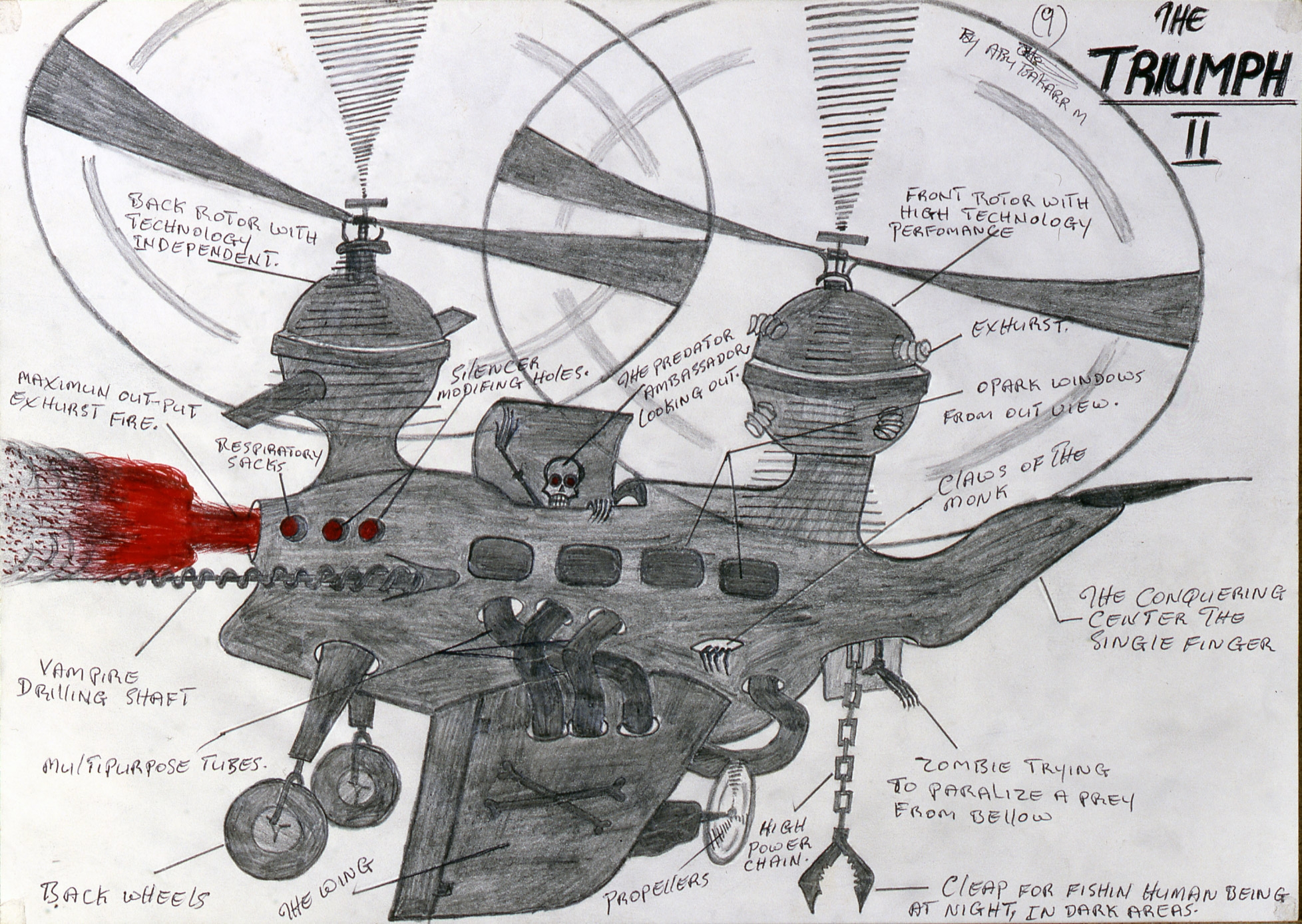 Mansaray’s preparatory drawings also stand as independent artworks. These studies consist of detailed calculations, sketches, diagrams, and commentaries executed in pencil, ballpoint pen, and crayons. “I like doing strange, complicated drawings and designing intricate machines inspired by scientific ideas that are at times beyond the human imagination (for example, the machines I designed called Hell Extinguisher and Nuclear Telephone Discovered in Hell). . . . I want people to feel the power of creation.” No doubt the economic, political and social situation in Sierra Leone, a country where war has left behind nothing but ruins and charred bodies, has shaped Mansaray’s imagination and the inspiration. In 1998 he managed to escape his country under extremely difficult circumstances, and spent several years in the Netherlands; however, his work continues to bear witness to the horrors of war.