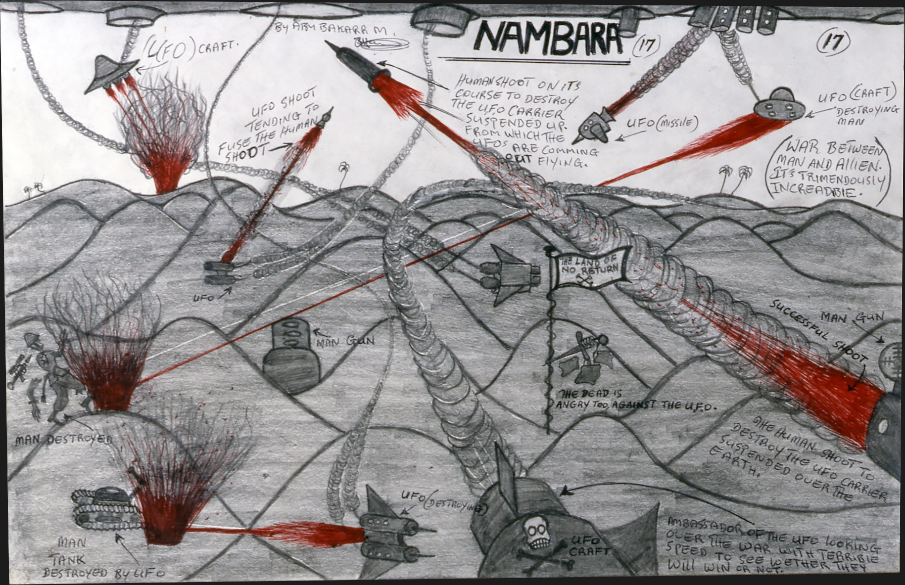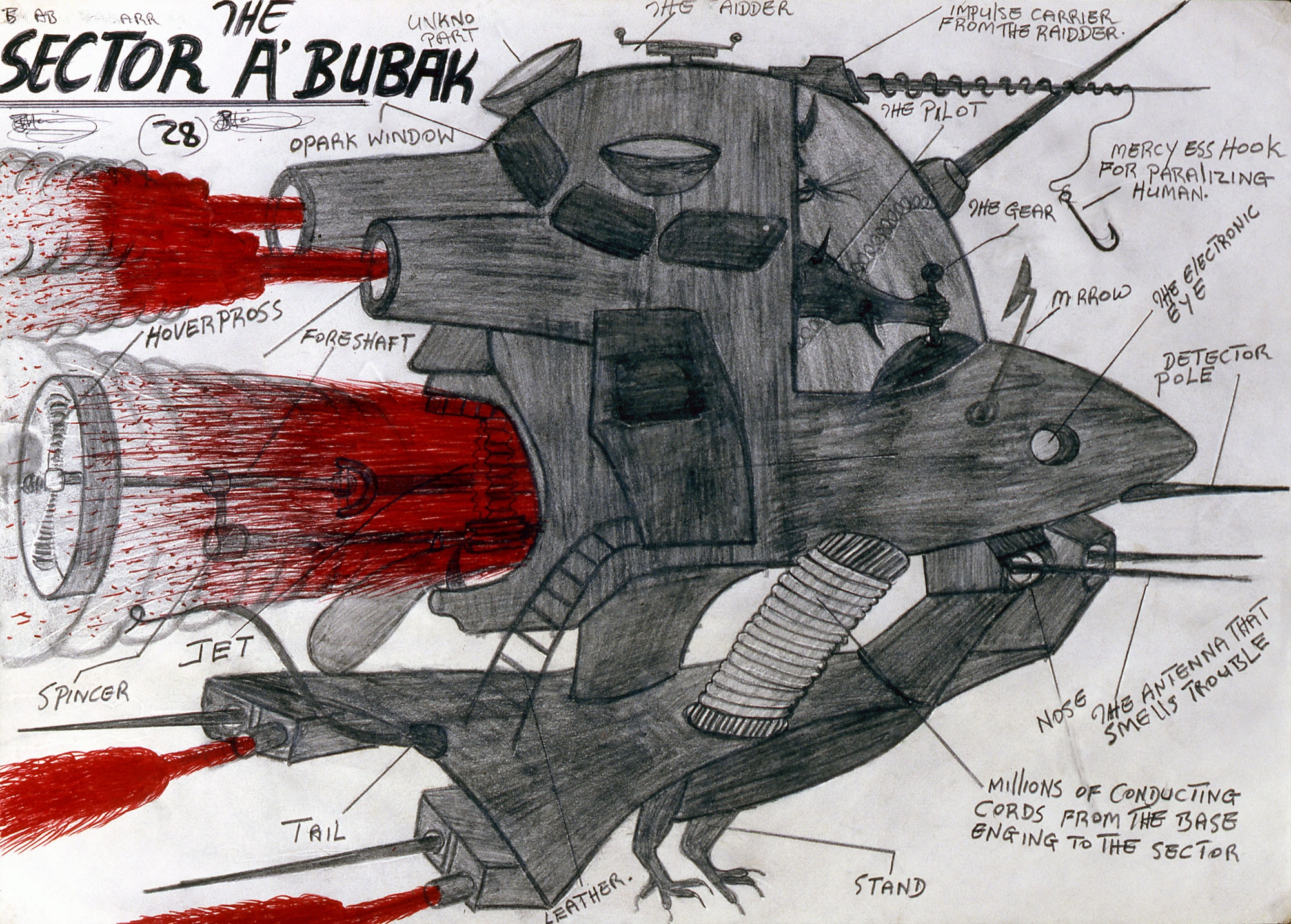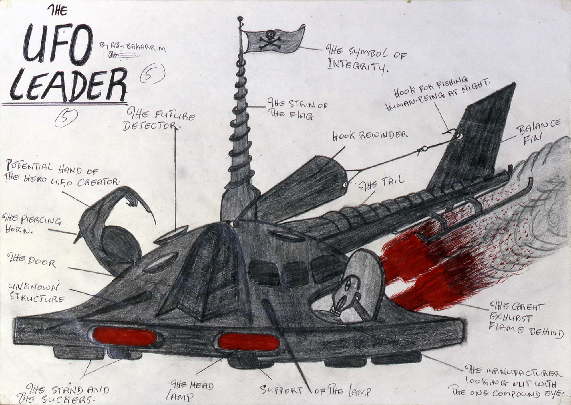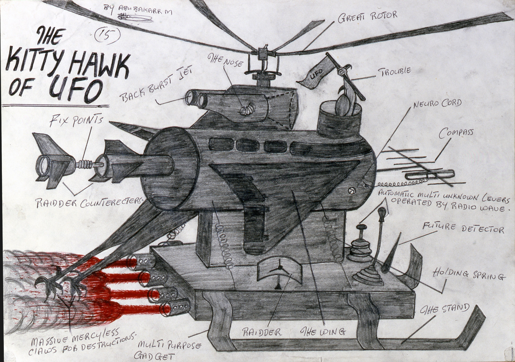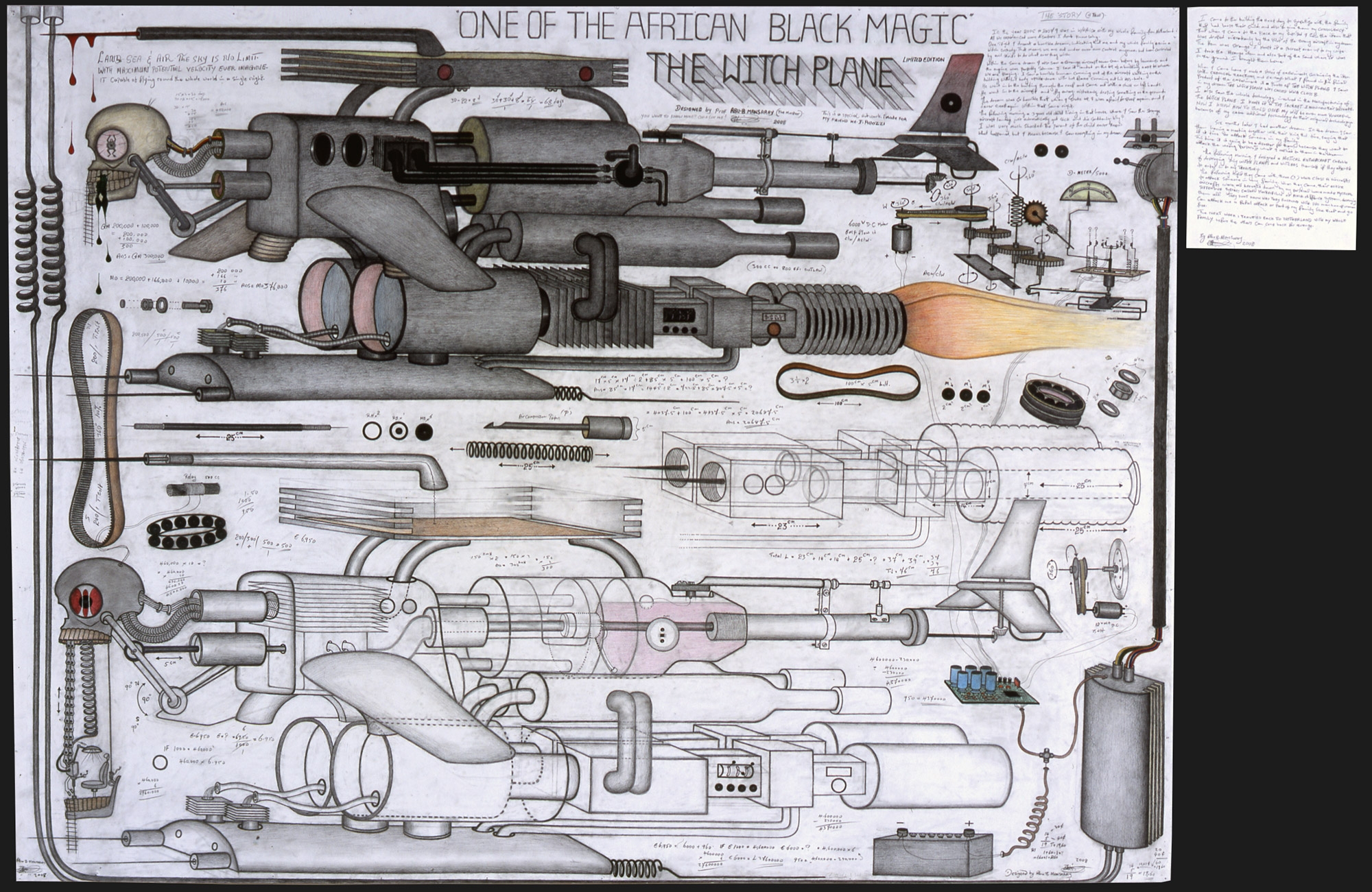 Mansaray’s preparatory drawings also stand as independent artworks. These studies consist of detailed calculations, sketches, diagrams, and commentaries executed in pencil, ballpoint pen, and crayons. “I like doing strange, complicated drawings and designing intricate machines inspired by scientific ideas that are at times beyond the human imagination (for example, the machines I designed called Hell Extinguisher and Nuclear Telephone Discovered in Hell). . . . I want people to feel the power of creation.” No doubt the economic, political and social situation in Sierra Leone, a country where war has left behind nothing but ruins and charred bodies, has shaped Mansaray’s imagination and the inspiration. In 1998 he managed to escape his country under extremely difficult circumstances, and spent several years in the Netherlands; however, his work continues to bear witness to the horrors of war.