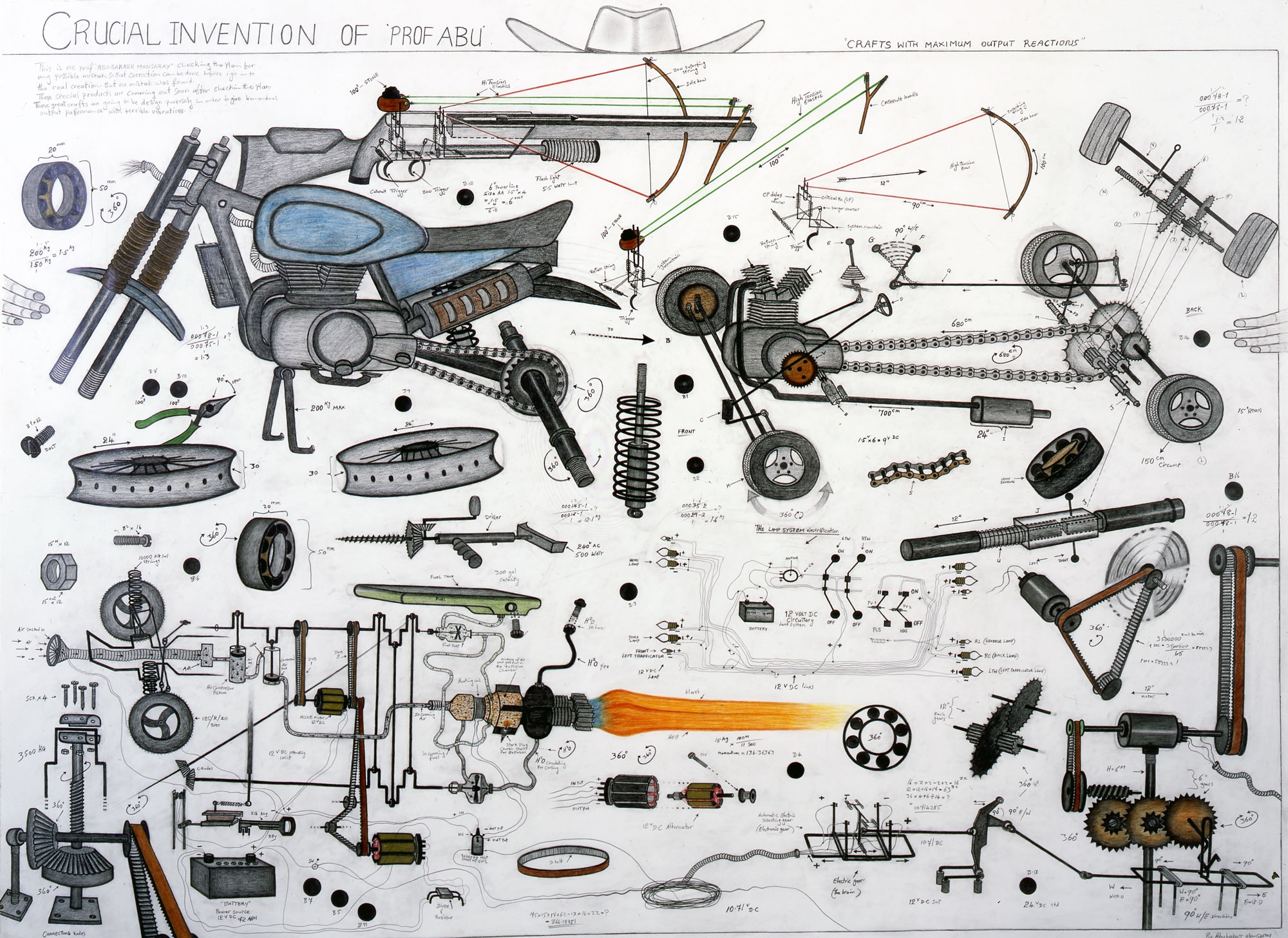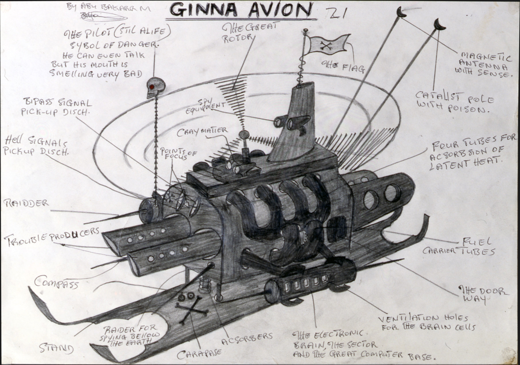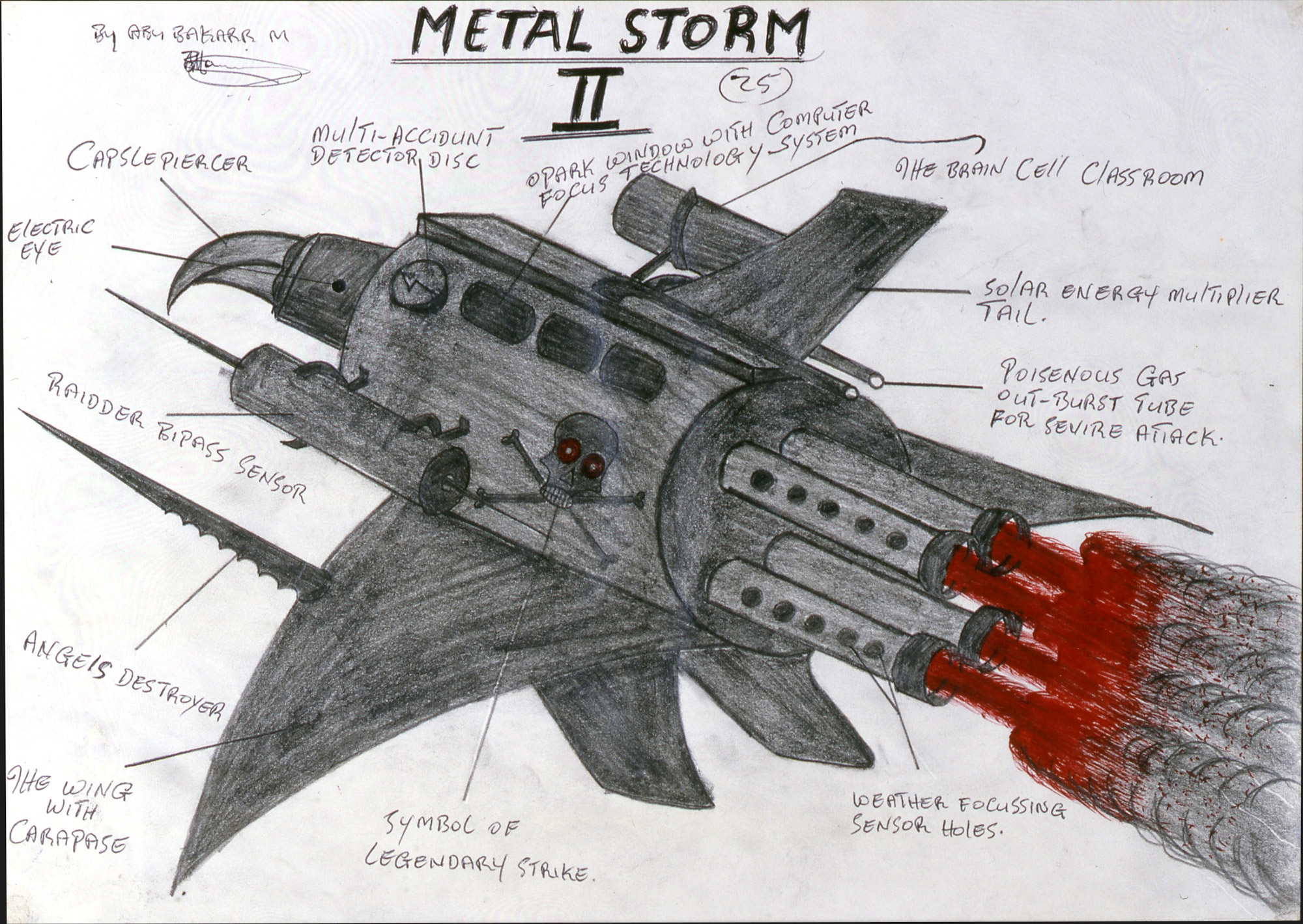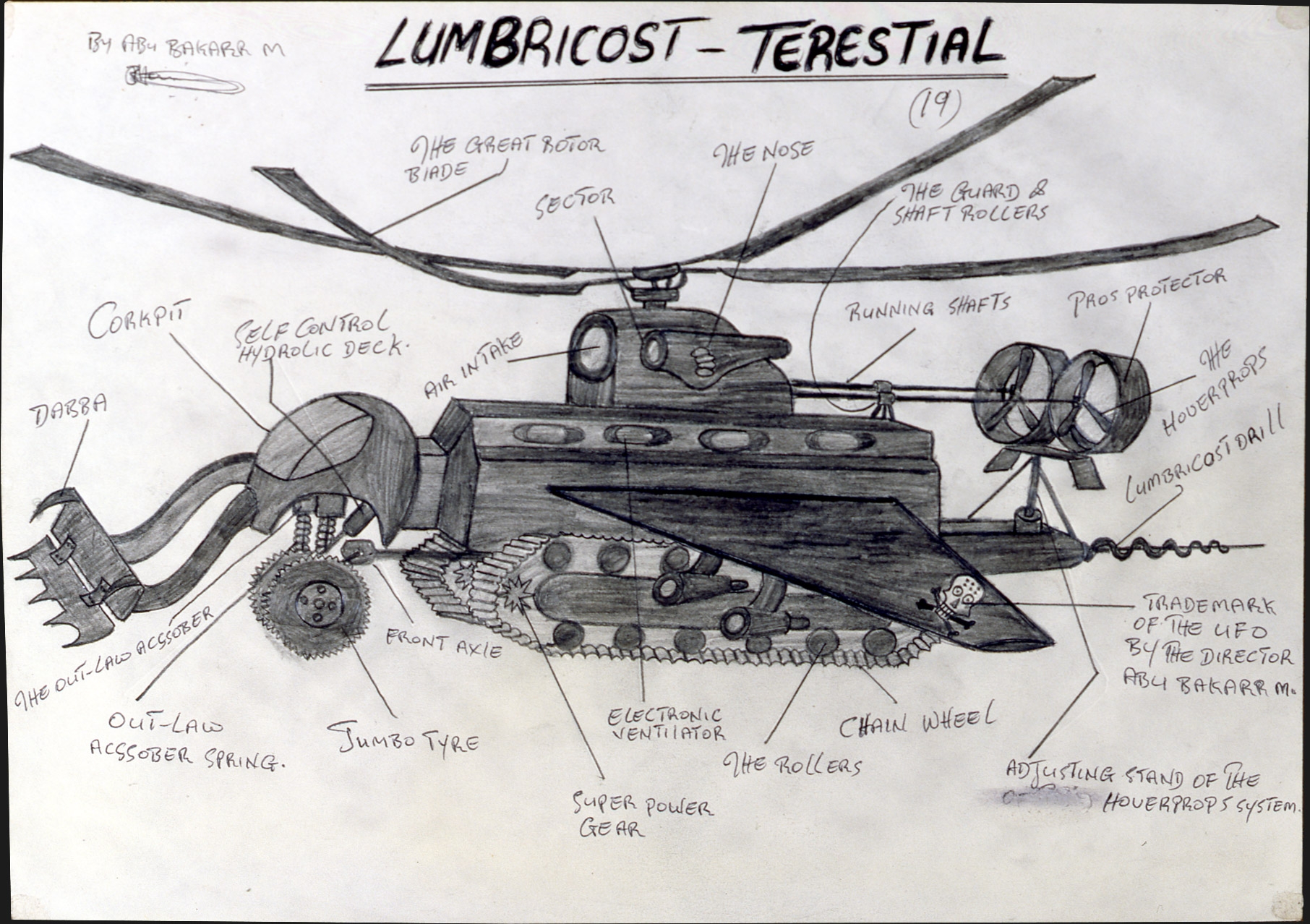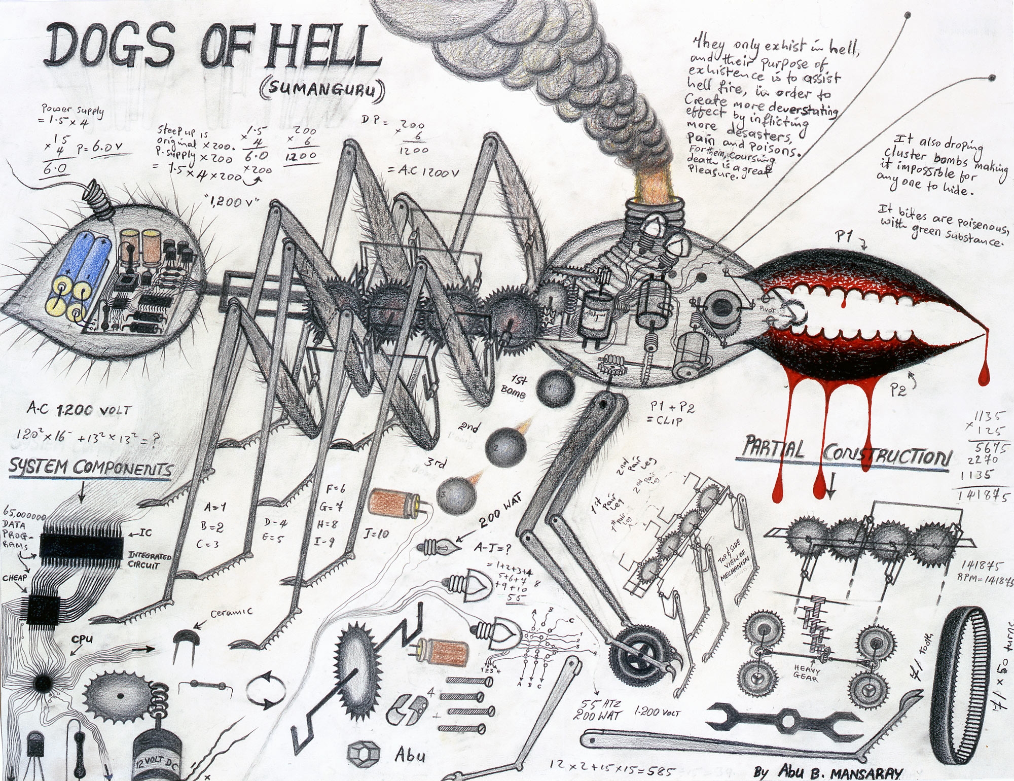 Mansaray’s preparatory drawings also stand as independent artworks. These studies consist of detailed calculations, sketches, diagrams, and commentaries executed in pencil, ballpoint pen, and crayons. “I like doing strange, complicated drawings and designing intricate machines inspired by scientific ideas that are at times beyond the human imagination (for example, the machines I designed called Hell Extinguisher and Nuclear Telephone Discovered in Hell). . . . I want people to feel the power of creation.” No doubt the economic, political and social situation in Sierra Leone, a country where war has left behind nothing but ruins and charred bodies, has shaped Mansaray’s imagination and the inspiration. In 1998 he managed to escape his country under extremely difficult circumstances, and spent several years in the Netherlands; however, his work continues to bear witness to the horrors of war.