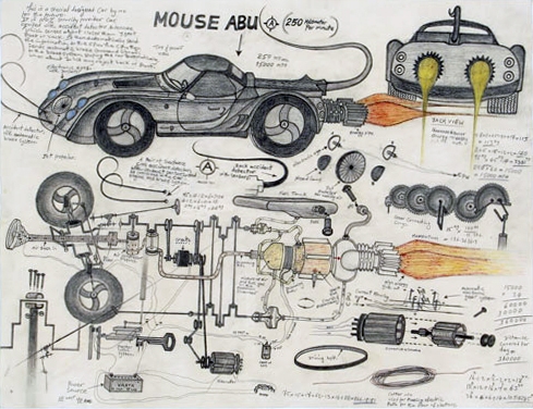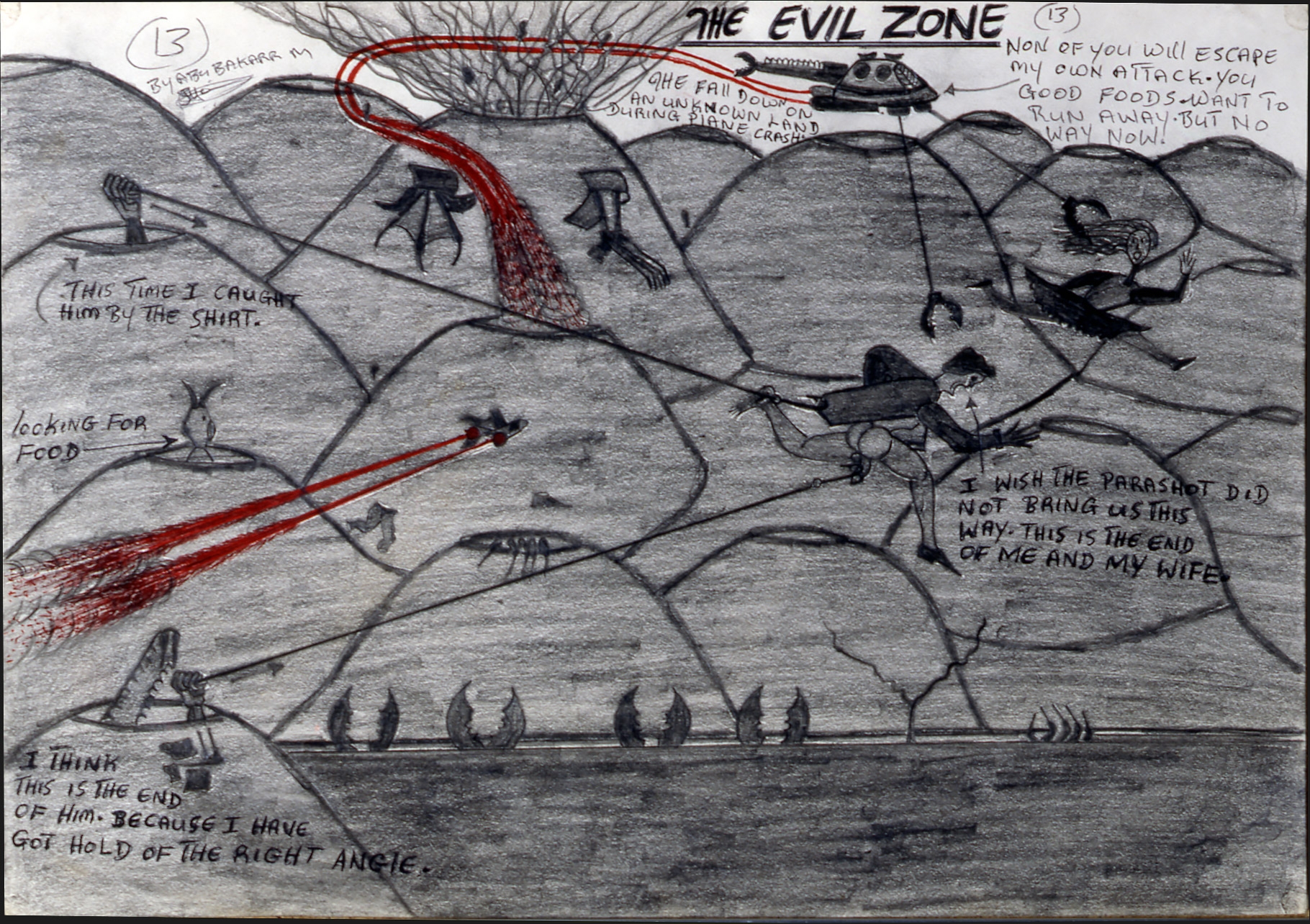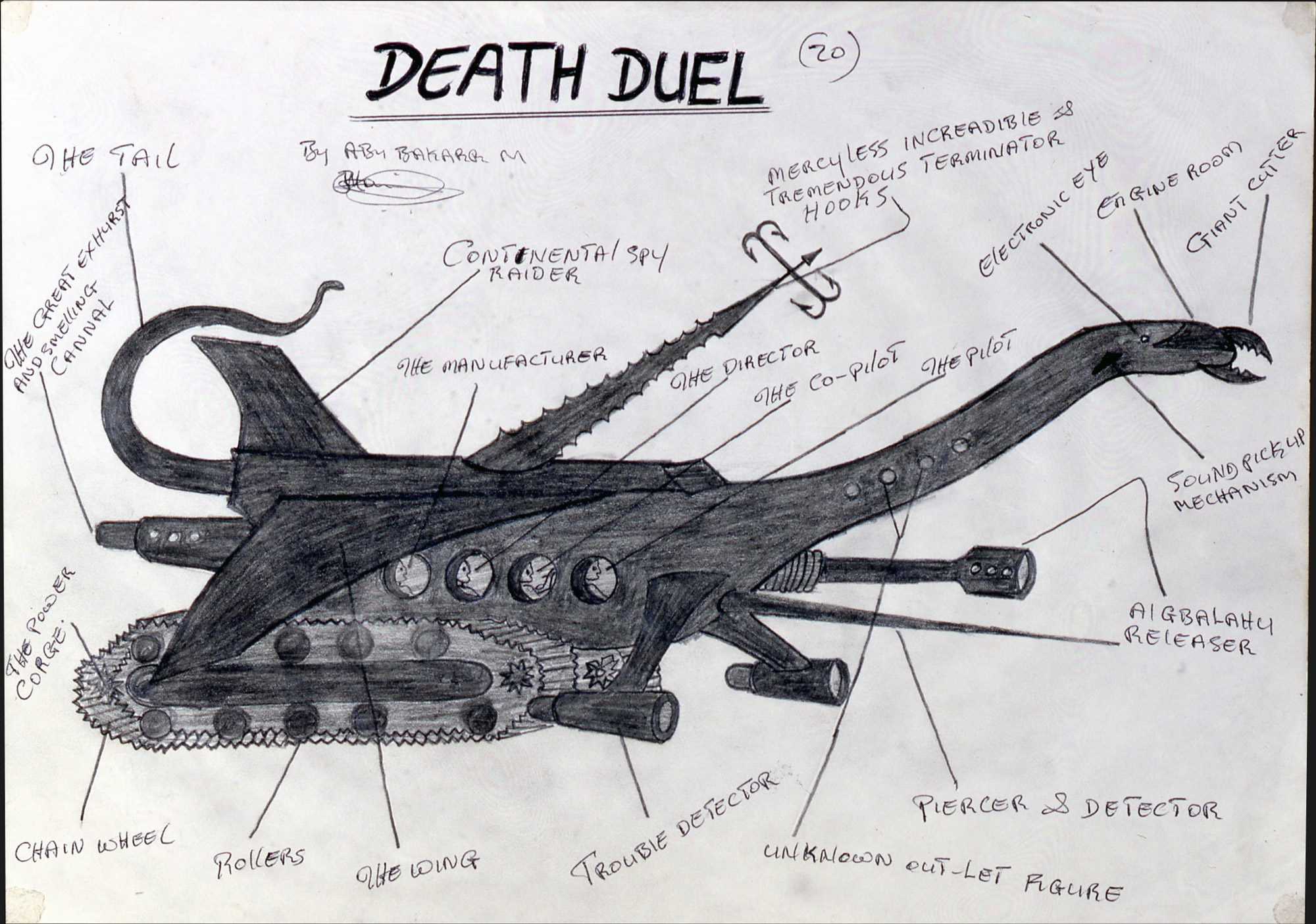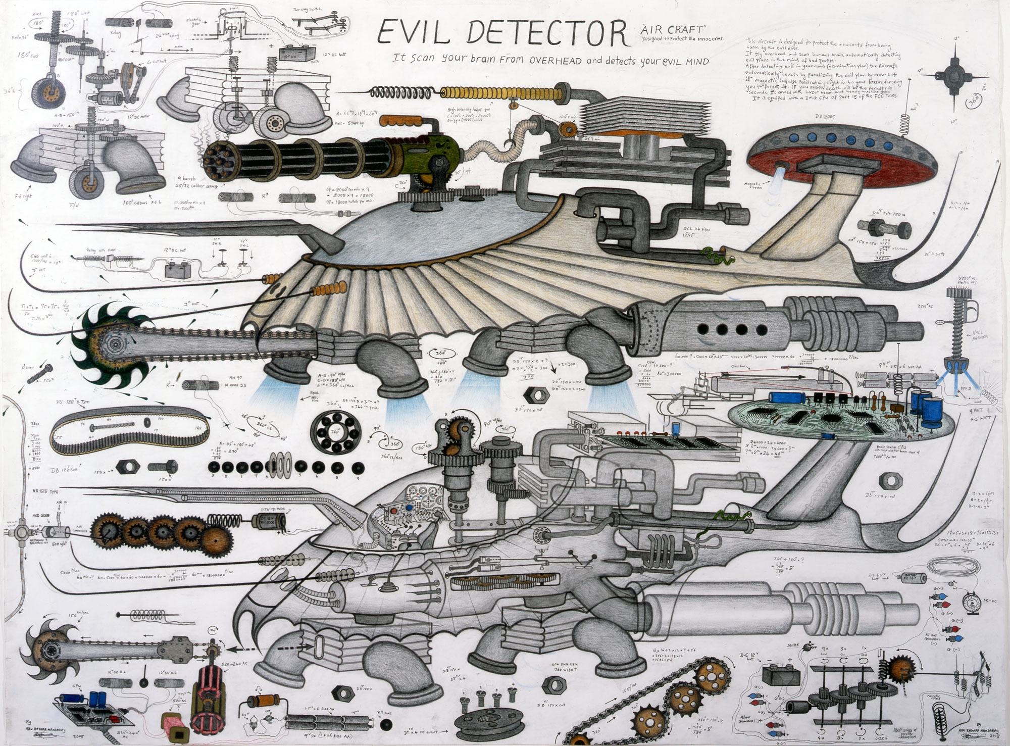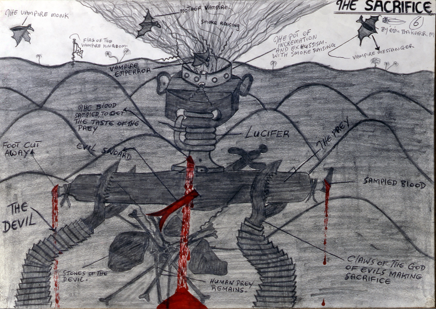 Mansaray’s preparatory drawings also stand as independent artworks. These studies consist of detailed calculations, sketches, diagrams, and commentaries executed in pencil, ballpoint pen, and crayons. “I like doing strange, complicated drawings and designing intricate machines inspired by scientific ideas that are at times beyond the human imagination (for example, the machines I designed called Hell Extinguisher and Nuclear Telephone Discovered in Hell). . . . I want people to feel the power of creation.” No doubt the economic, political and social situation in Sierra Leone, a country where war has left behind nothing but ruins and charred bodies, has shaped Mansaray’s imagination and the inspiration. In 1998 he managed to escape his country under extremely difficult circumstances, and spent several years in the Netherlands; however, his work continues to bear witness to the horrors of war.