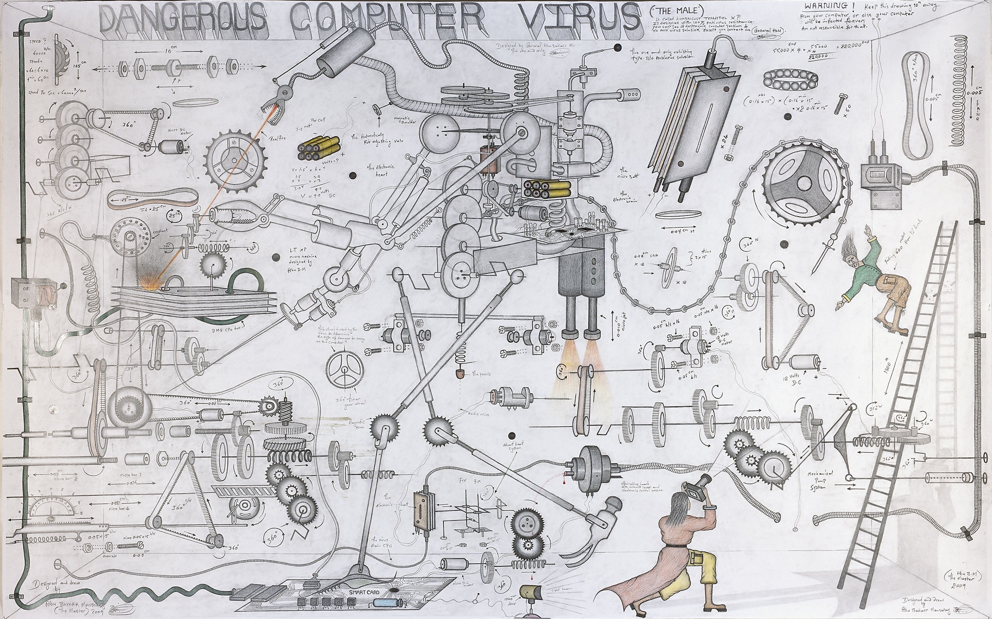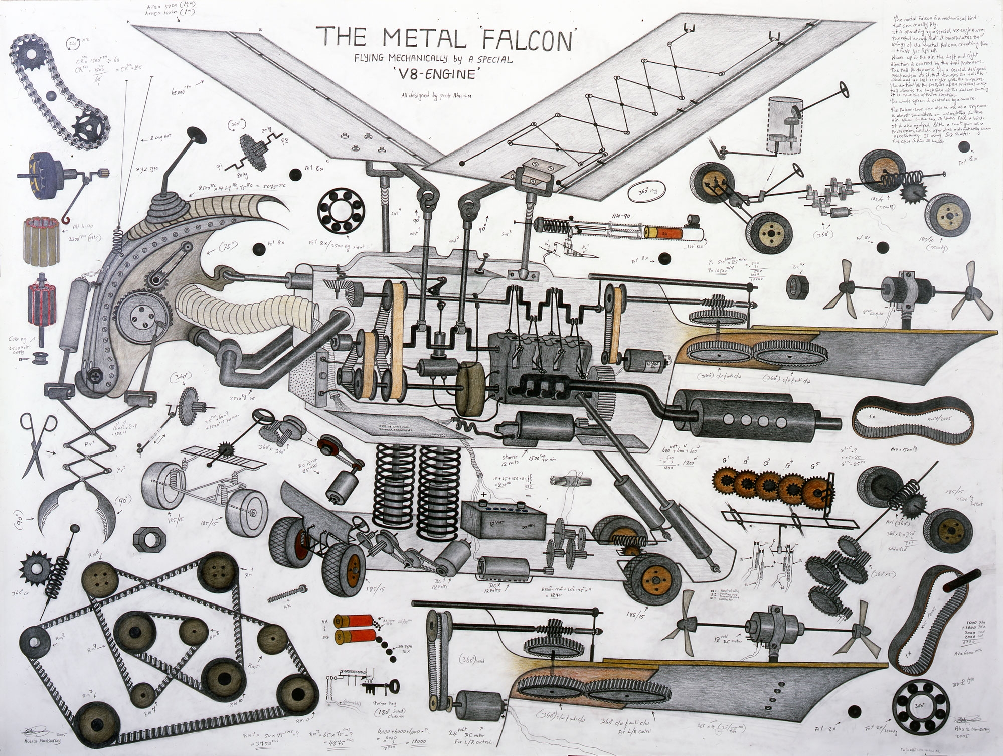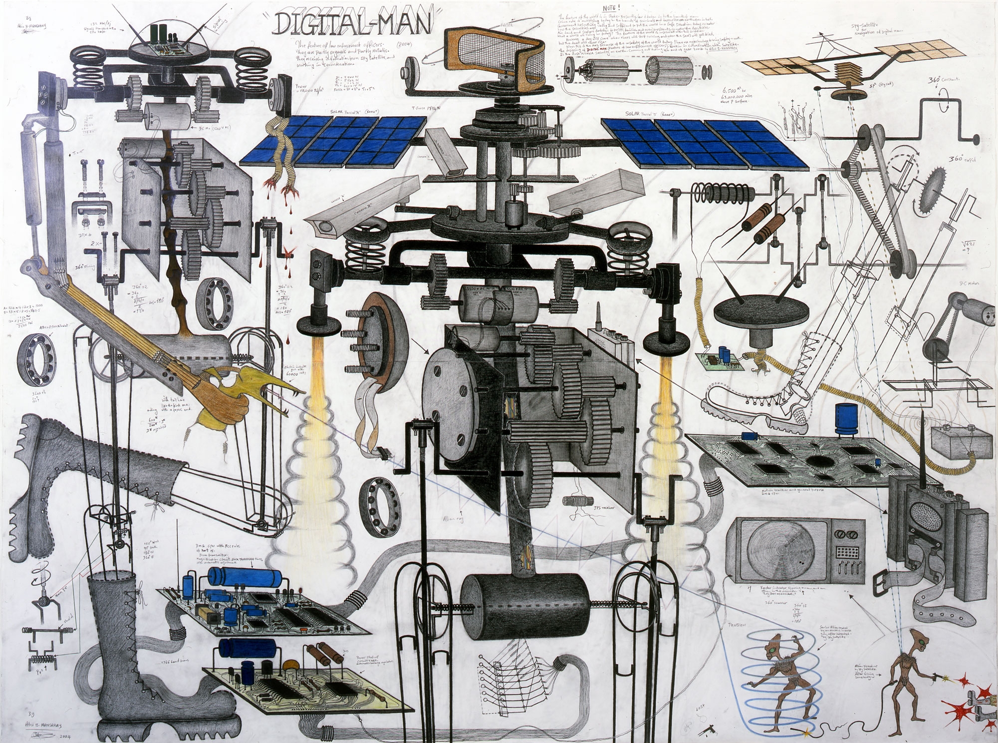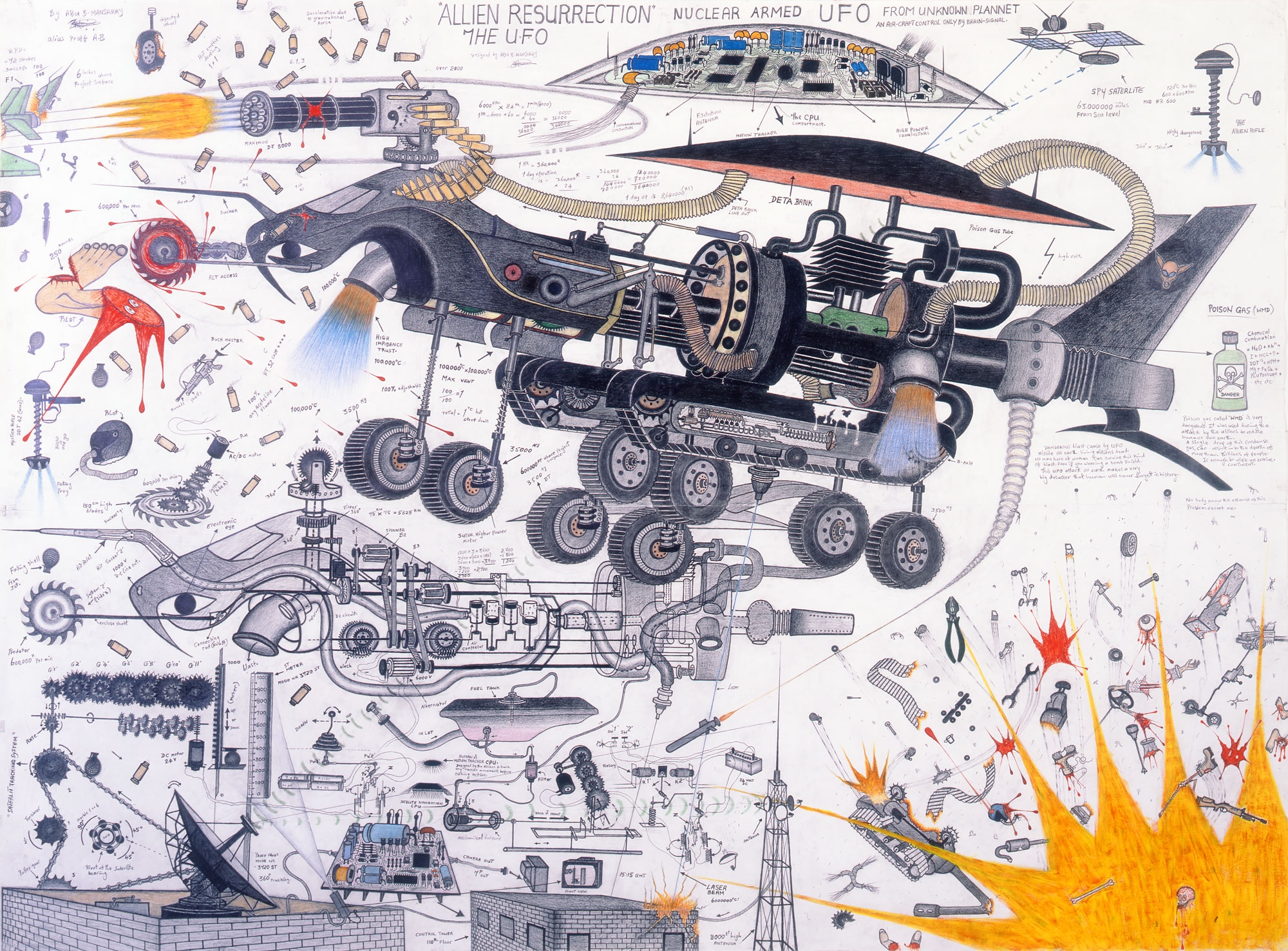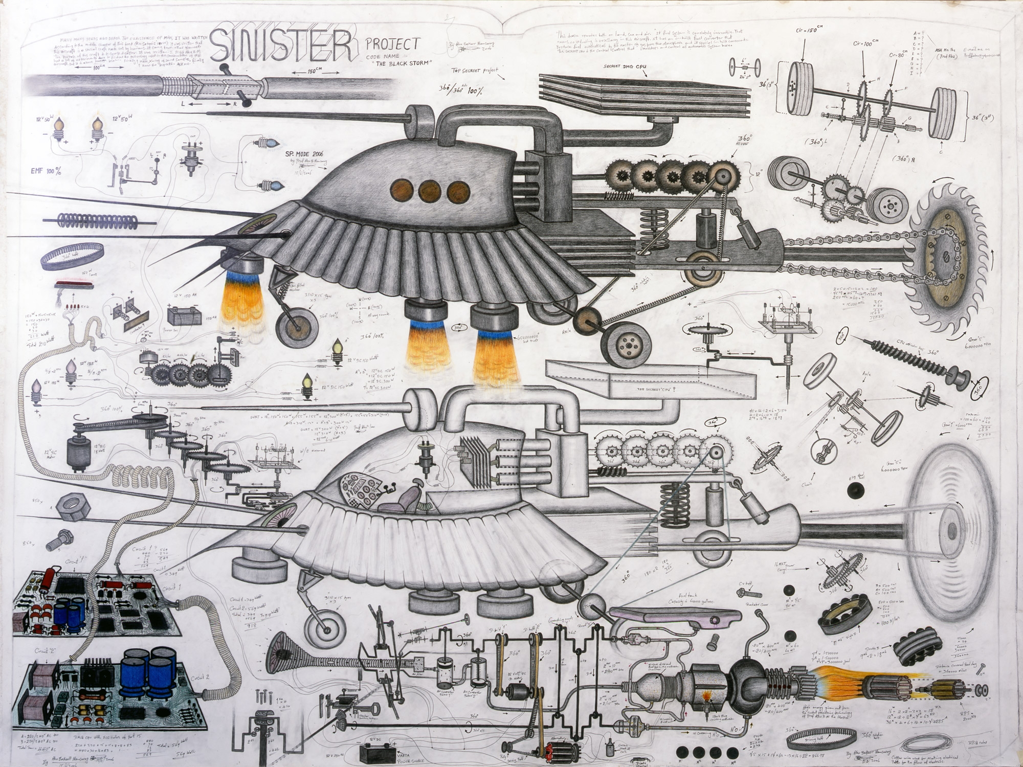 Mansaray’s preparatory drawings also stand as independent artworks. These studies consist of detailed calculations, sketches, diagrams, and commentaries executed in pencil, ballpoint pen, and crayons. “I like doing strange, complicated drawings and designing intricate machines inspired by scientific ideas that are at times beyond the human imagination (for example, the machines I designed called Hell Extinguisher and Nuclear Telephone Discovered in Hell). . . . I want people to feel the power of creation.” No doubt the economic, political and social situation in Sierra Leone, a country where war has left behind nothing but ruins and charred bodies, has shaped Mansaray’s imagination and the inspiration. In 1998 he managed to escape his country under extremely difficult circumstances, and spent several years in the Netherlands; however, his work continues to bear witness to the horrors of war.