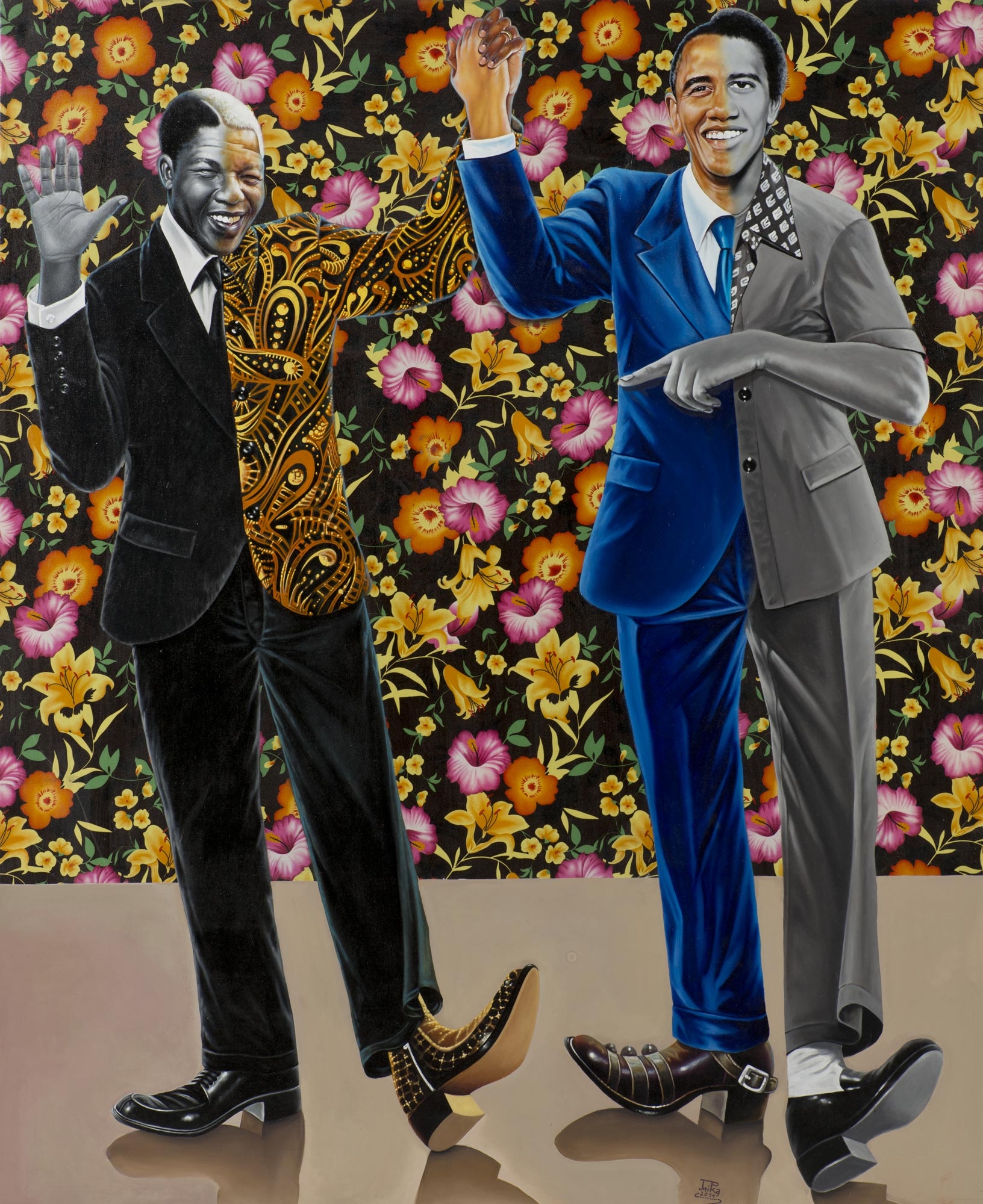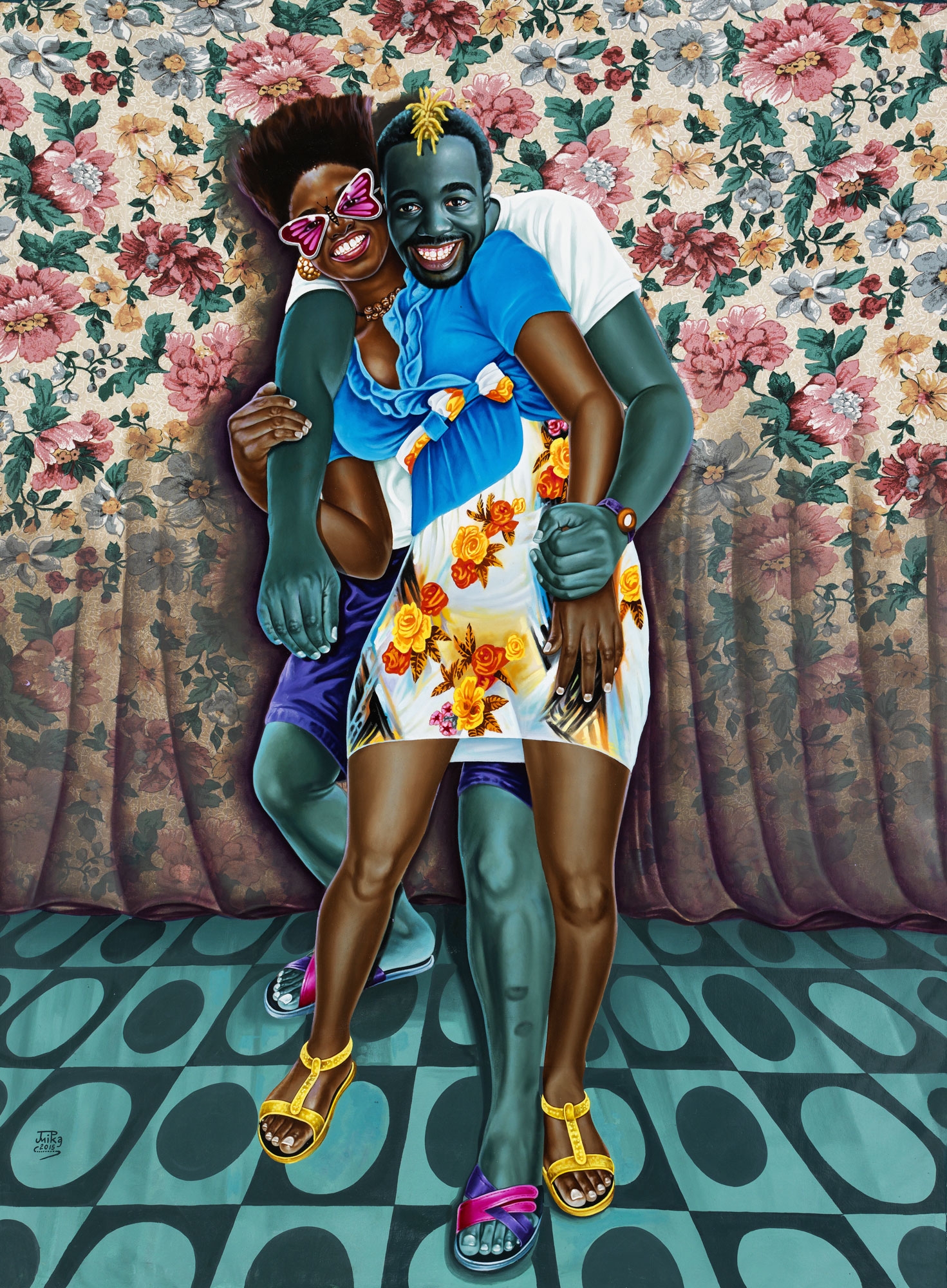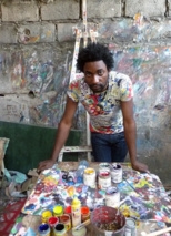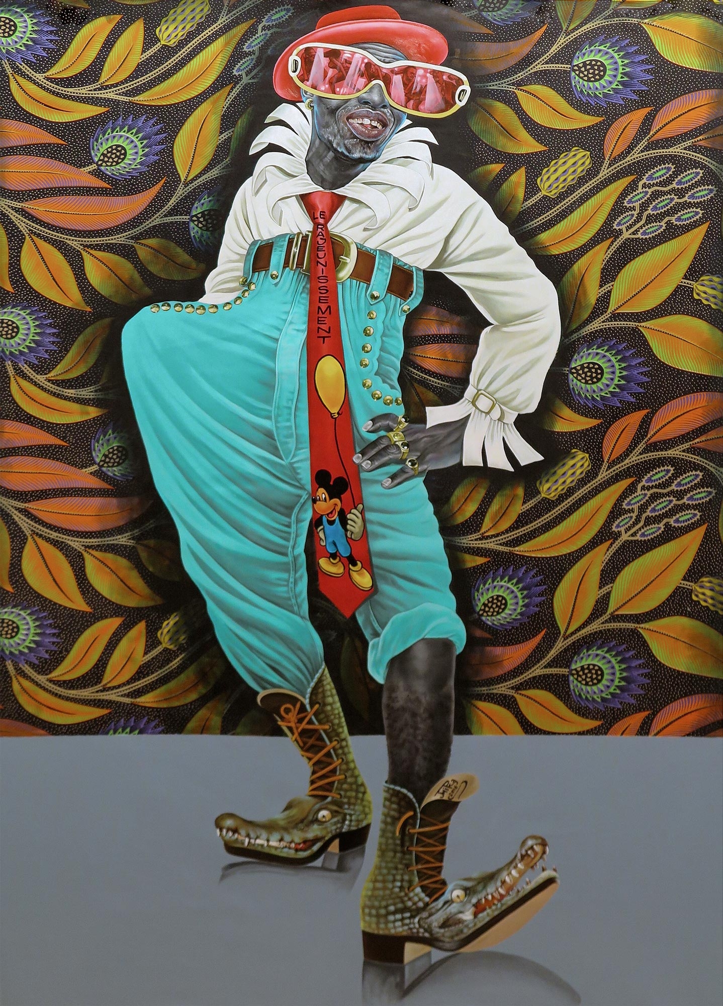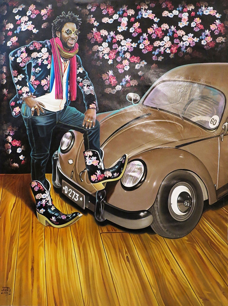 JP Mika took an early interest in drawing and ornamentation and attended the painting department of the Kinshasa Academy of Fine Art. He also went to ARAP, The Popular Art Research Studio created by the artist Chéri Chérin who later became his “Master”. There, he improved his skills and became a member of APPO, The Popular Painters Society. In 2004, he established his own Studio and named it EBA, The Fine Arts Events. He is an outstanding draftsman and he has long borrowed the themes and compositions of his elders and his mentor Chéri Chérin. As Chéri Samba before him, Mika puts himself on stage in his works, painting self portraits or adding himself in group composition - most of the time dressed as a “sapeur” (group of well-dressed men). For the last couple of years, he has develop his own style concentrated on portraits and simplifying his composition by using colourful fabrics that he uses as a background. This “finding” and the perfect use of colour provides a positive energy to his work and that now profoundly stands out from his peers. His very realistic paintings are nevertheless benevolent and whatever the subject, he gently and kindly paints a modern, dynamic and happy Africa.