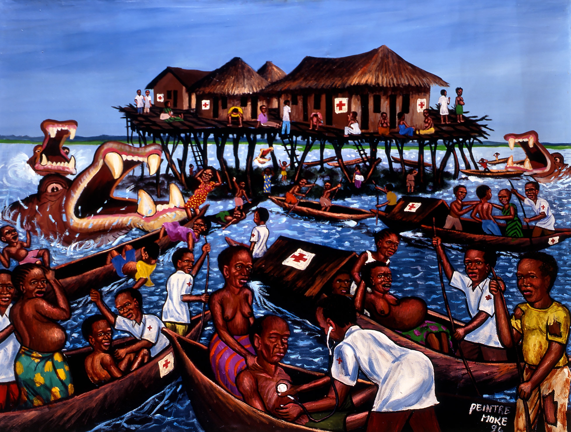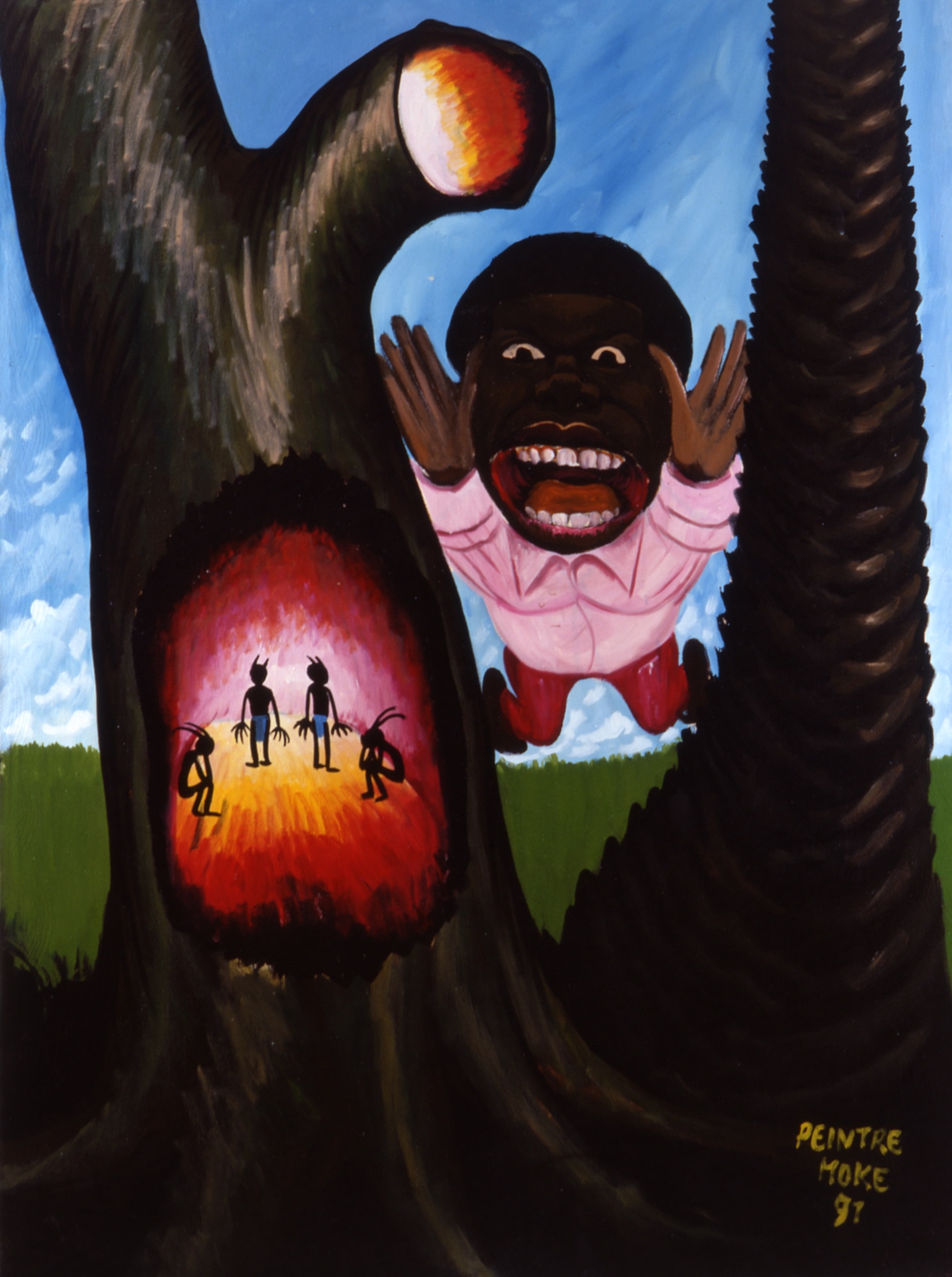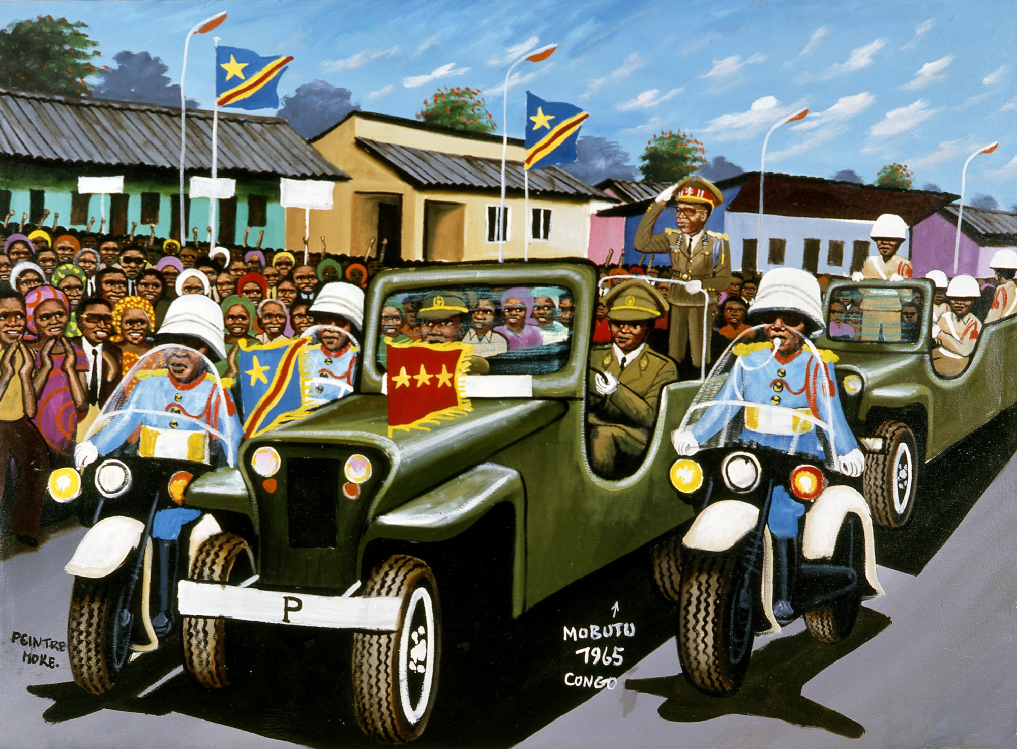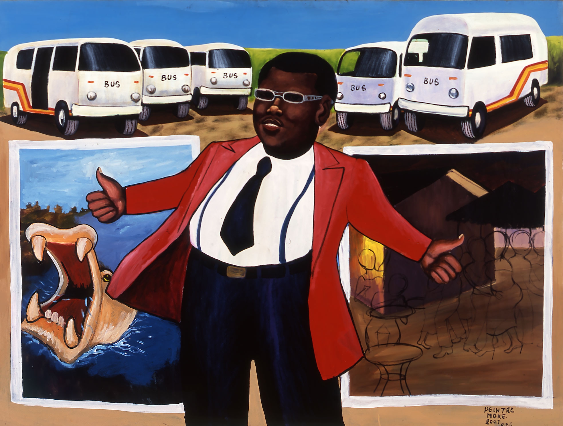 Seen rightly as a “painter reporter” of city life, Moke was among the leading artists of the school of popular painting that sprung up in Kinshasa in the first decade of Zaïre’s independence. He arrived in Kinshasa at the age of ten, living hand to mouth and day by day. Discovering that there was a market for paintings, he taught himself how to render landscapes on discarded pieces of cardboard. In 1965 he painted a picture representing General Mobutu waving to the crowds as he led the parade commemorating Independence Day; this composition, which he returned to many times in later years, launched Moke’s career. He set up a studio at the crossroads of Kasa Vubu and Bolobo avenues, the district where many billboard and advertising artists worked, and immersed himself in the daily life of the city from which he drew his inspiration.