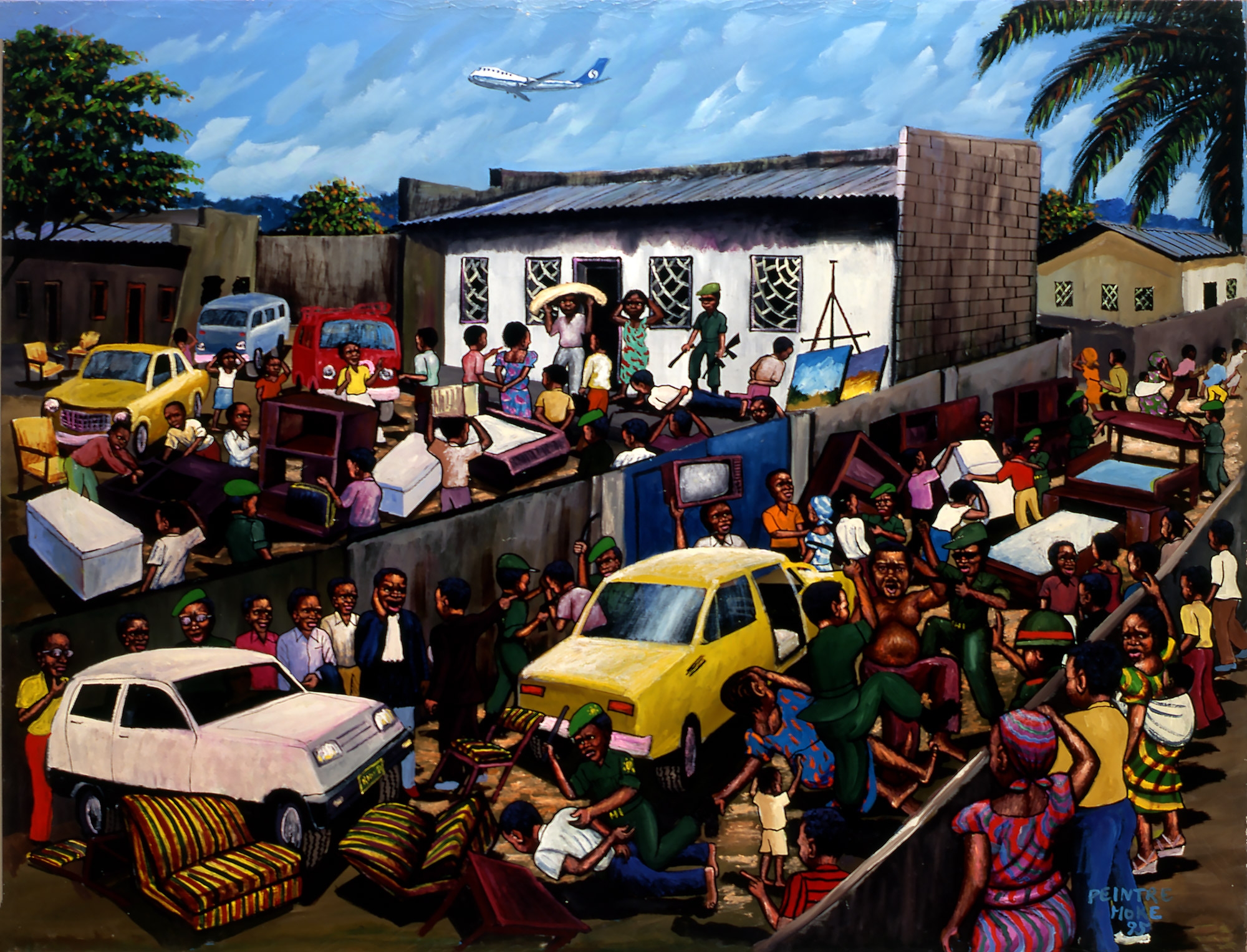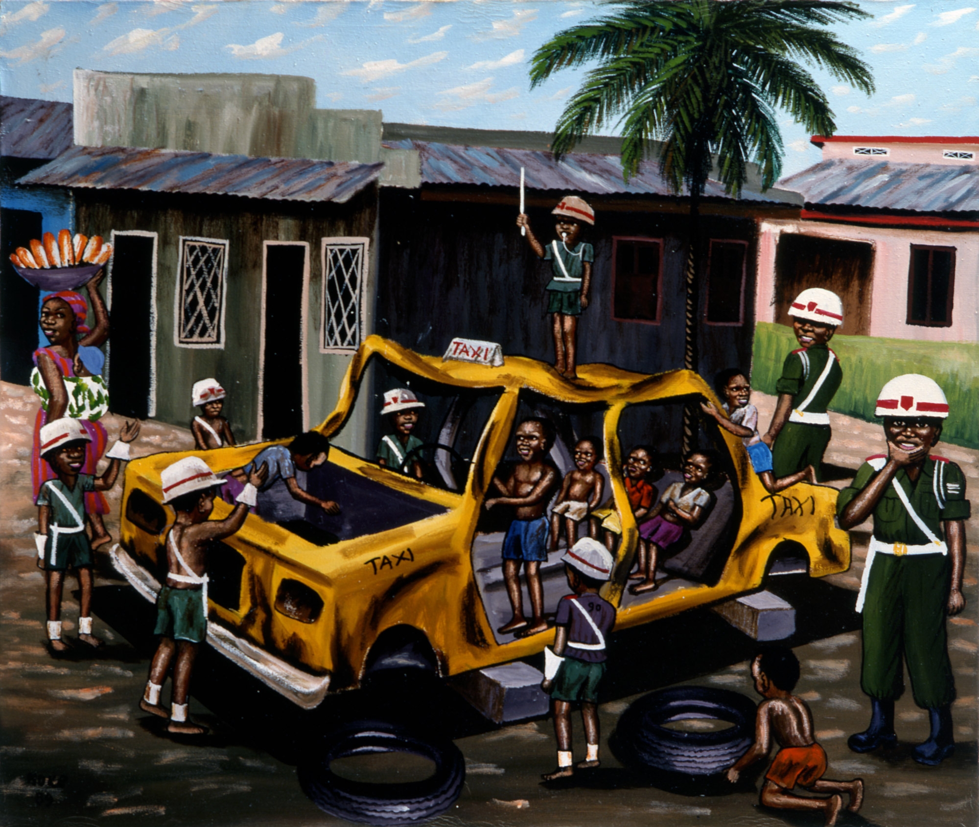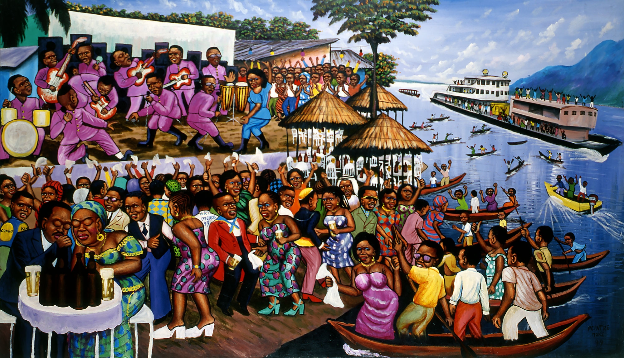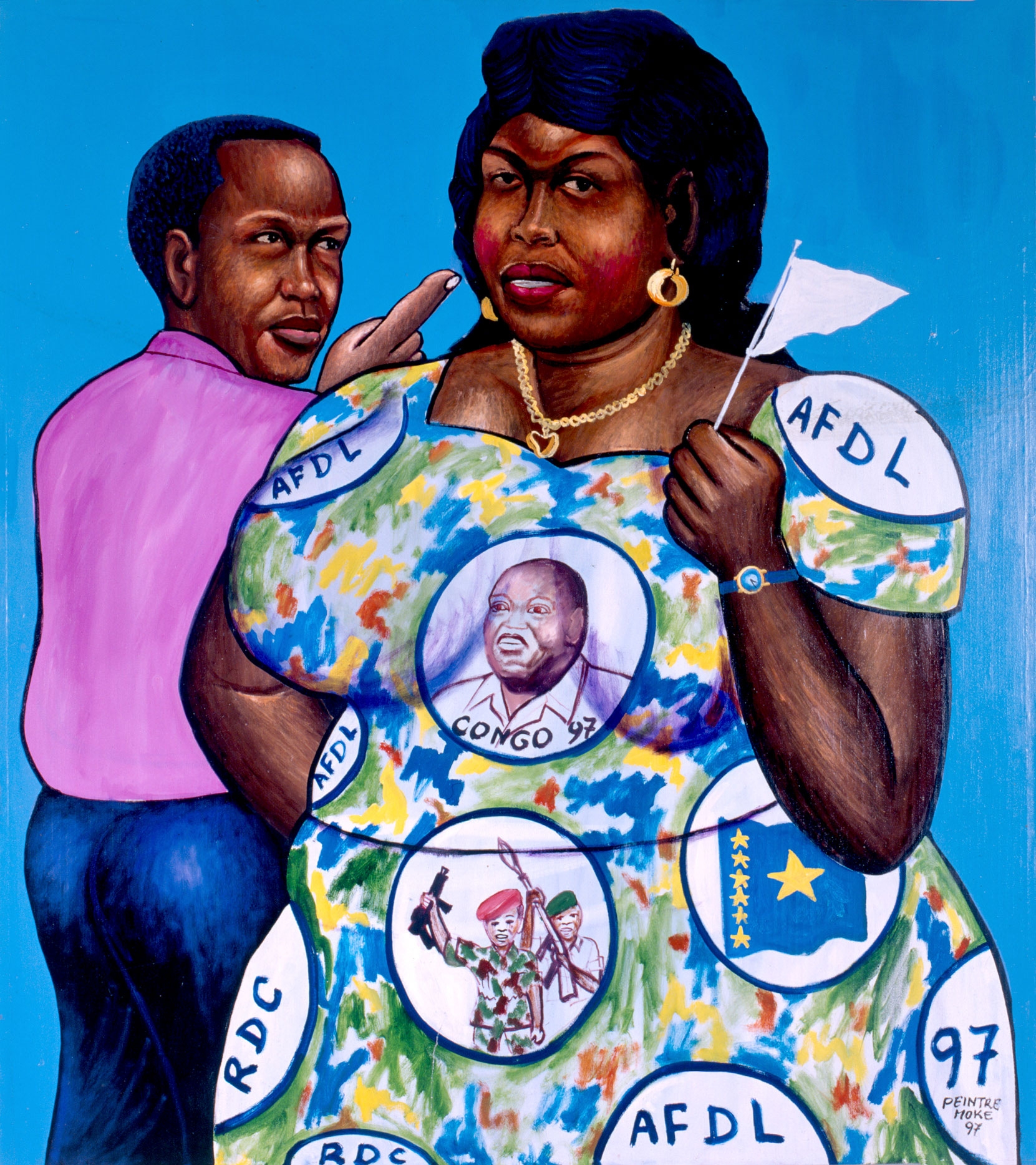 Seen rightly as a “painter reporter” of city life, Moke was among the leading artists of the school of popular painting that sprung up in Kinshasa in the first decade of Zaïre’s independence. He arrived in Kinshasa at the age of ten, living hand to mouth and day by day. Discovering that there was a market for paintings, he taught himself how to render landscapes on discarded pieces of cardboard. In 1965 he painted a picture representing General Mobutu waving to the crowds as he led the parade commemorating Independence Day; this composition, which he returned to many times in later years, launched Moke’s career. He set up a studio at the crossroads of Kasa Vubu and Bolobo avenues, the district where many billboard and advertising artists worked, and immersed himself in the daily life of the city from which he drew his inspiration.
