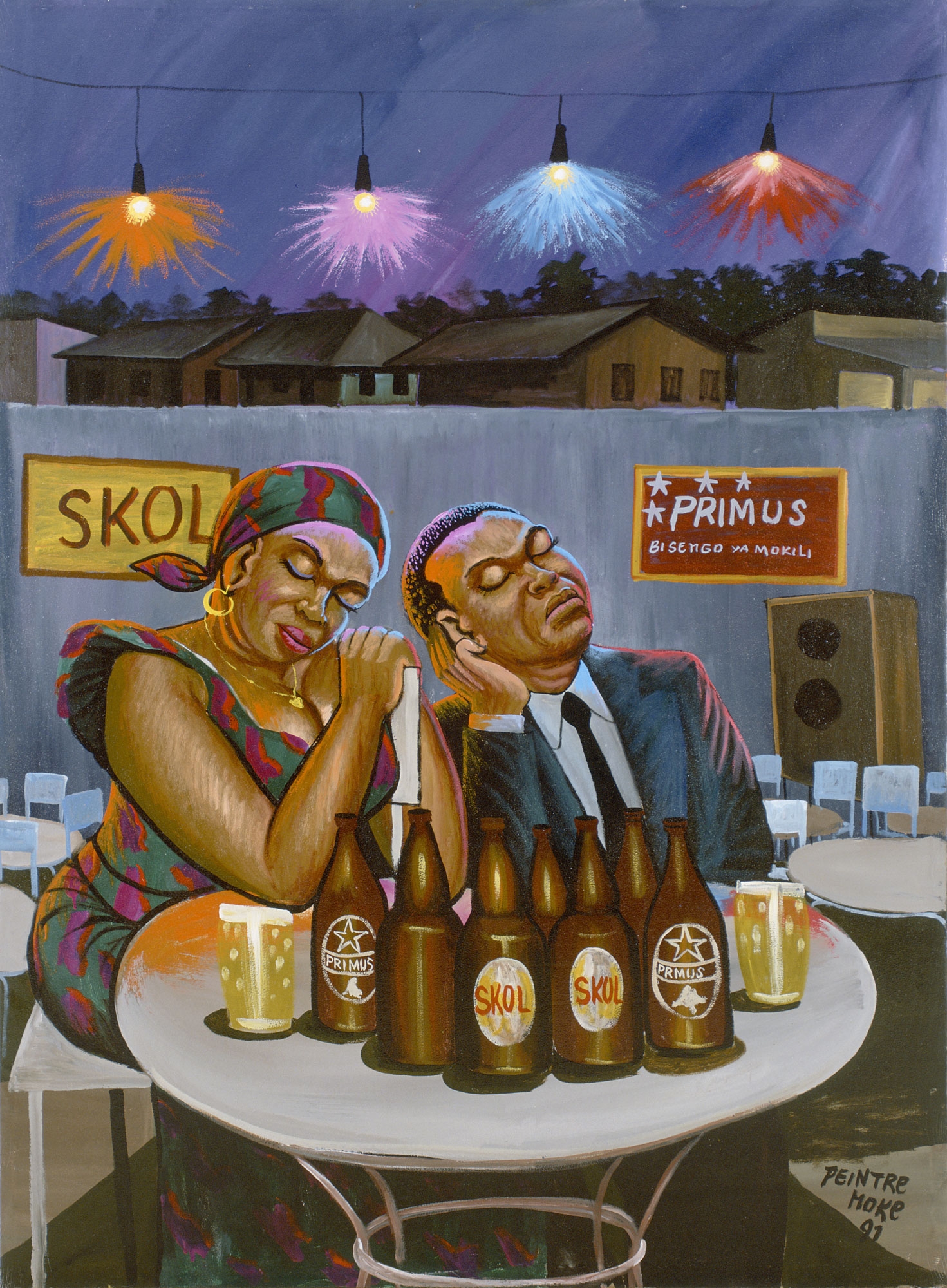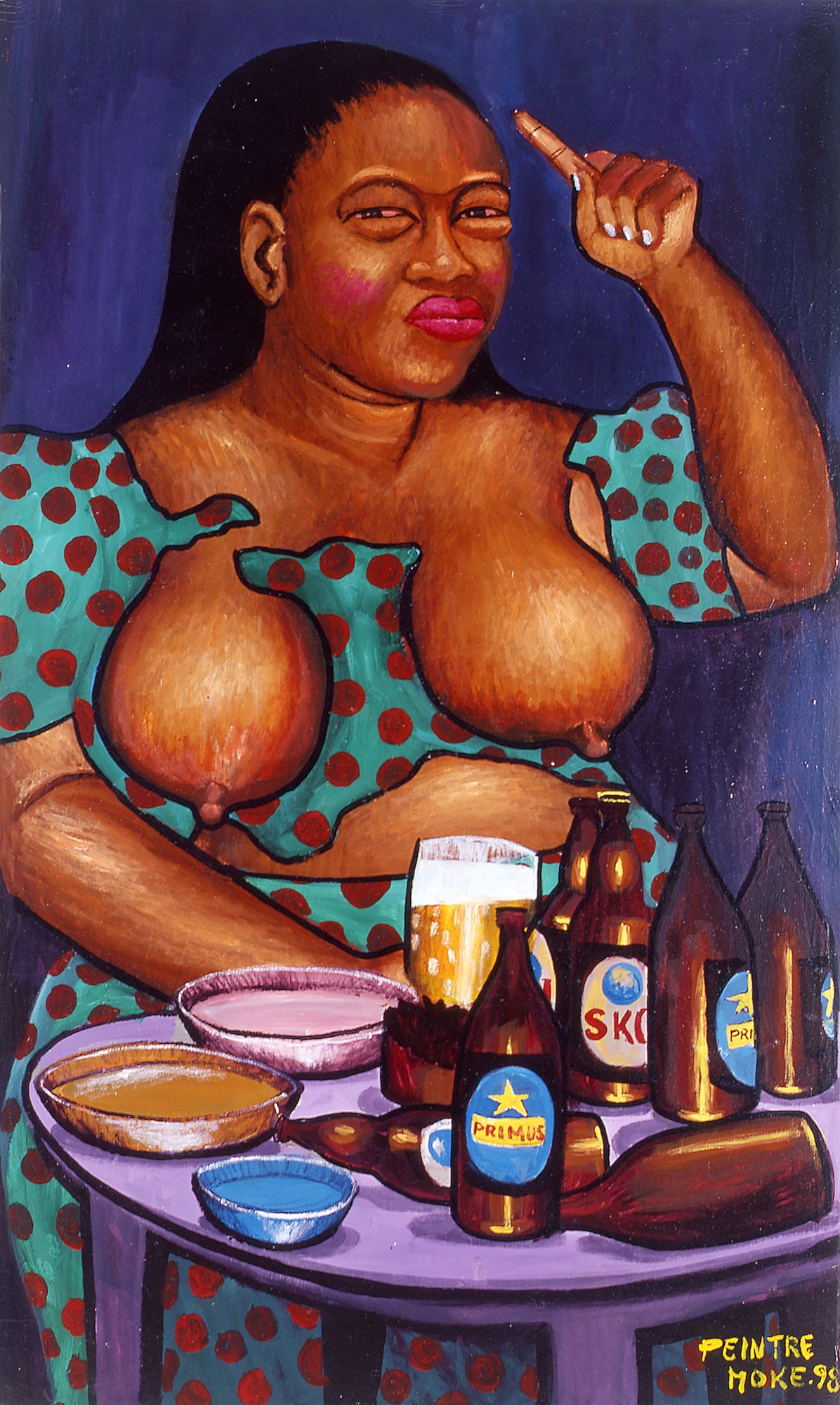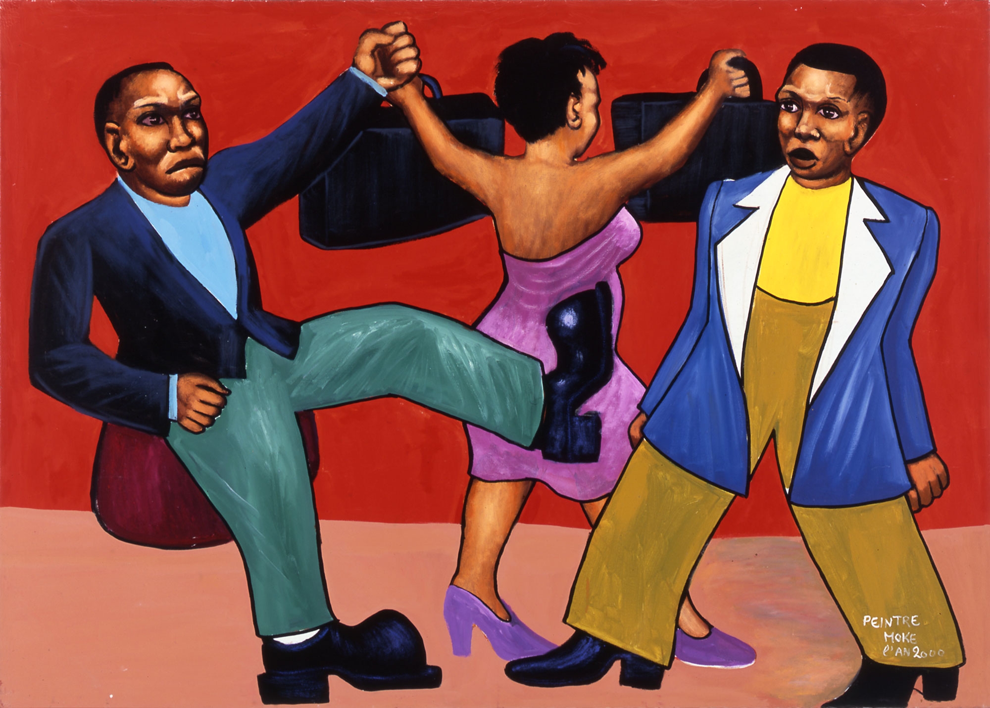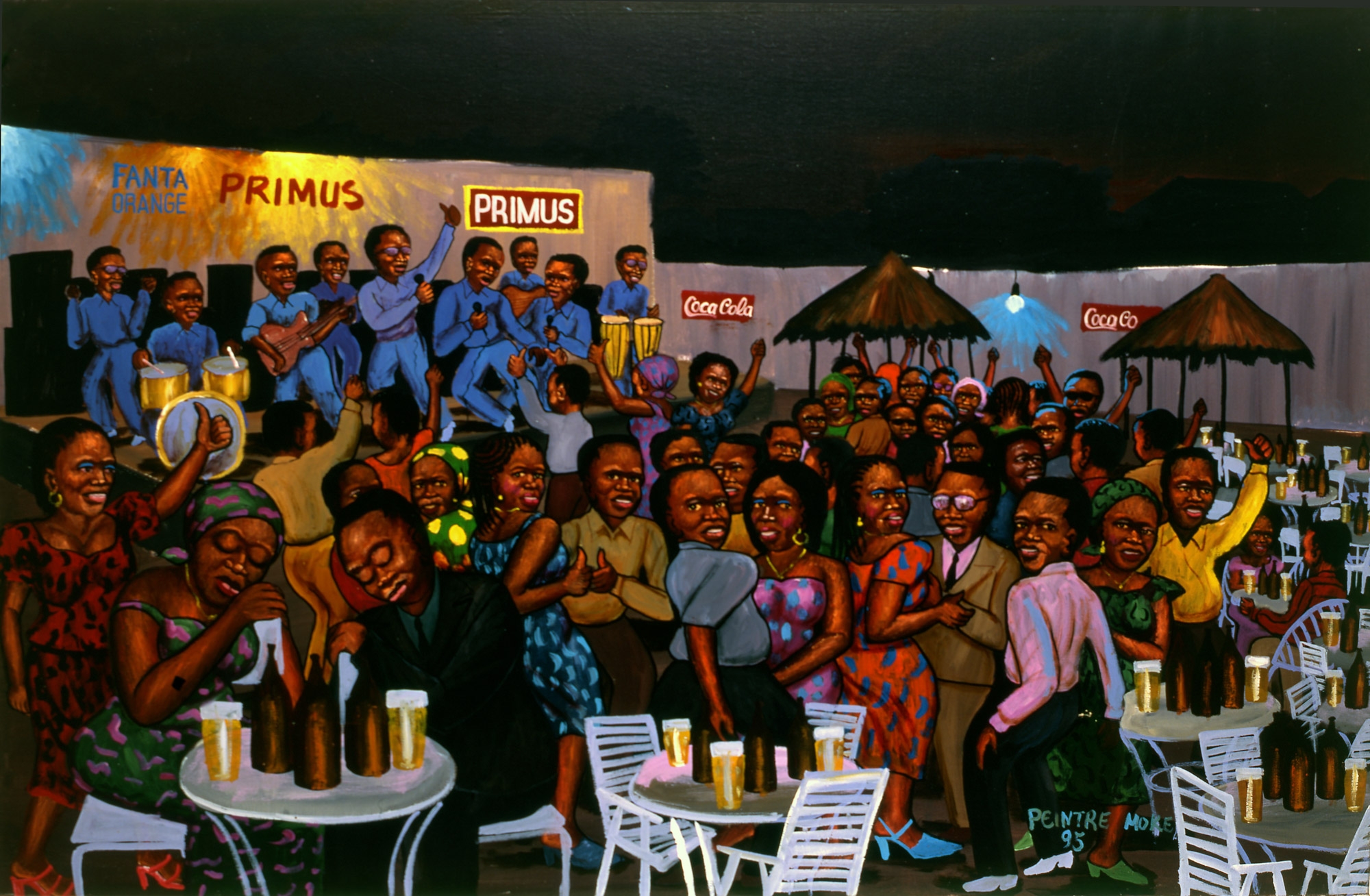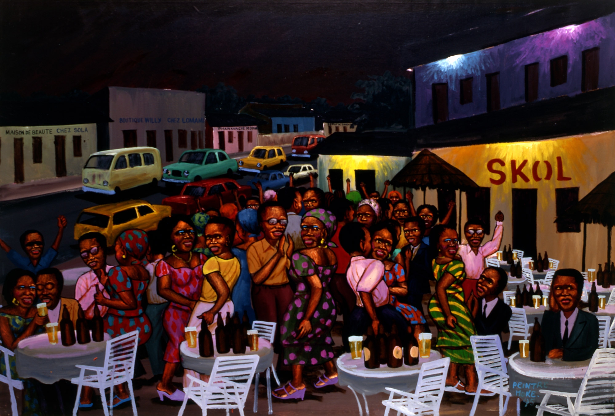 Moke adopted the conventions of commercial art, boldly outlining his robust figures without concern for likeness or perspective. Instead, he celebrated the painterly aspects of his art, using a rich palette and vividly animated compositions. Unlike Chéri Samba or Cheik Ledy, who were to follow in his footsteps, Moke rarely depicted social conflict. Rather, his sympathetic and vivaciously humorous paintings were grounded in his observation of daily life in Kinshasa: street scenes, bars, the local dandies known as sapeurs, the powerful Miziki (associations of financially independent women), all-night parties, neighborhood disputes, and public ceremonies all found their way into his canvases.