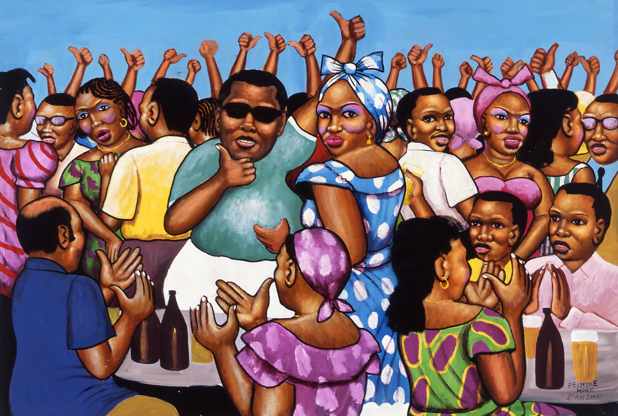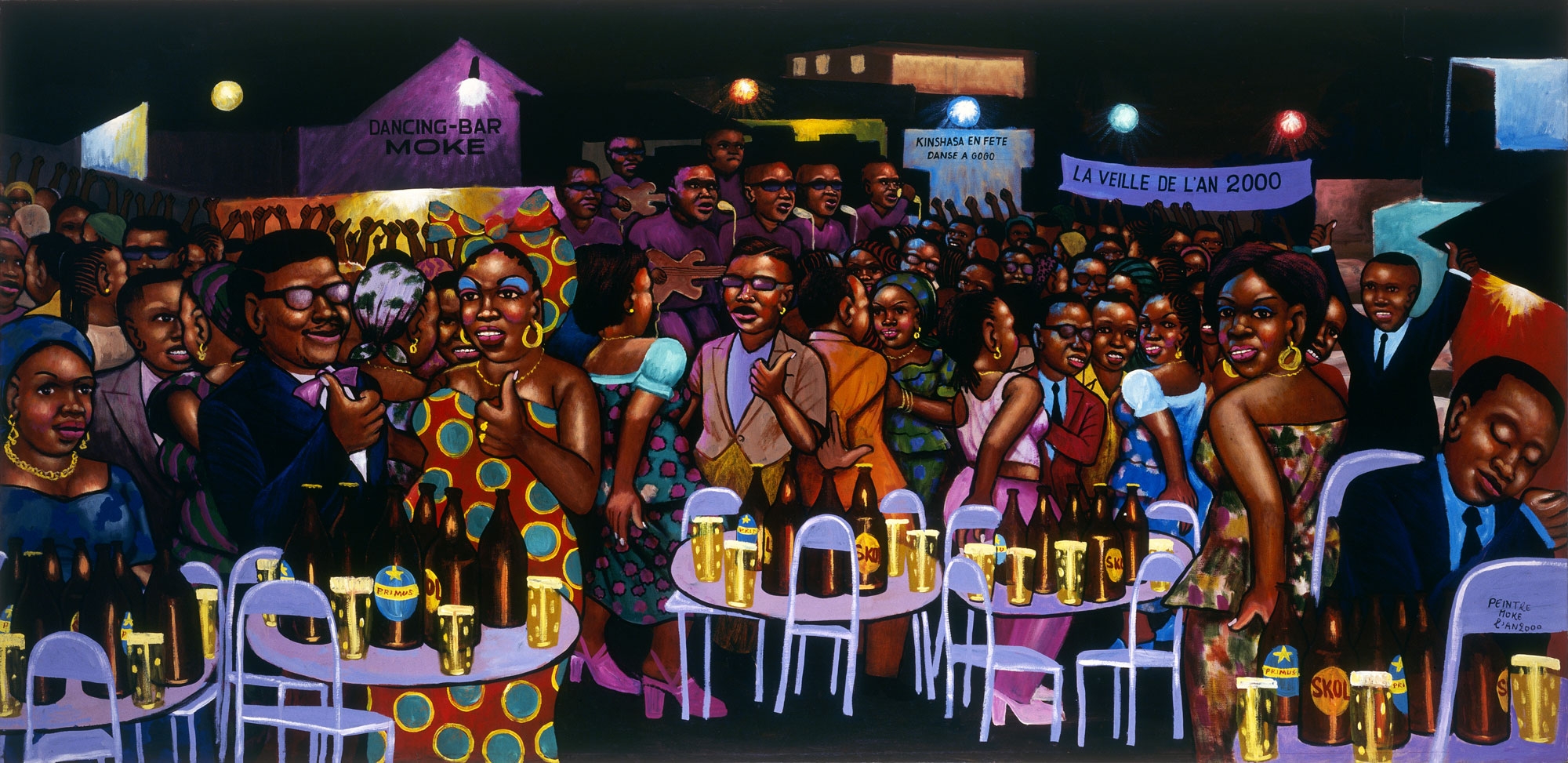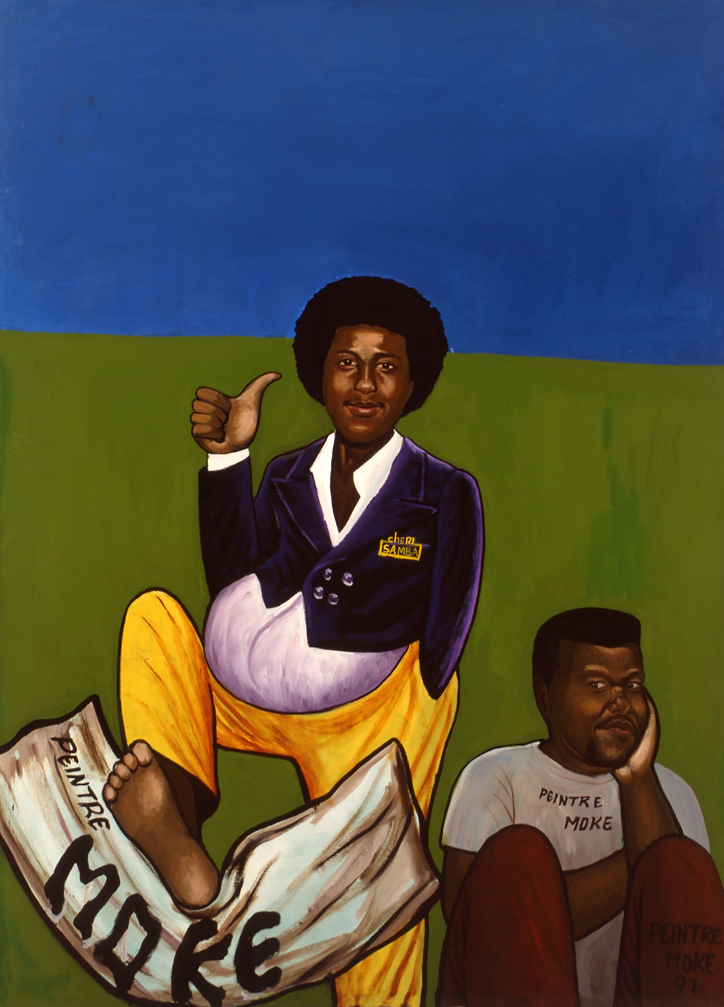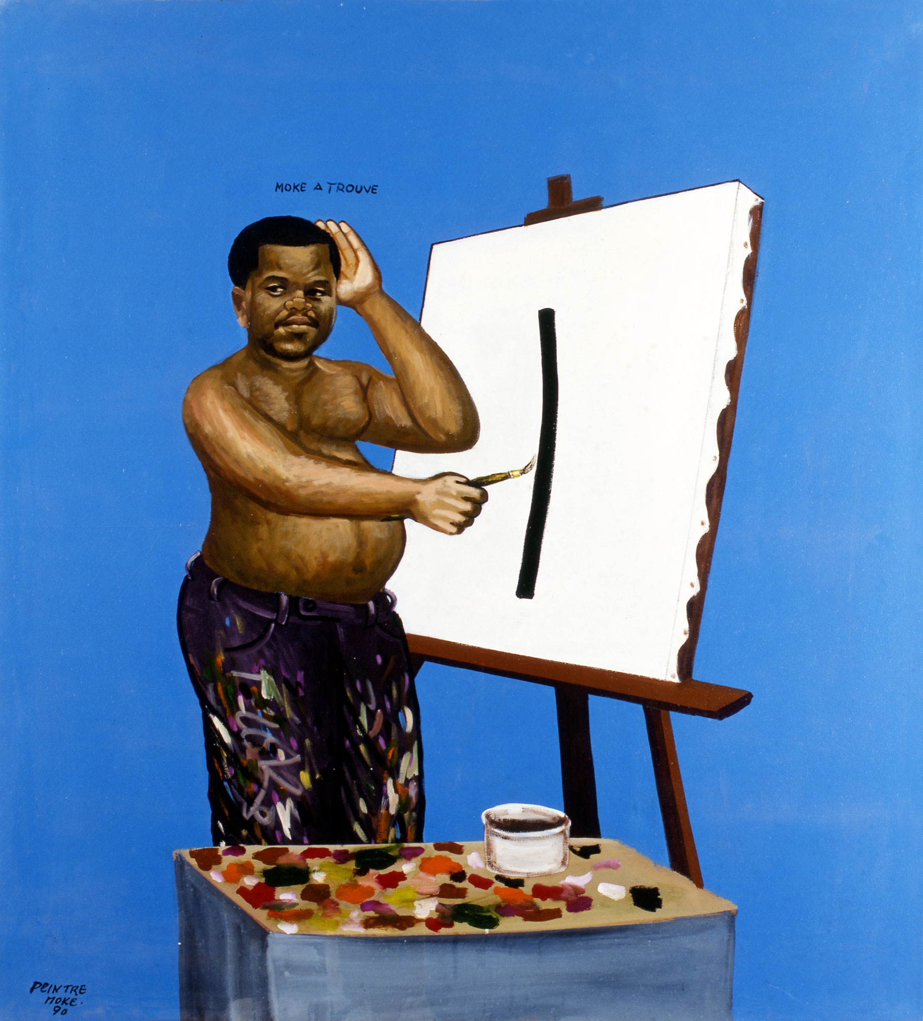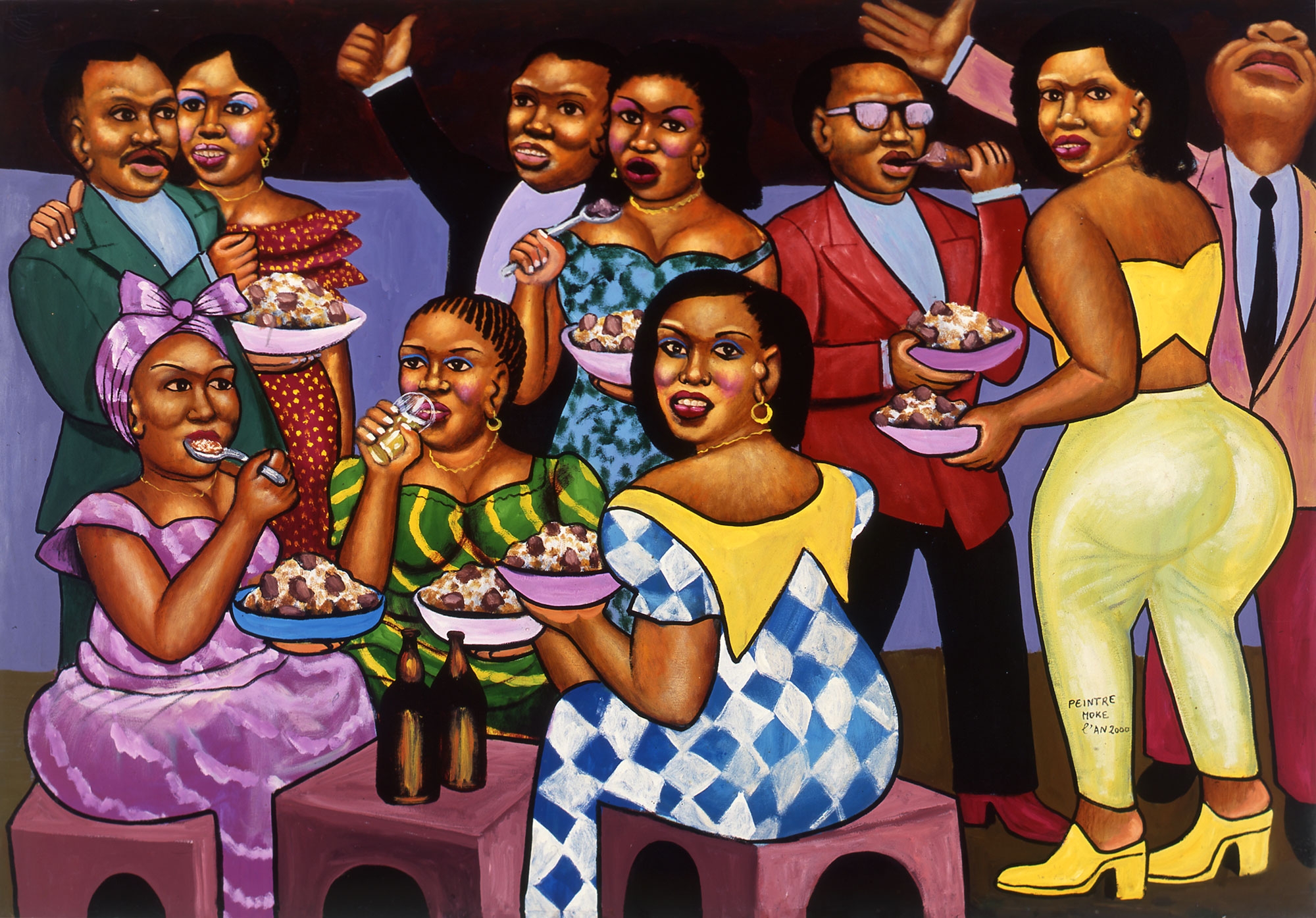 Moke adopted the conventions of commercial art, boldly outlining his robust figures without concern for likeness or perspective. Instead, he celebrated the painterly aspects of his art, using a rich palette and vividly animated compositions. Unlike Chéri Samba or Cheik Ledy, who were to follow in his footsteps, Moke rarely depicted social conflict. Rather, his sympathetic and vivaciously humorous paintings were grounded in his observation of daily life in Kinshasa: street scenes, bars, the local dandies known as sapeurs, the powerful Miziki (associations of financially independent women), all-night parties, neighborhood disputes, and public ceremonies all found their way into his canvases.