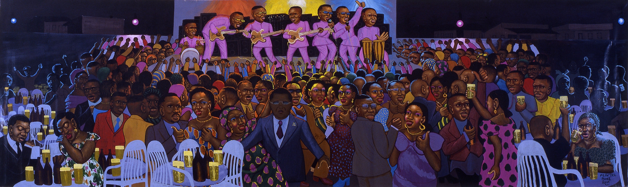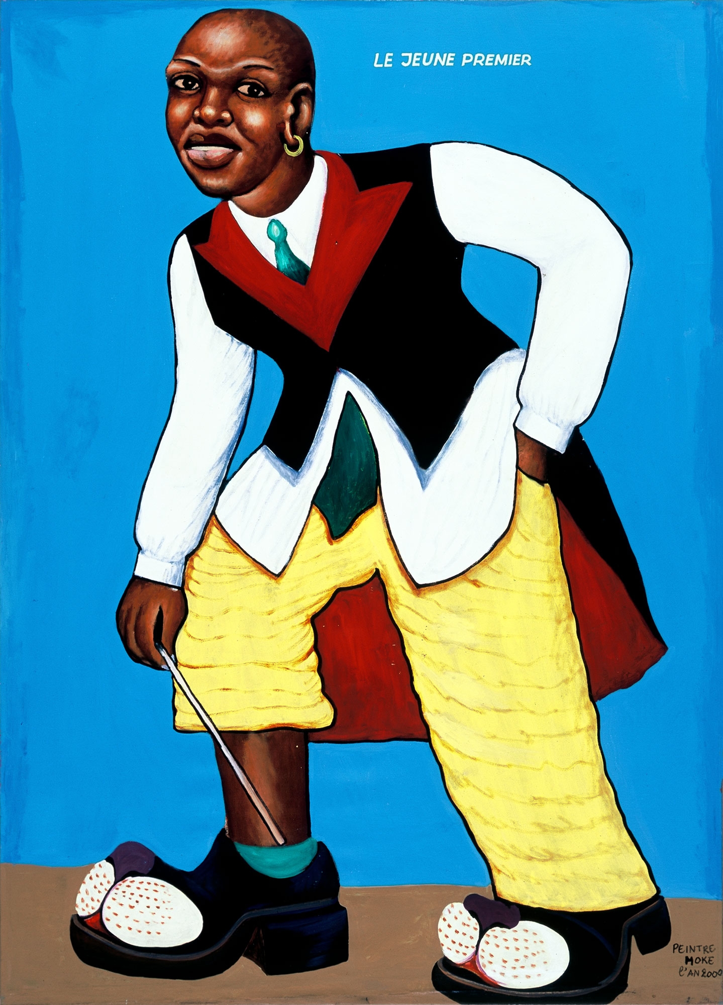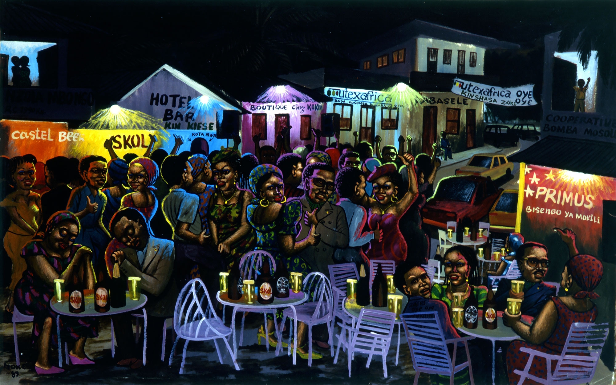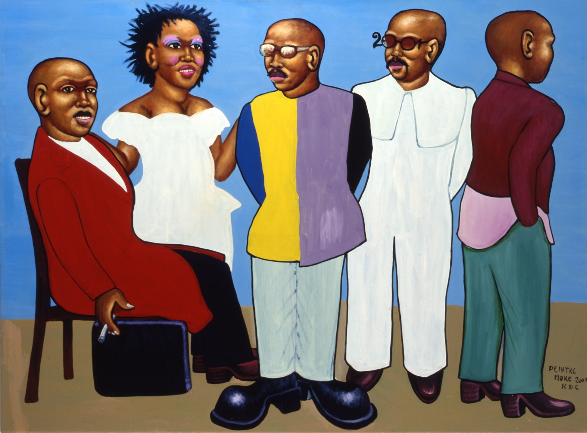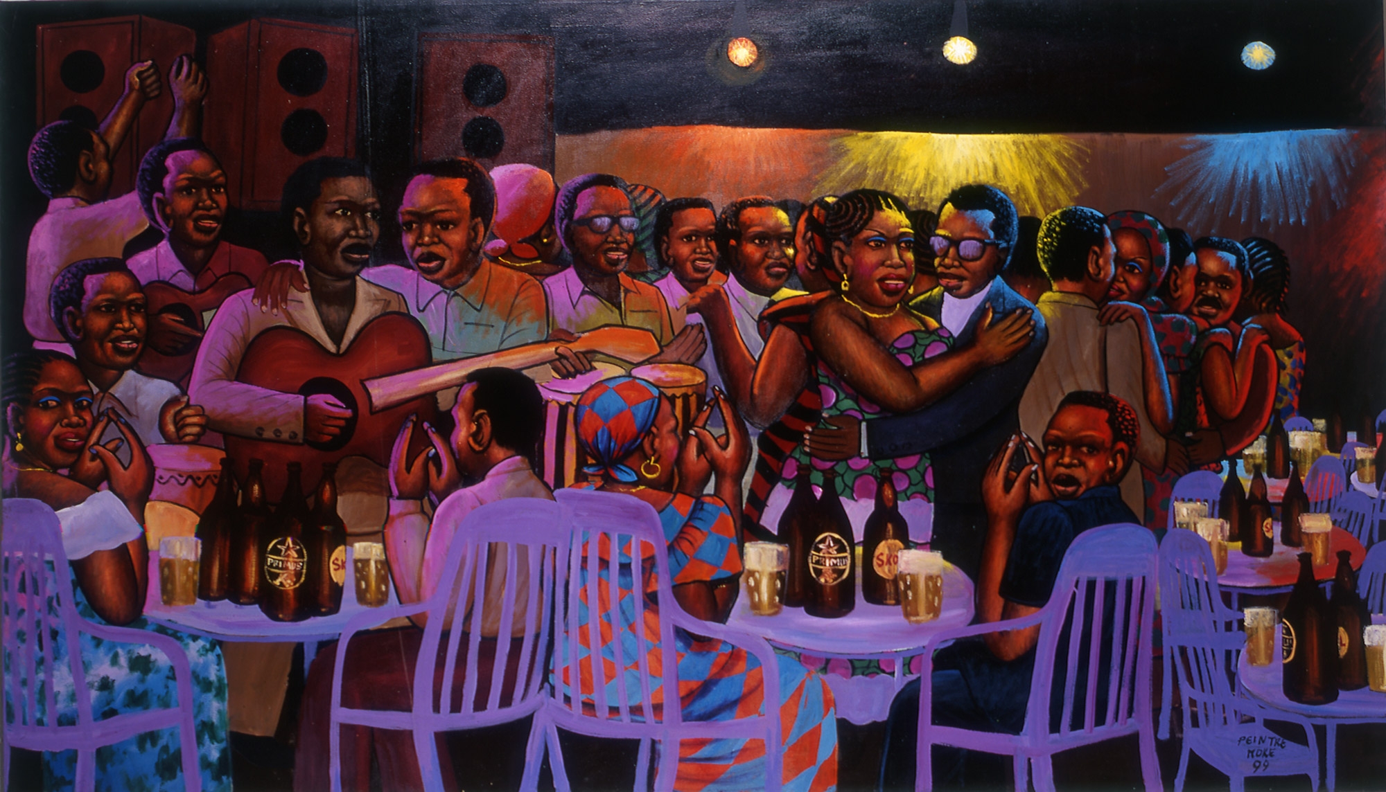 Moke adopted the conventions of commercial art, boldly outlining his robust figures without concern for likeness or perspective. Instead, he celebrated the painterly aspects of his art, using a rich palette and vividly animated compositions. Unlike Chéri Samba or Cheik Ledy, who were to follow in his footsteps, Moke rarely depicted social conflict. Rather, his sympathetic and vivaciously humorous paintings were grounded in his observation of daily life in Kinshasa: street scenes, bars, the local dandies known as sapeurs, the powerful Miziki (associations of financially independent women), all-night parties, neighborhood disputes, and public ceremonies all found their way into his canvases.