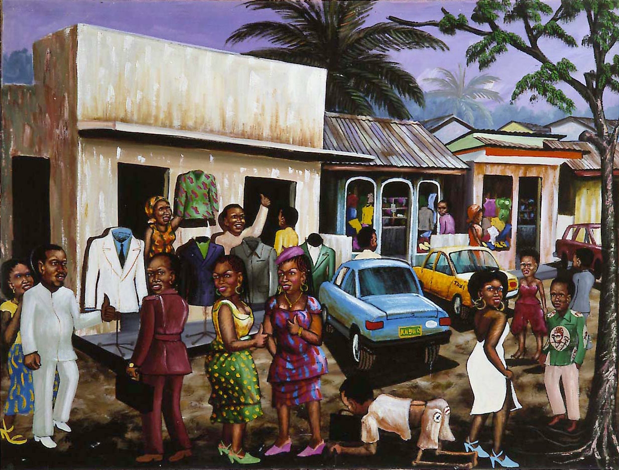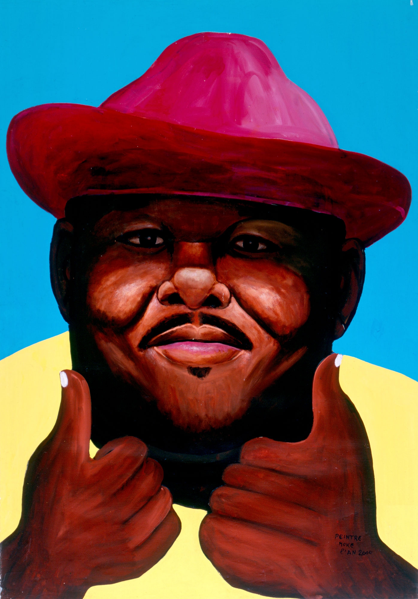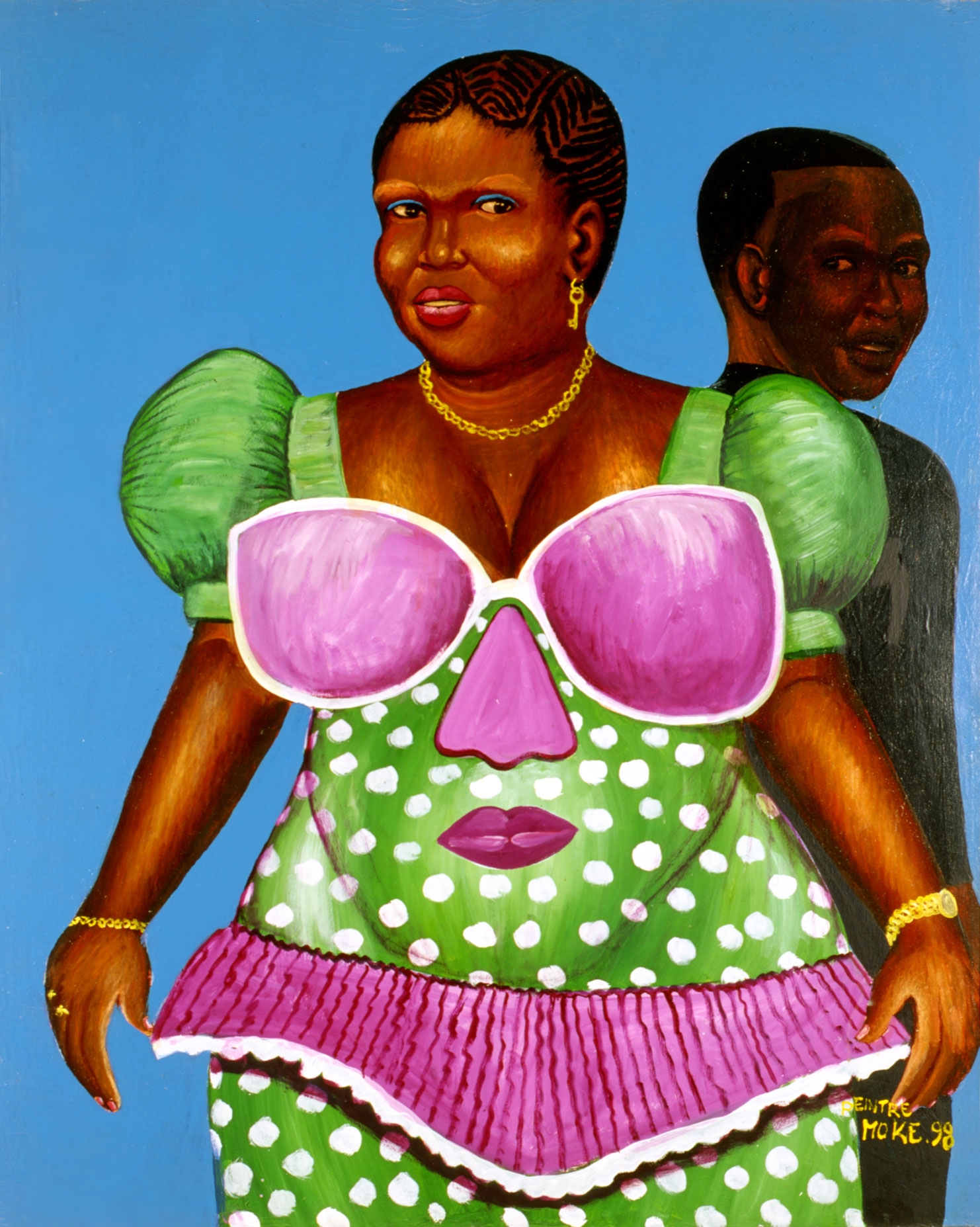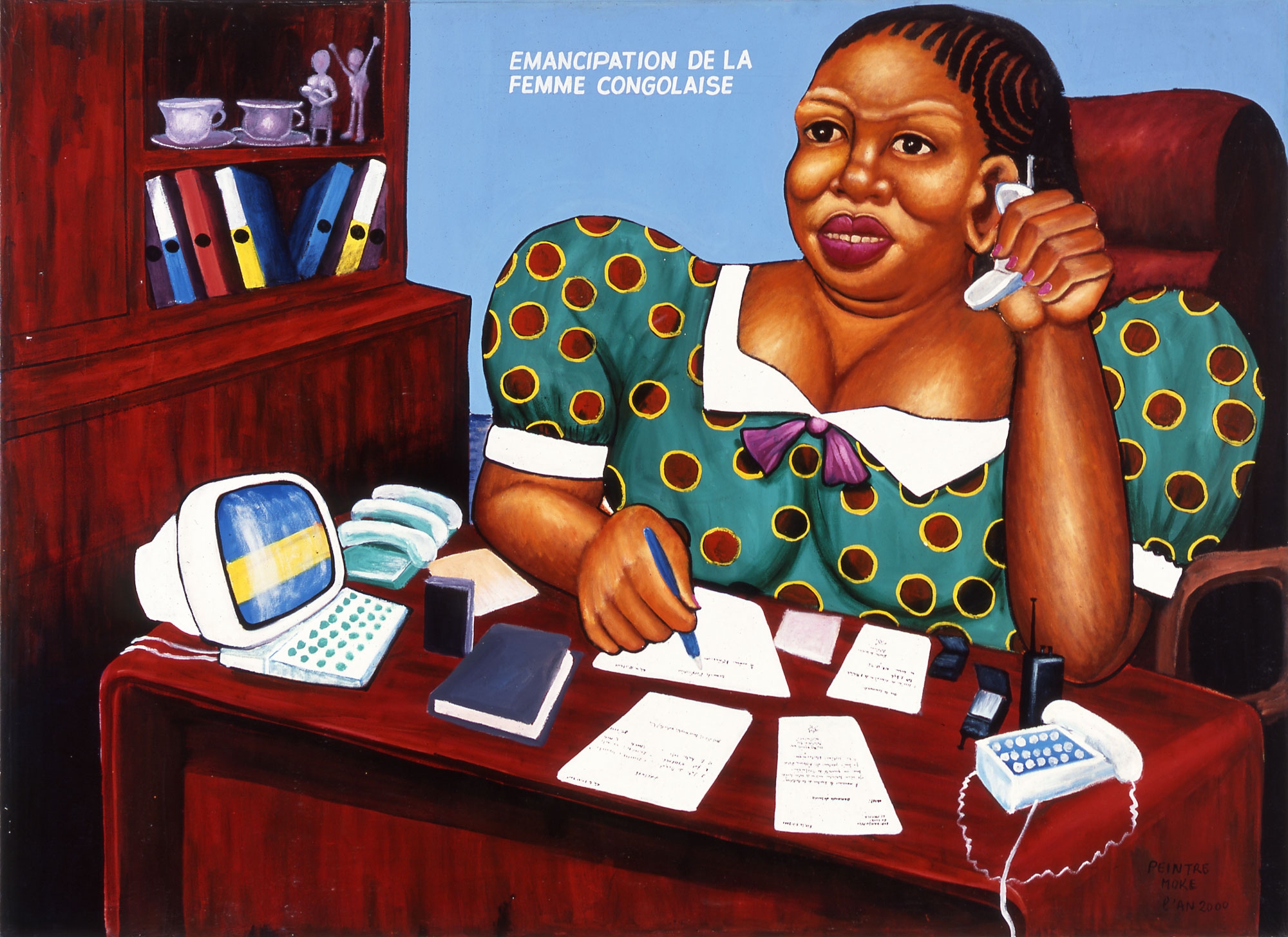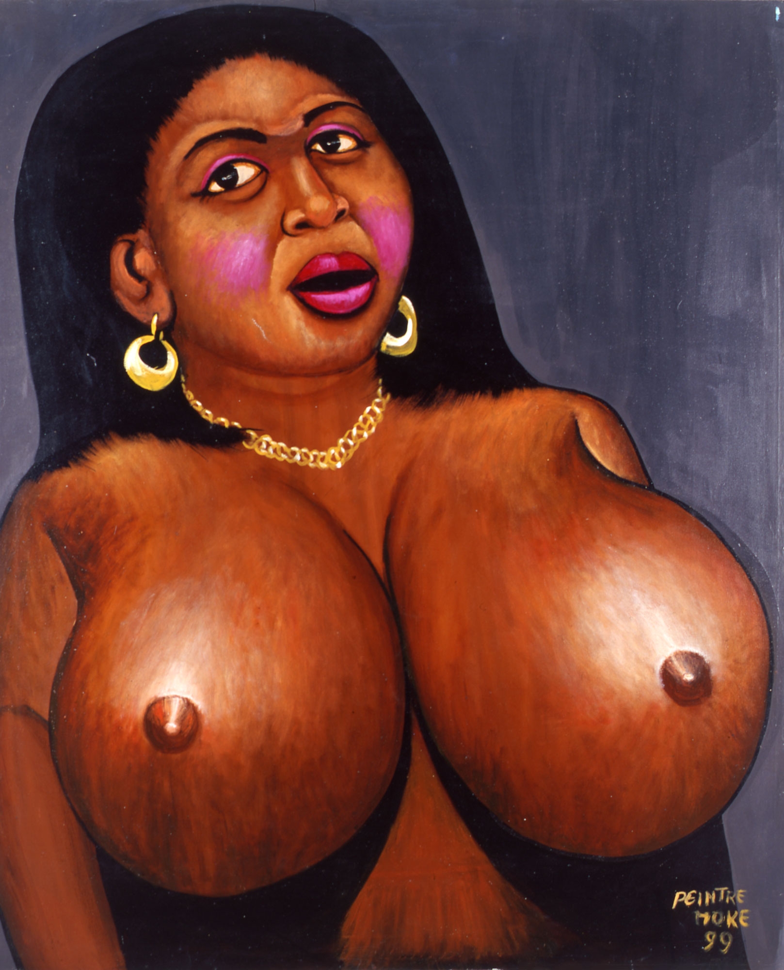 Moke adopted the conventions of commercial art, boldly outlining his robust figures without concern for likeness or perspective. Instead, he celebrated the painterly aspects of his art, using a rich palette and vividly animated compositions. Unlike Chéri Samba or Cheik Ledy, who were to follow in his footsteps, Moke rarely depicted social conflict. Rather, his sympathetic and vivaciously humorous paintings were grounded in his observation of daily life in Kinshasa: street scenes, bars, the local dandies known as sapeurs, the powerful Miziki (associations of financially independent women), all-night parties, neighborhood disputes, and public ceremonies all found their way into his canvases.