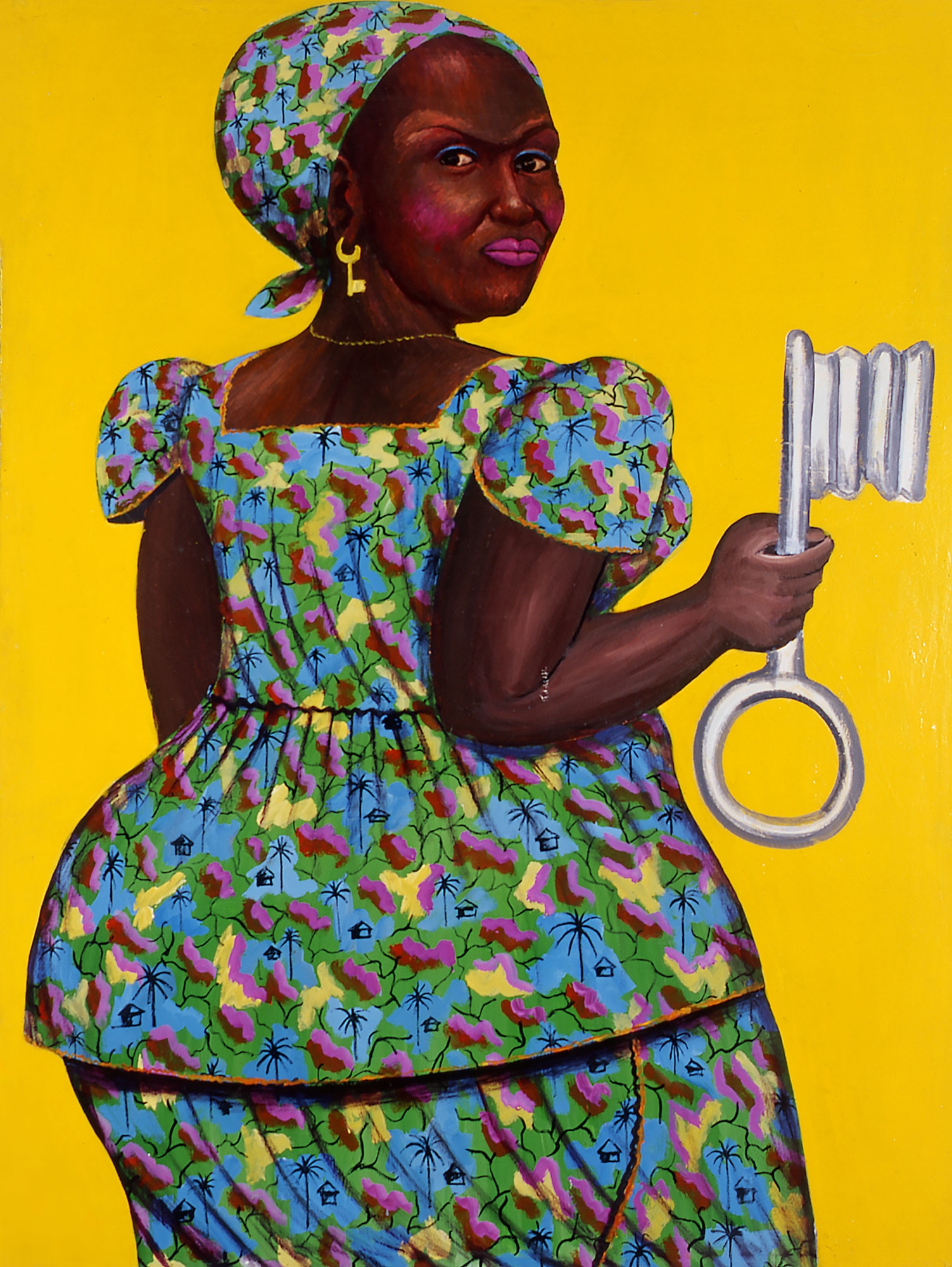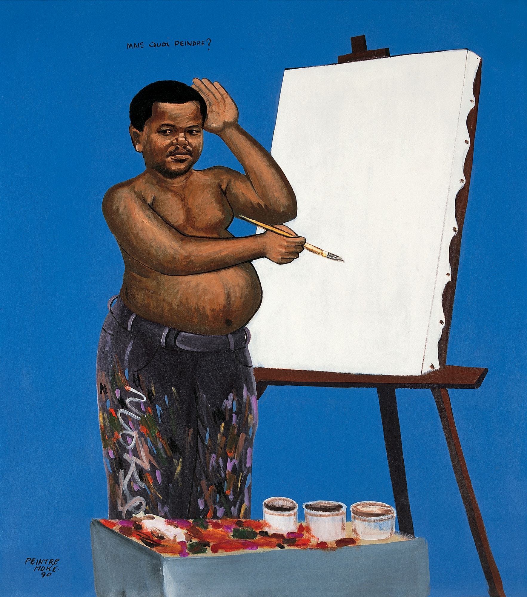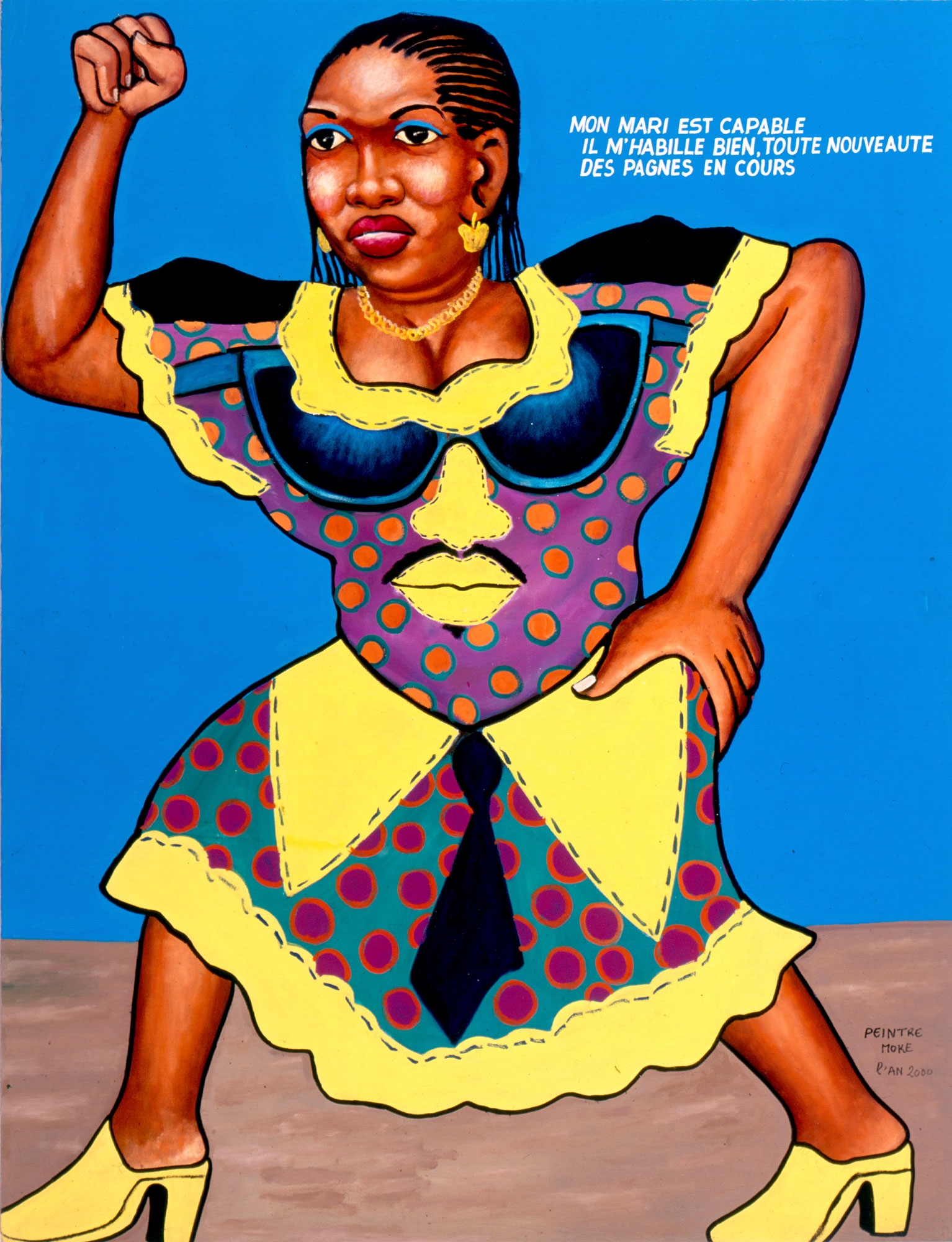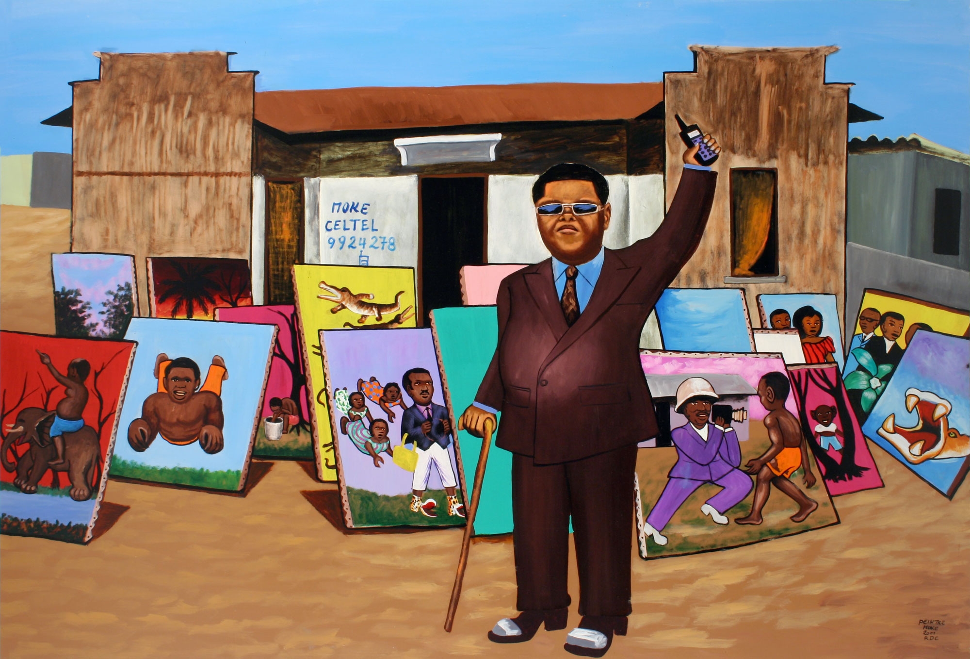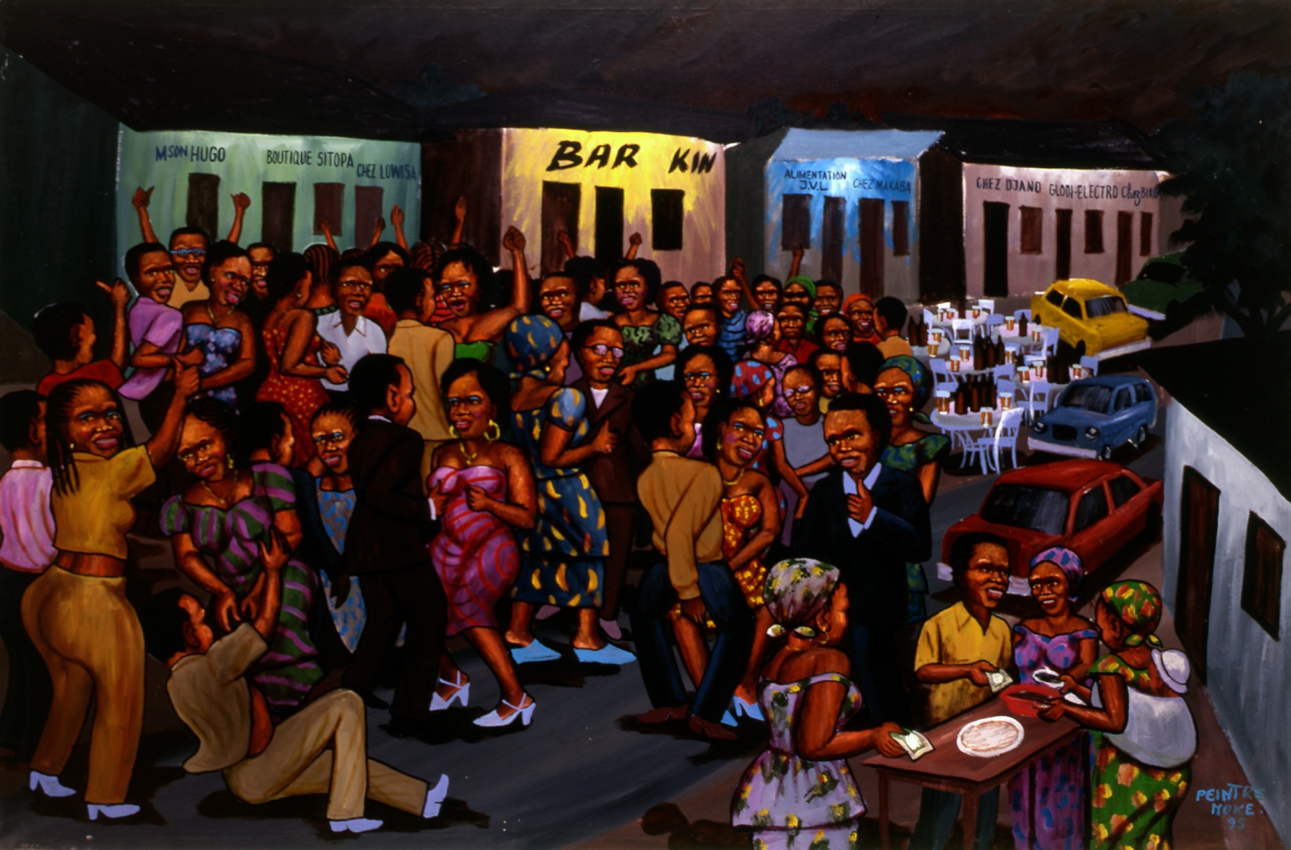 Moke adopted the conventions of commercial art, boldly outlining his robust figures without concern for likeness or perspective. Instead, he celebrated the painterly aspects of his art, using a rich palette and vividly animated compositions. Unlike Chéri Samba or Cheik Ledy, who were to follow in his footsteps, Moke rarely depicted social conflict. Rather, his sympathetic and vivaciously humorous paintings were grounded in his observation of daily life in Kinshasa: street scenes, bars, the local dandies known as sapeurs, the powerful Miziki (associations of financially independent women), all-night parties, neighborhood disputes, and public ceremonies all found their way into his canvases.