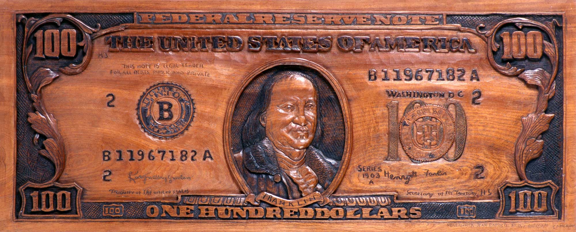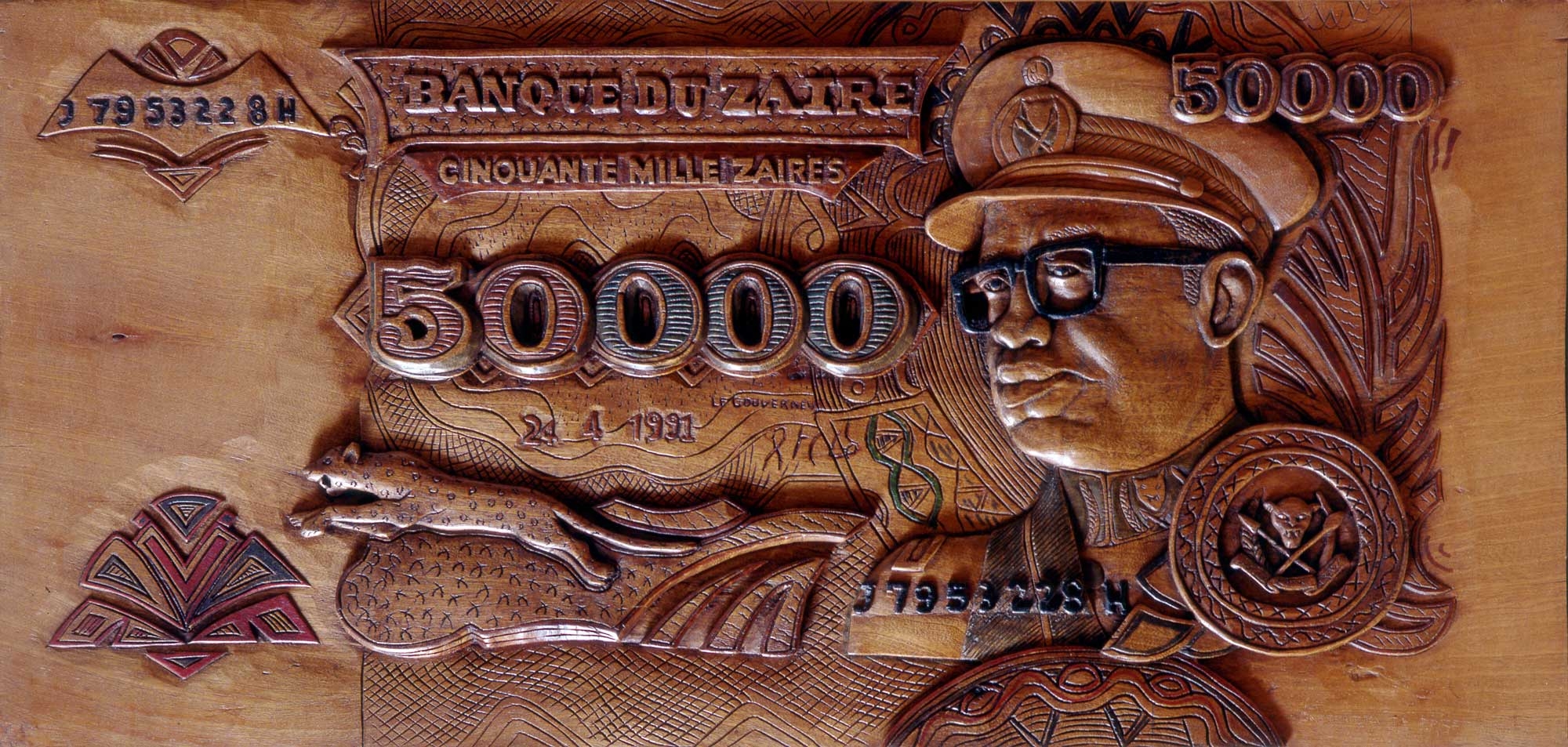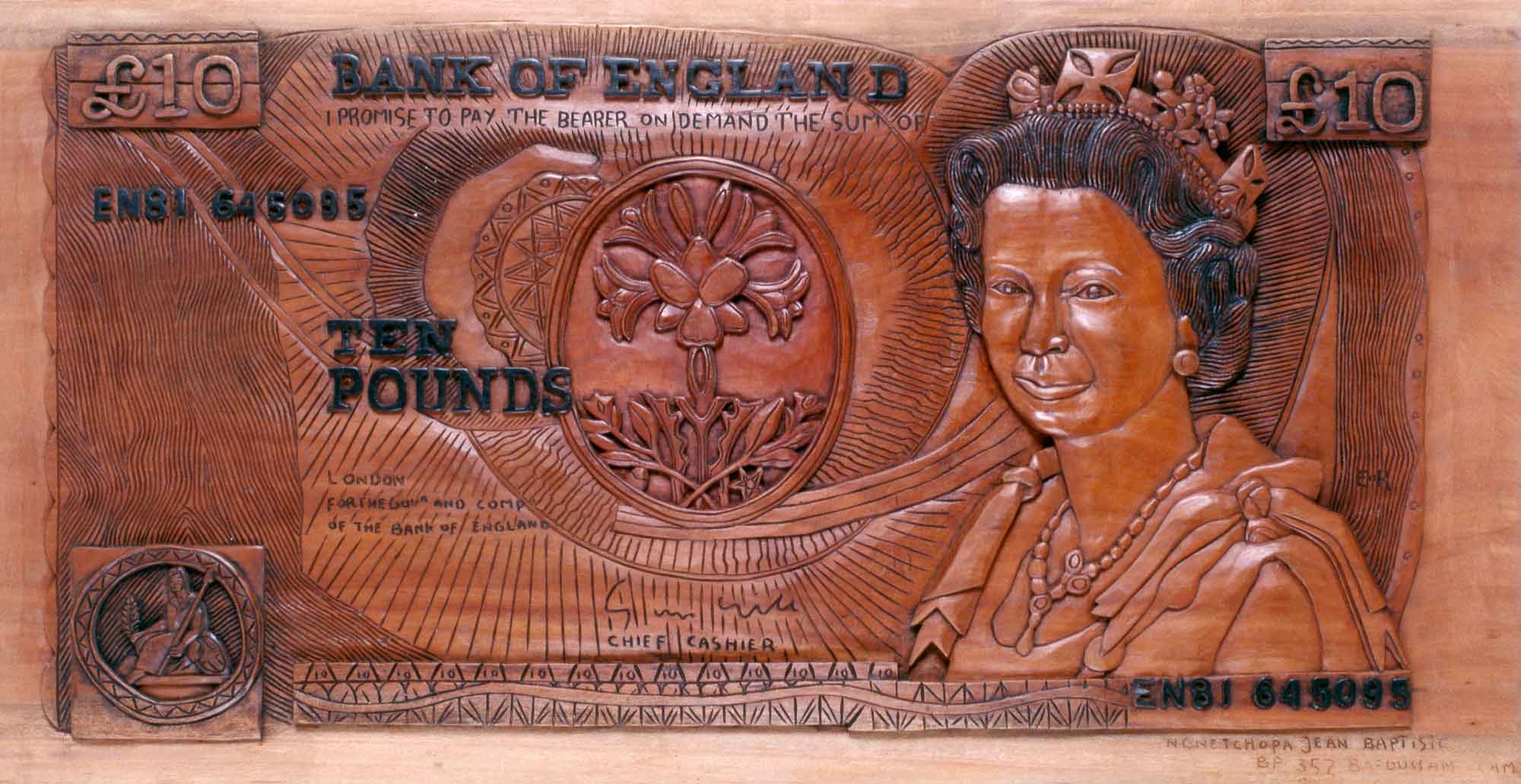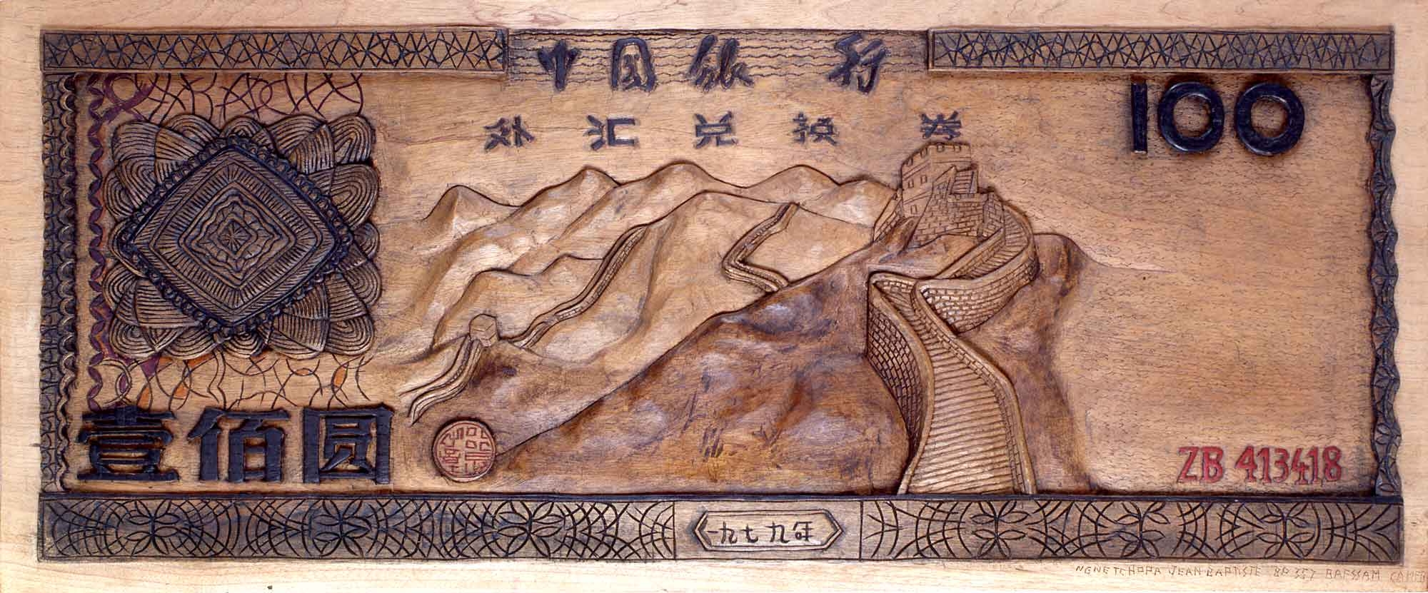 J.B Ngnetchopa belonged to a family of traditional wood-carvers. His grandfather, Mube Massagoung, was quite famous. At 16, Jean-Baptiste began his wood-carving apprenticeship. It lasted seven years. Besides learning the technique of wood-carving, Jean-Baptiste learned and absorbed the themes that made up the cultural identity of his ethnic group the Bamilekes, an essentially agricultural people who are organized in chieftaincies. Ngnetchopa's early works clearly reveal this influence, the themes evoke either village life with its pageants (initiation, funeral ceremonies, dances), or religious life. Jean-Baptiste was very devout and occasionally practiced traditional medicine based on plants and "mystical water". His sculptures are large panels of iroko or mahogany with in-the-round (relief) carvings. His first departure from traditional themes were his portraits of Cameroonian or foreign dignitaries. He carved in-the-round portraits of Mitterand, Queen Elisabeth II and Mao Tse Toung. But his radical break with Bamileke figures took place in 1985. From then on, he undertook a series of wood-carvings representing giant banknotes. The first was a one dollar bill.
