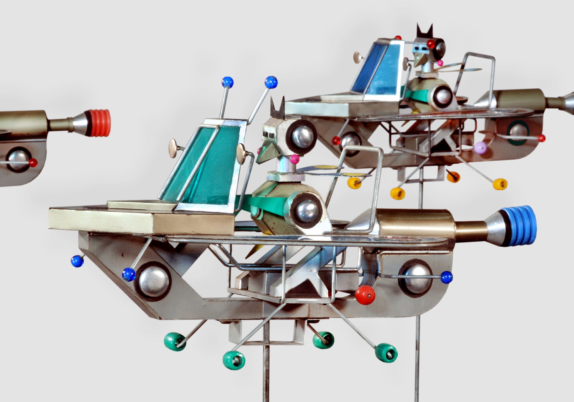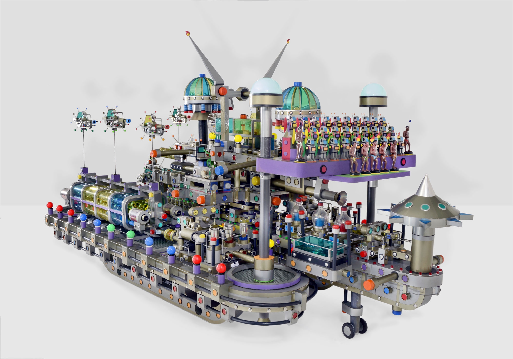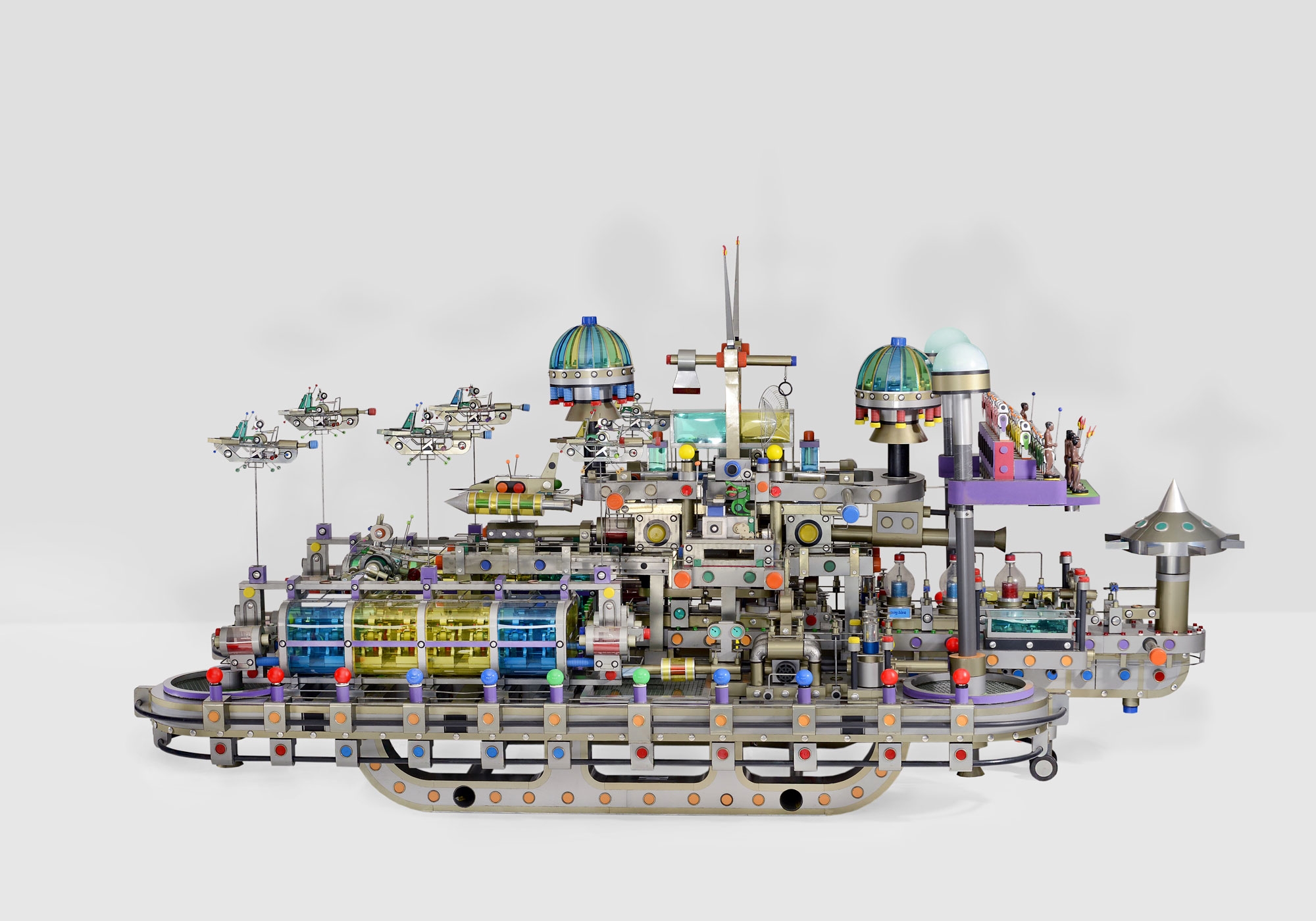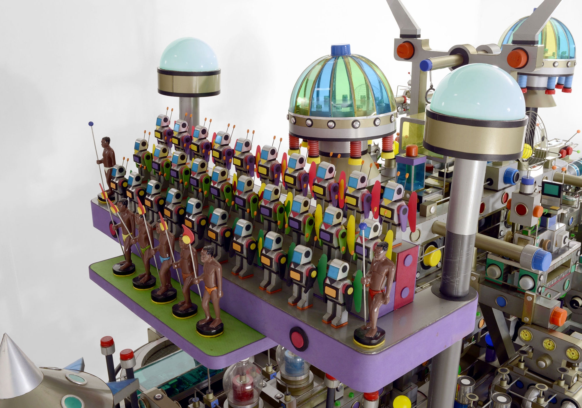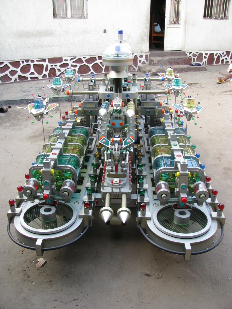 Nimi has acknowledged that cartoons and science-fiction movies were an early inspiration, and since the year 2000 he has produced a remarkable series of intricate space ships and robot factories. Each work requires careful planning; Nimi calculates and sketches every step of the machine’s construction in advance. He employs recycled materials—industrial detritus, plastic, sheet metal, aluminum, electric components—that he finds in Kinshasa. Cutting, transforming, and molding with his own hands, Nimi employs only five tools: a pair of scissors, a customized knife, universal pliers, bent-nosed pliers, and a ruler. General conception, method, and technical precision are constants in the execution of these monumental works which take more than fifteen months to complete. For Nimi, movement, sound and light are an integral part of the work; the mechanism must be simple, robust, and perform like clockwork.
