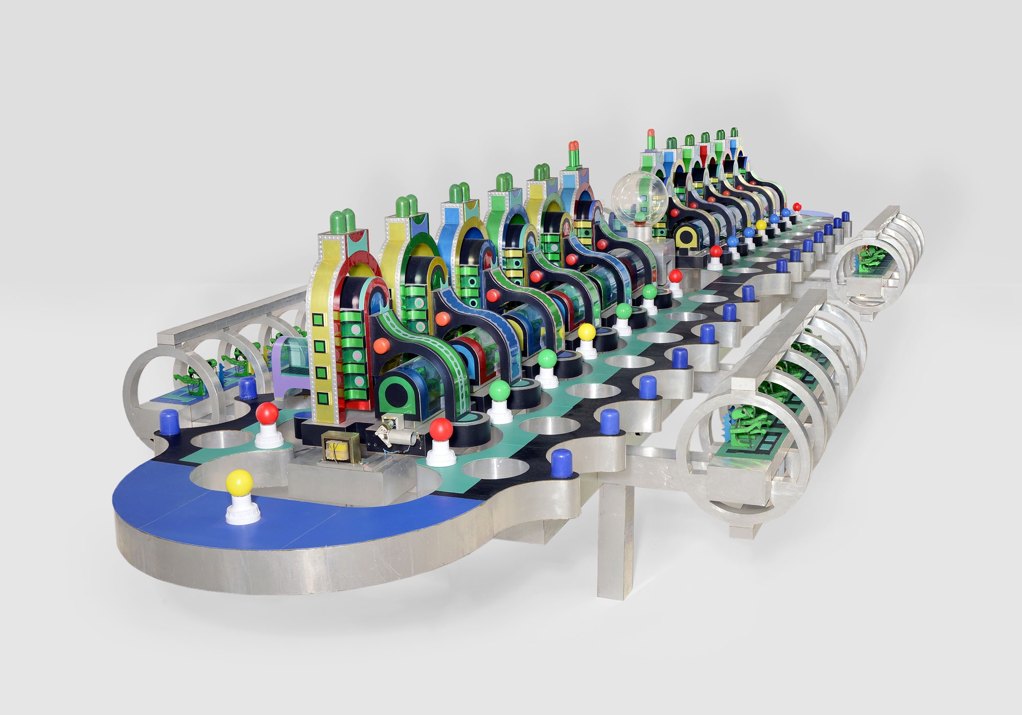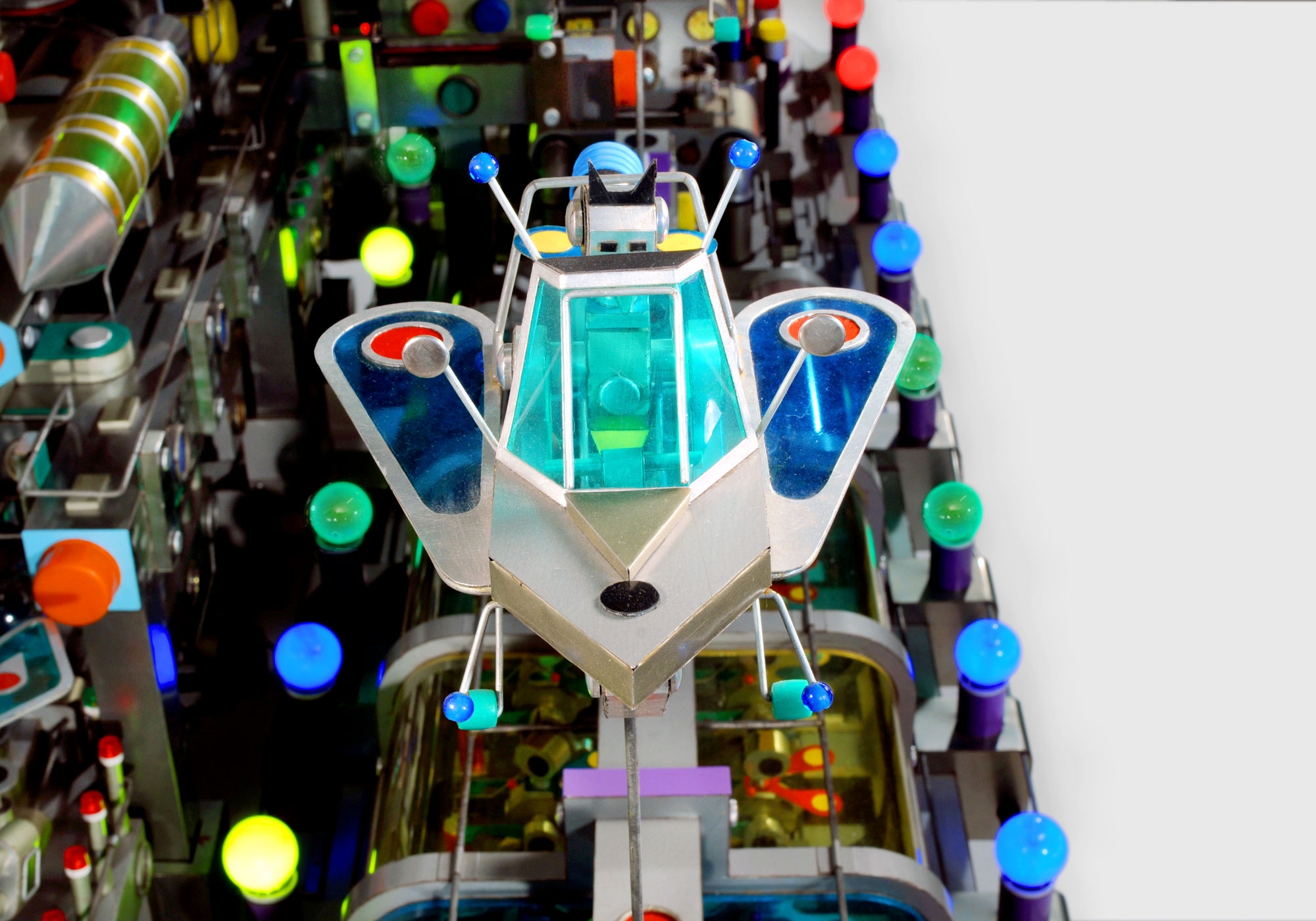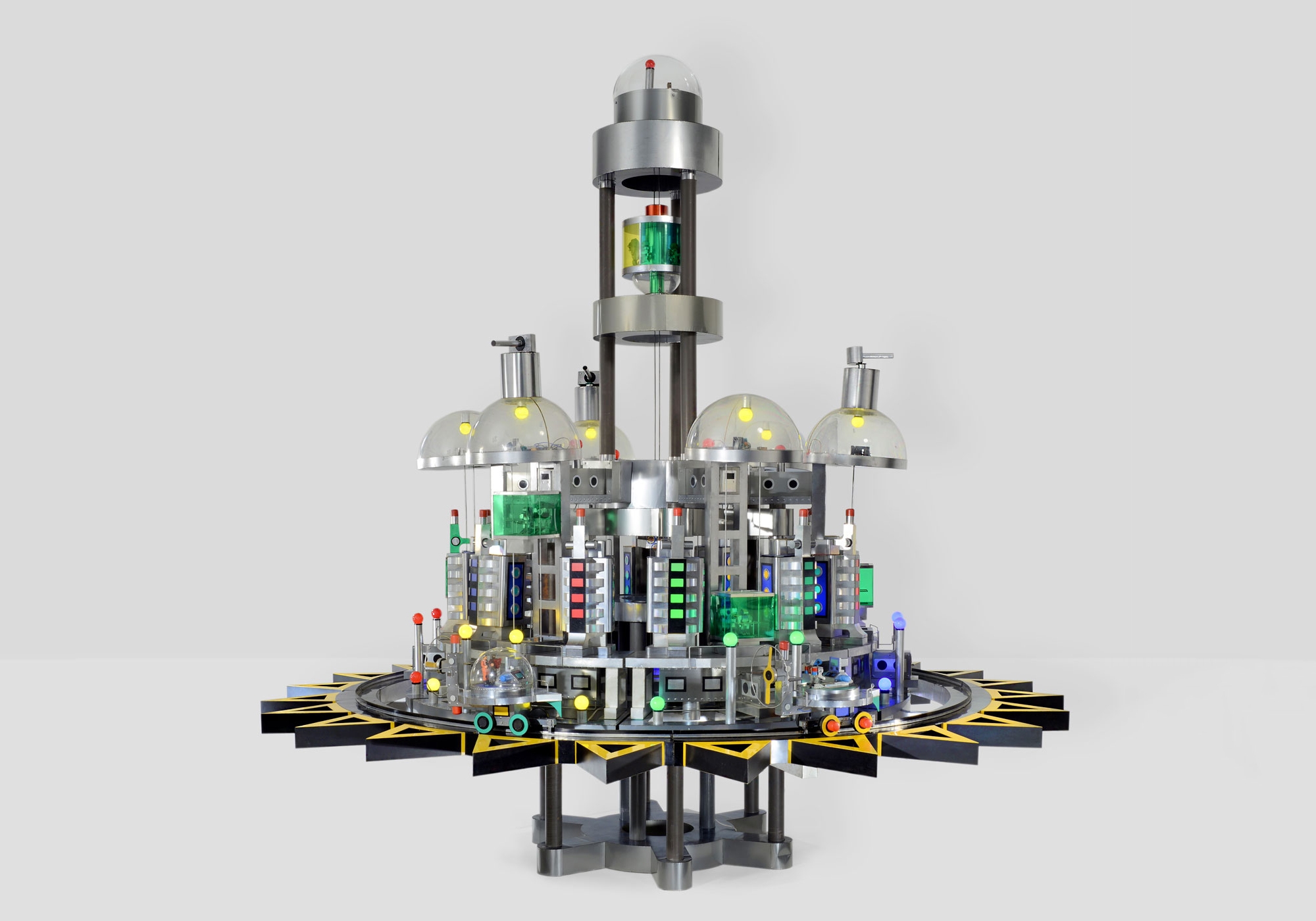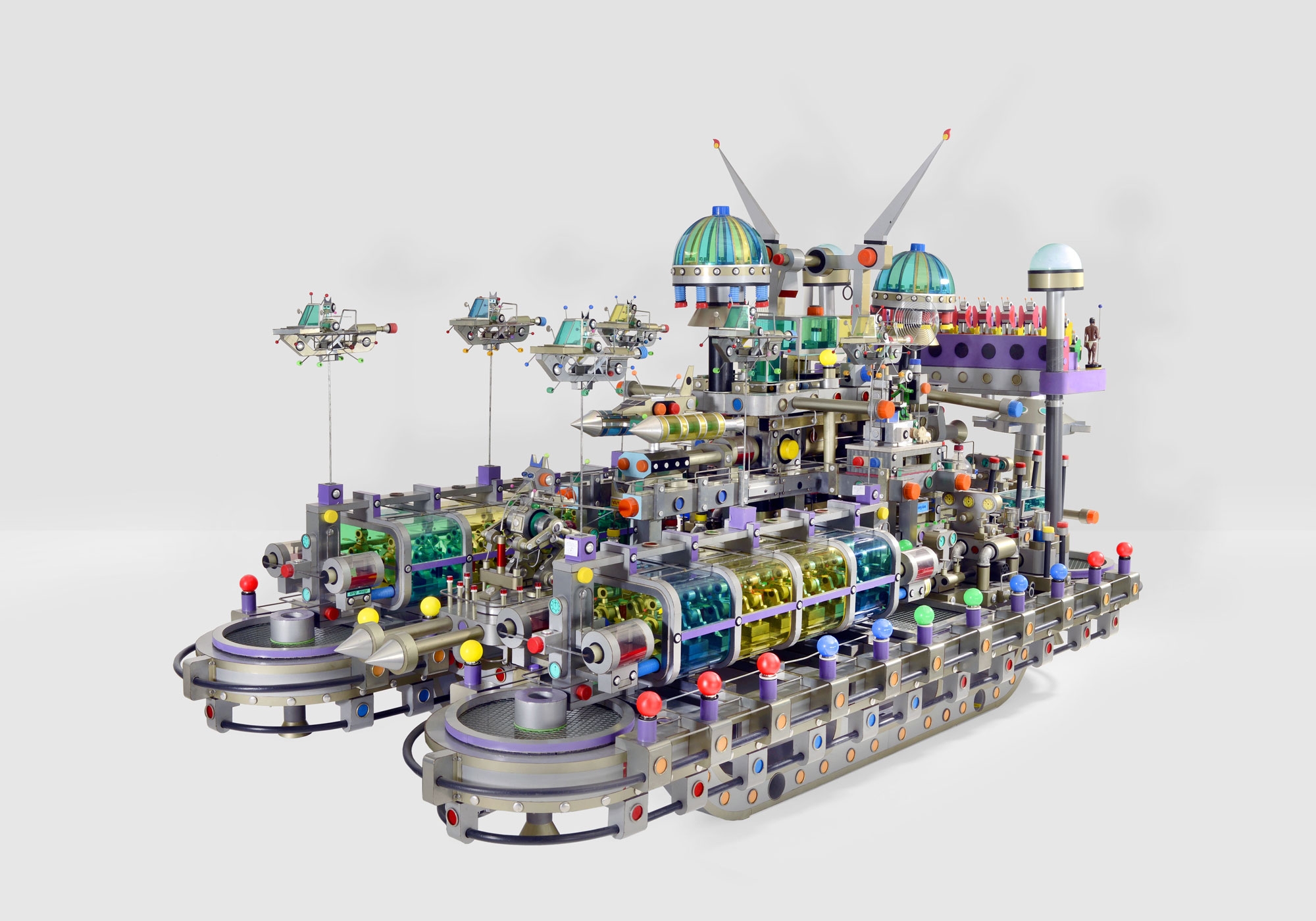 Nimi has acknowledged that cartoons and science-fiction movies were an early inspiration, and since the year 2000 he has produced a remarkable series of intricate space ships and robot factories. Each work requires careful planning; Nimi calculates and sketches every step of the machine’s construction in advance. He employs recycled materials—industrial detritus, plastic, sheet metal, aluminum, electric components—that he finds in Kinshasa. Cutting, transforming, and molding with his own hands, Nimi employs only five tools: a pair of scissors, a customized knife, universal pliers, bent-nosed pliers, and a ruler. General conception, method, and technical precision are constants in the execution of these monumental works which take more than fifteen months to complete. For Nimi, movement, sound and light are an integral part of the work; the mechanism must be simple, robust, and perform like clockwork.