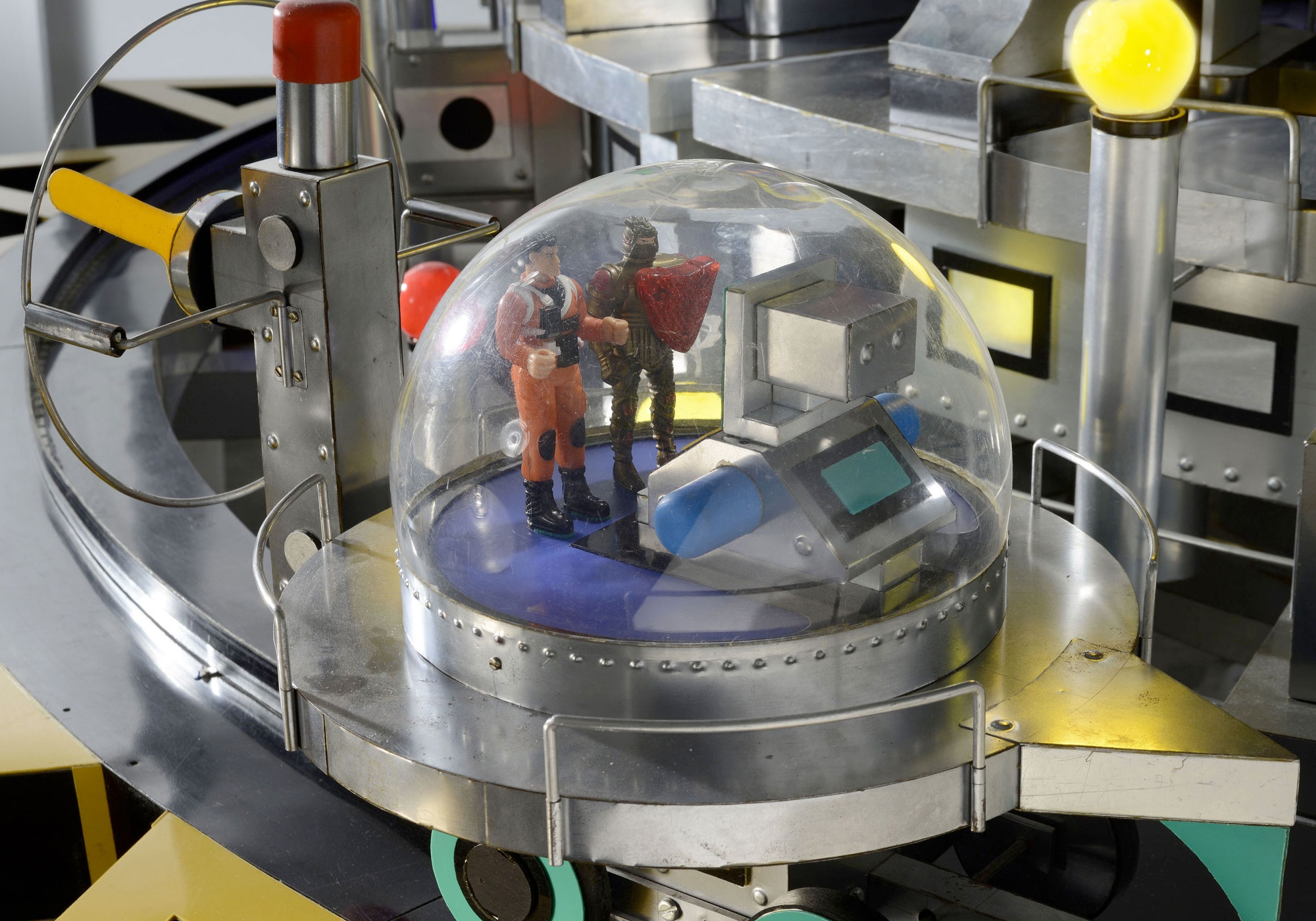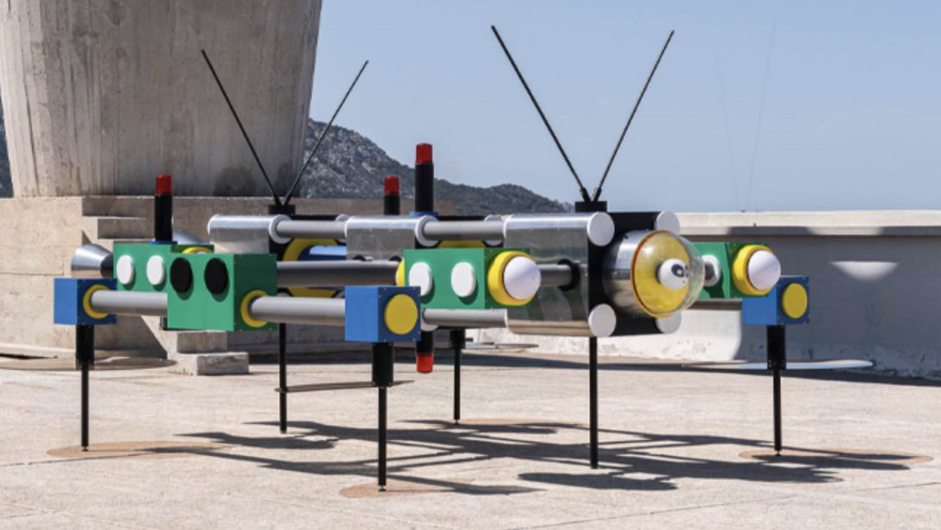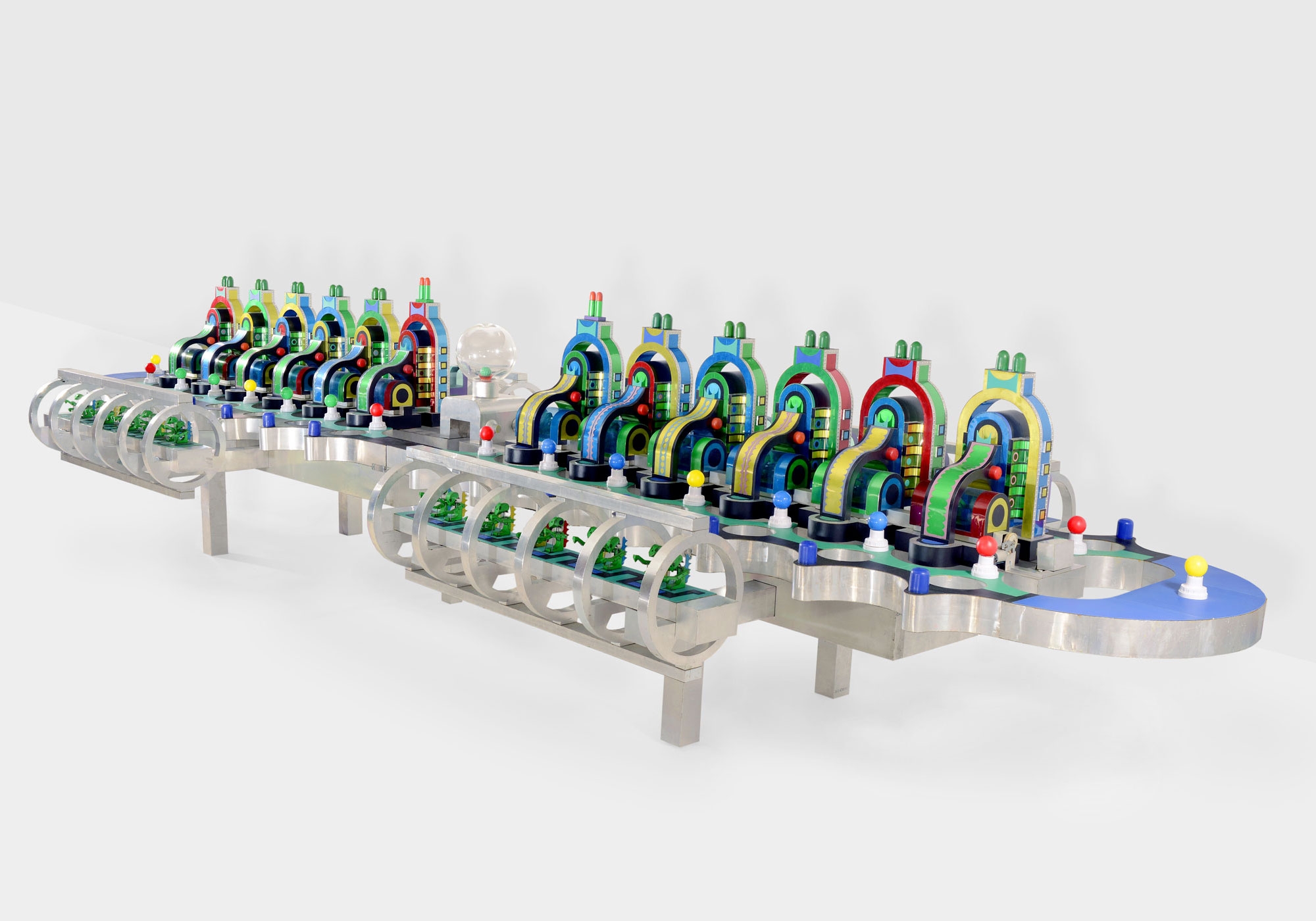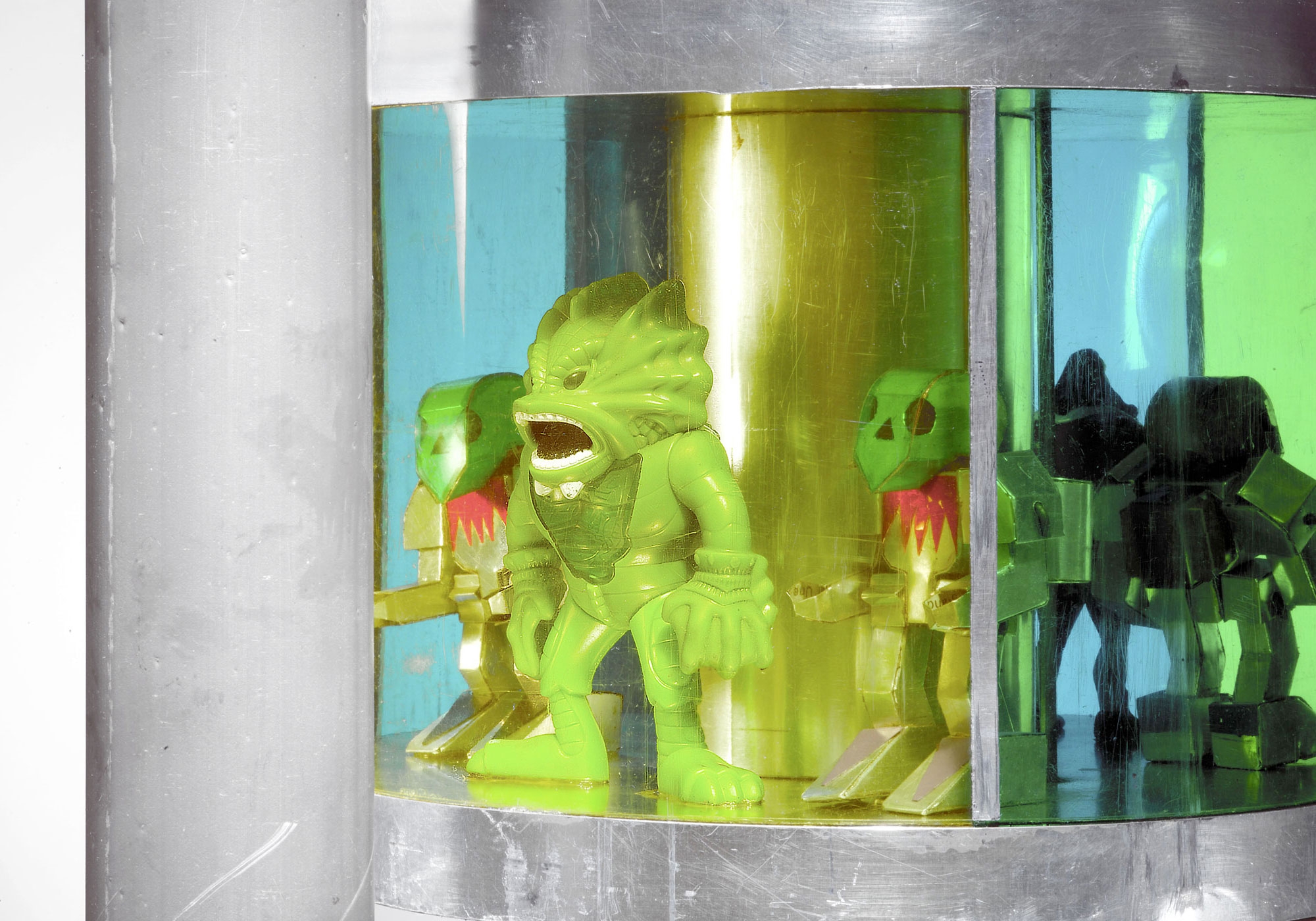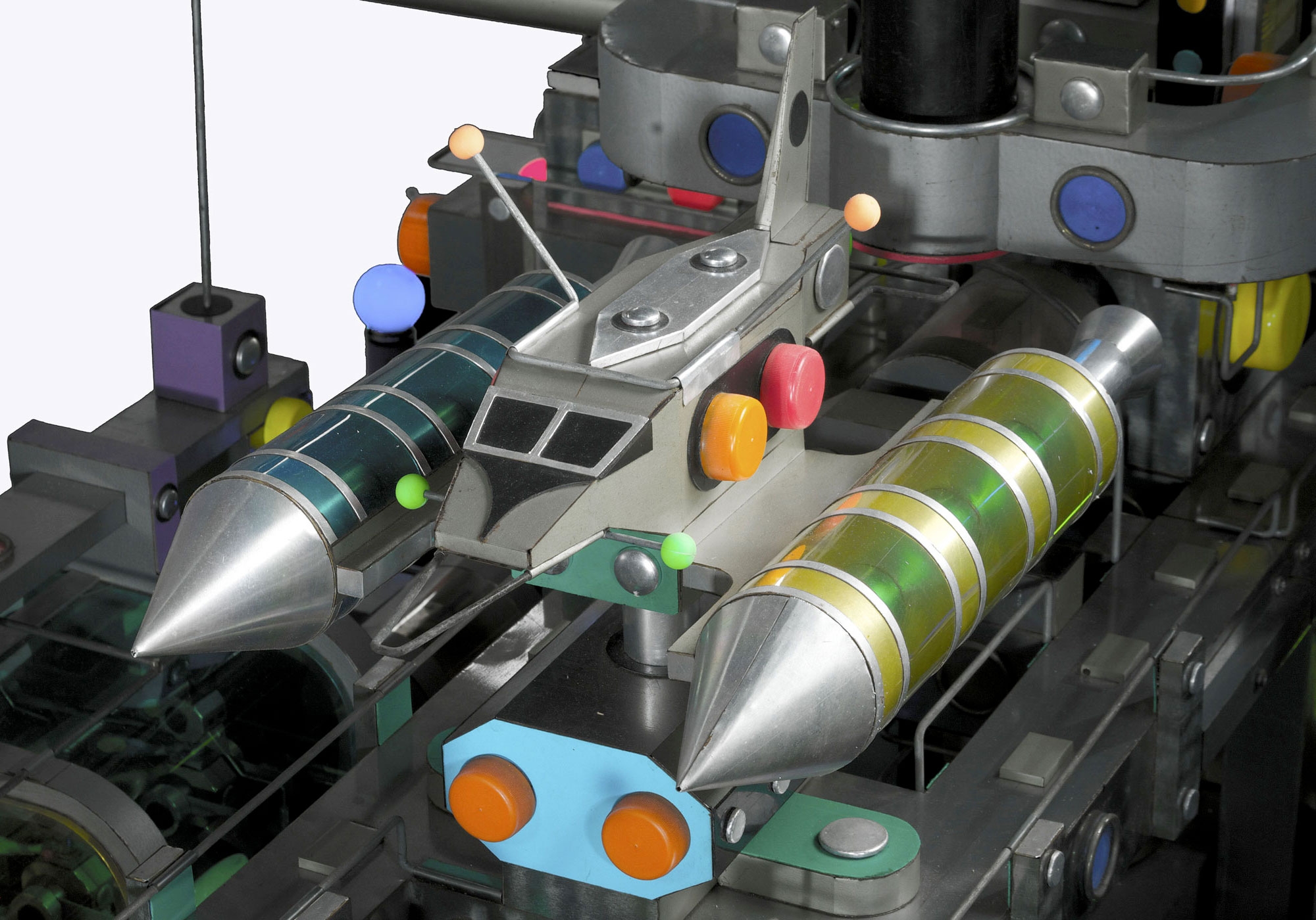 Nimi has acknowledged that cartoons and science-fiction movies were an early inspiration, and since the year 2000 he has produced a remarkable series of intricate space ships and robot factories. Each work requires careful planning; Nimi calculates and sketches every step of the machine’s construction in advance. He employs recycled materials—industrial detritus, plastic, sheet metal, aluminum, electric components—that he finds in Kinshasa. Cutting, transforming, and molding with his own hands, Nimi employs only five tools: a pair of scissors, a customized knife, universal pliers, bent-nosed pliers, and a ruler. General conception, method, and technical precision are constants in the execution of these monumental works which take more than fifteen months to complete. For Nimi, movement, sound and light are an integral part of the work; the mechanism must be simple, robust, and perform like clockwork.