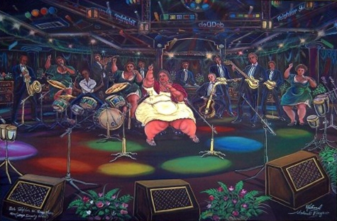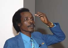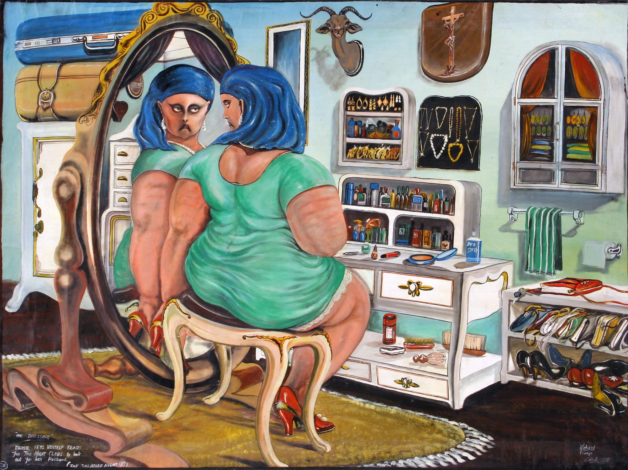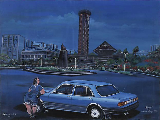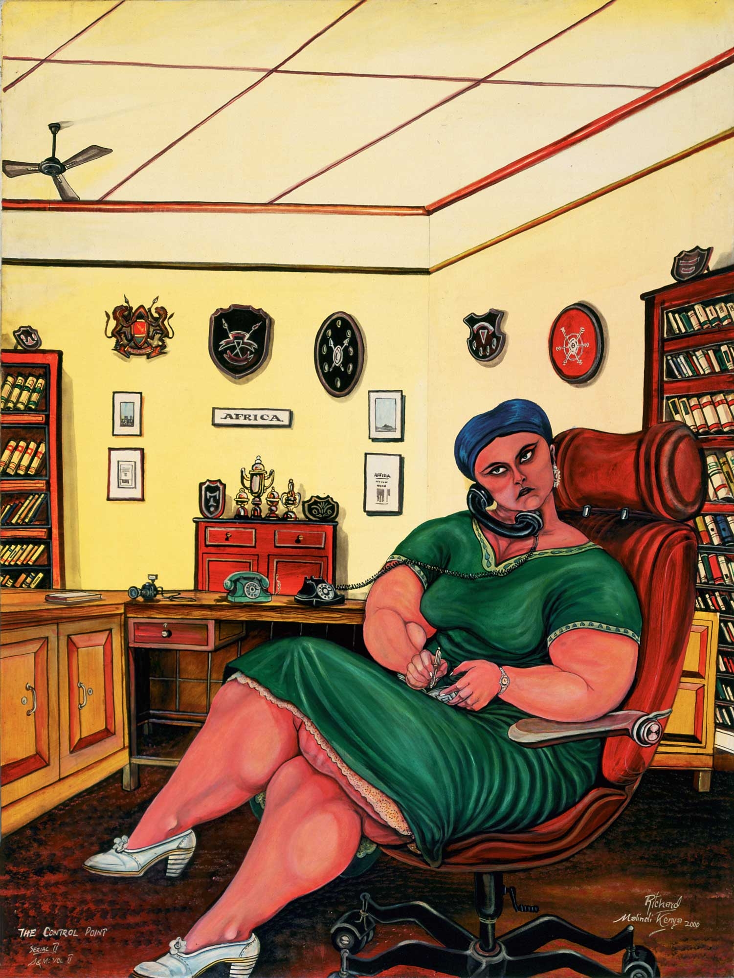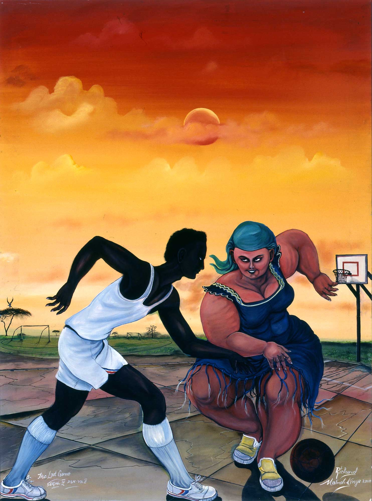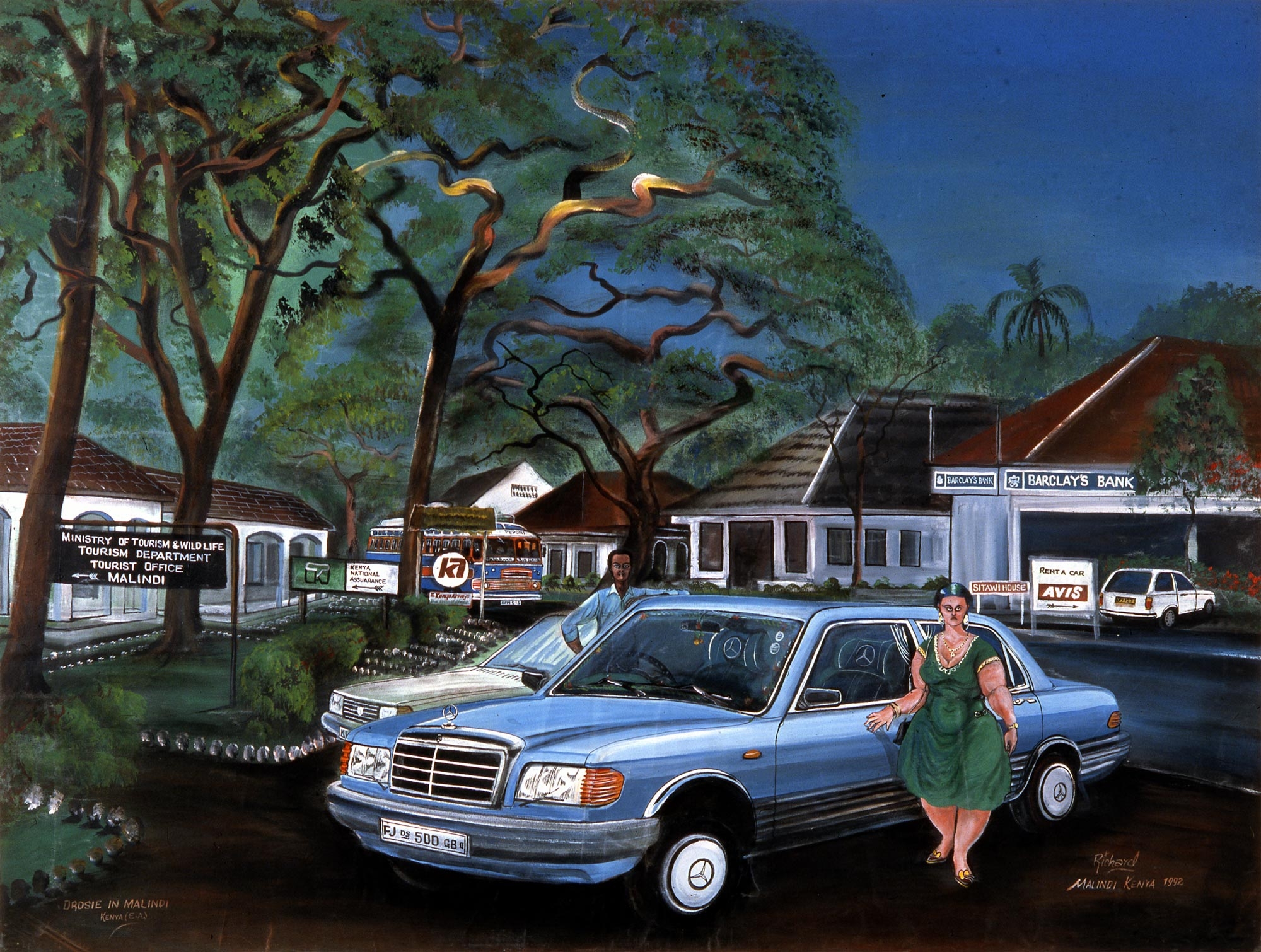 These elements are still present in Onyango’s paintings today. He frequently chooses to depict situations that waver between the exaltation of imported technology and its fragility. Accidents, warnings, calls for prudence reveal a world constantly threatened by disaster and the unforeseeable. Like many contemporary African artists, Onyango’s pictorial language is characterized by its great legibility. Rather than evidence of primitivism, this legibility demonstrates the importance Onyango accords to representation as a means of direct communication. The unreal theatricality of his work similarly engages the spectator: the distortion of perspective and form and the moody tonality of the heightened palette dramatize the painting’s relationship with the spectator, who in turn becomes a helpless or complicit participant in the events described.