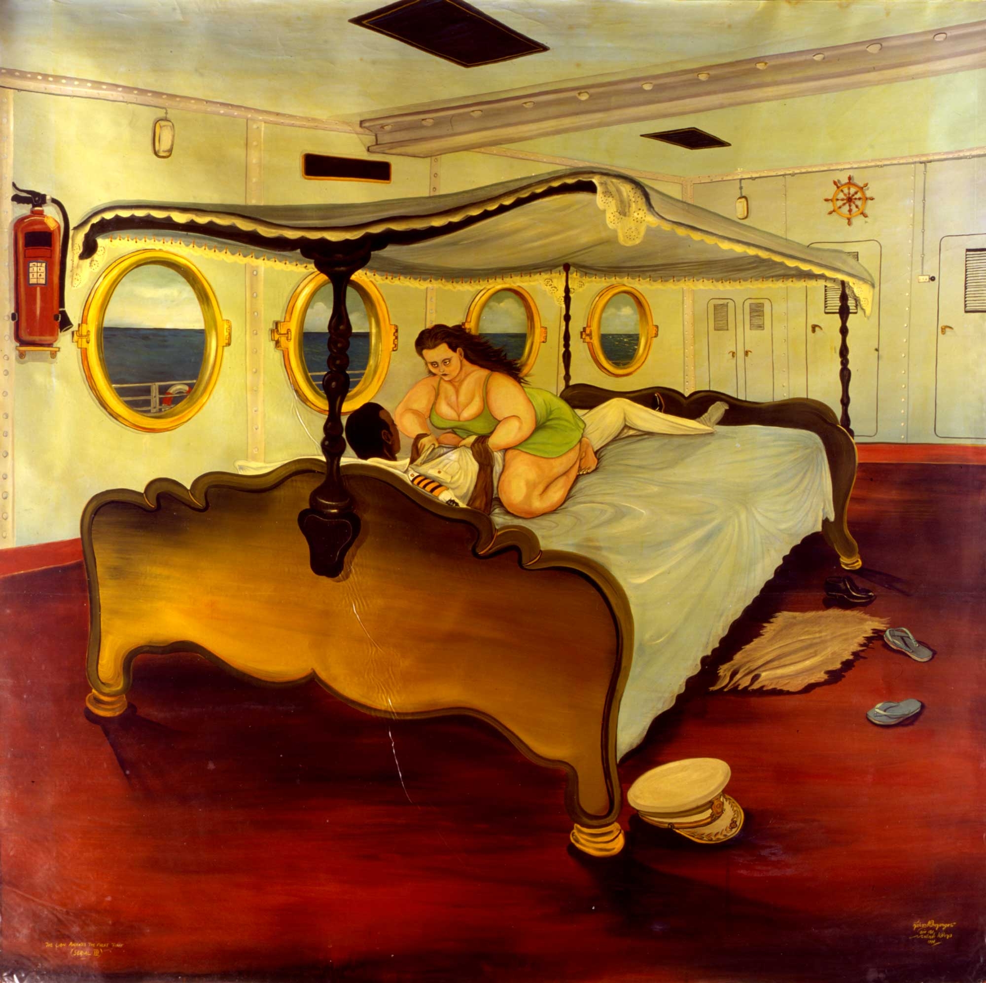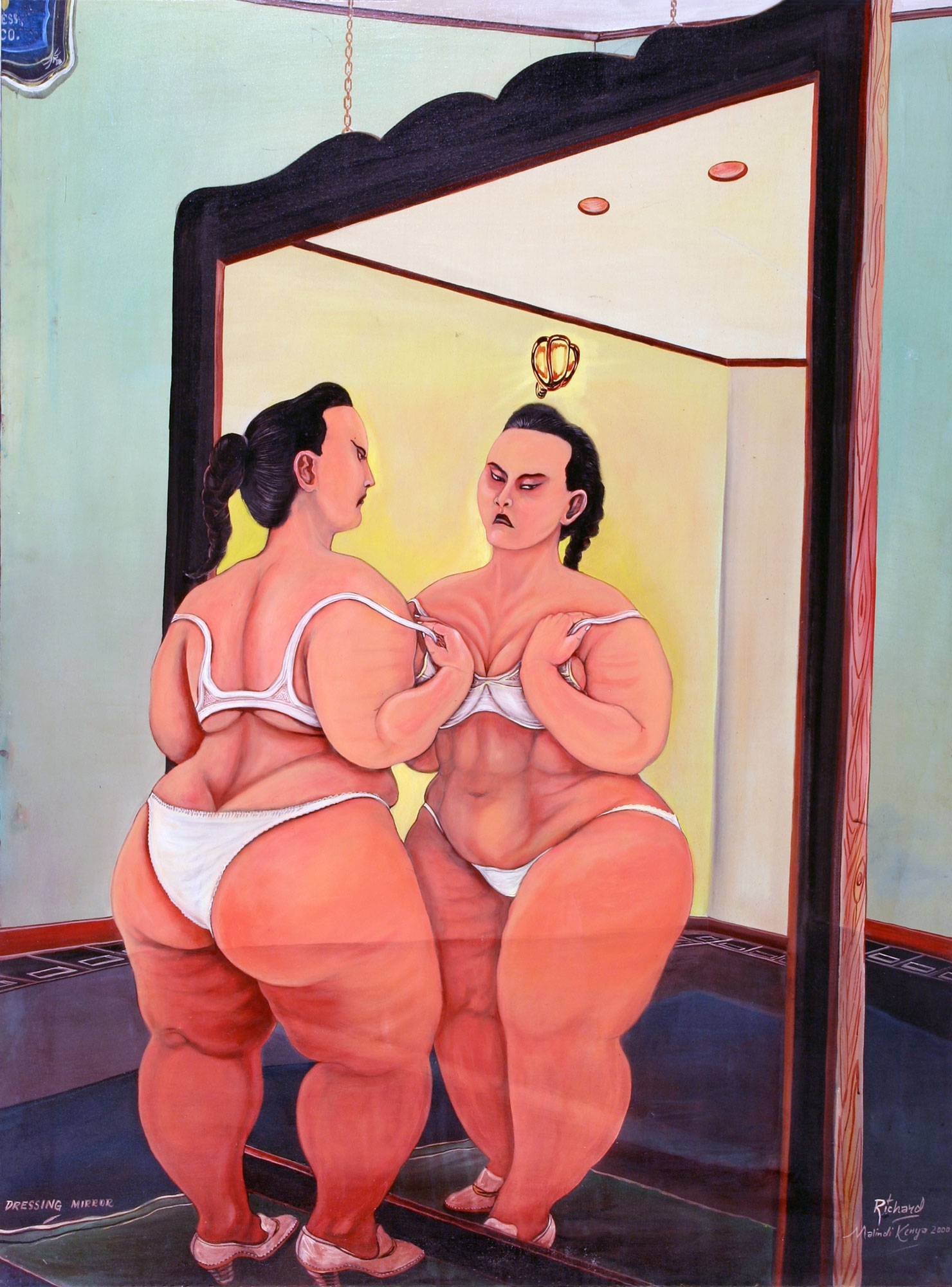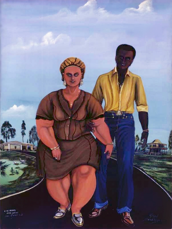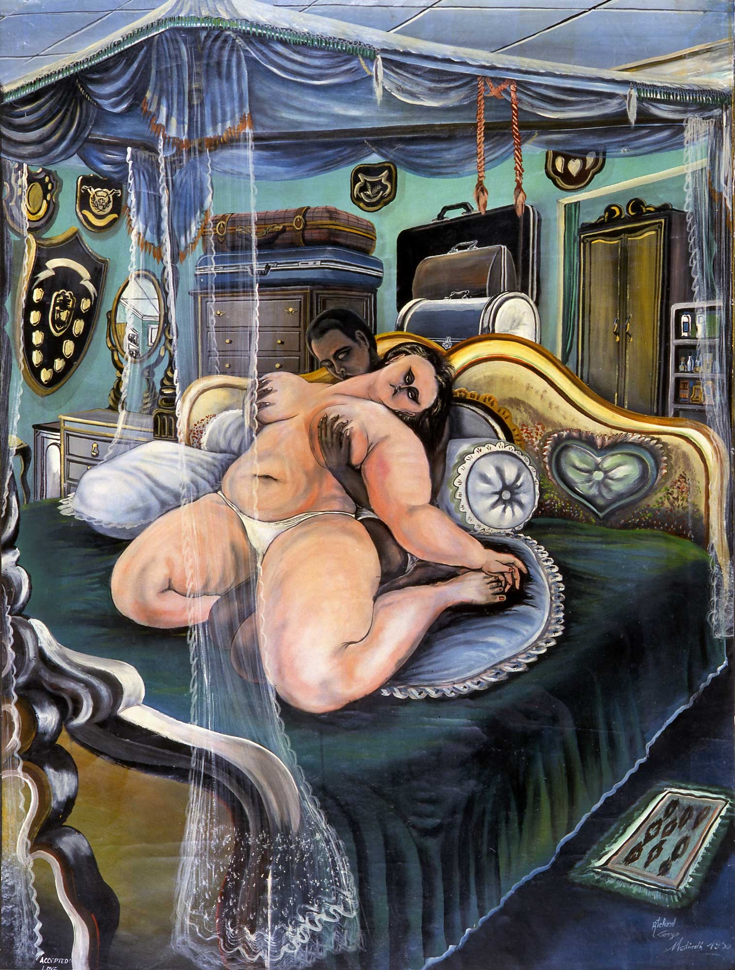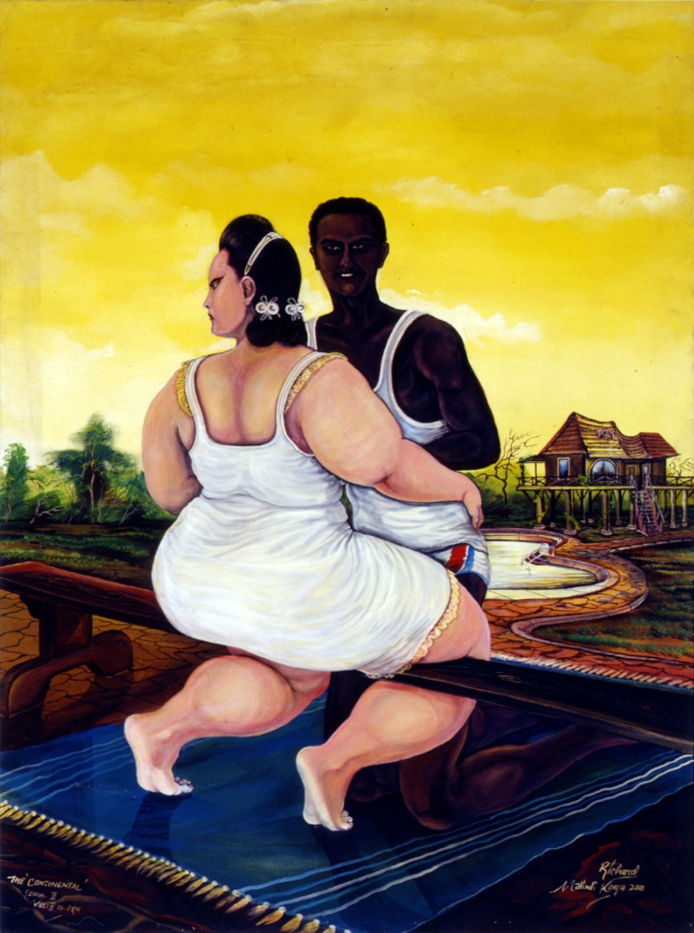 This psychological tension is notably present in the paintings that Onyango dedicated to his relationship with Drosie. White and curvaceous, the young woman is represented in imaginary or real situations that compress all the fantasies that Africa projects onto the West. Whether depicting the couples’ alternating domination and submission or the fascination exercised by a life-style synonymous with luxury and wealth, Onyango succeeds in inverting stereotypes and denouncing their inherent violence.