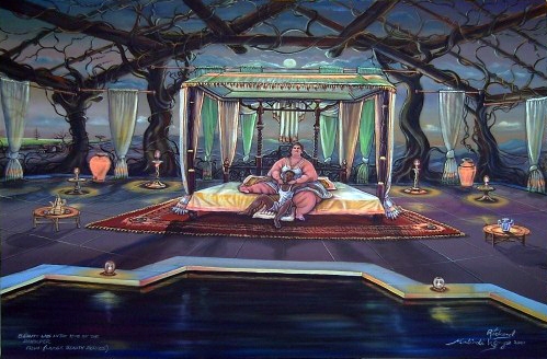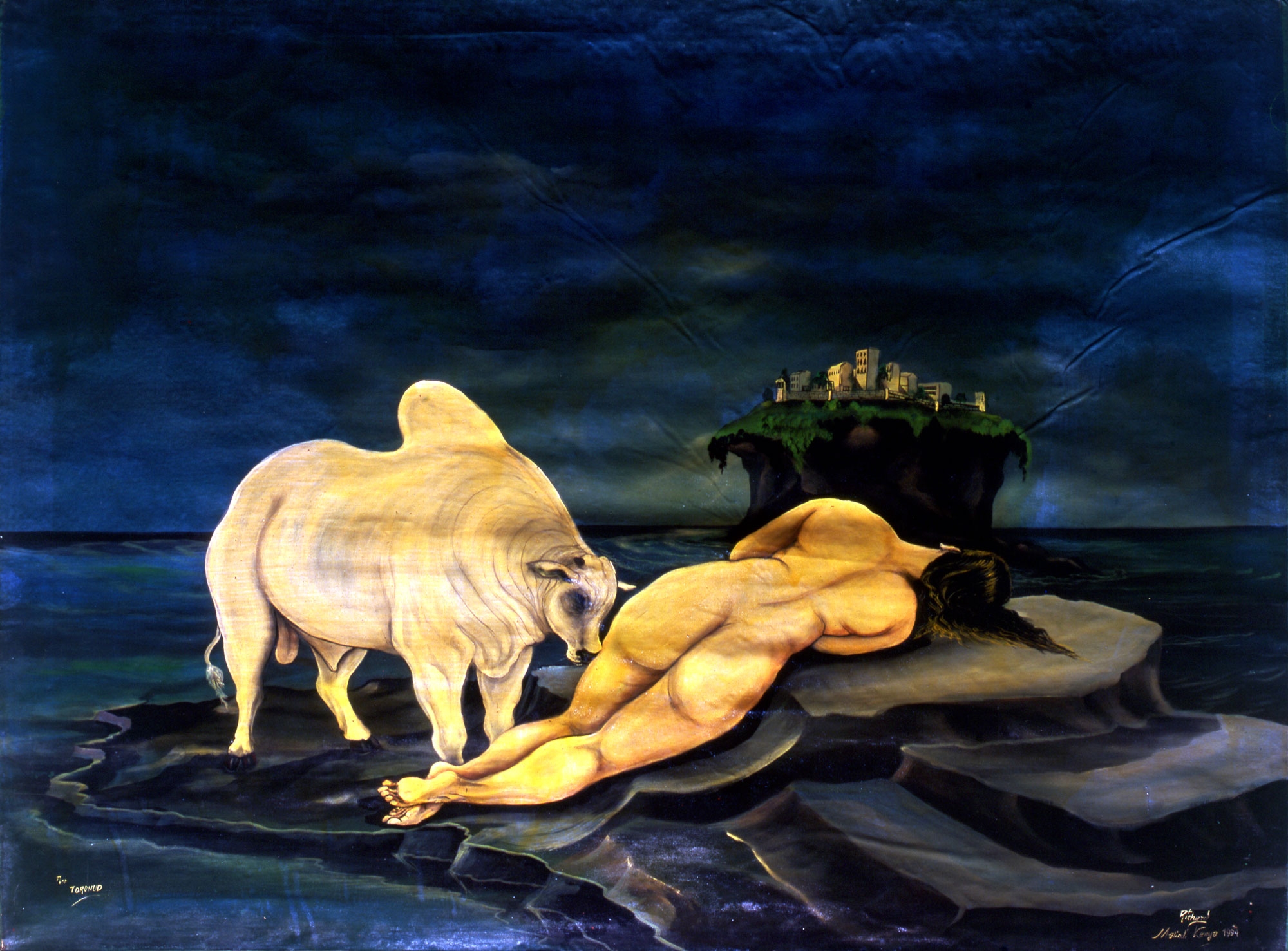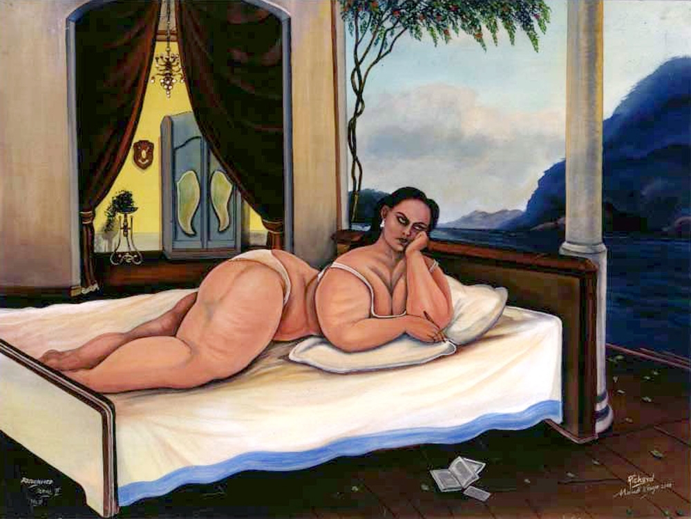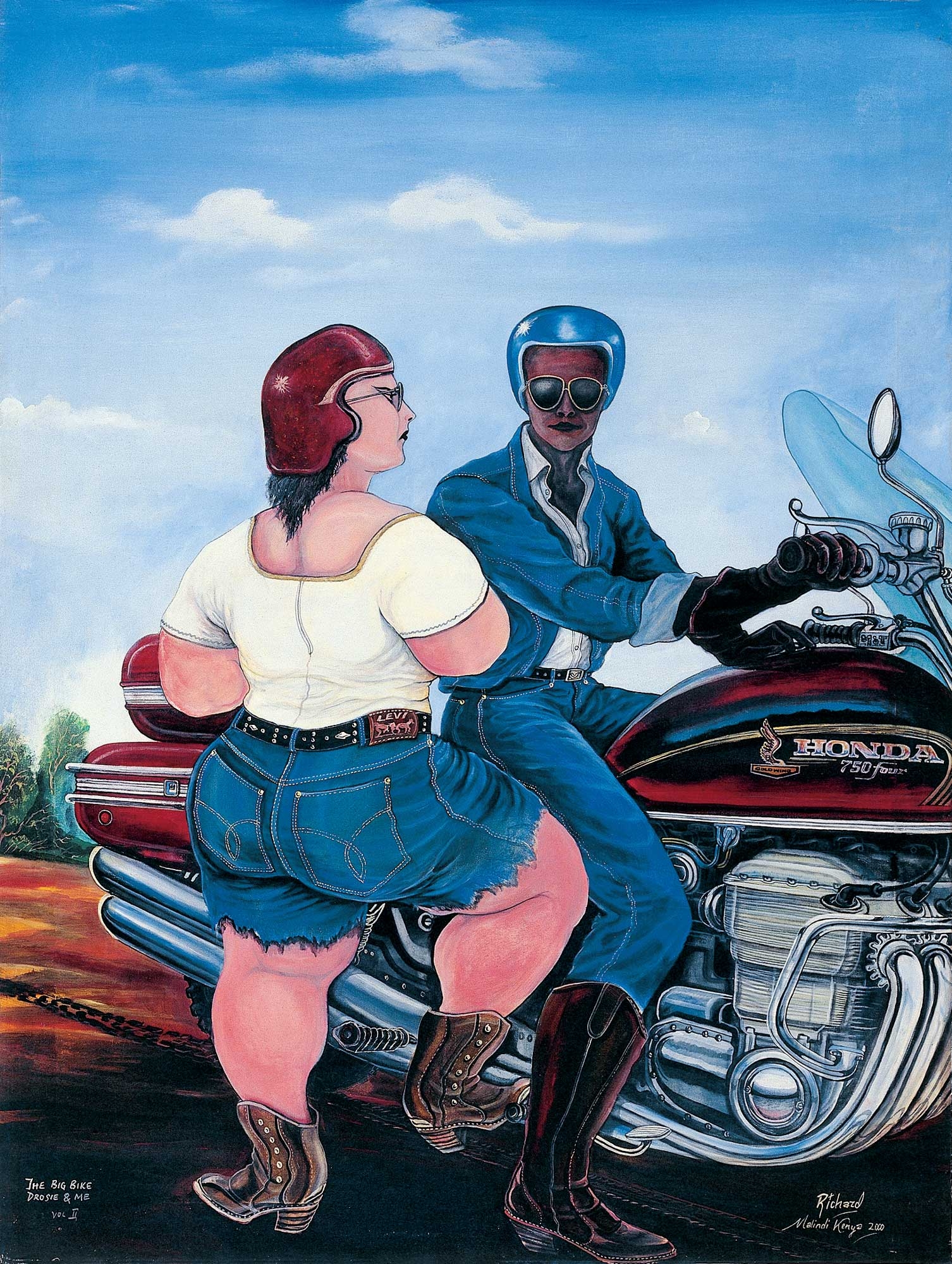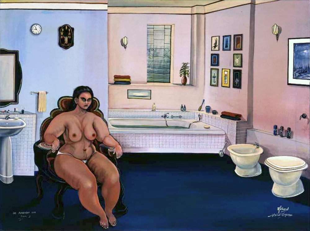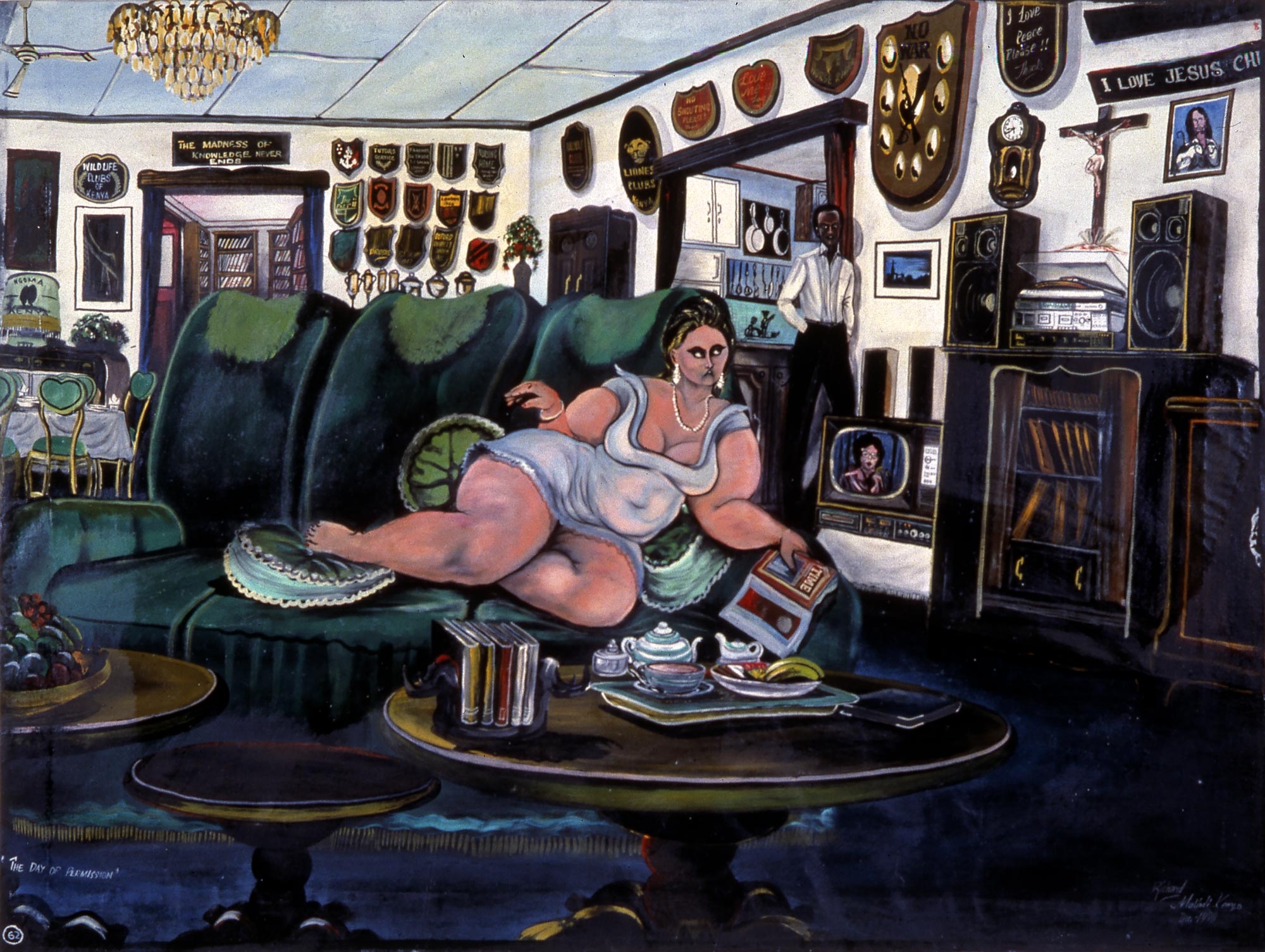 This psychological tension is notably present in the paintings that Onyango dedicated to his relationship with Drosie. White and curvaceous, the young woman is represented in imaginary or real situations that compress all the fantasies that Africa projects onto the West. Whether depicting the couples’ alternating domination and submission or the fascination exercised by a life-style synonymous with luxury and wealth, Onyango succeeds in inverting stereotypes and denouncing their inherent violence.