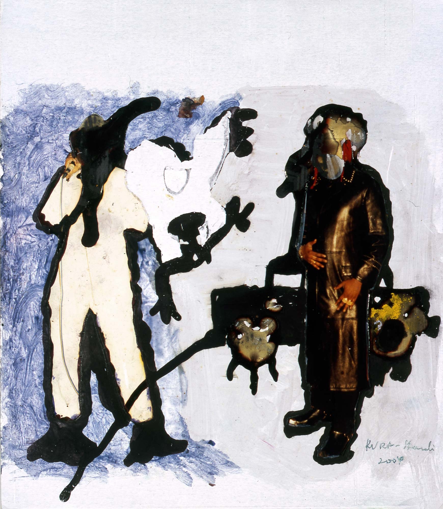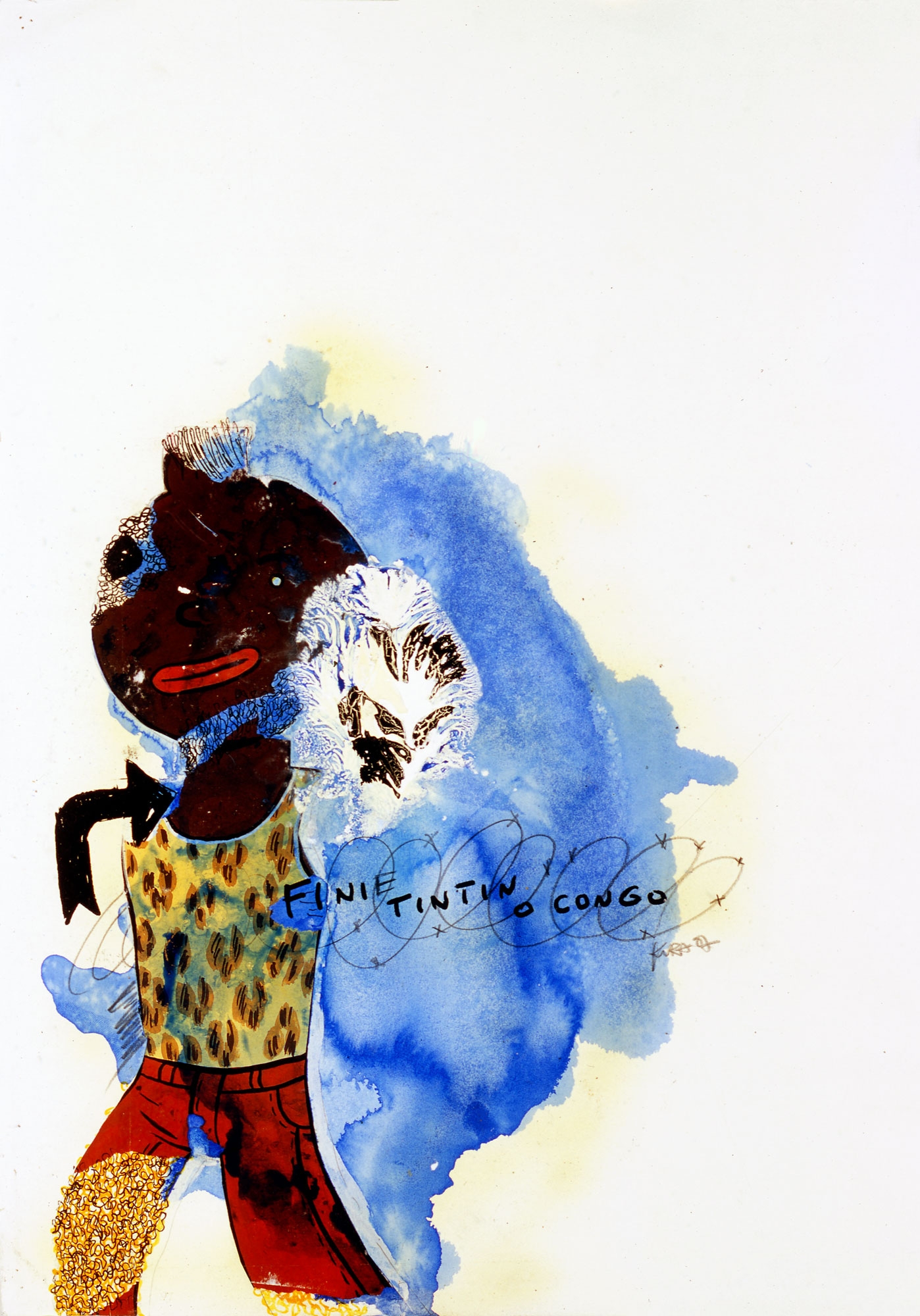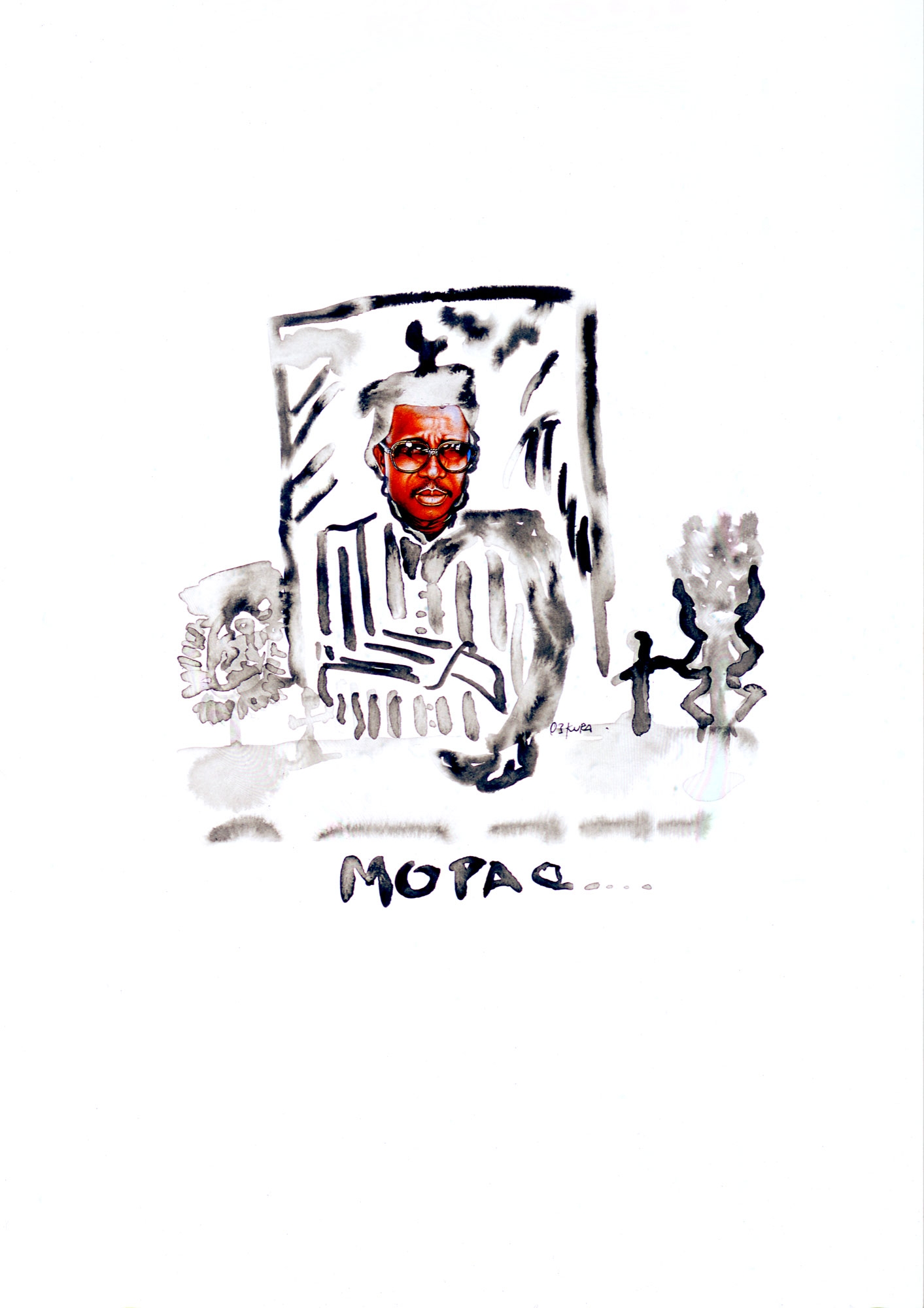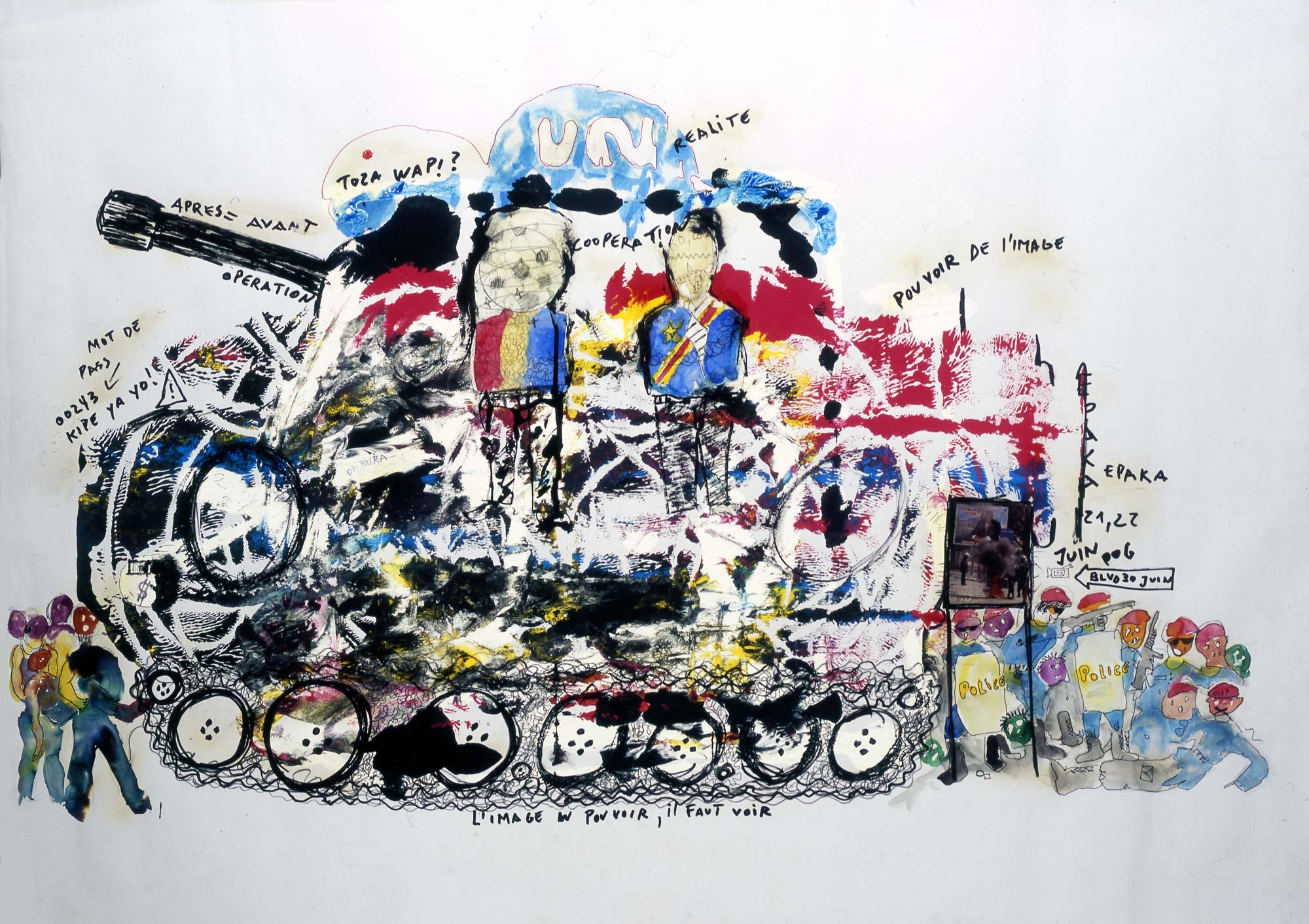 In 2001, Kura Shomali interrupted his medical studies, joined the Academy of Fine Arts in Kinshasa and participates in the creation of the EZA possible. He creates works on paper in which he combines with bold charcoal, ballpoint pen, gouache, ink, marker and collage that give a unique texture and appearance to his works. His first drawings, made in a sort of "emergency" inspired by the bubbling of Kinshasa and magazines that circulate from hand to hand. His work is a reflection of the chaotic megalopolis where he lives and he "digests", as he explains himself. In his latest works, Kura Shomali appropriates images known photographers of the continent (Samuel Fosso, Sammy Balog, etc..).